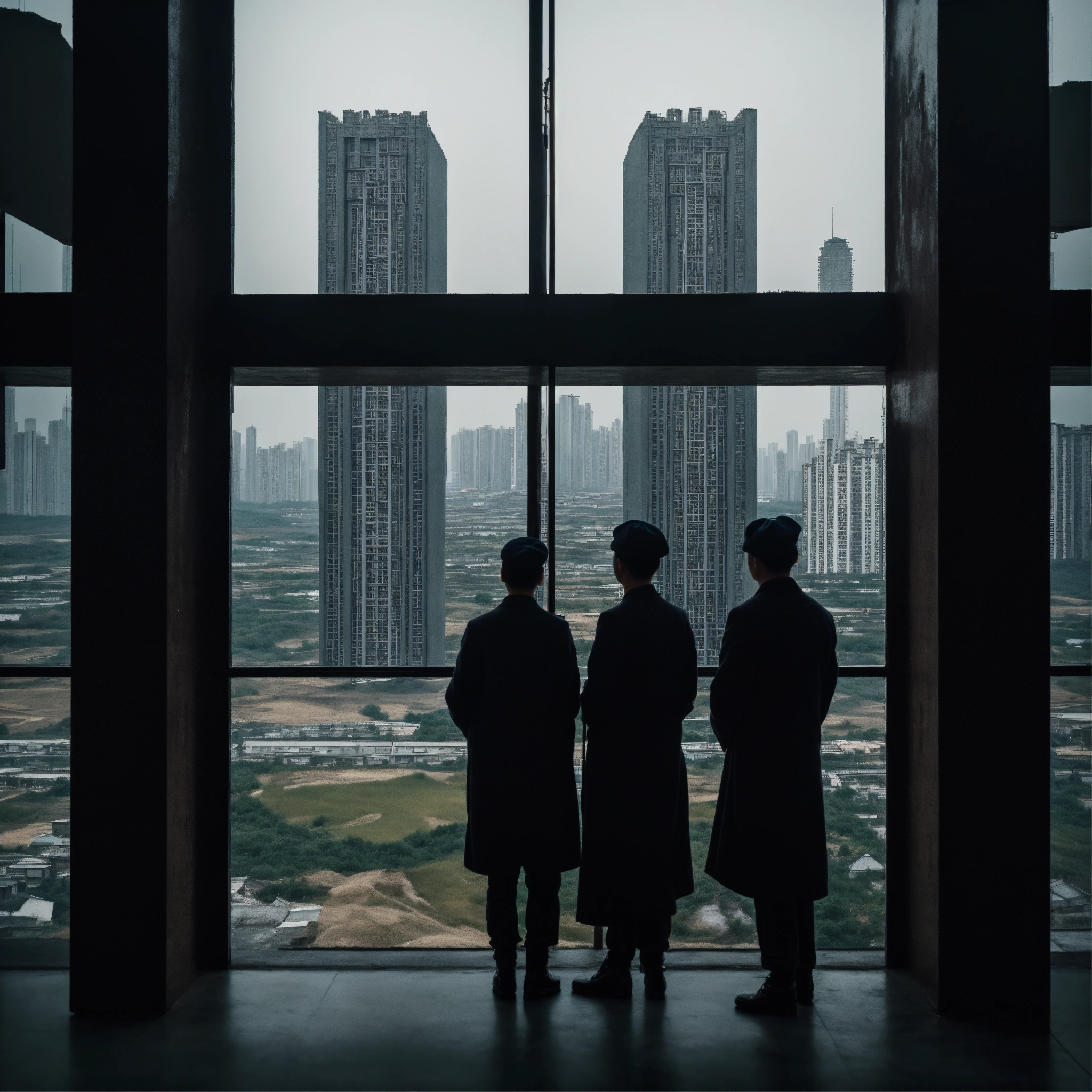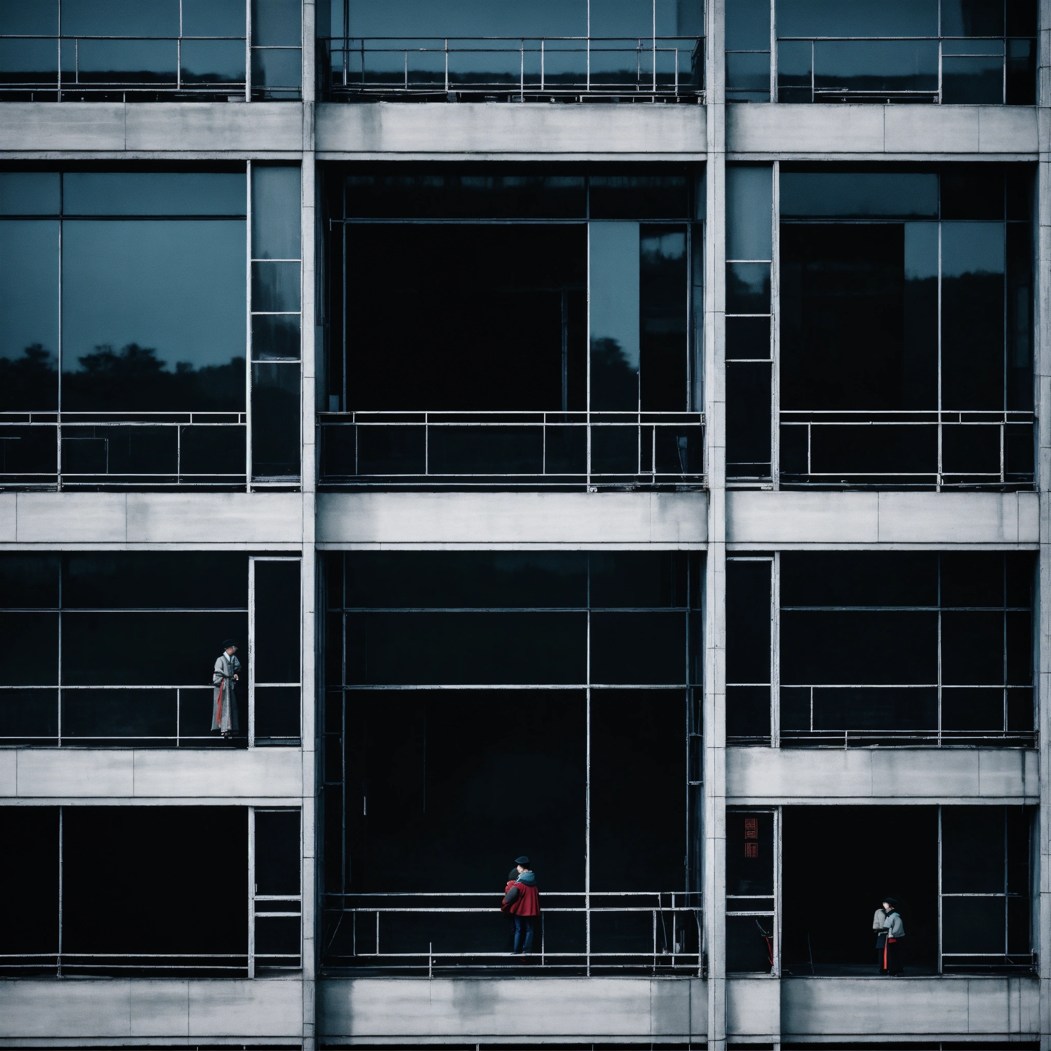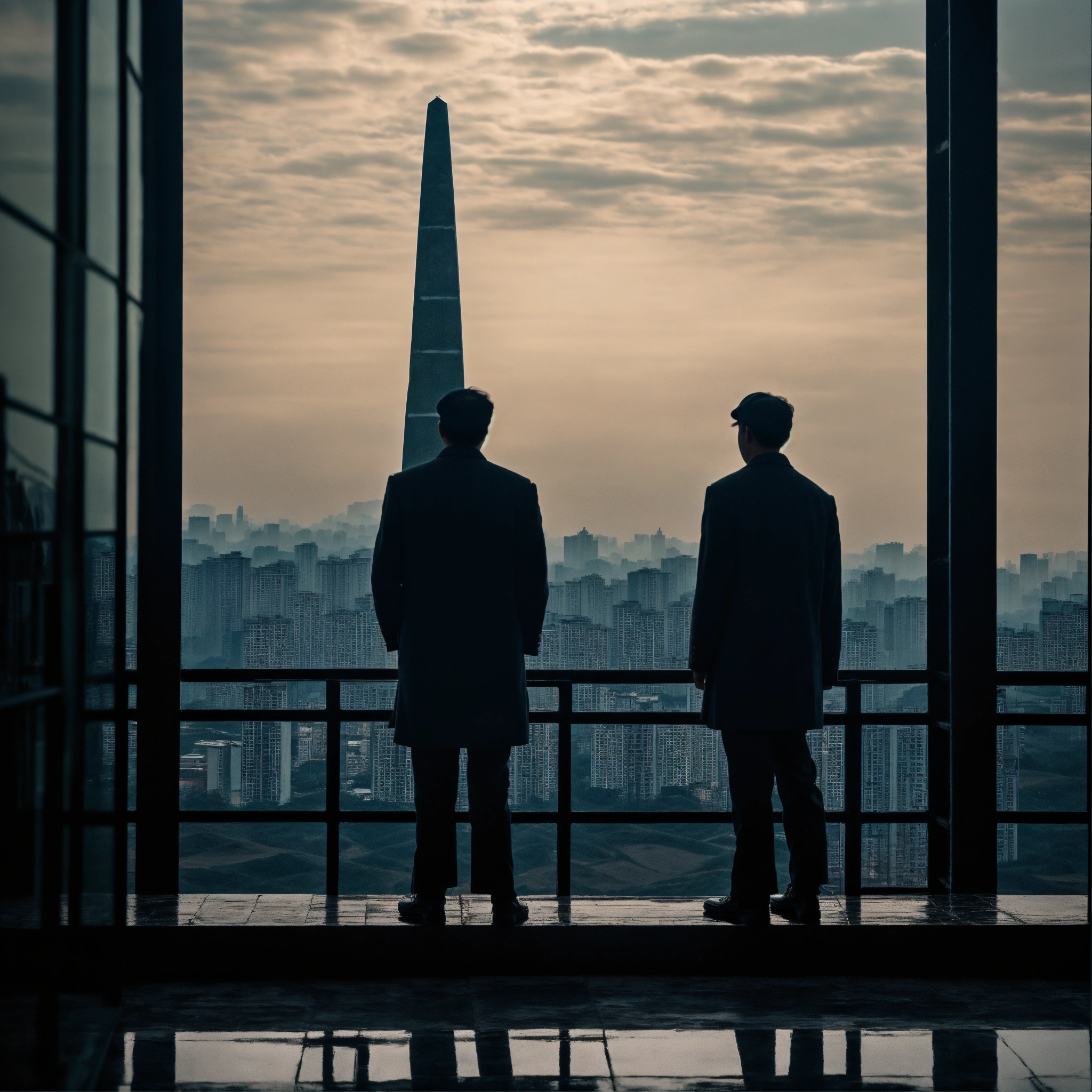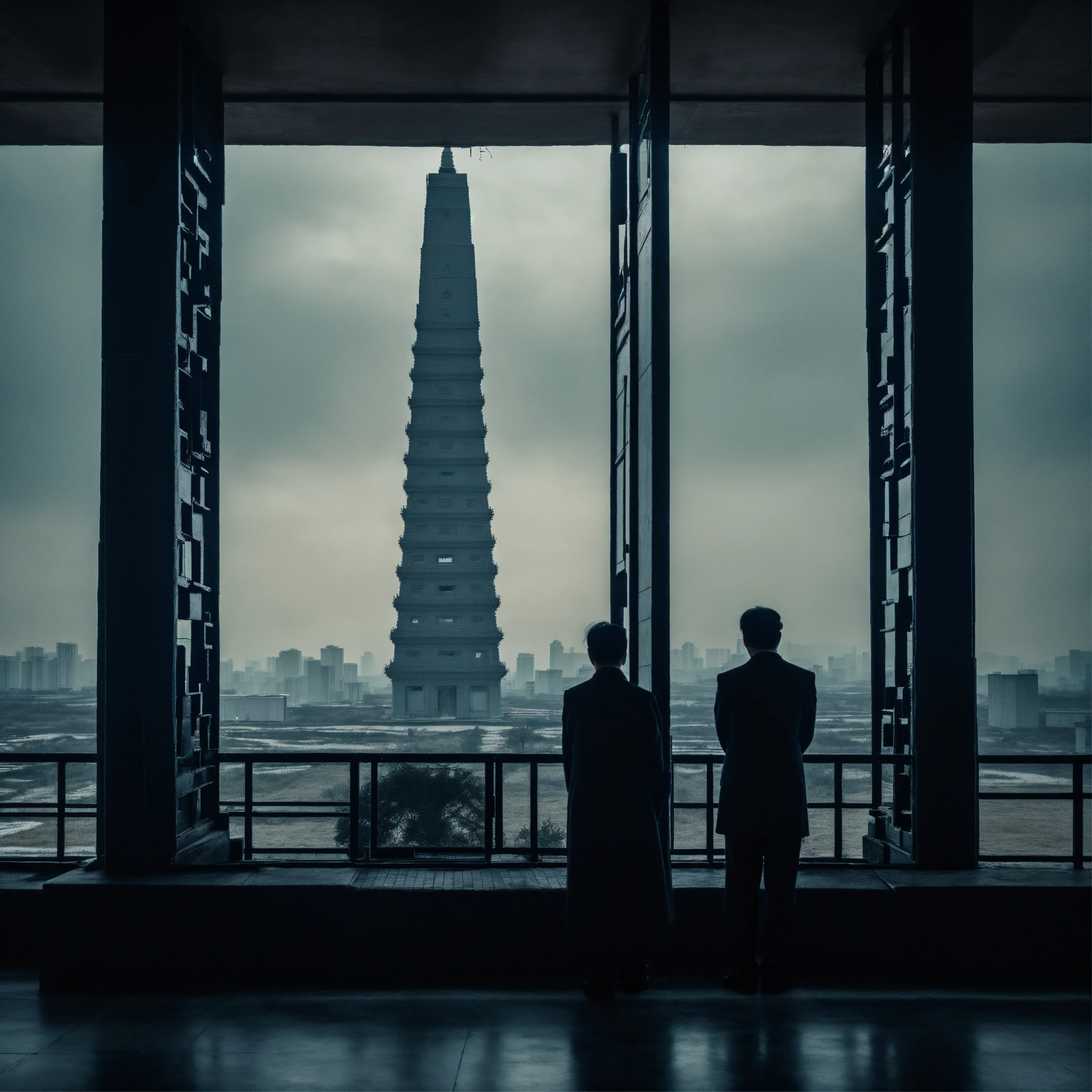 (isolated humans) look over tall building windows, obelisk, in the style of dark hues, rural china, coded patterns, sparse and simple, uhd image, urbancore, sovietwave, vastness of space, negative space, award-winning design, leica