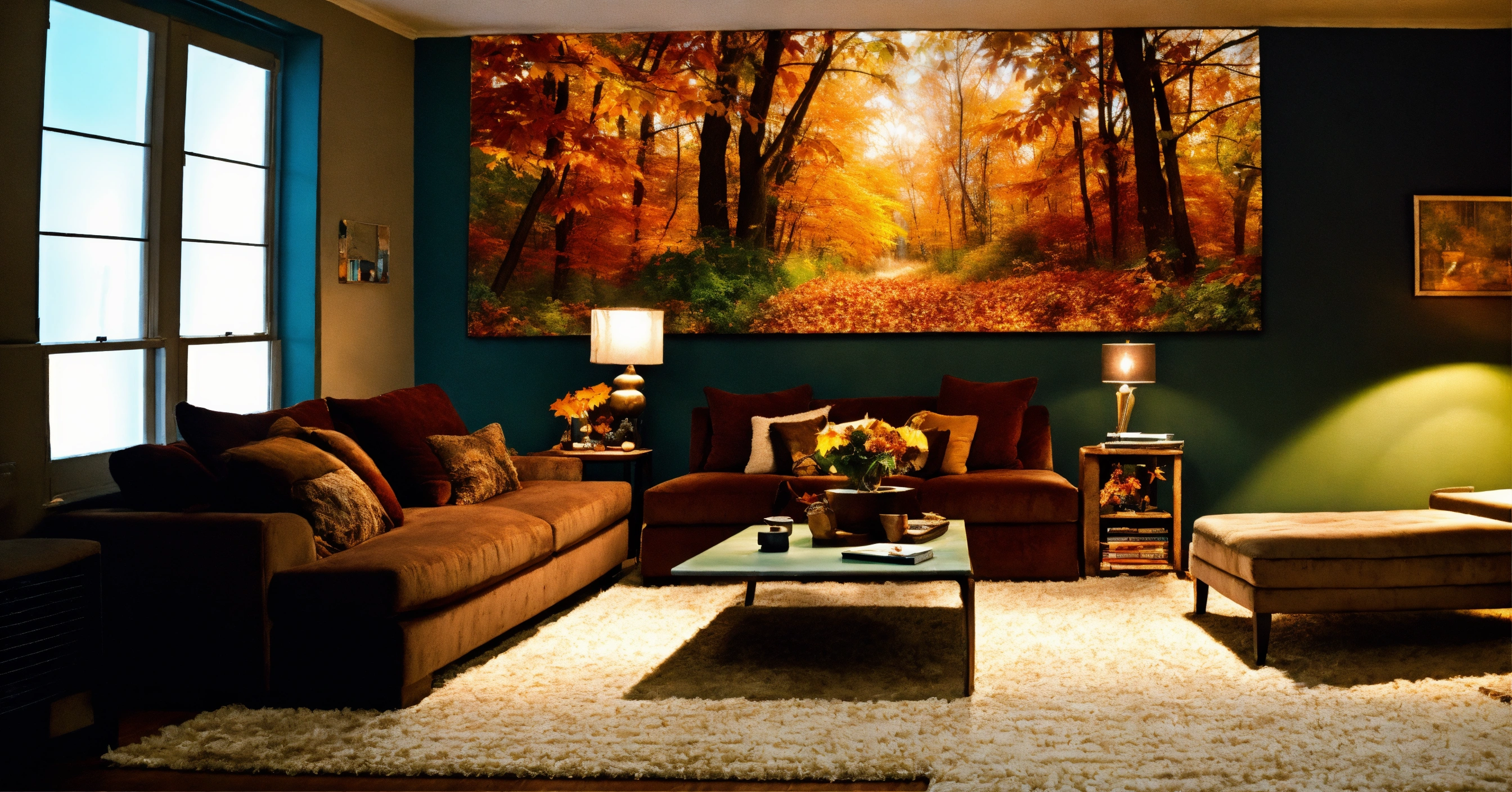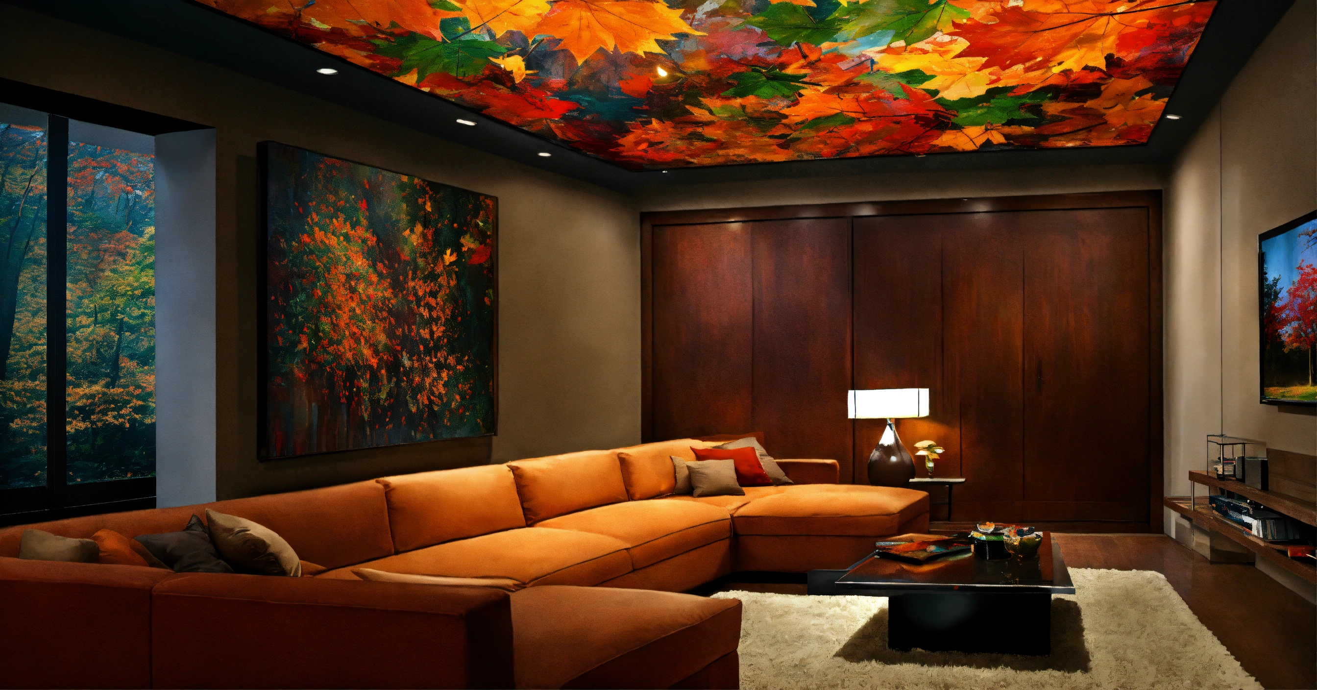 Fall leaf sitting room, fuzzy leaf rug, big couch, grafitti fall pics, night star ceiling, dark wood. night time