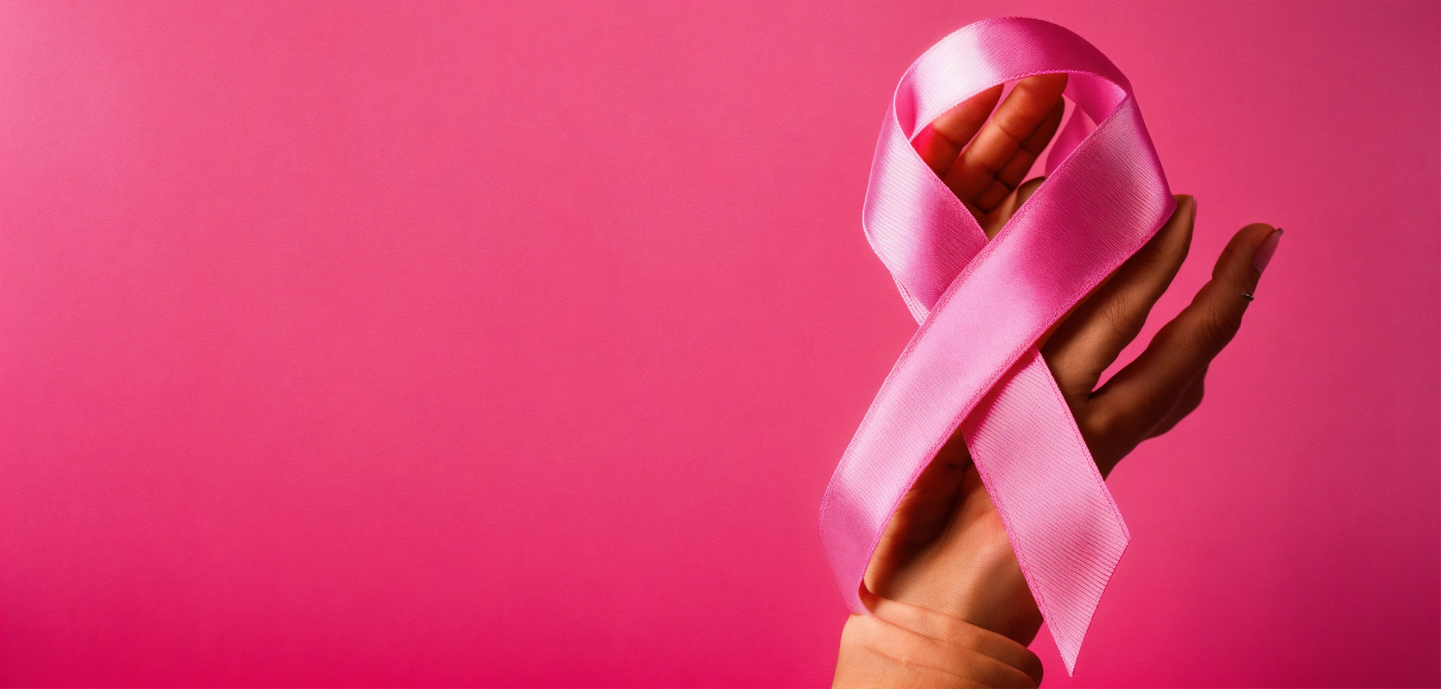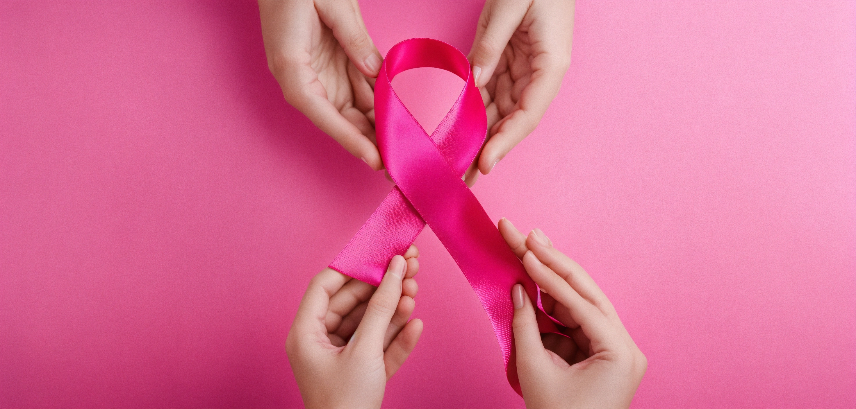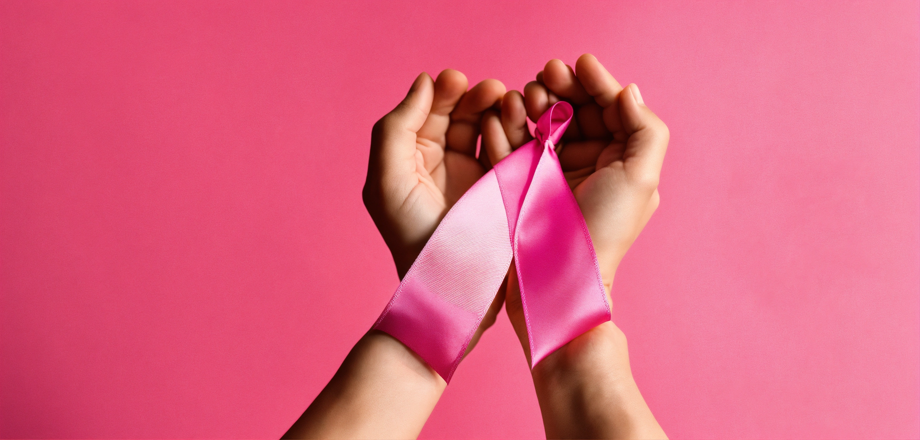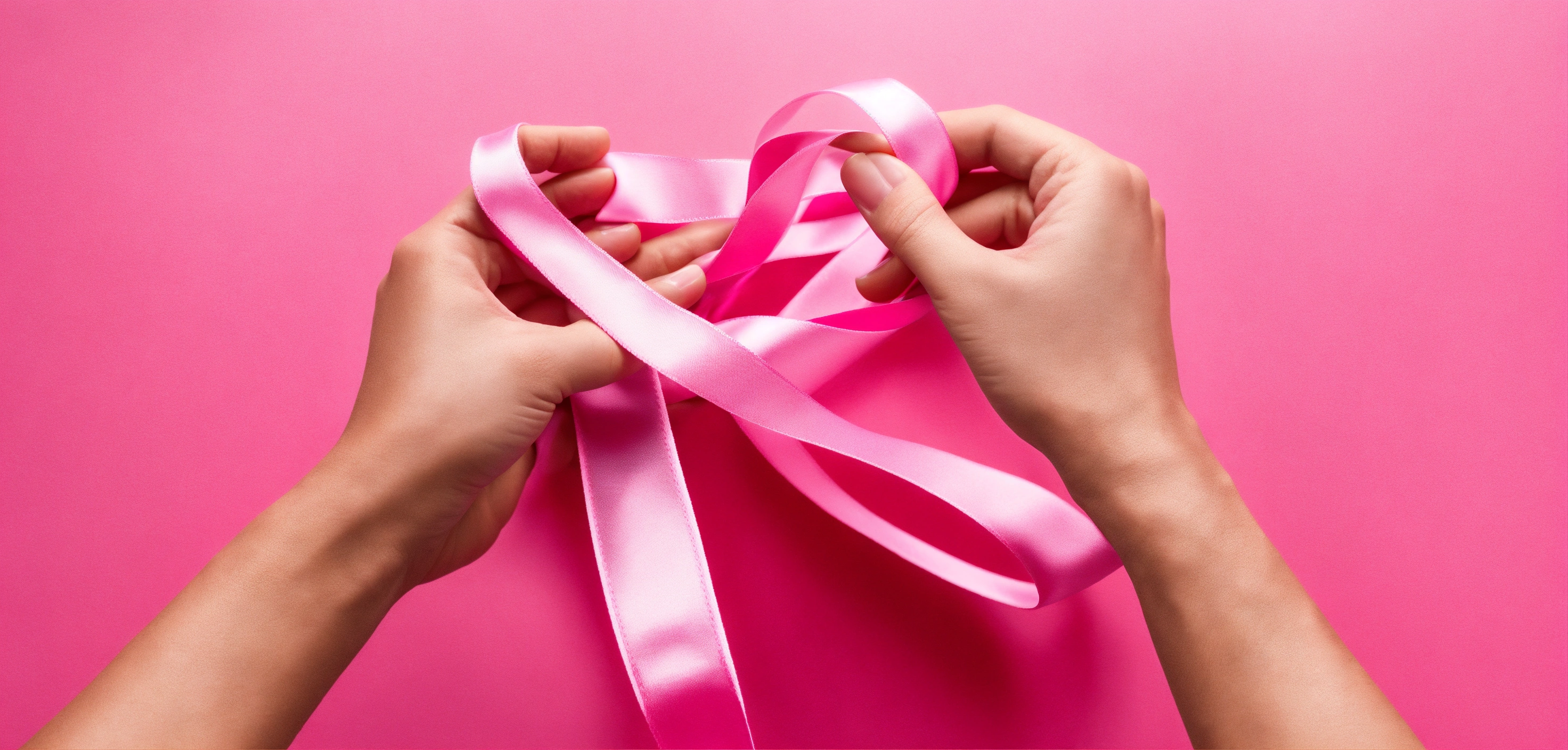 Hands holding a pink health ribbon on pink background