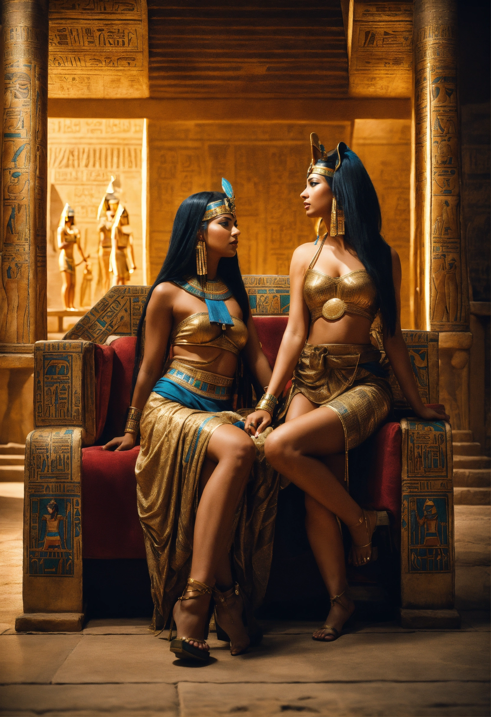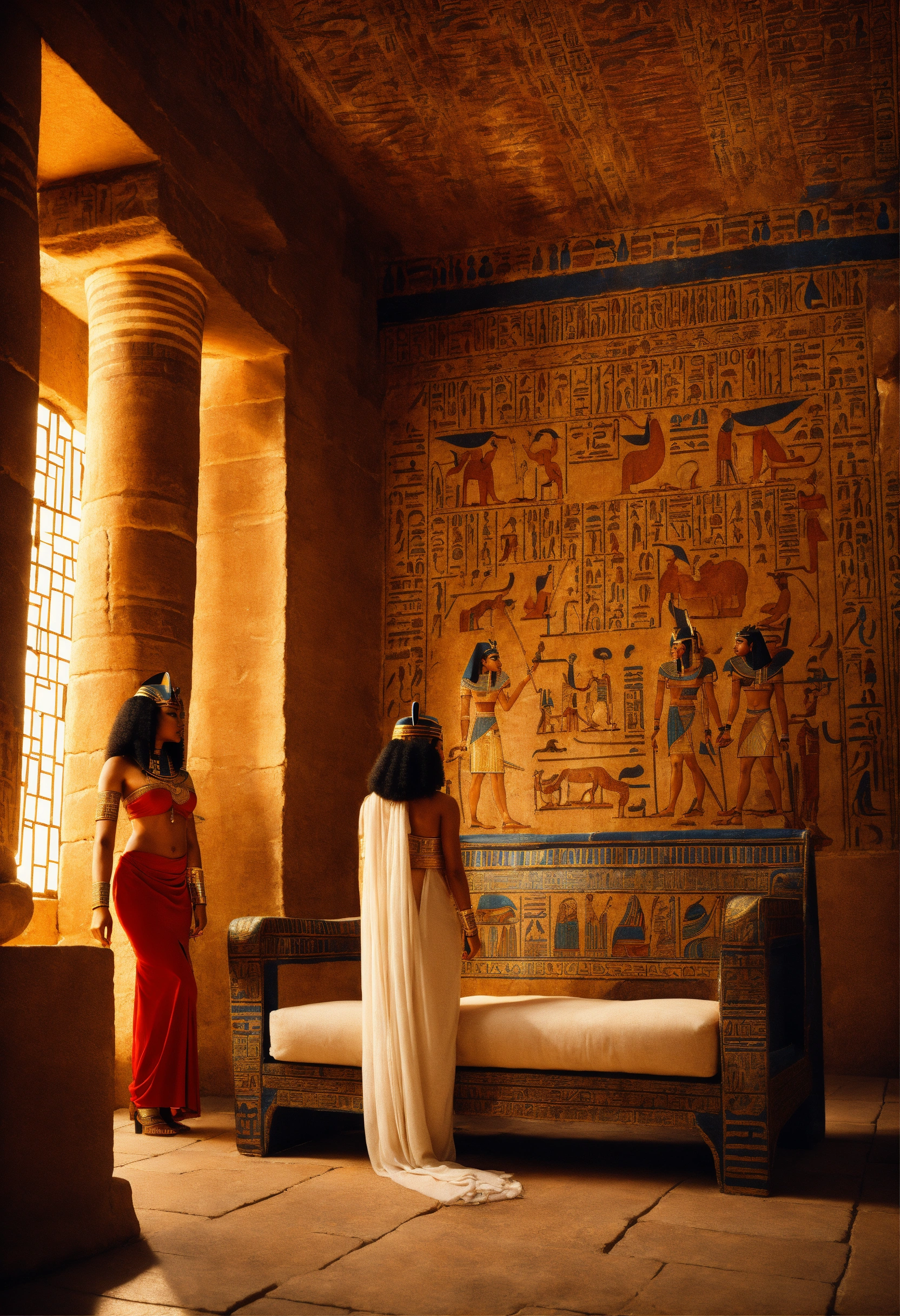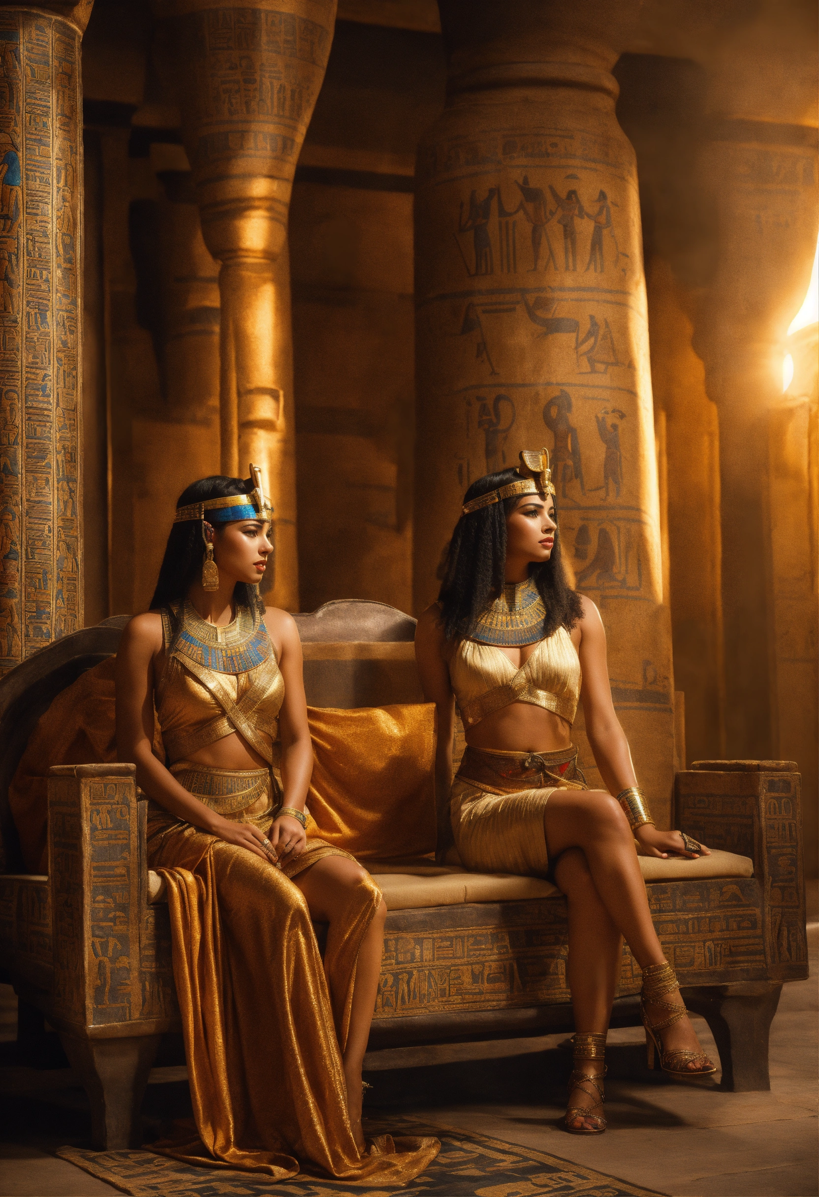 An epic fantasy scene in ancient egypt featuring two gorgeous beautiful females in attractive outfit standing by an ancient egyptian couch. side view, sharp detail.