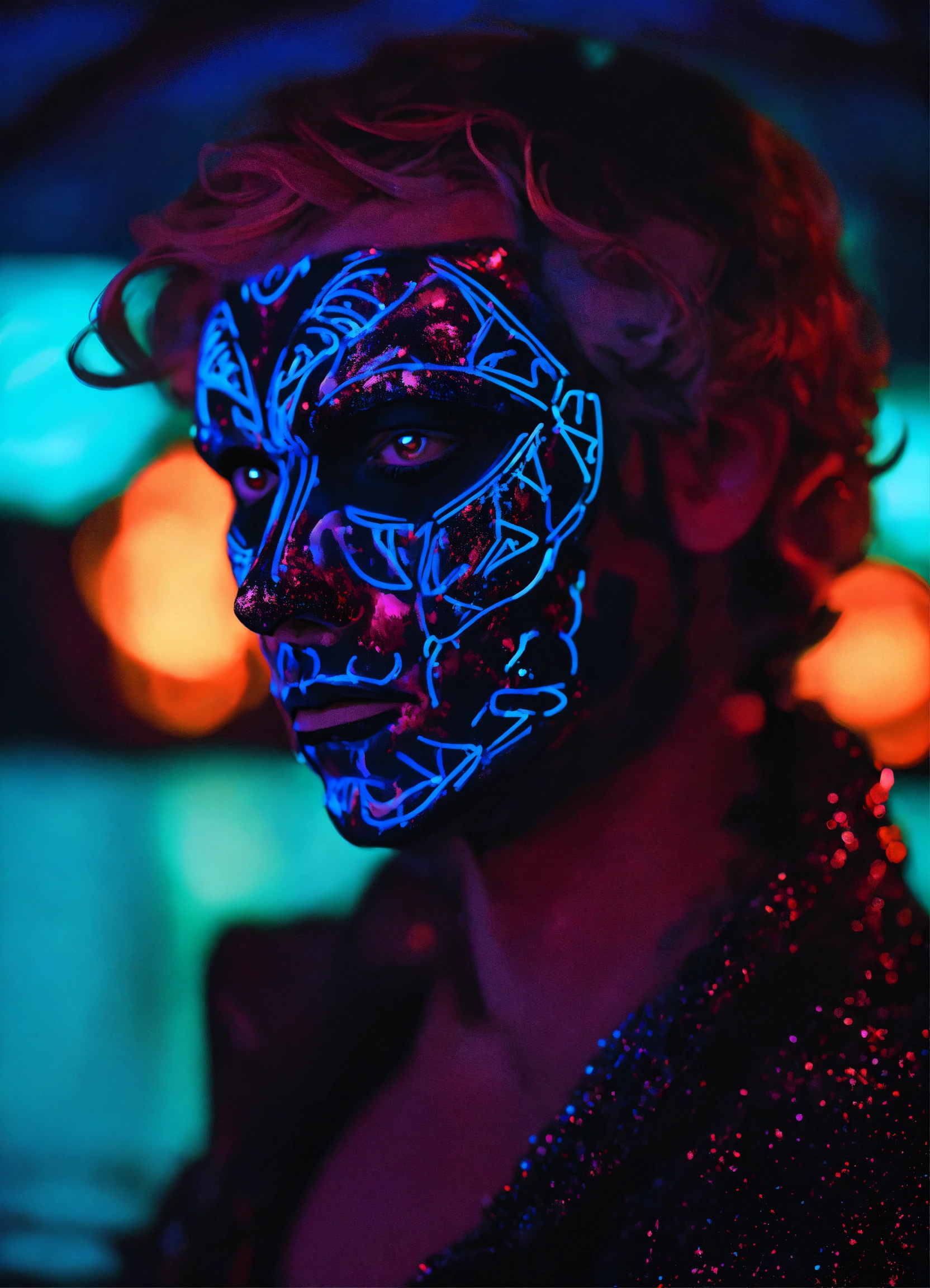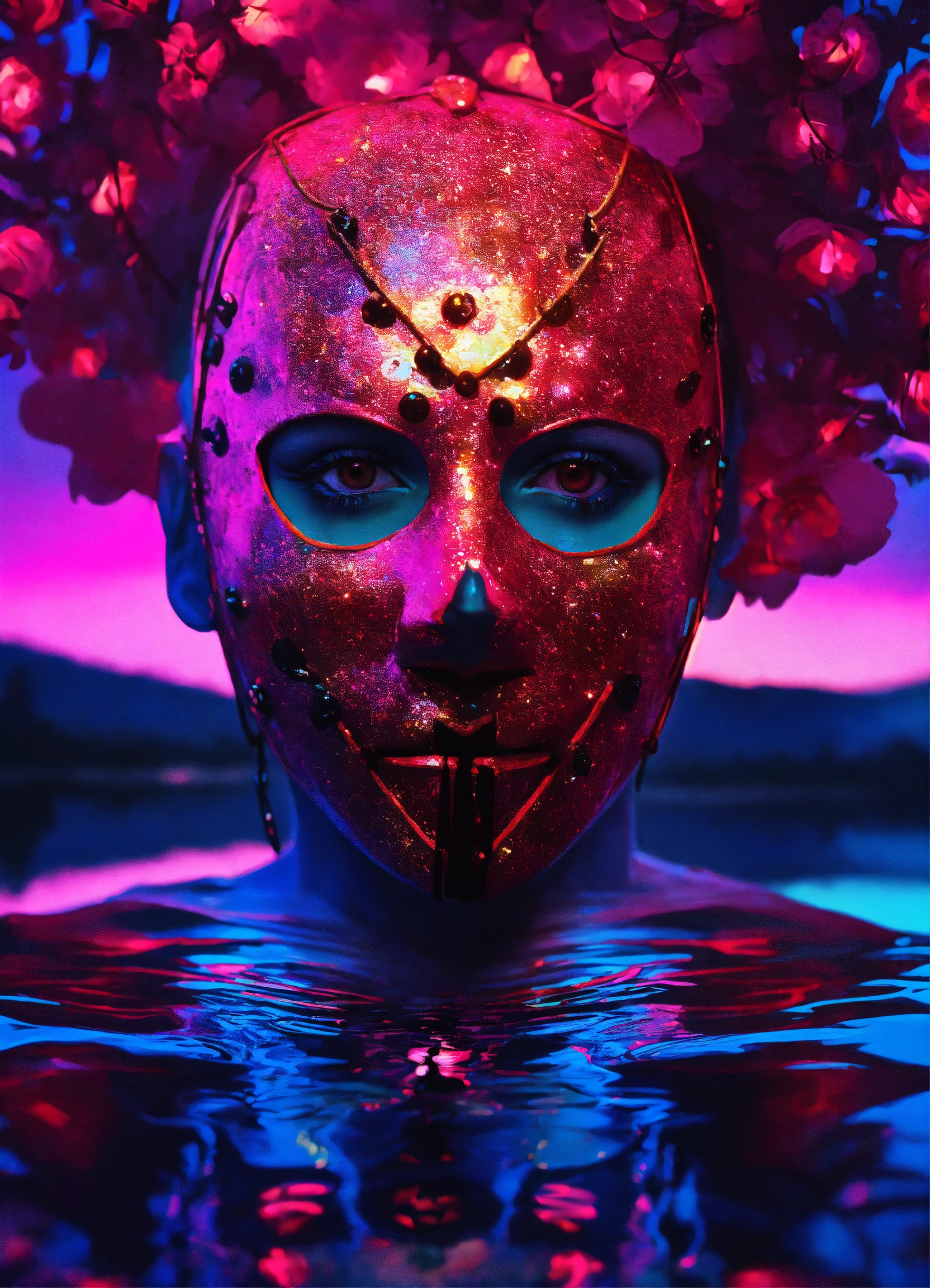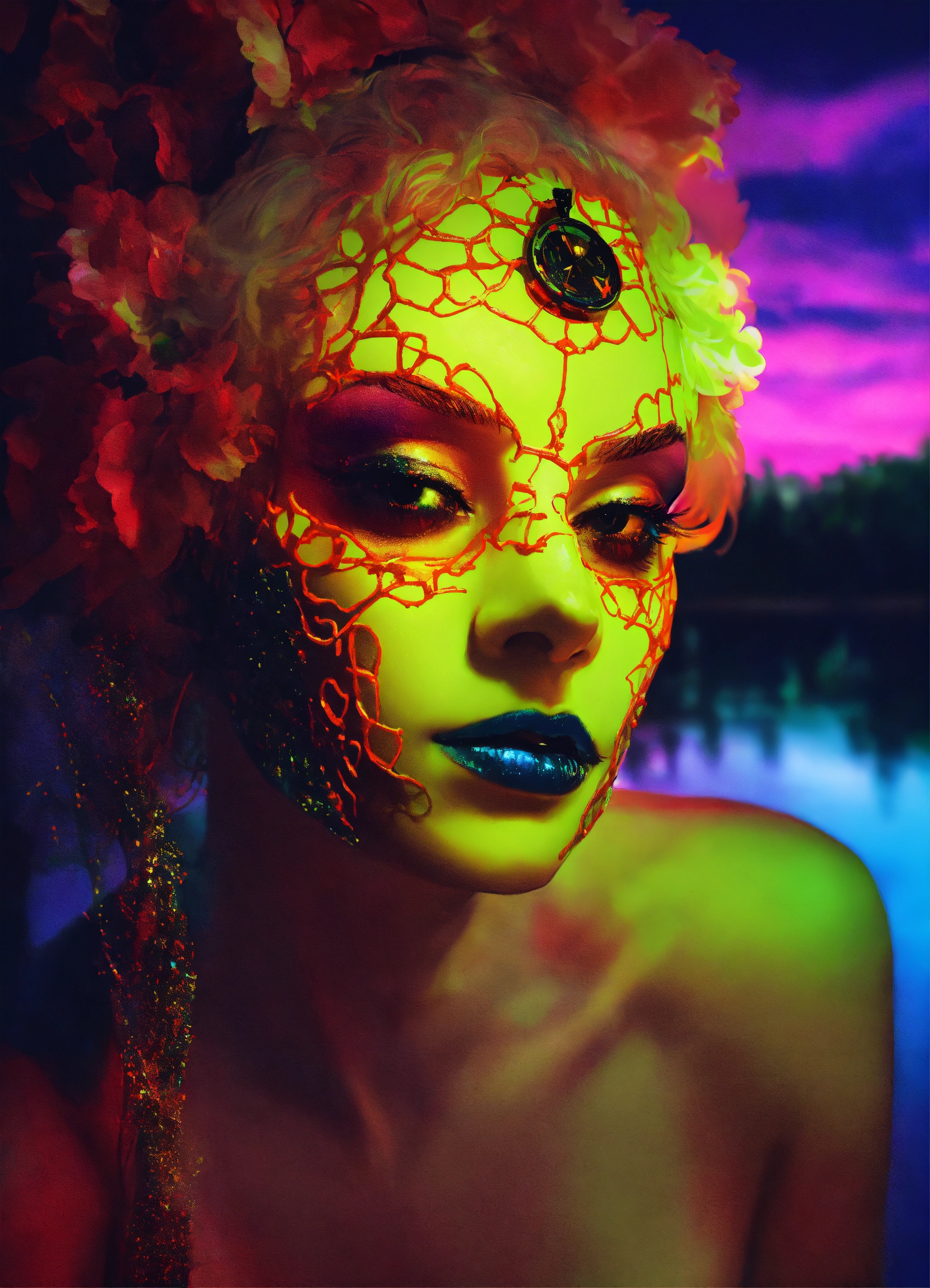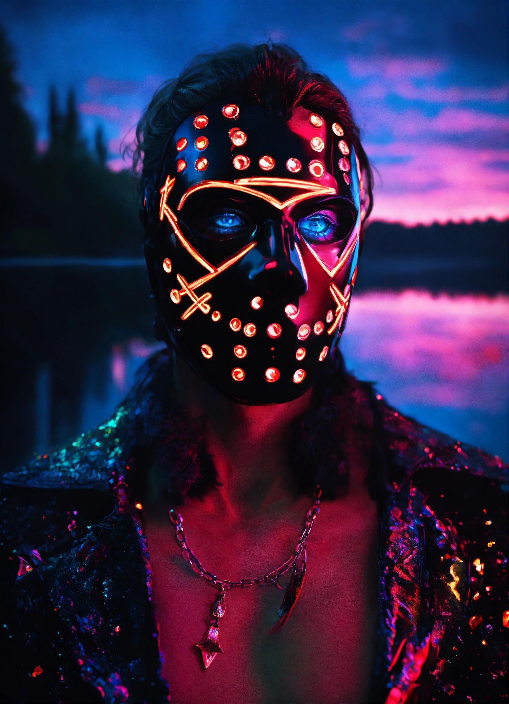 Close up portrait photography, of a jason from the movie friday the 13th dmt black light glitter neon cabin by a lake an attractive, 80 degree view, art by sergio lopez, natalie shau, james jean and salvador dali