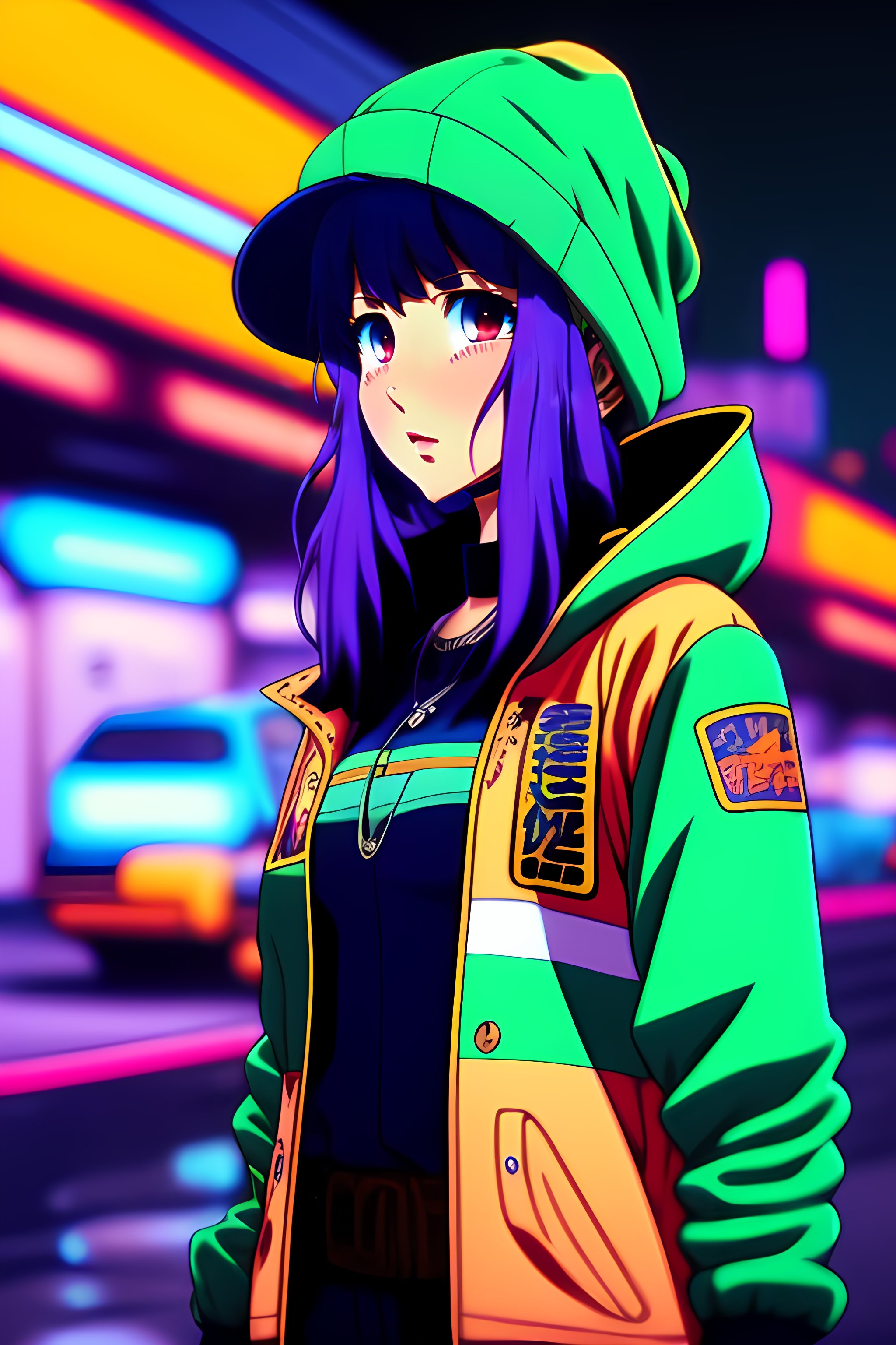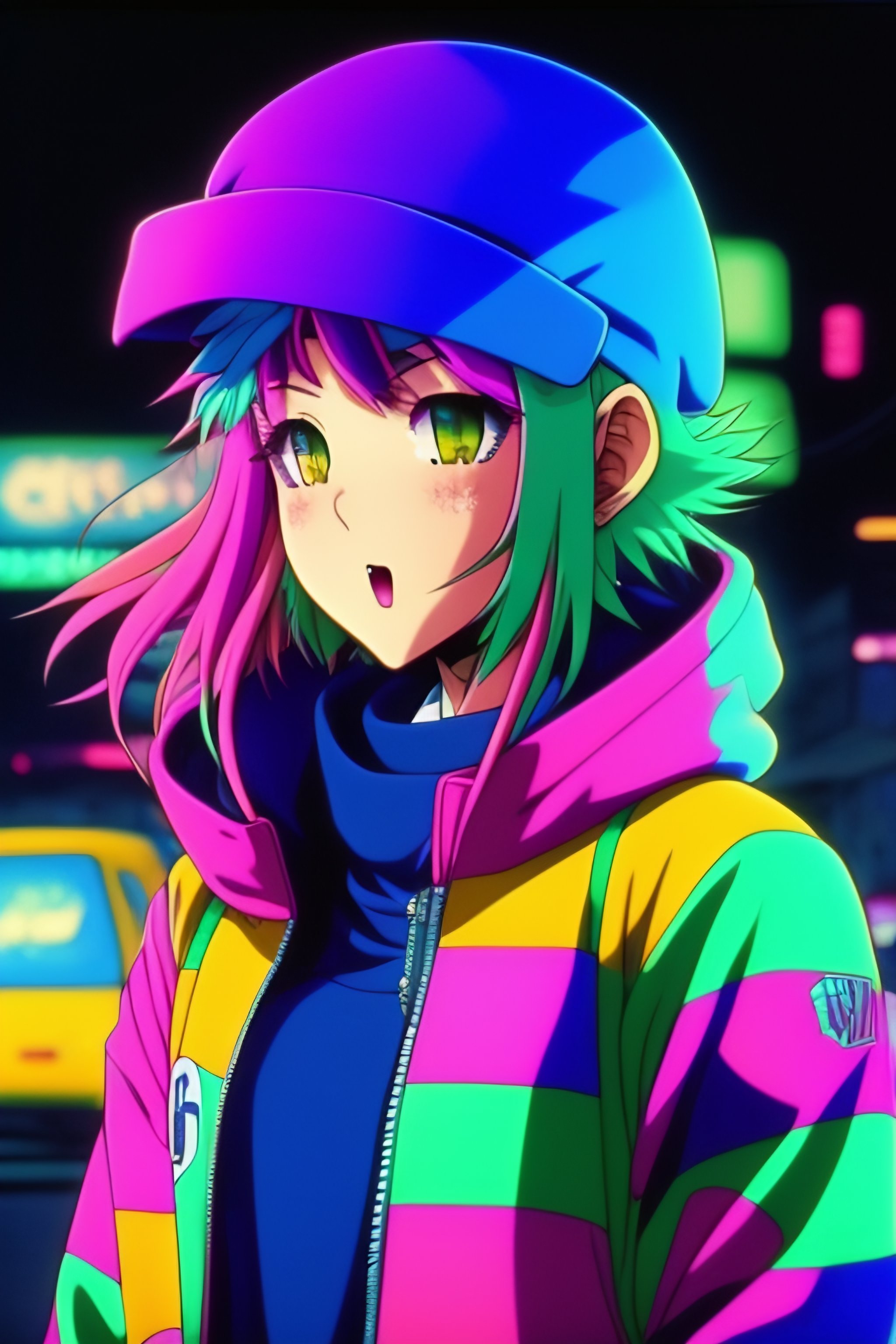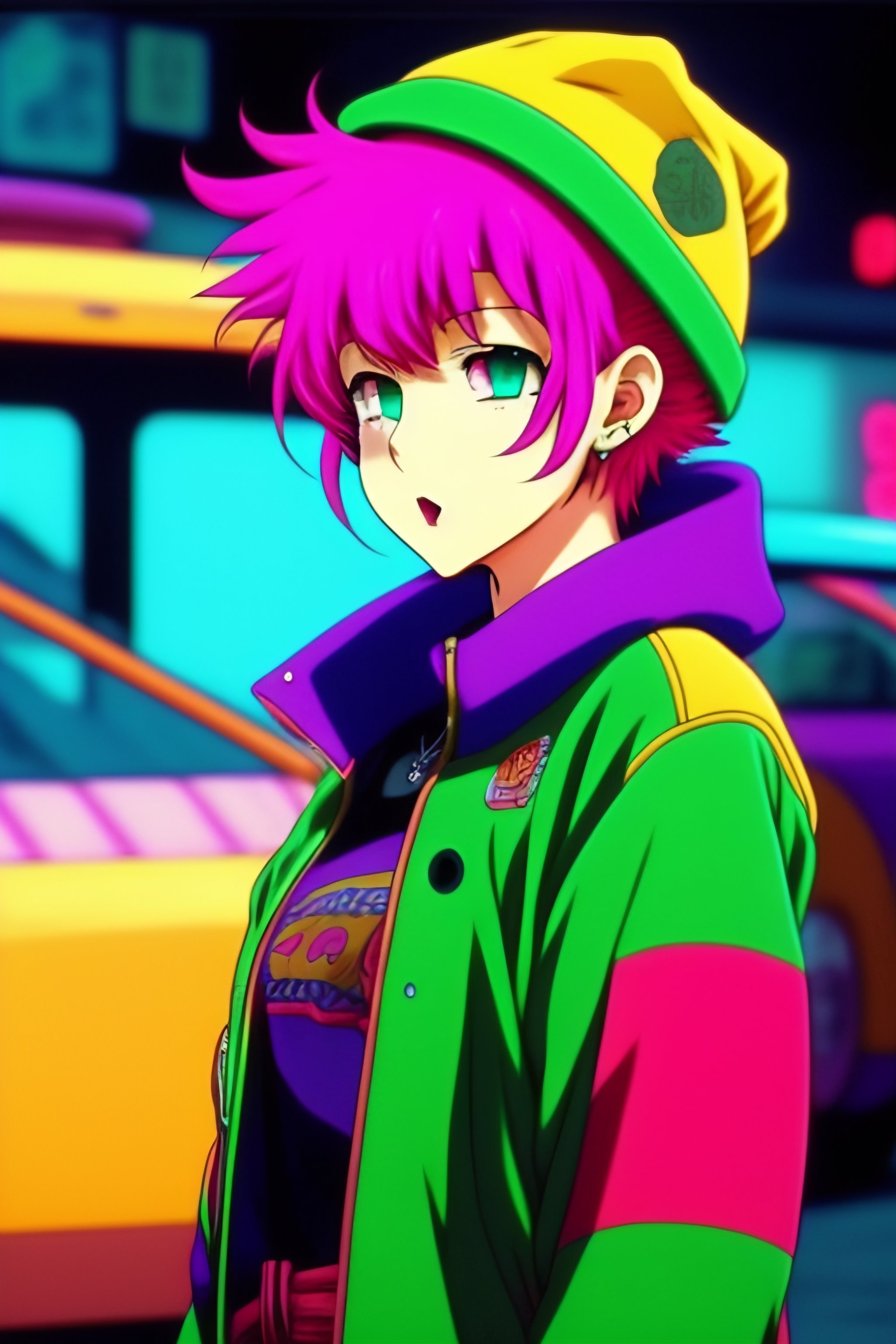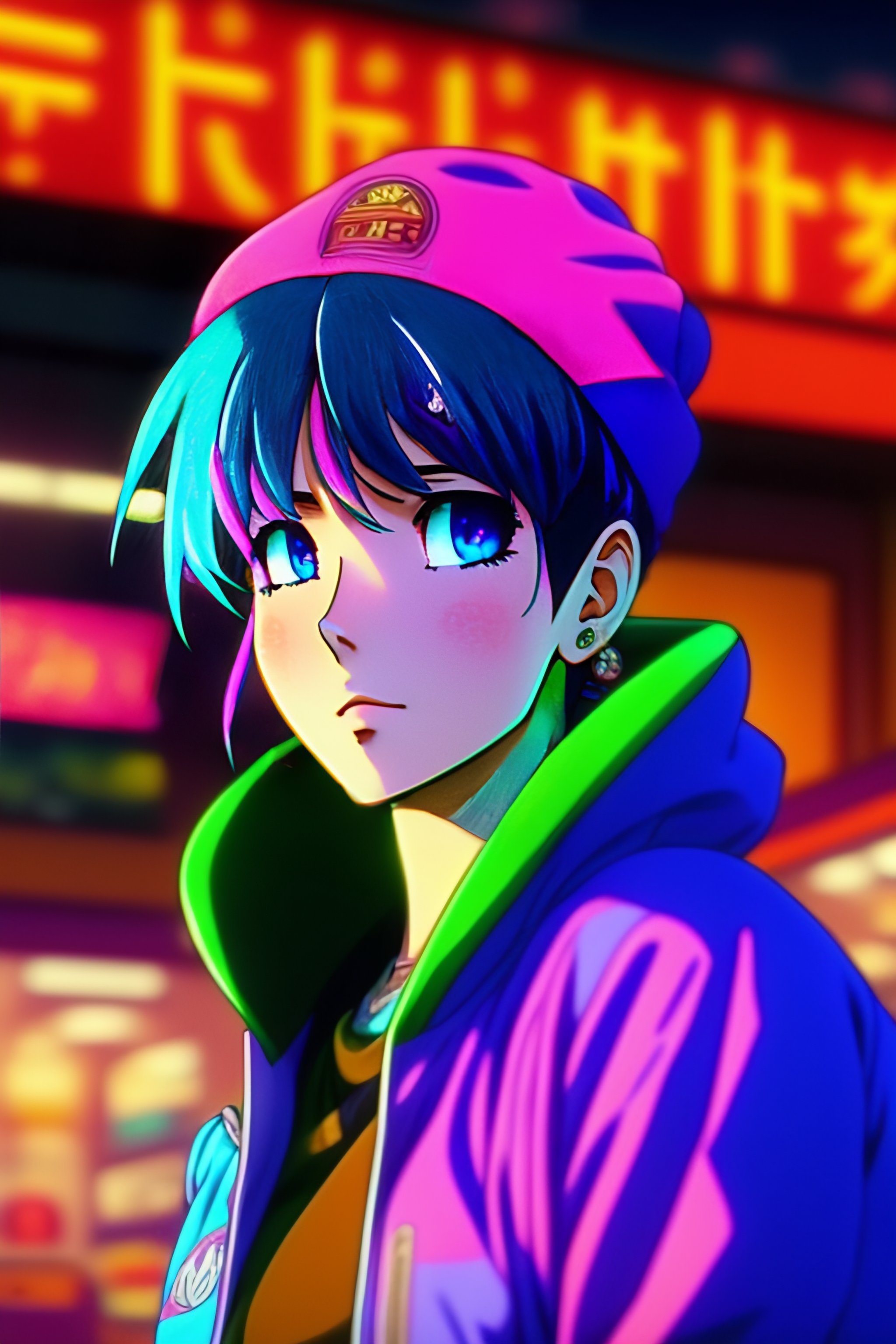 Vintage anime screenshot from akira, 90’s anime. vibrant maximalism. a stylish girl with pink hair long side tails haircut wearing a blue beanie and a green jacket in 7/11 at night. neon lights