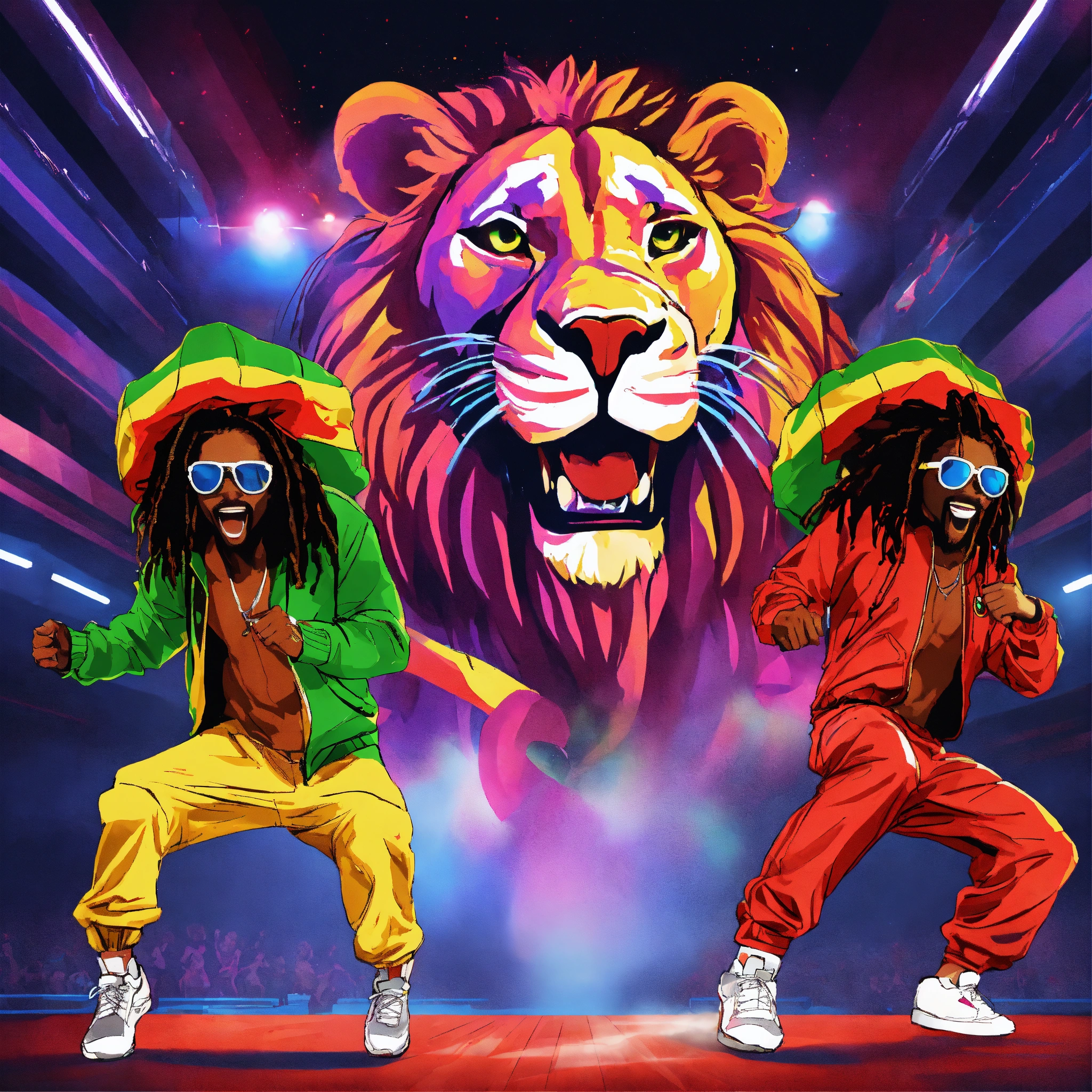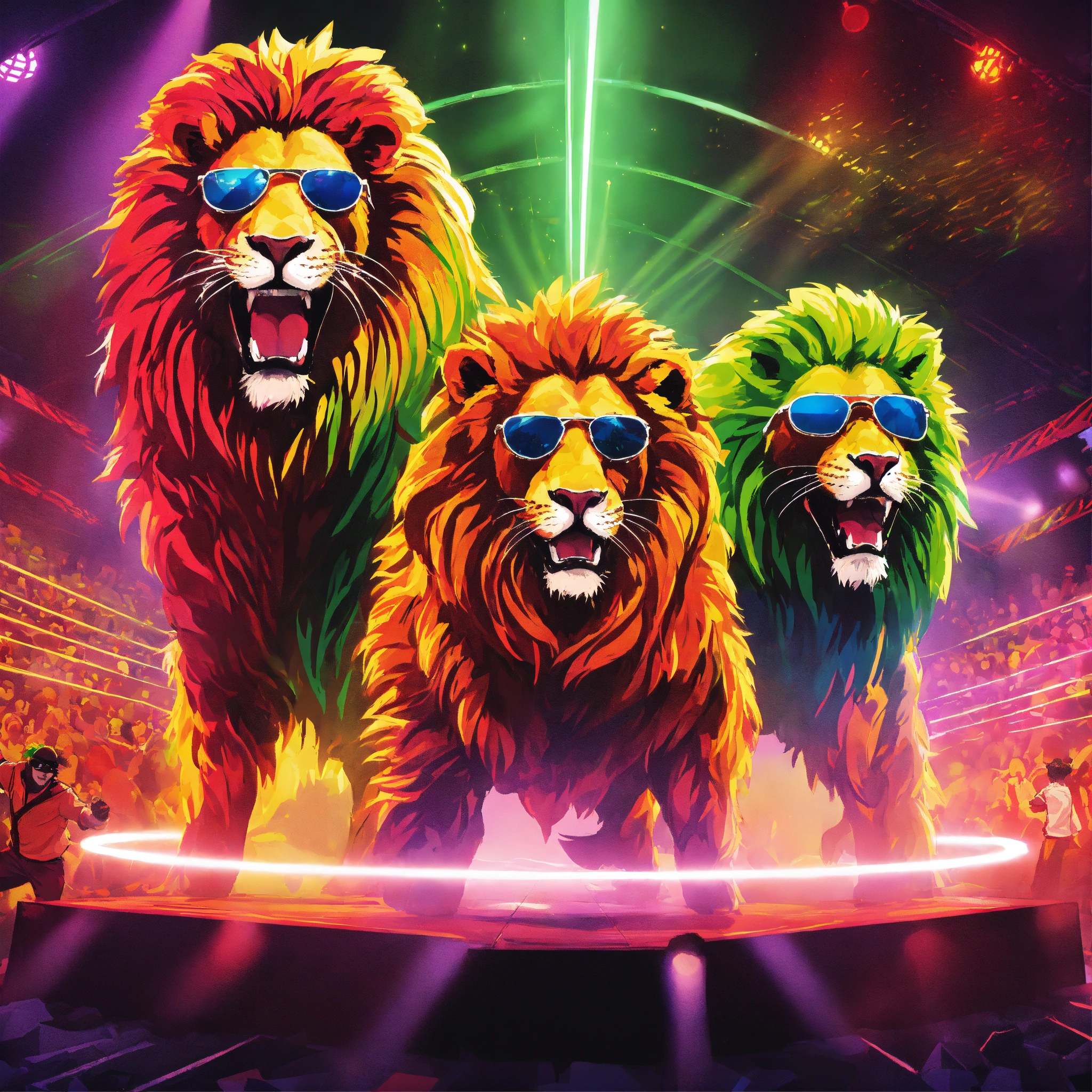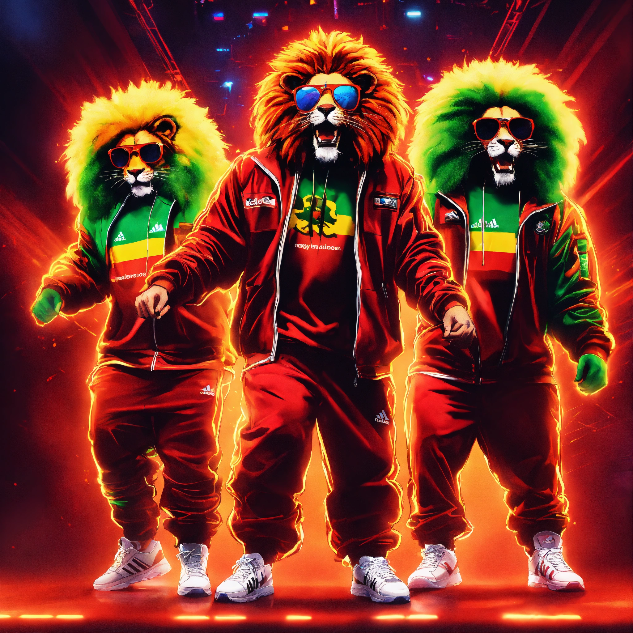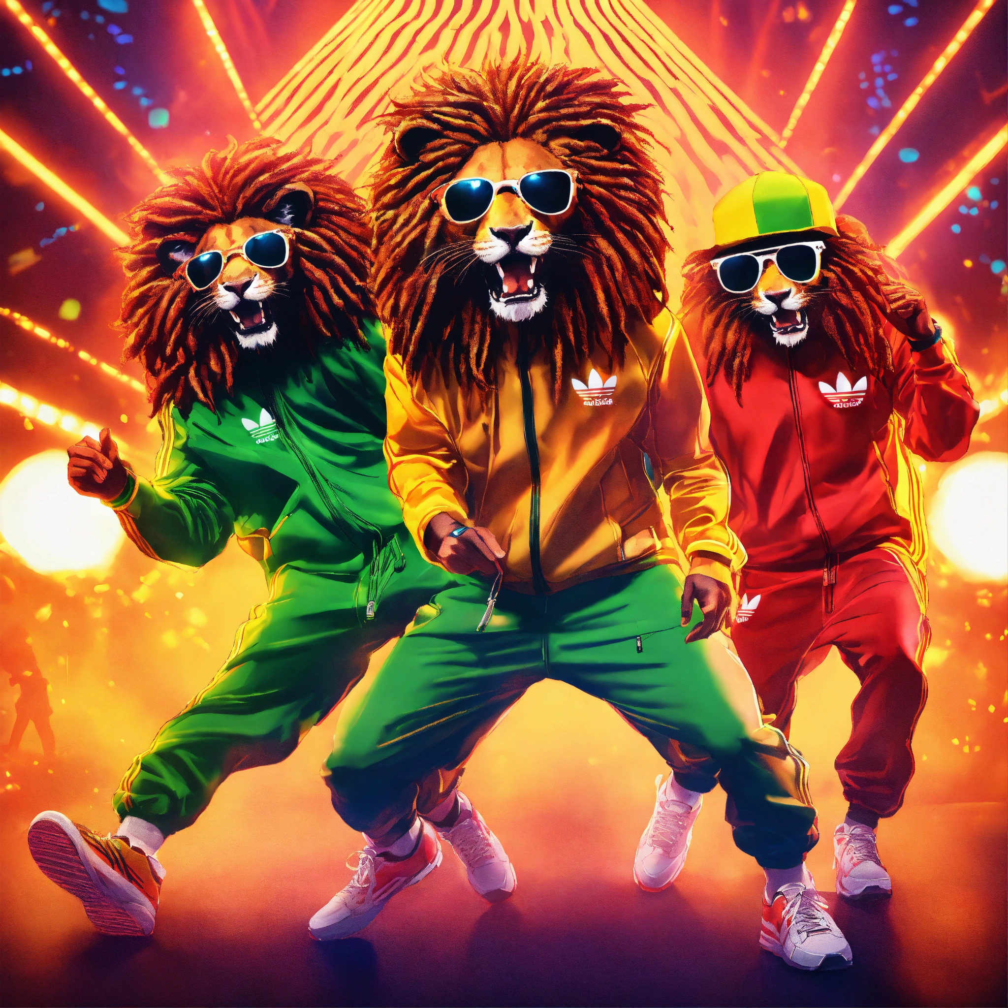 Artistic image type of image illustration prompt description create an electrifying illustration featuring three rasta lions wearing trendy sunglasses, dressed in adidas jumpsuits, showcasing their breakdancing skills like the jabbawockeez on a dynamic stage. the stage will be the focal point, with a massive and exuberant crowd cheering them on. the atmosphere will be filled with vibrant and colorful lights, creating a mesmerizing light show. a hazy mist of smoke will envelop the stage, adding to the energy and excitement.
