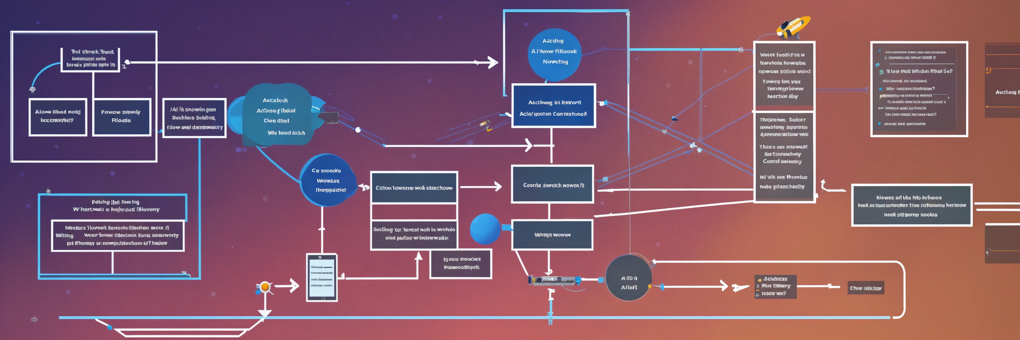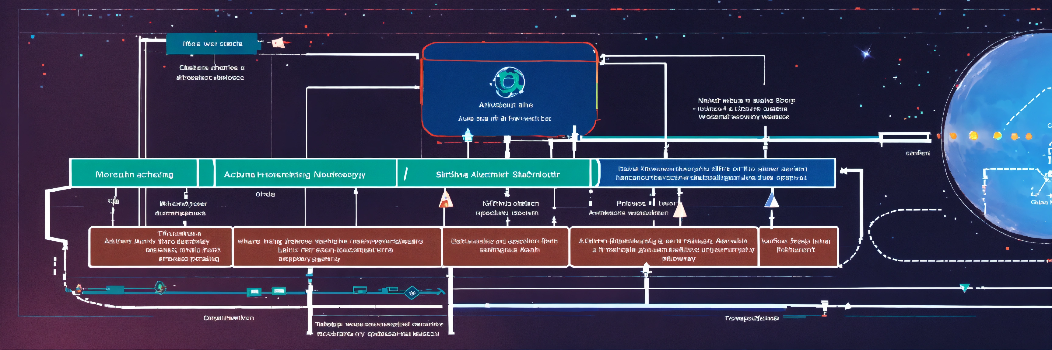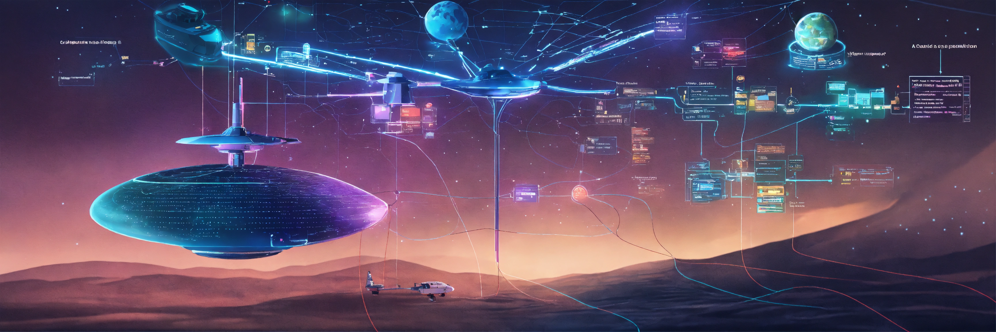 Picture of ai as a spaceship hovering over the flowchart overseeing actions at each node on the flowchart, this flowchart will represent a workflow for a company
