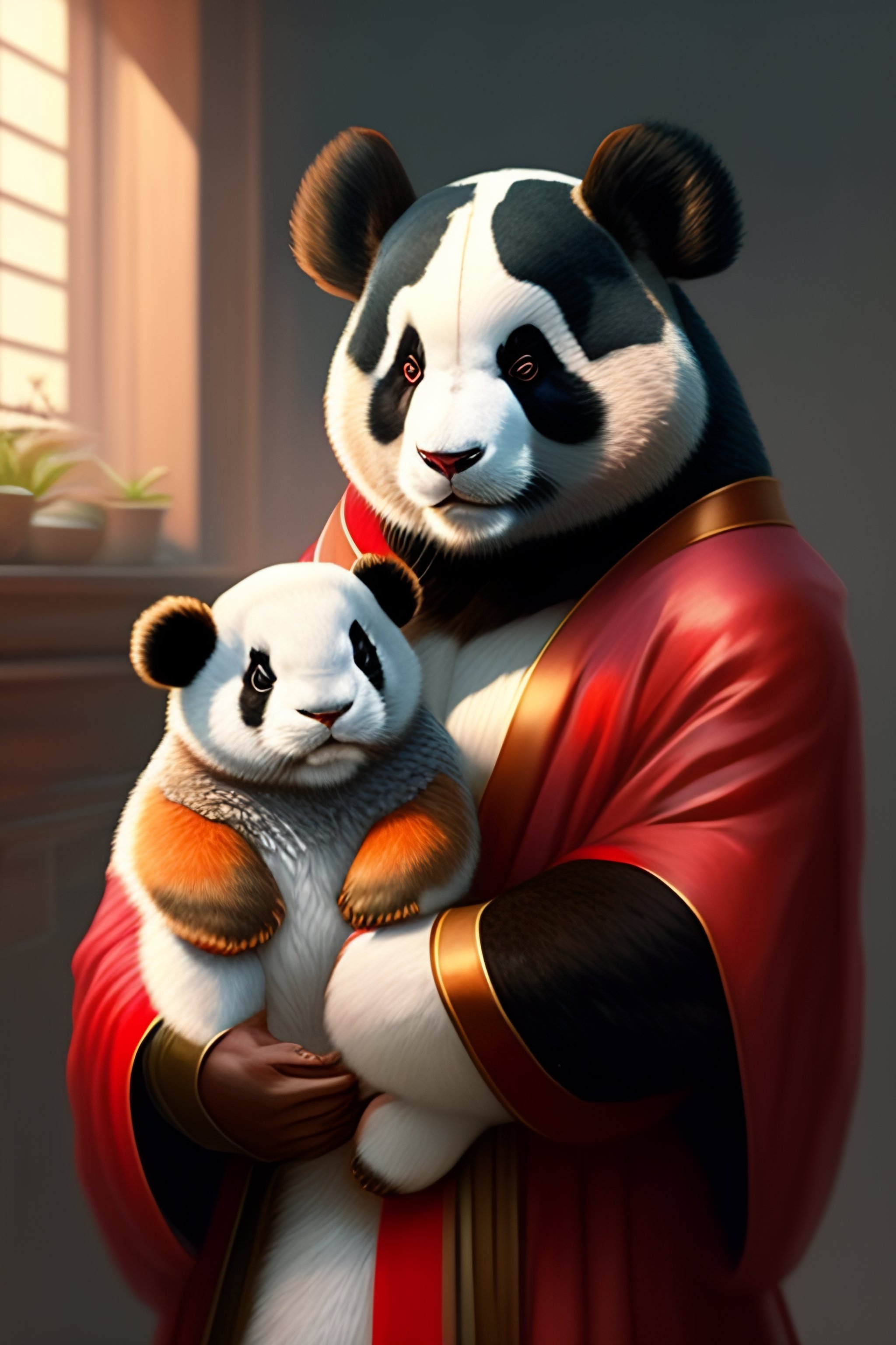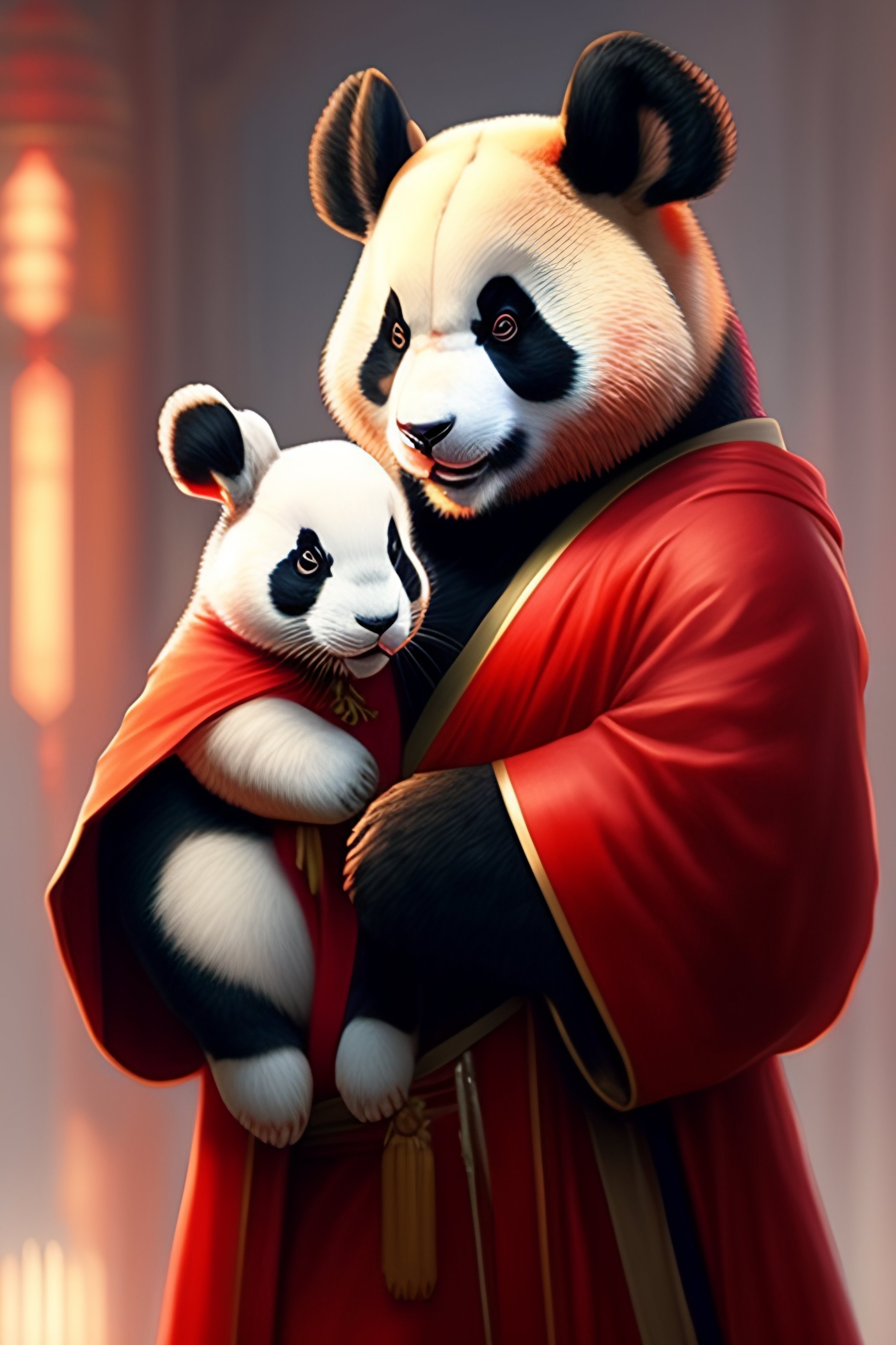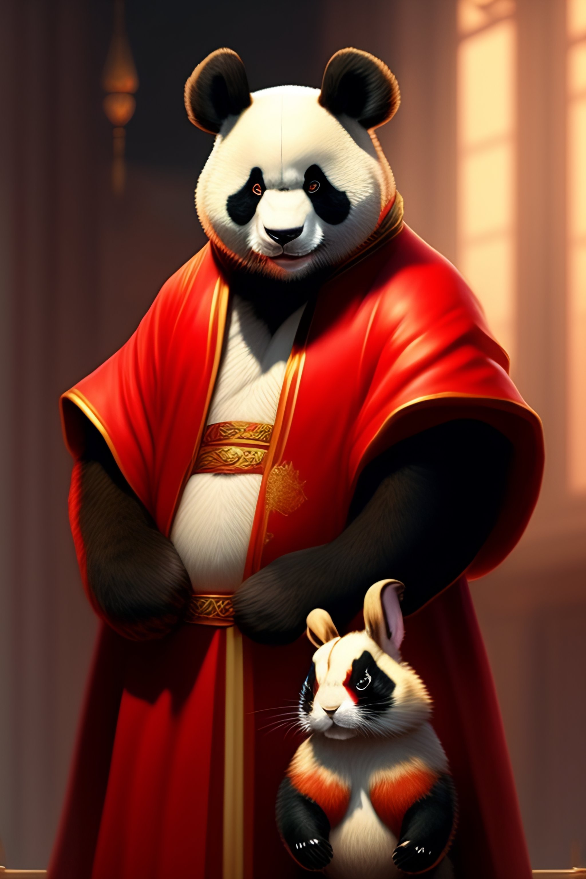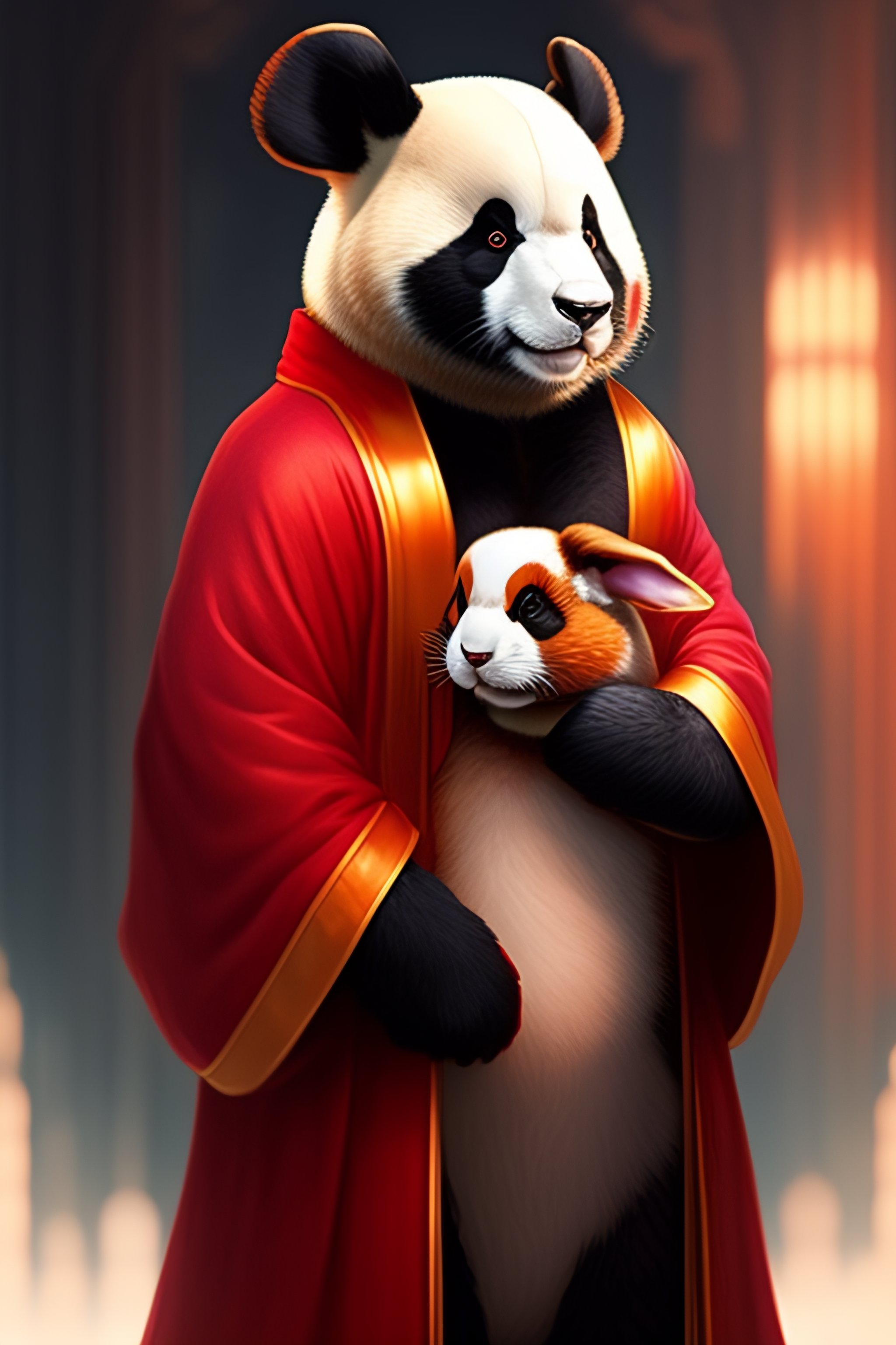 Anthro furry humanoid panda holding a rabbit, wearing a red chinese robe, character concept design, painting, detailed, vivid, trending on artstation, by greg rutkowski