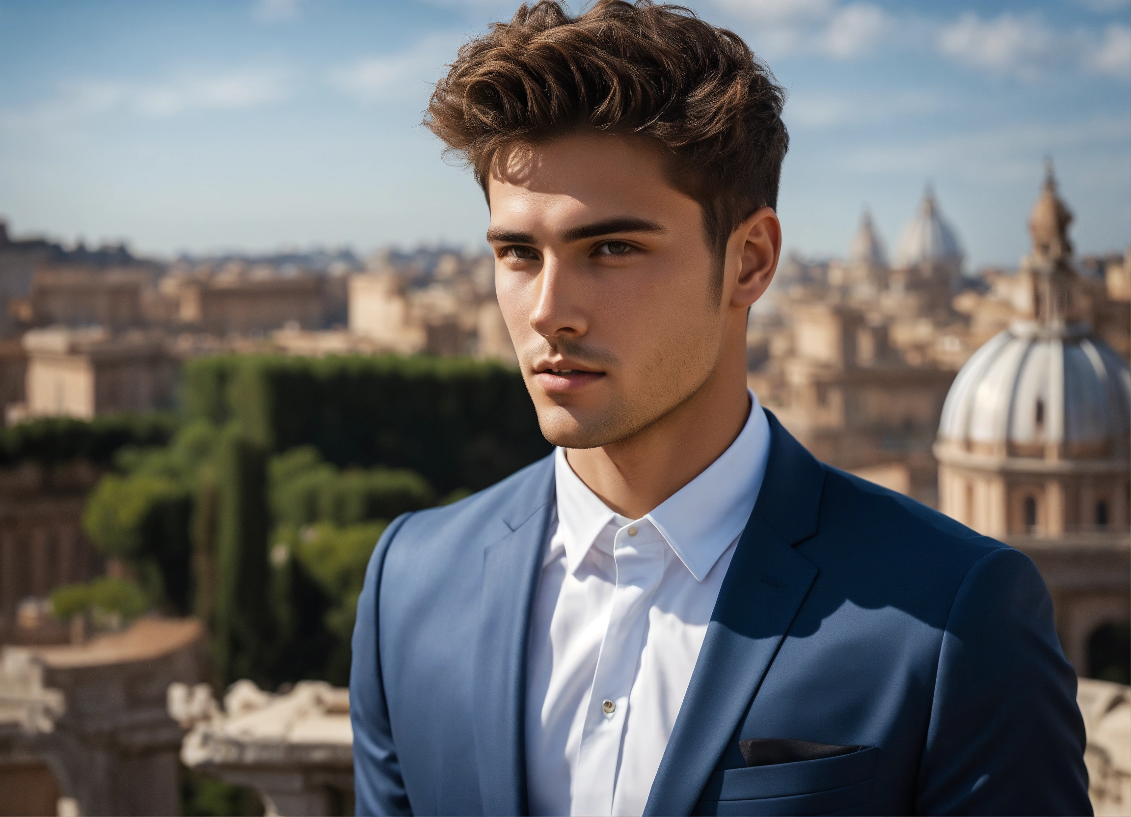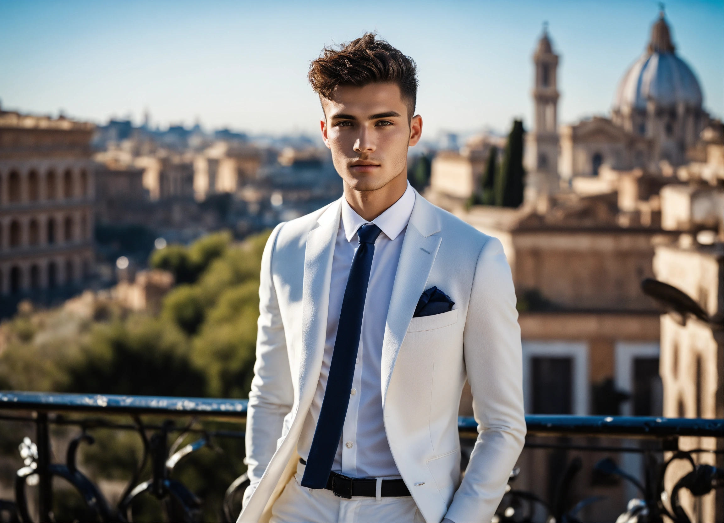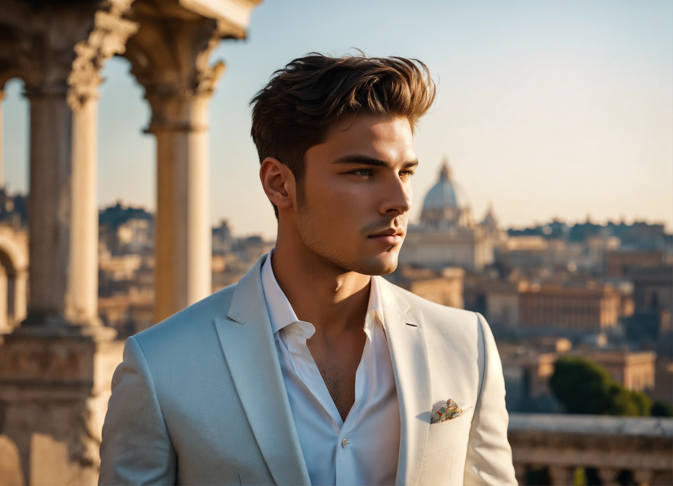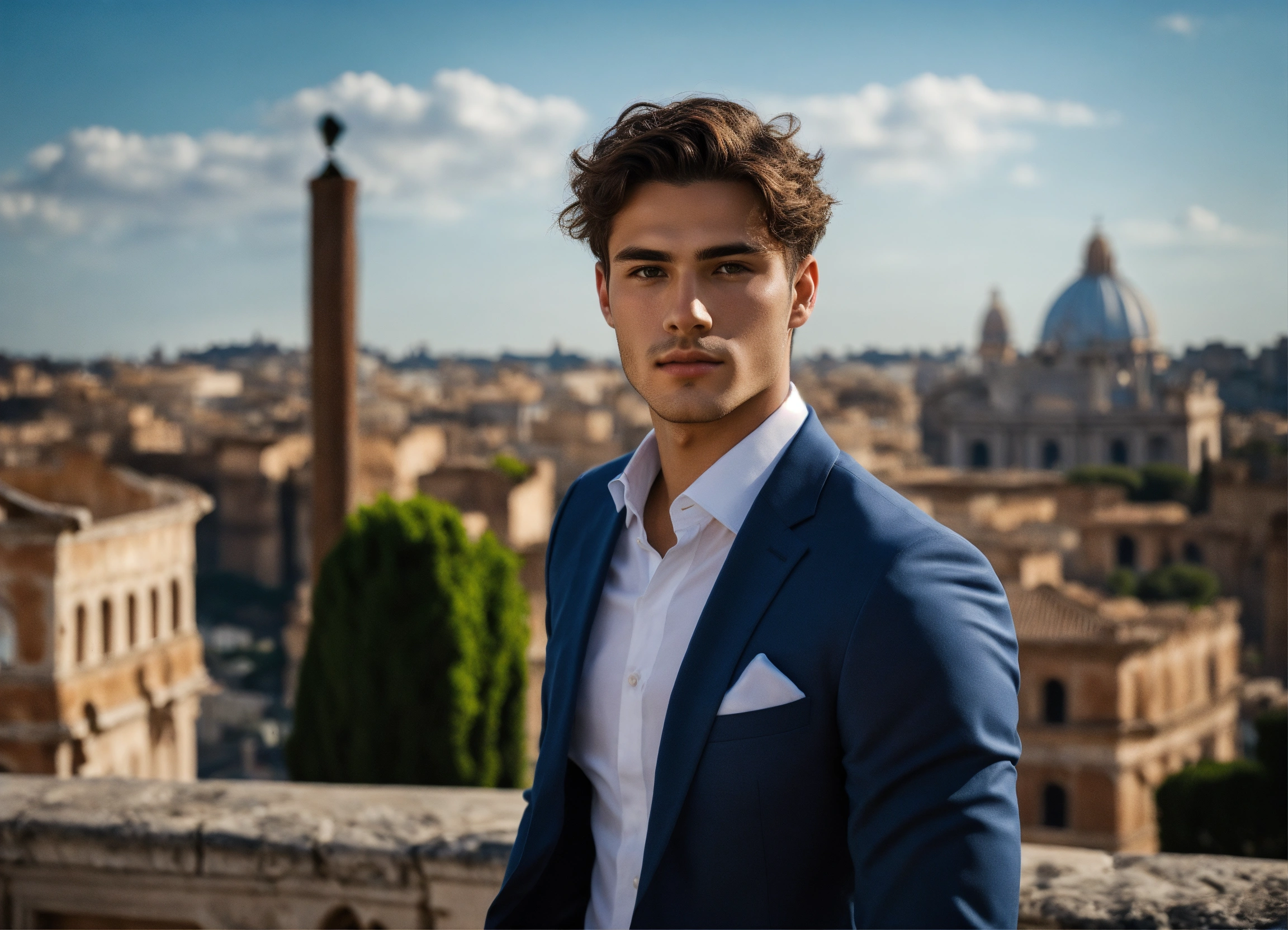 Photo of one young male model in whiteclothes looking to the camera, in front of the skyline of rome of rome, sunny day, not painted, very realistic and detailed faces, skin with pores, 4k, dark suit, skin not smoothed, looking into the camera