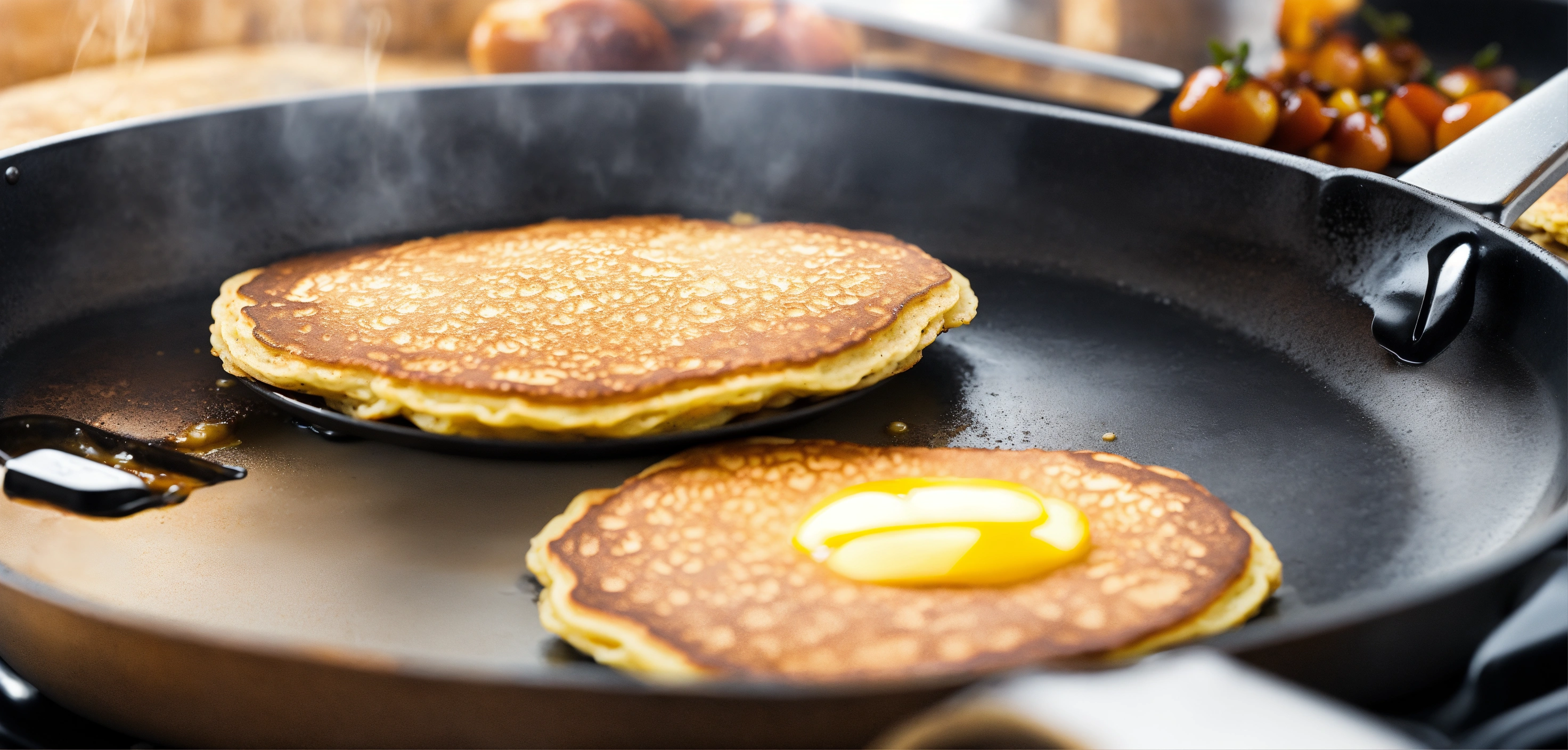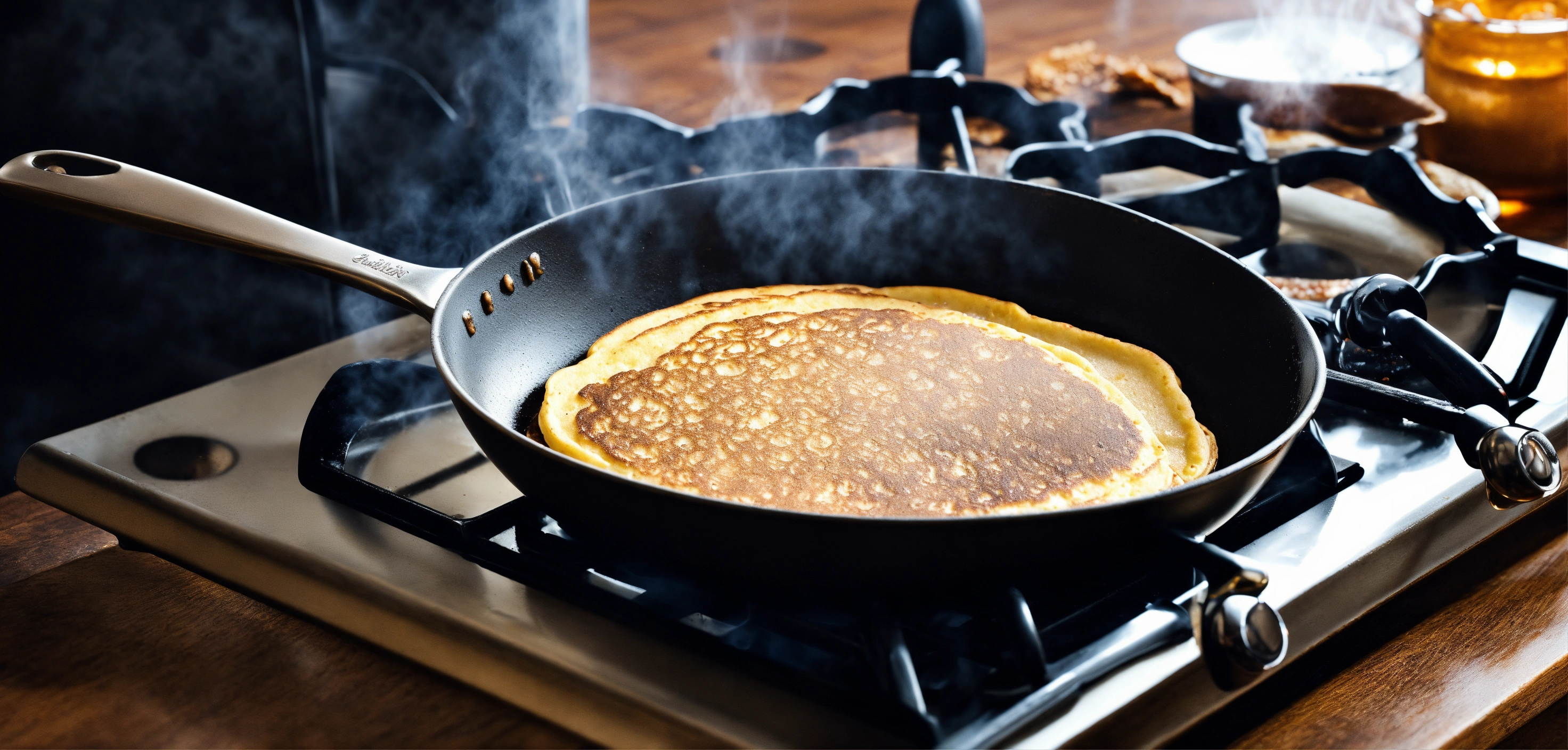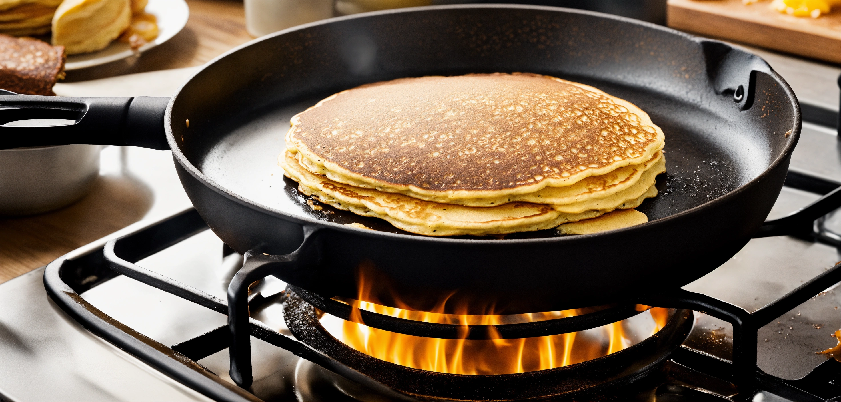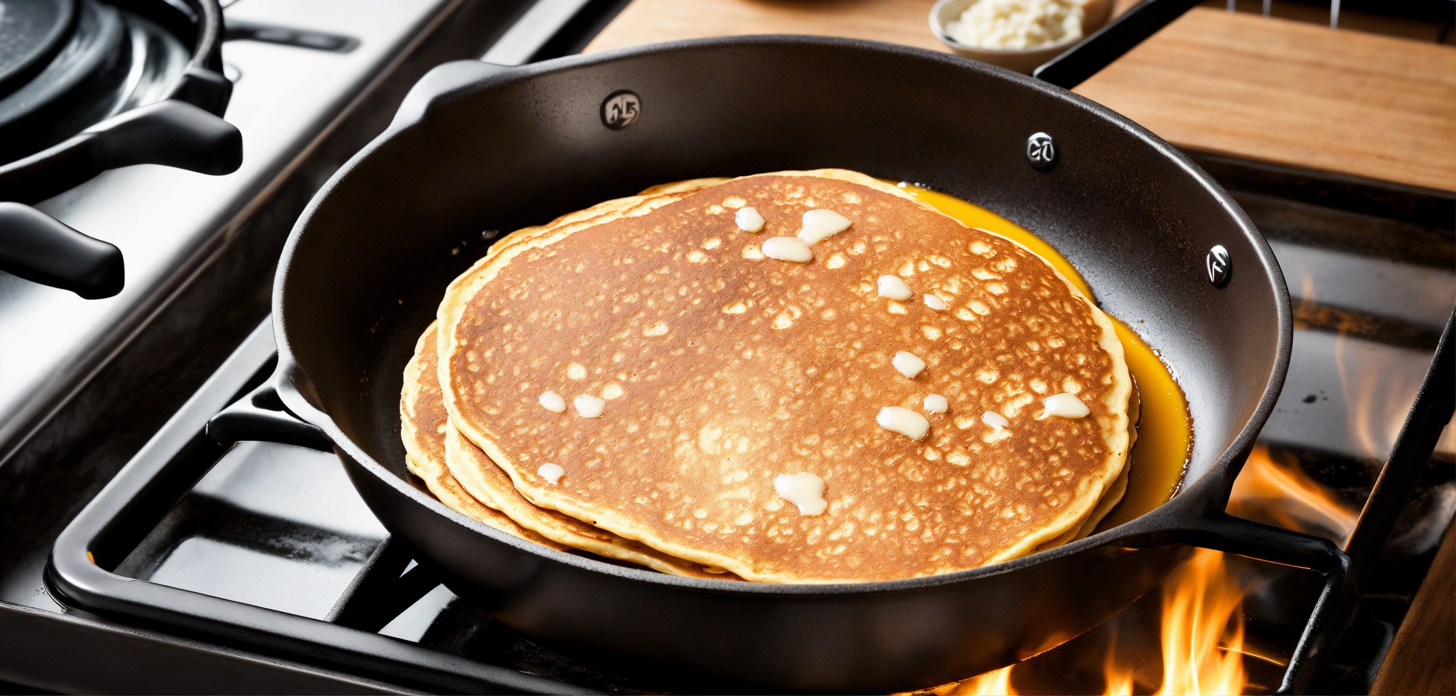 A frying pan that has come to life and is cooking pancakes on the stove