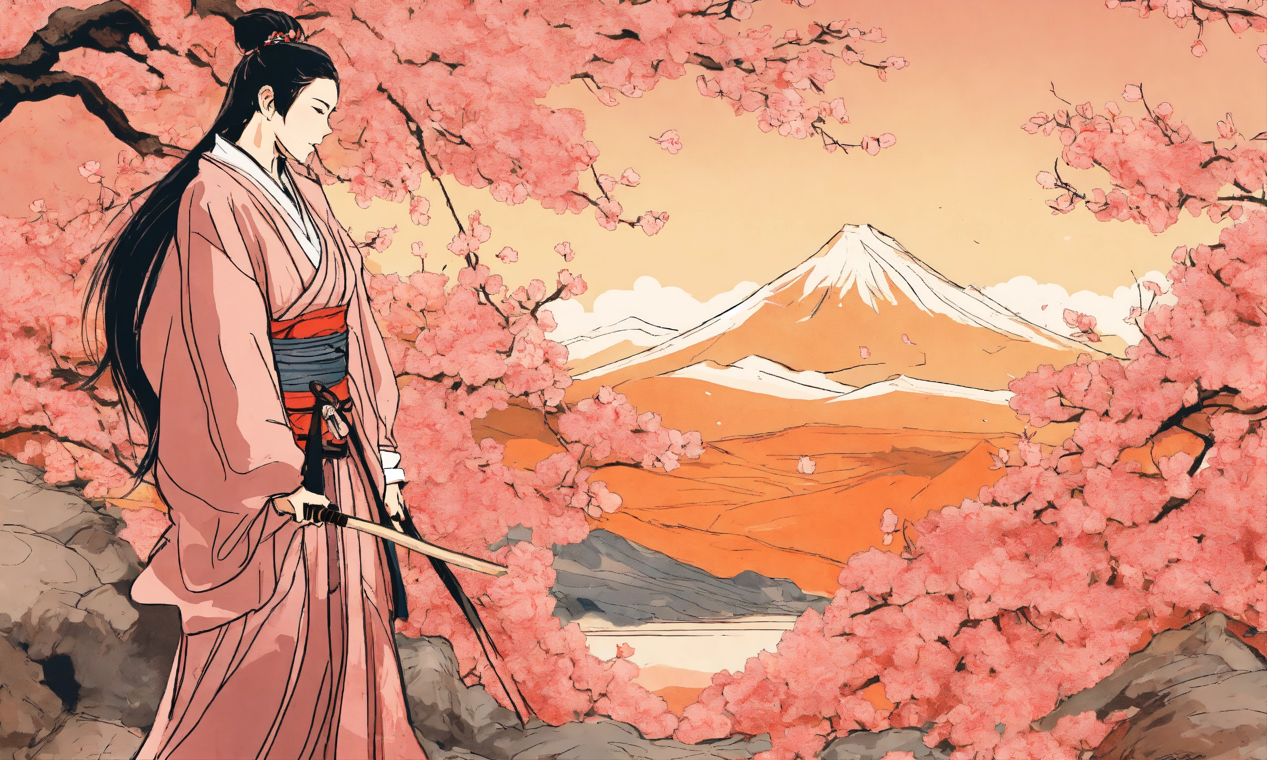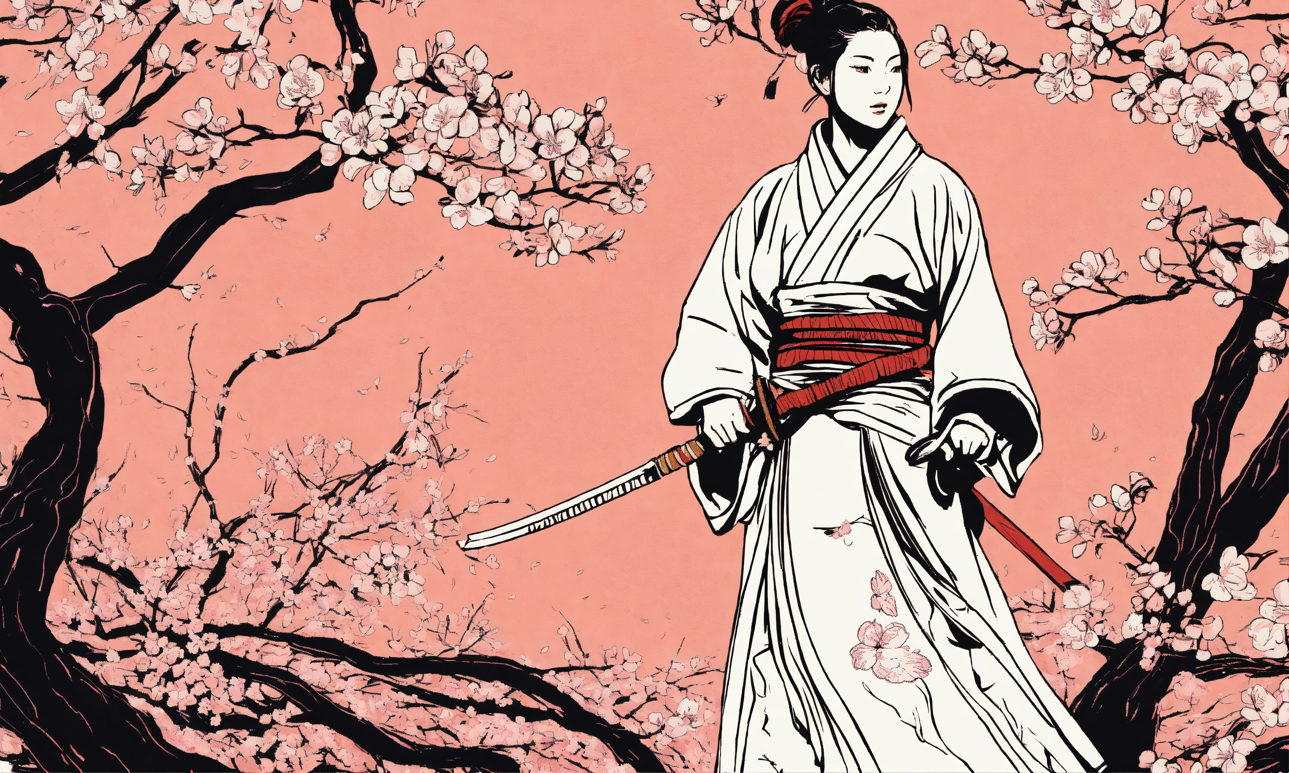 Vector, line drawing of a full-length female samurai warrior in the garden branch of cherry blossoms, gauguin picasso pictorial technique