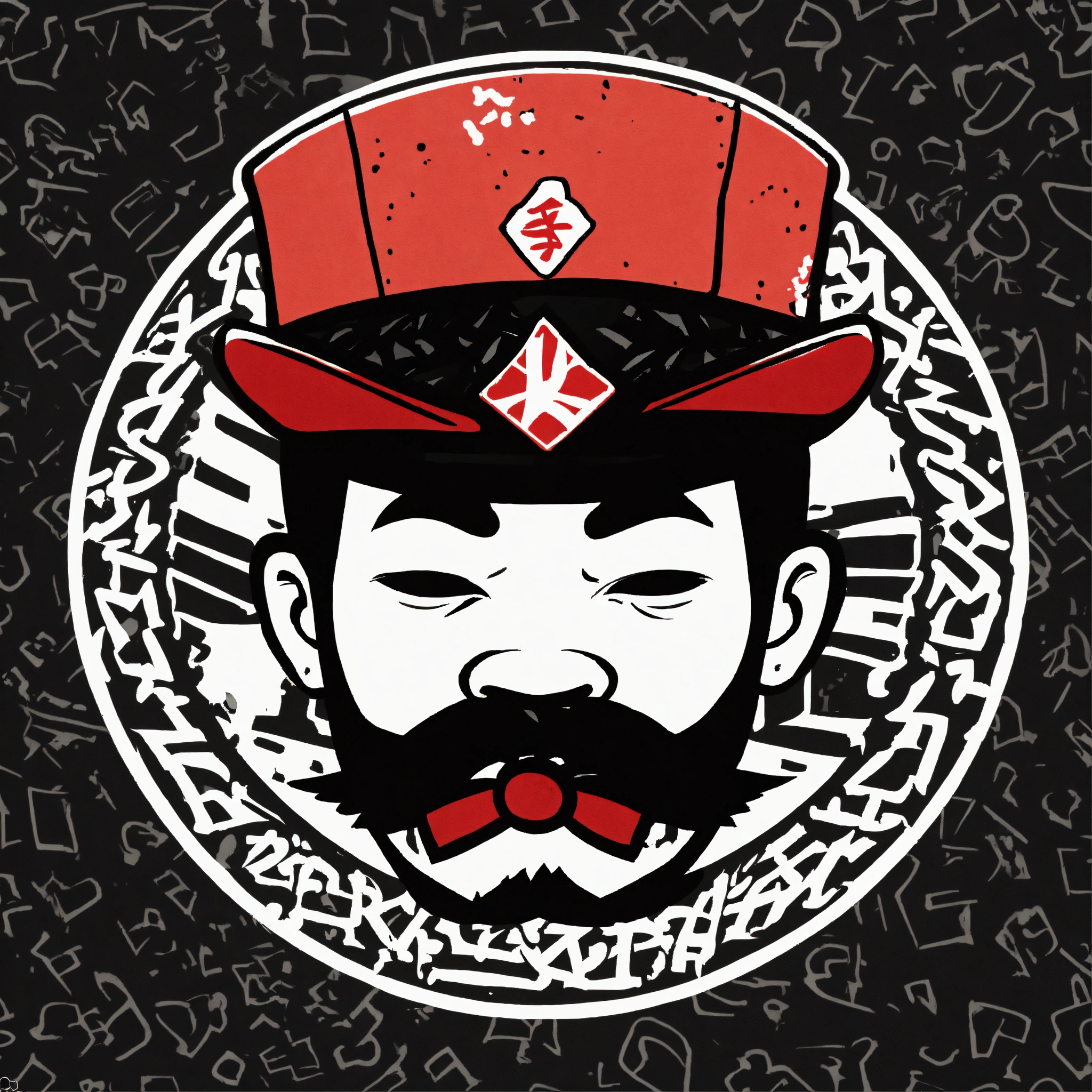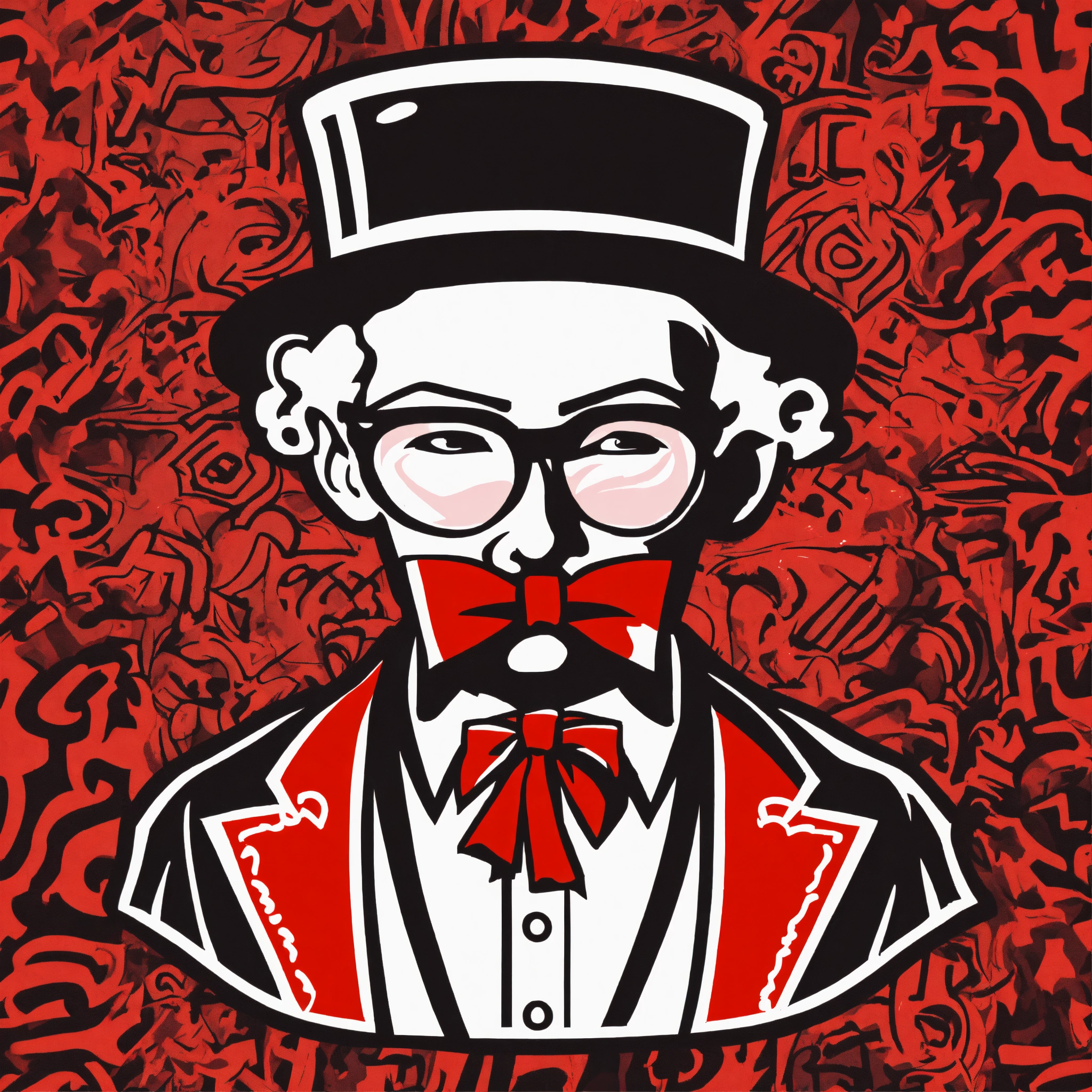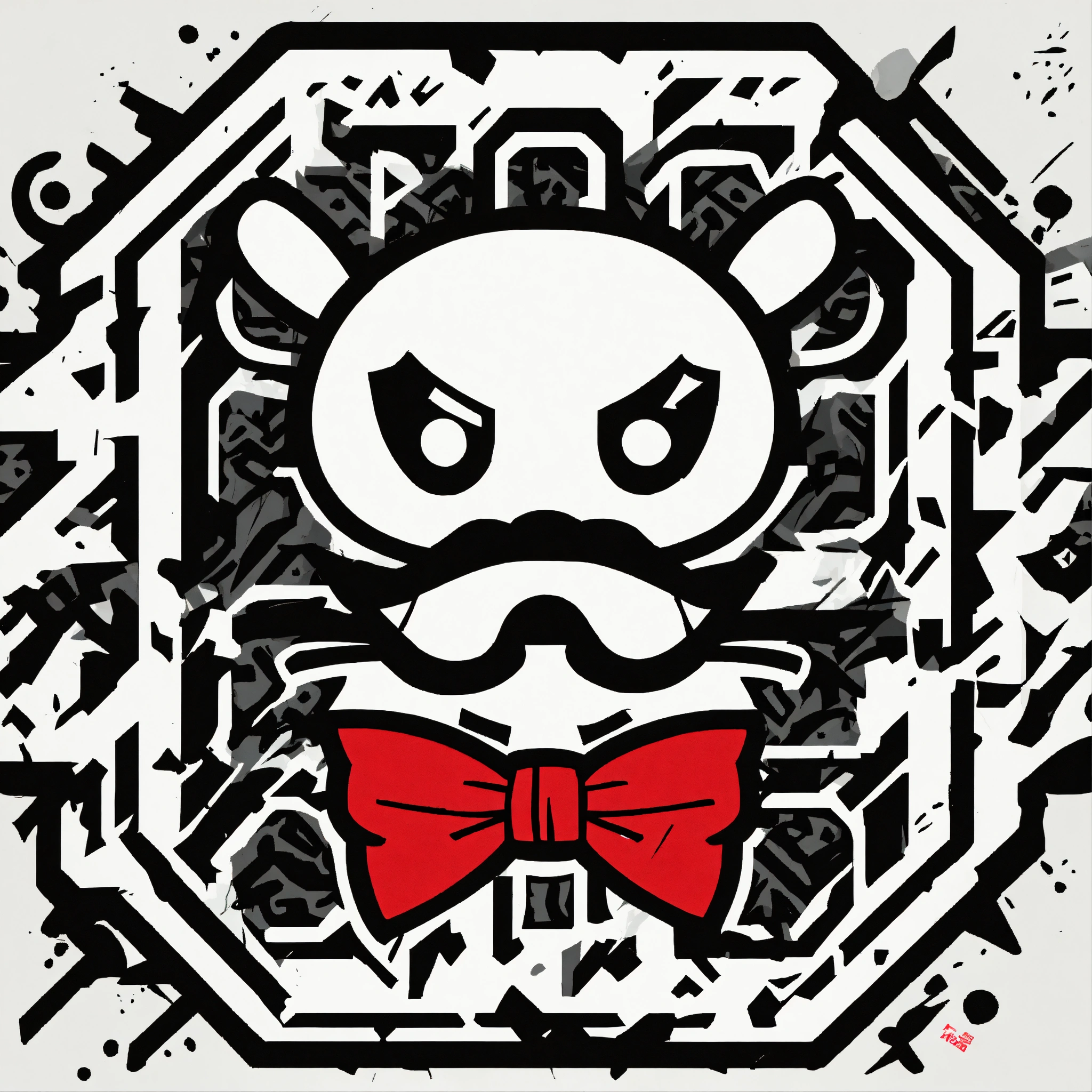 Keith harring style japanese bape graffiti cartoon logo design of a logo wizard with red bow tie mascot, nigo boondock's inspired flat vector, fashion company logo, andy warhol style, color black and white, white background.