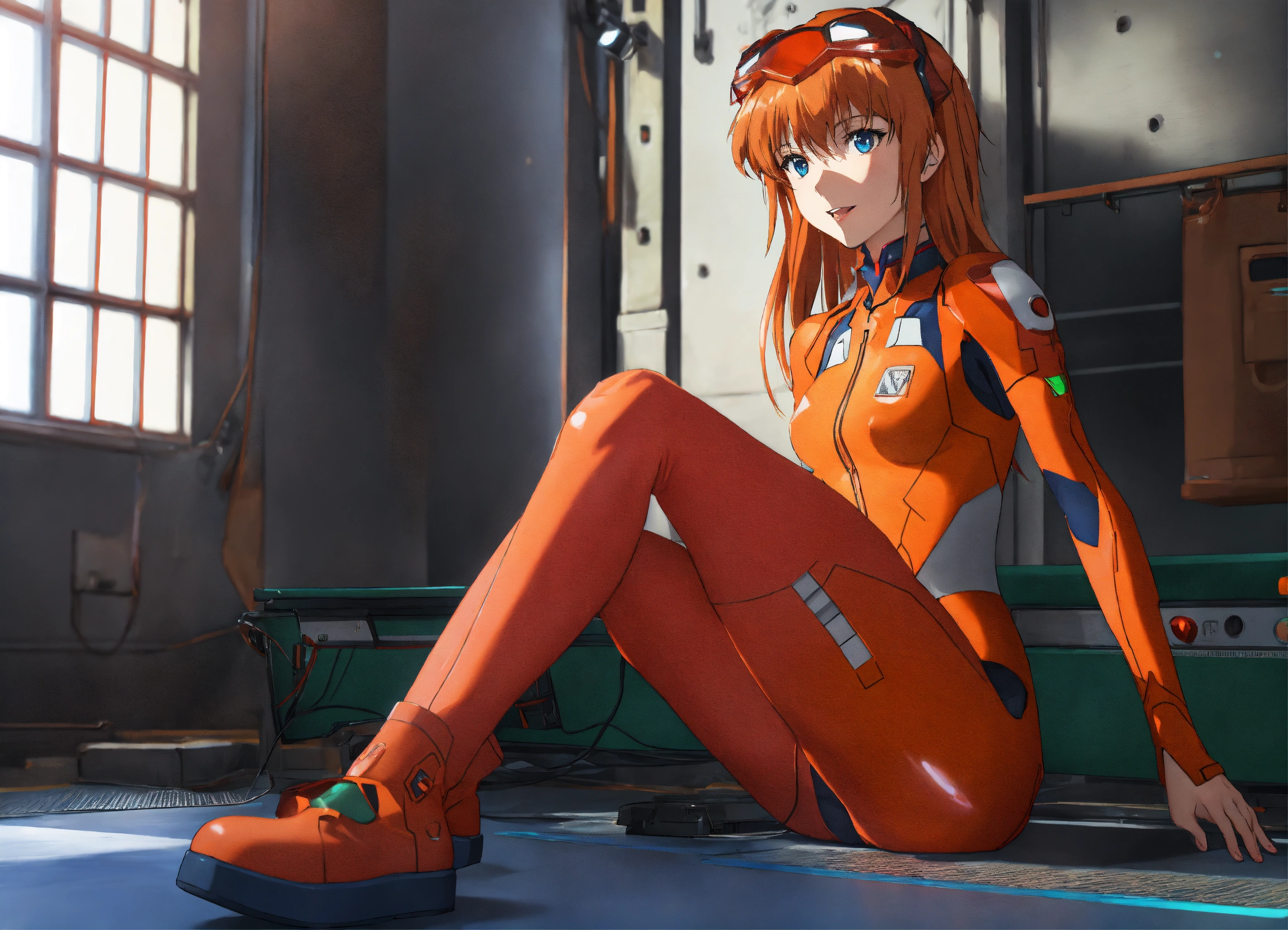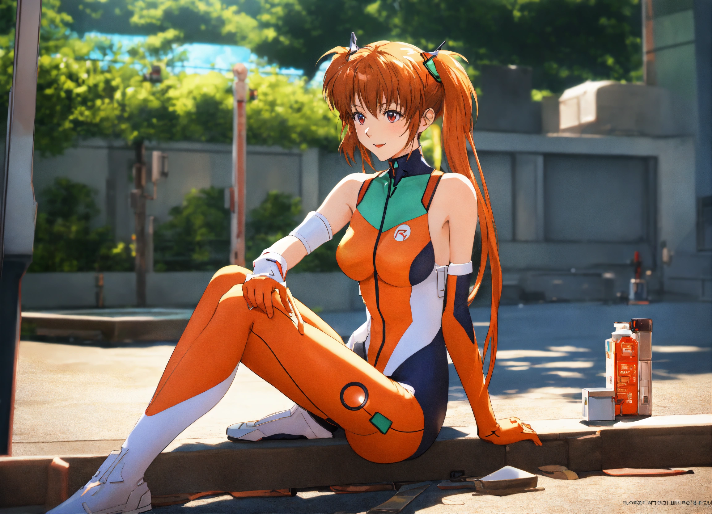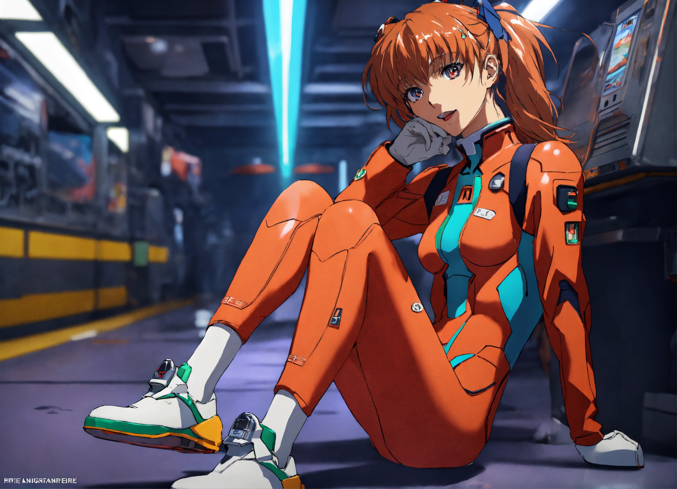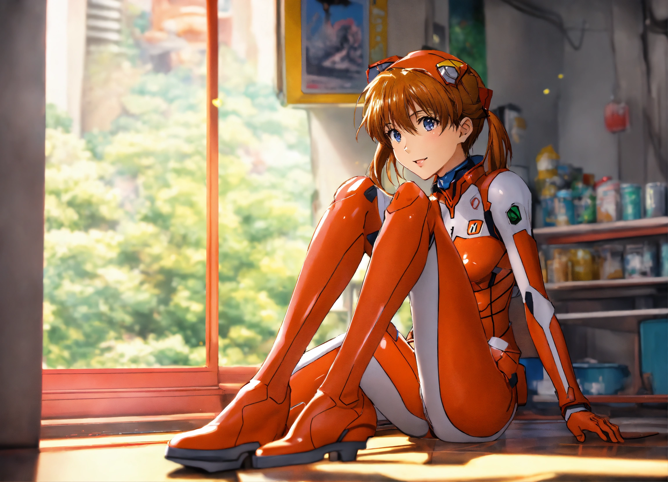 Anime art of asuka from neon genesis evangelion, plugsuit, young girl, beautiful girl, happy, stunning detail, detailed environment, trending on artstation, unreal engine render, ray-traced environment, vintage 80’s anime artwork, full body, sitting
