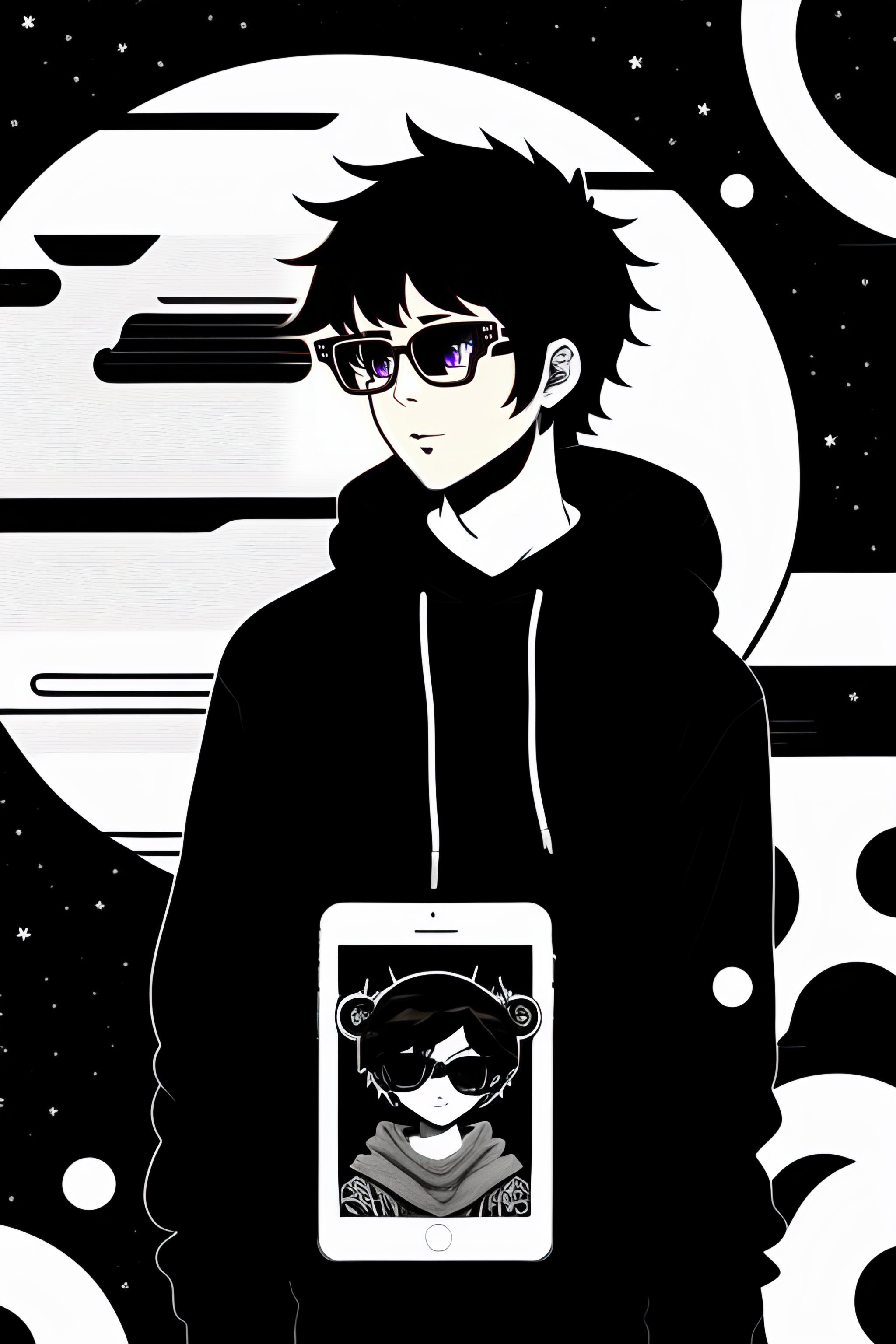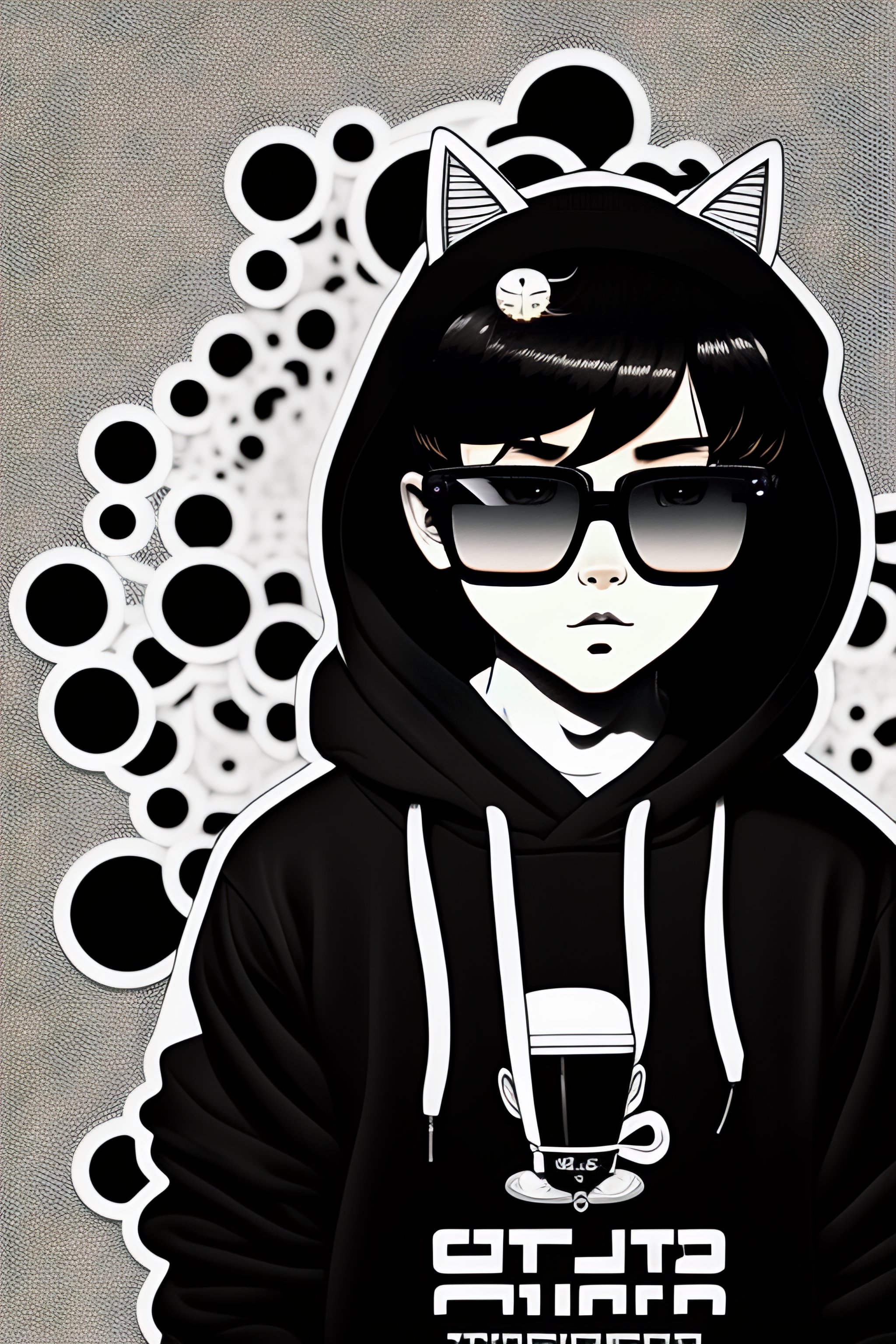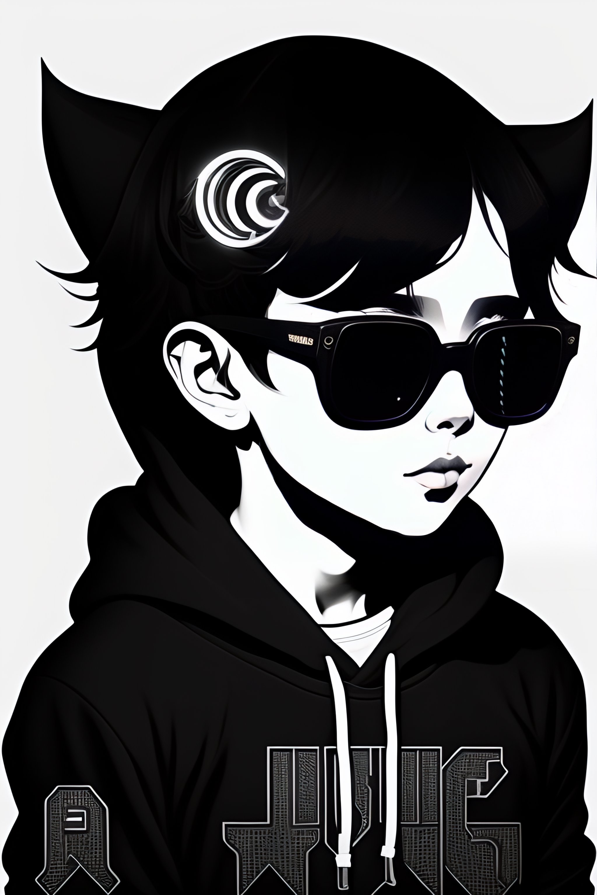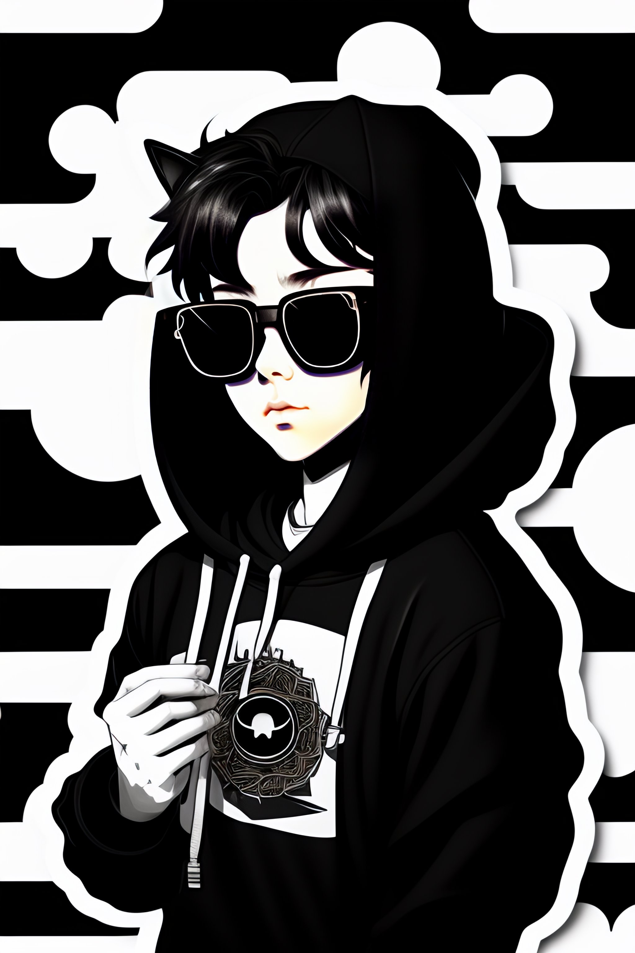 Twitch vtuber model, boy in black hoodie, long dark hair, black and white cat ears, black sun glasses, line art, retro anime, manga, black and white, pixels 8 bit, pen drawing, sticker, glitch, pattern, hypno circle, space