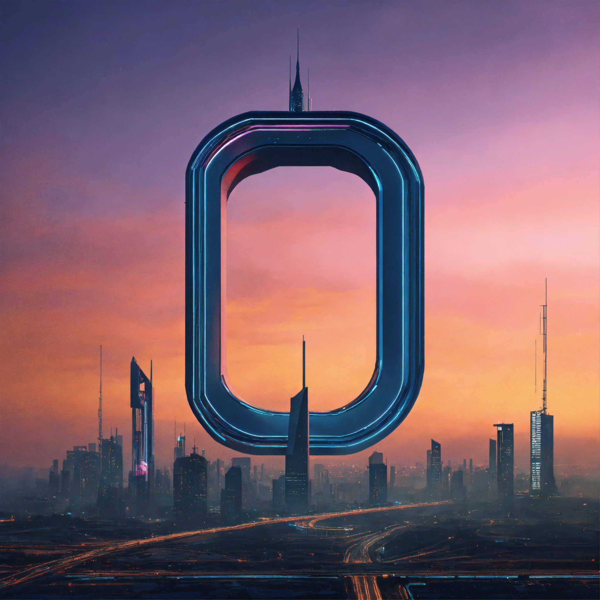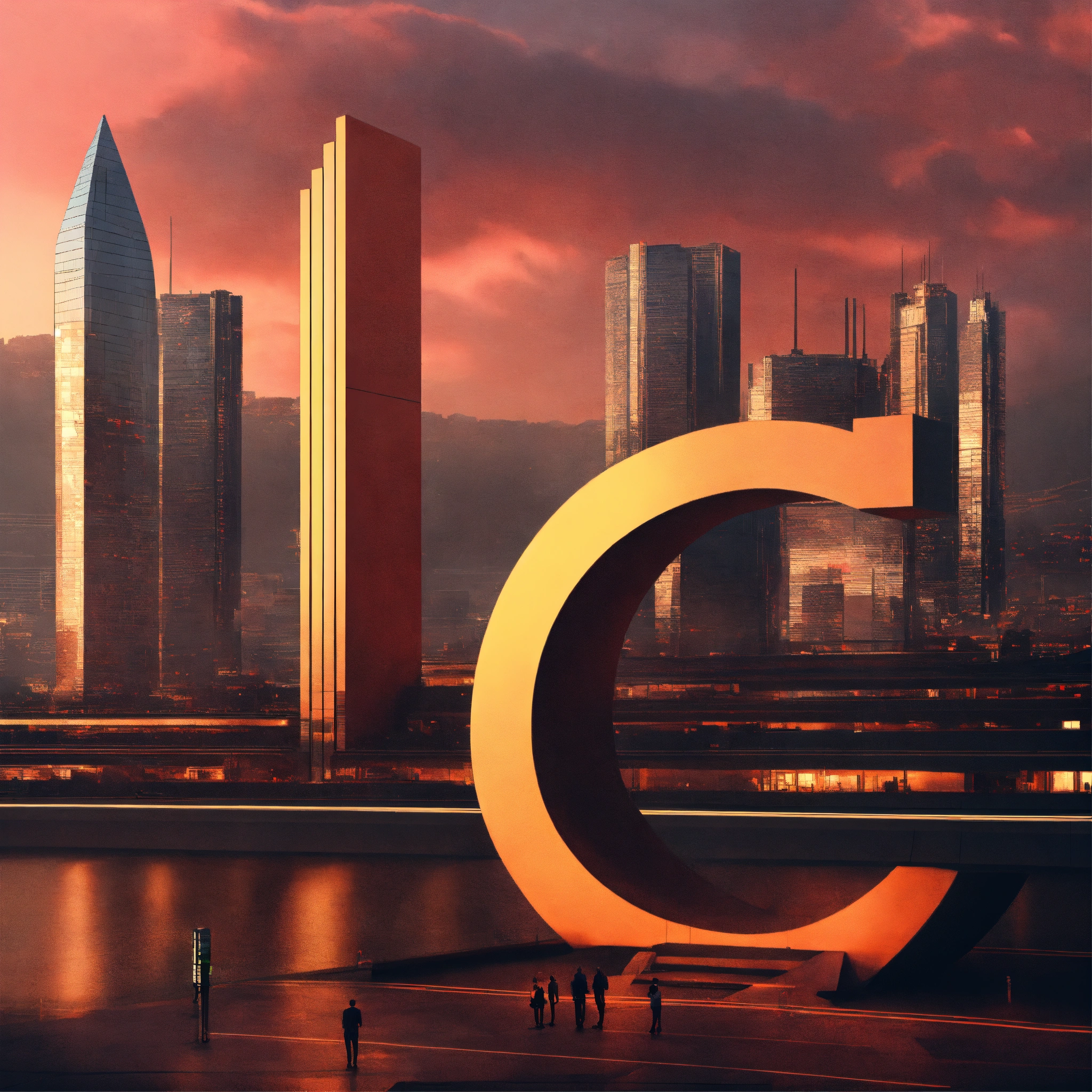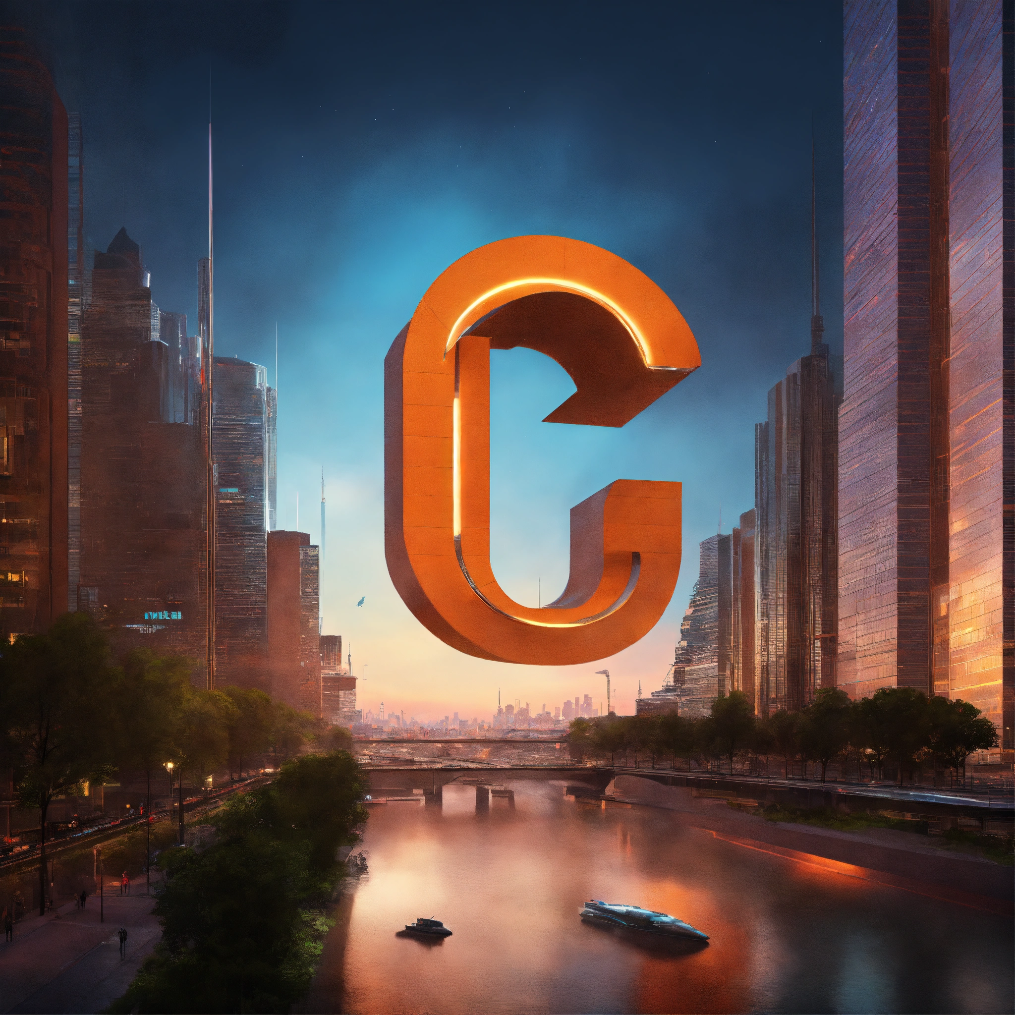 The letter "c" depicted as a minimalistic structure in a futuristic skyline