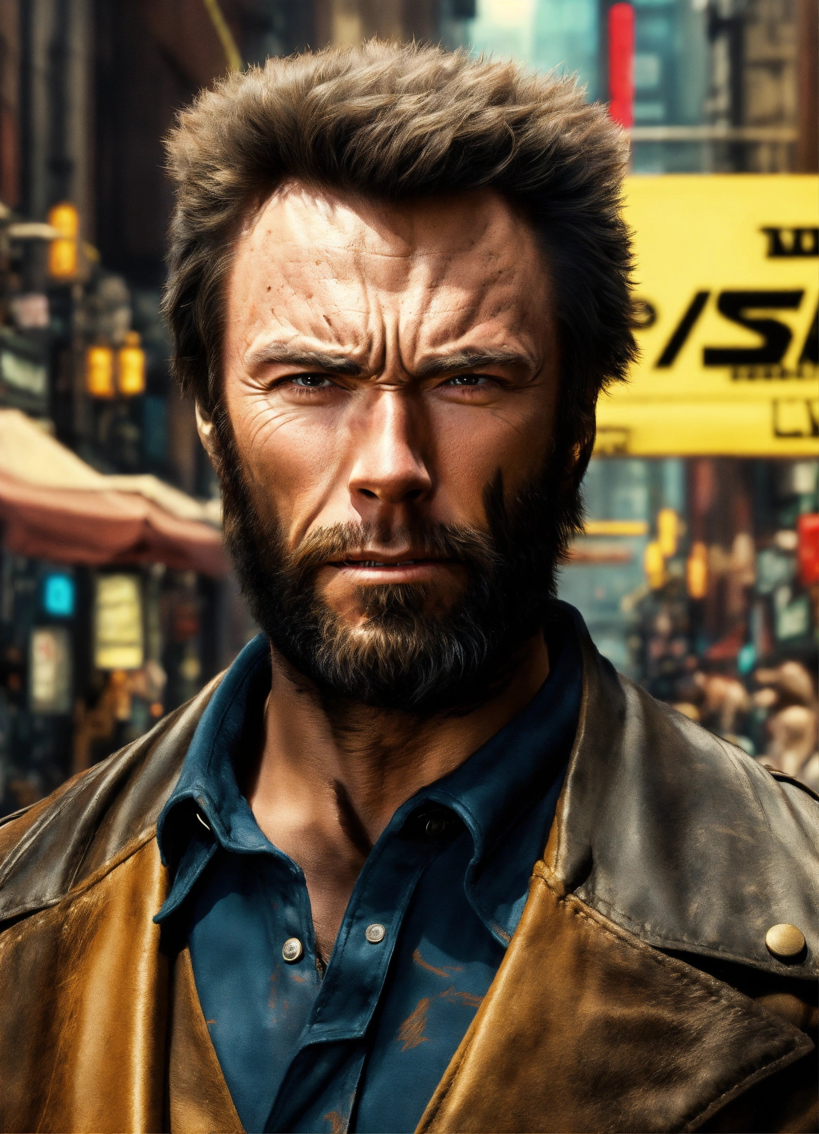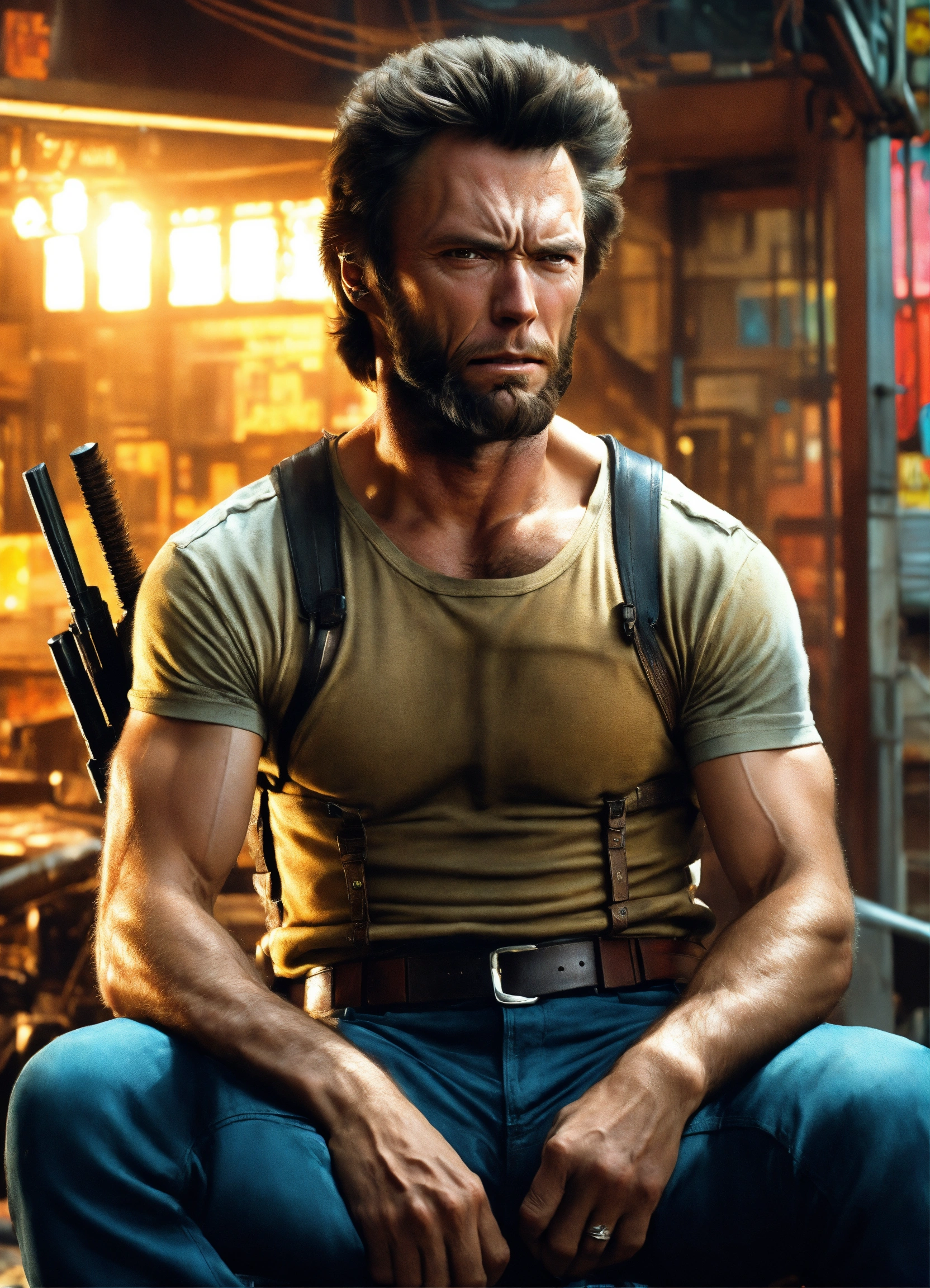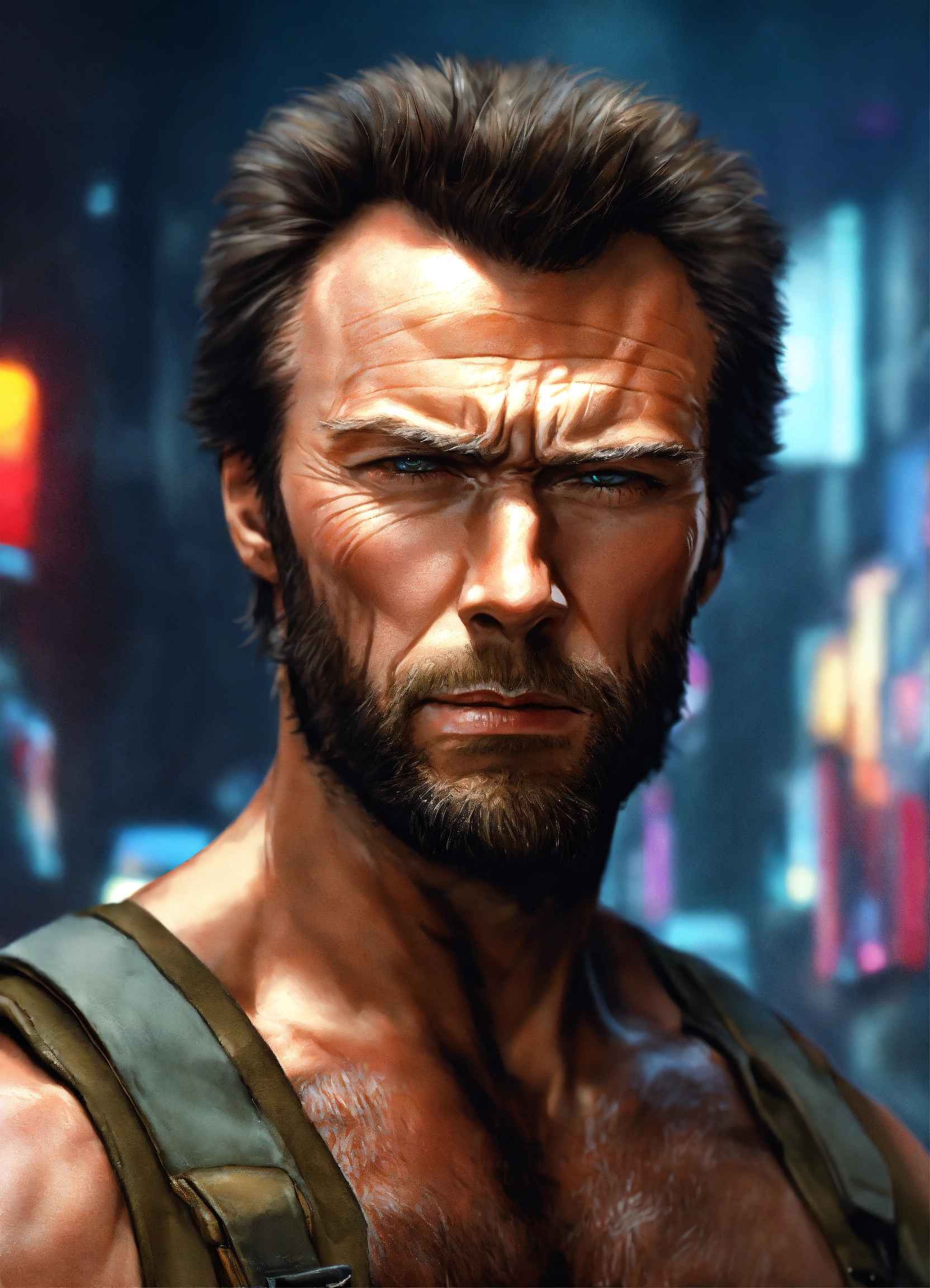 Young clint eastwood with wolverine hairy and beard, is wolverine of x-men in a cyberpunk metropolis, 8k resolution, hyper detailed, intricately detailed, photorealistic