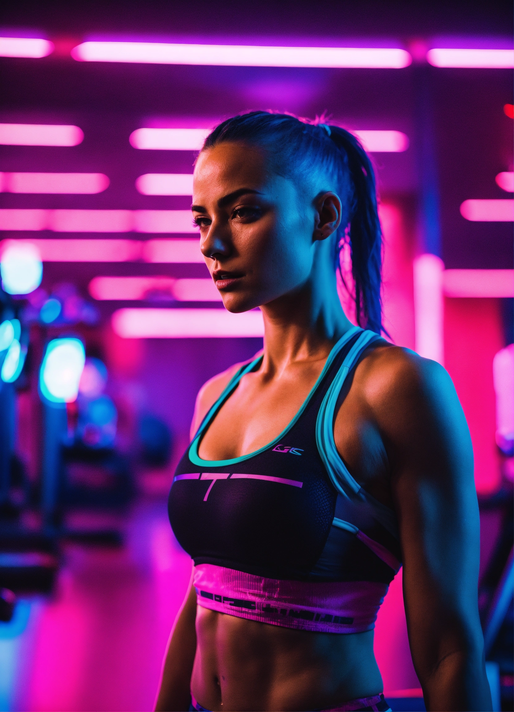 Cinematic photography cyberpunk style athlete at the gym neon colors, realistic details, ultra 8k resolution