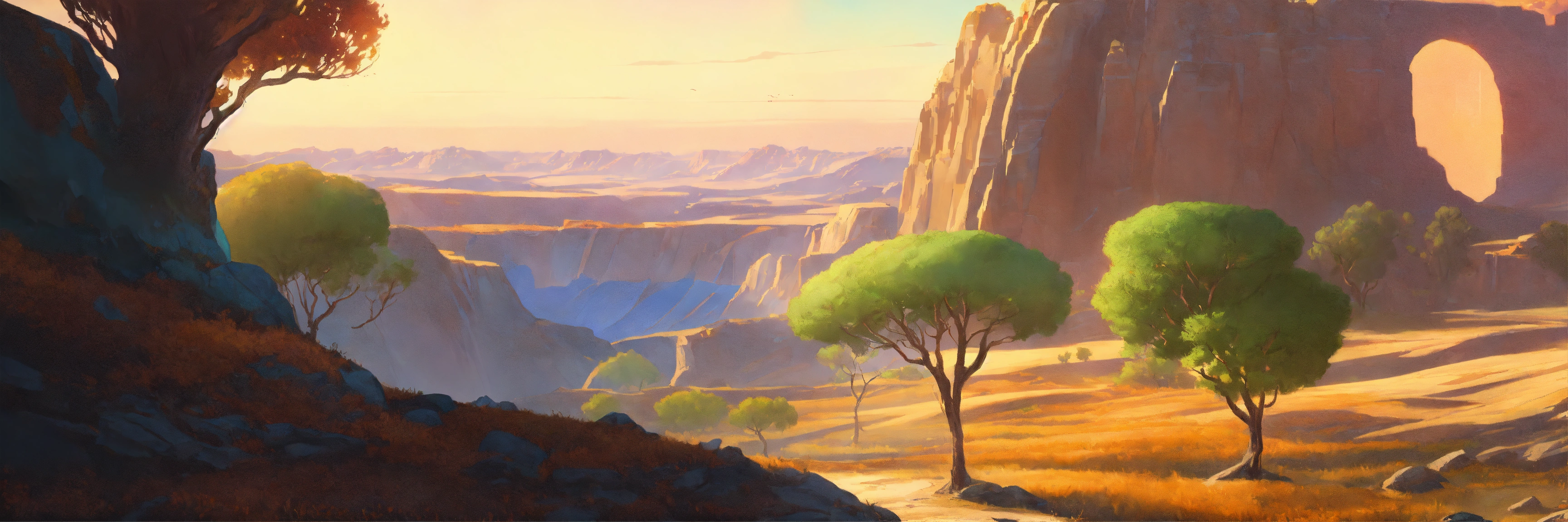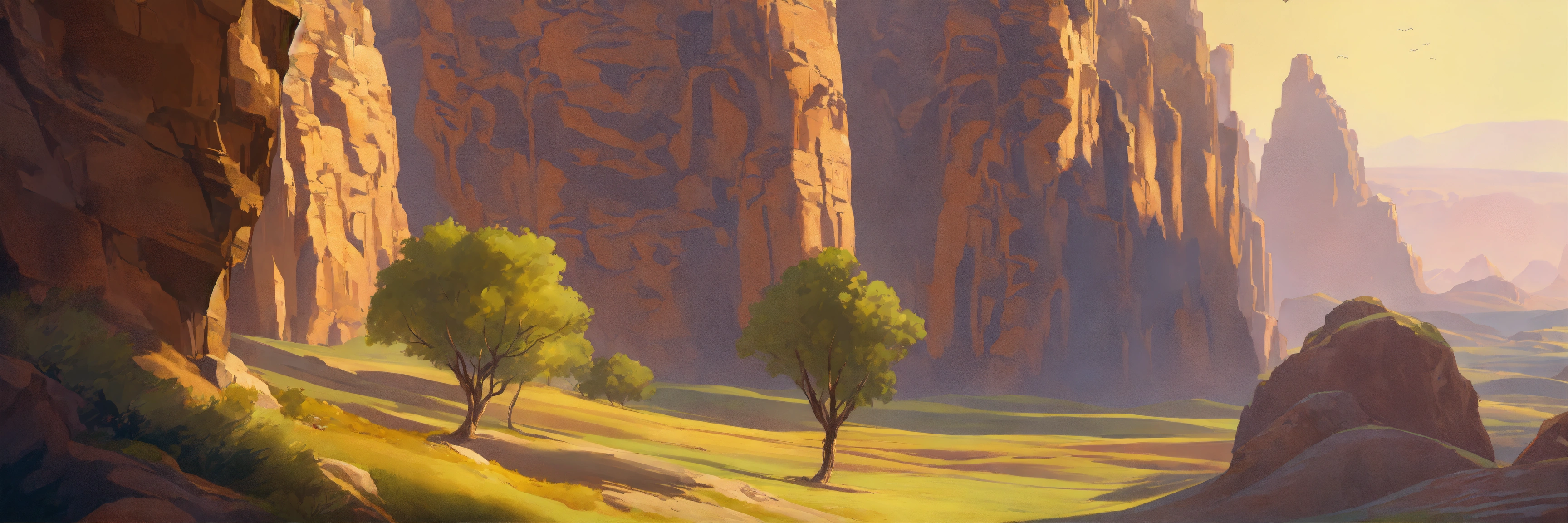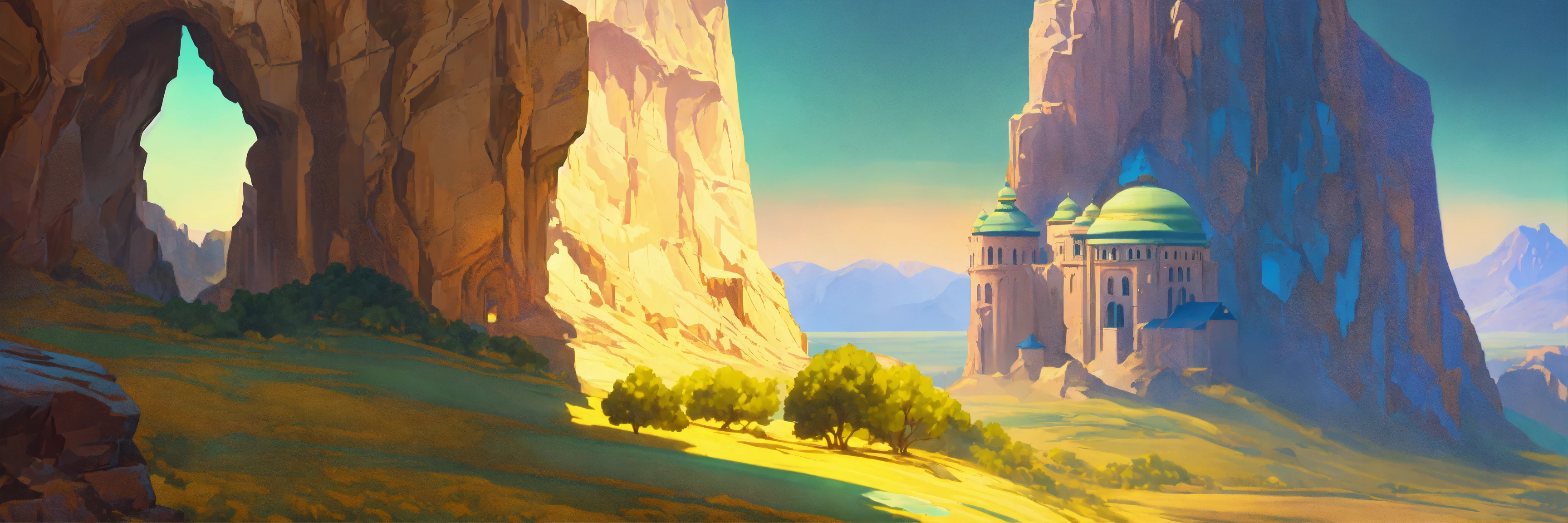 Mountain cliffs surrounding a valley, mystical, glowing gems, weird trees and rock formations, forest, bukhara style city in cliffs, highly detailed, digital painting, artstation, concept art, smooth, sharp focus, illustration, art by artgerm and greg rutkowski and alphonse mucha, erte, 8 k