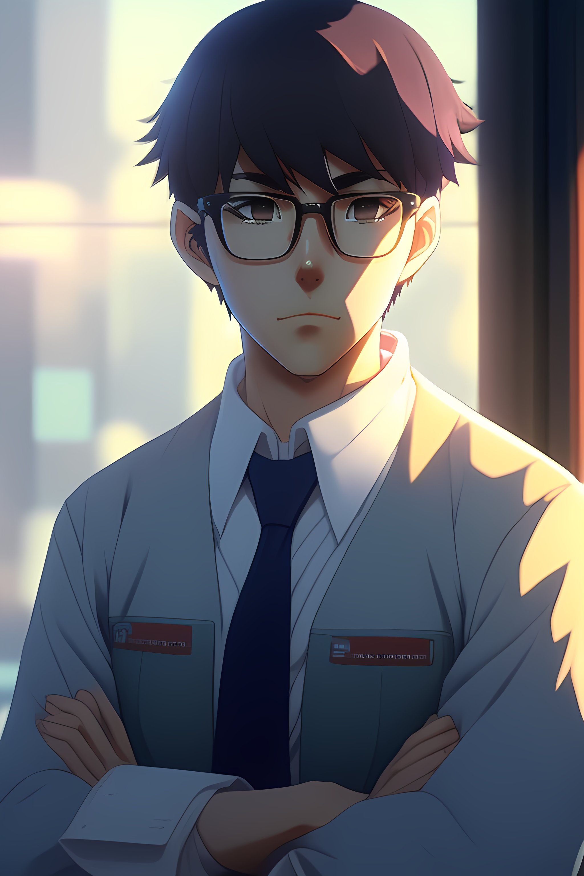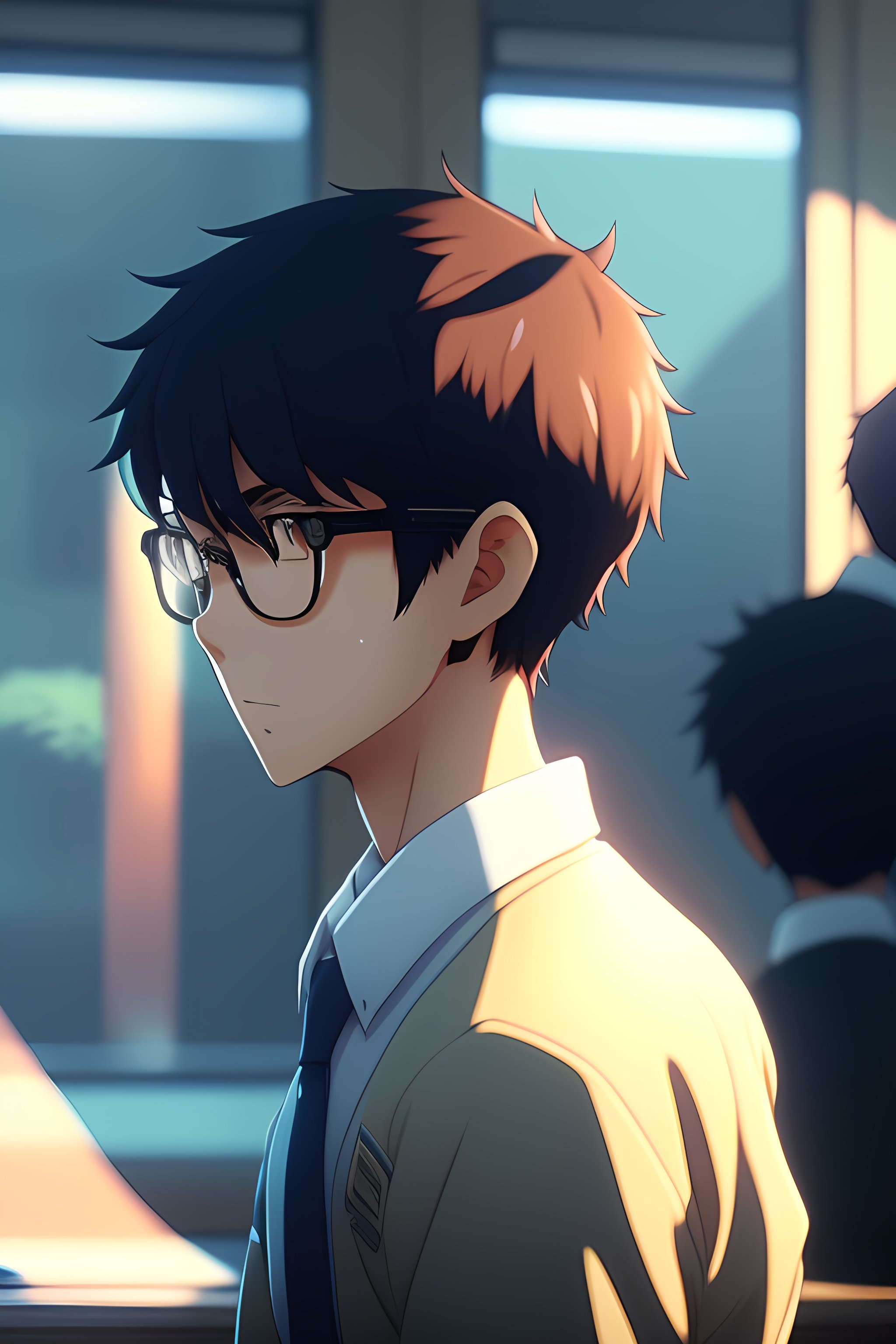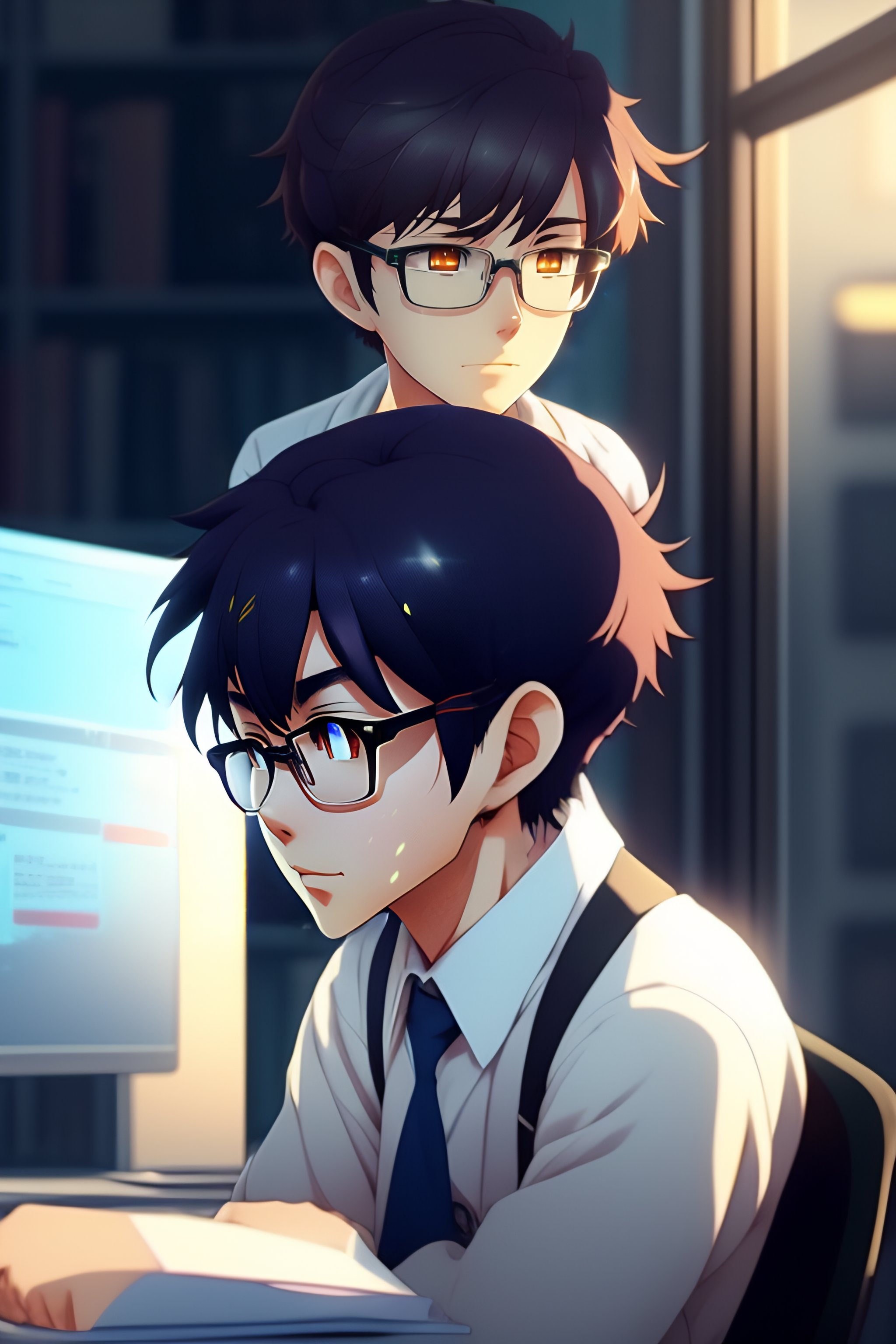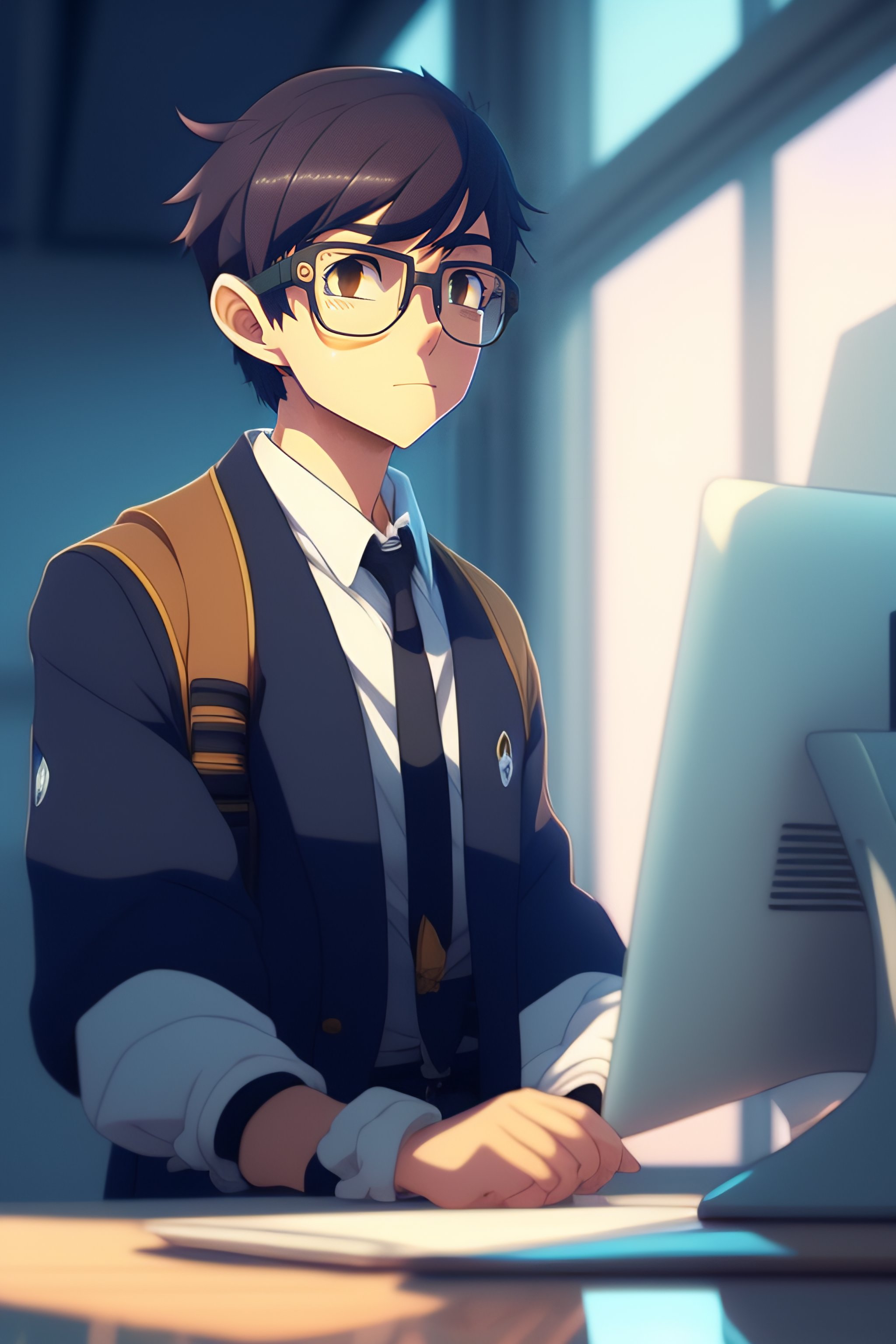 A nerdy anime boy is problem solving alone thinking about problems looking for solutions, in the office, worrying hands on head, upset, by makoto shinkai and ghibli studio, dramatic lighting, highly detailed, incredible quality, trending on artstation
