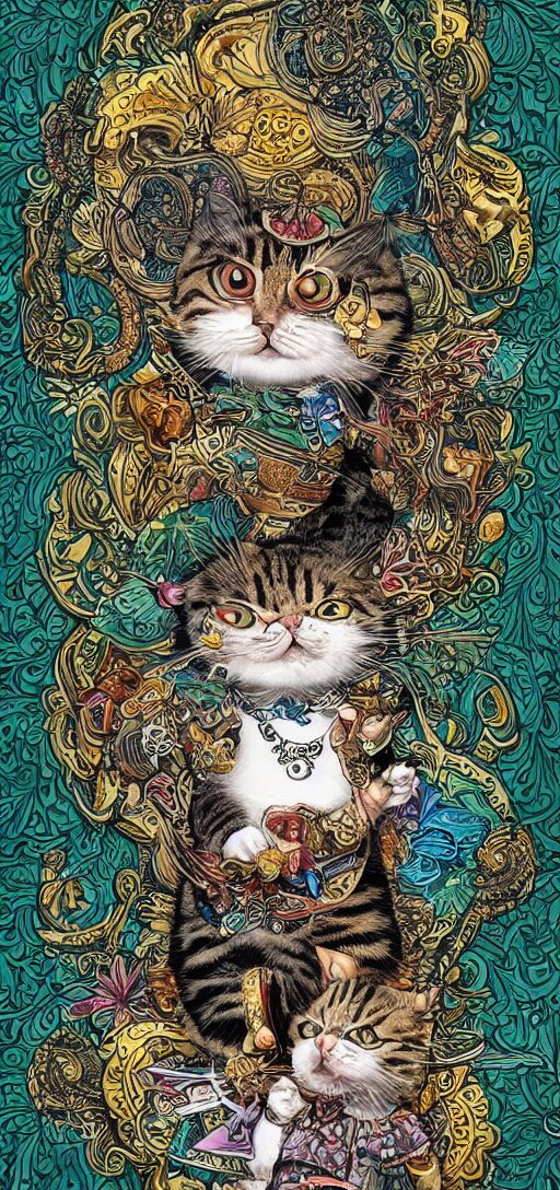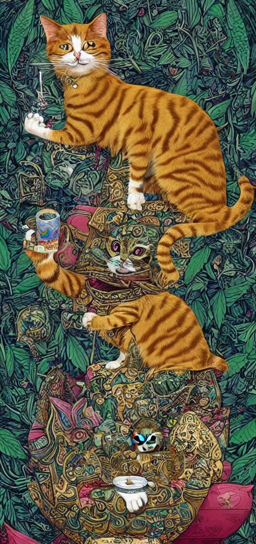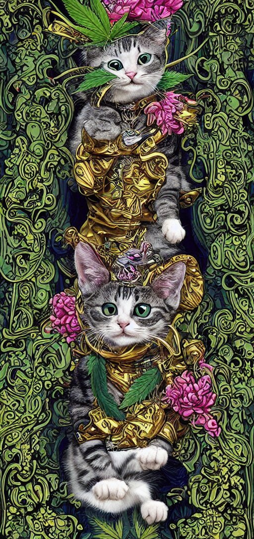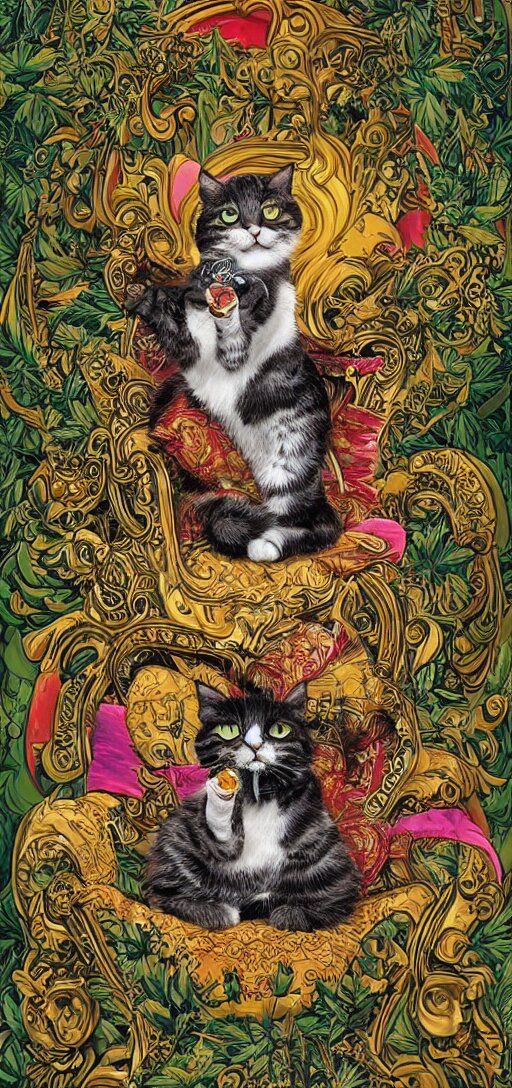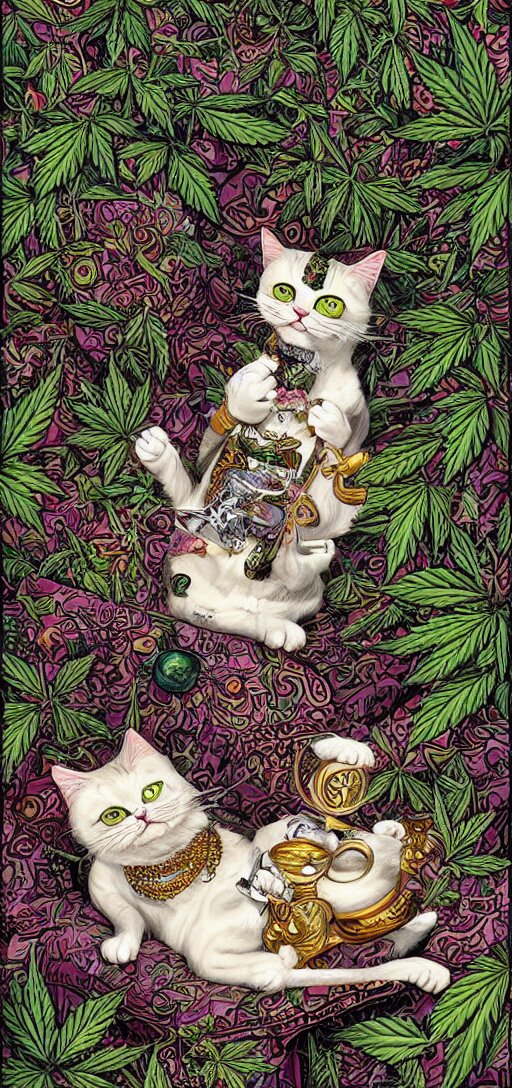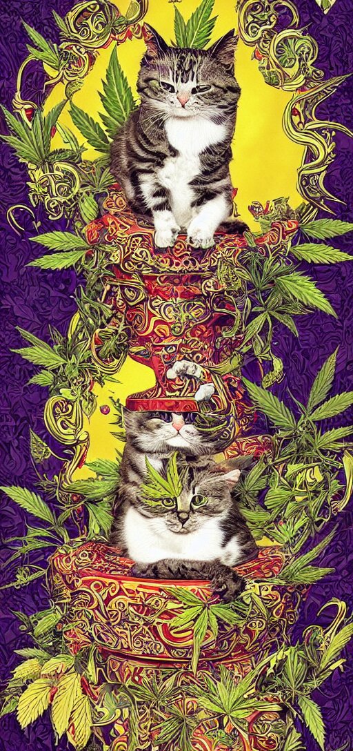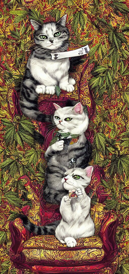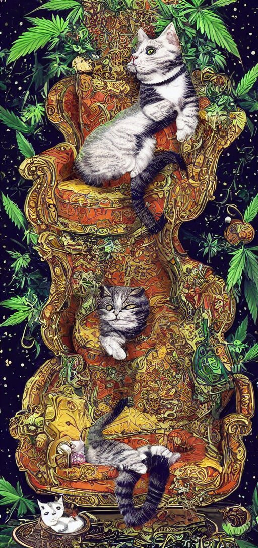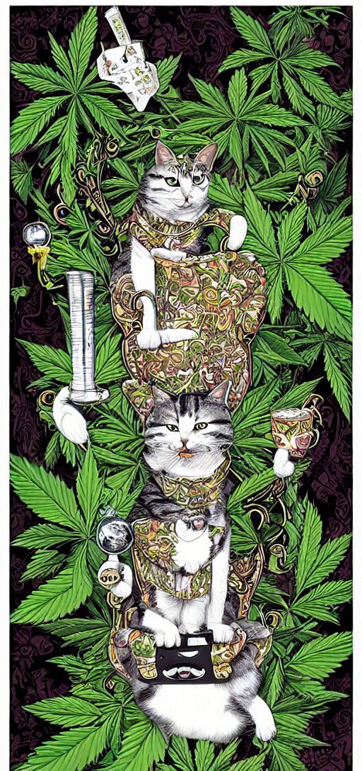 ”happy smiling cat holding a marifuana joint while sitting high on a sofa, marijuana leaves swirling in the background, [ultra detailed, contrast, ornate and intricate, art by joe fenton]”