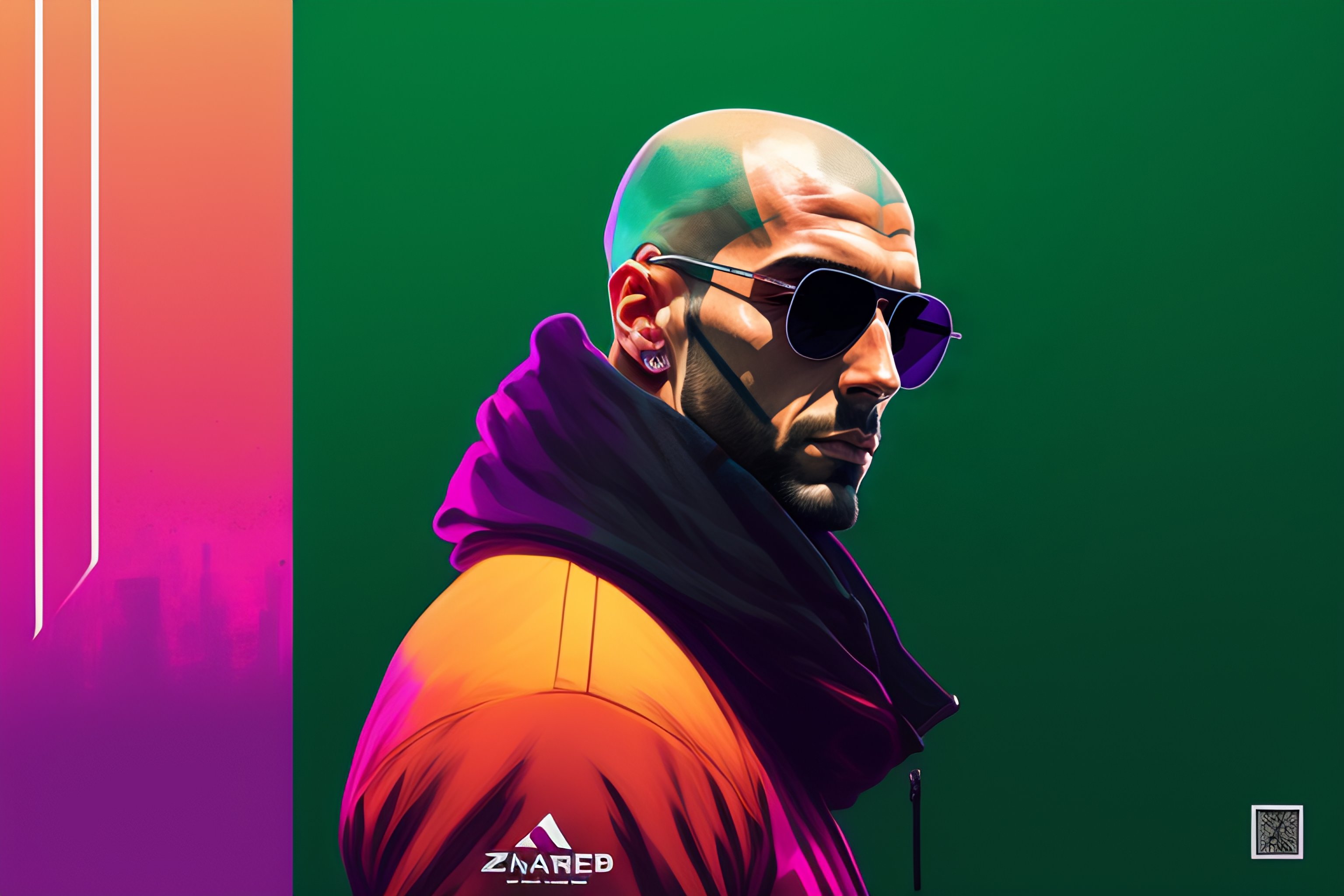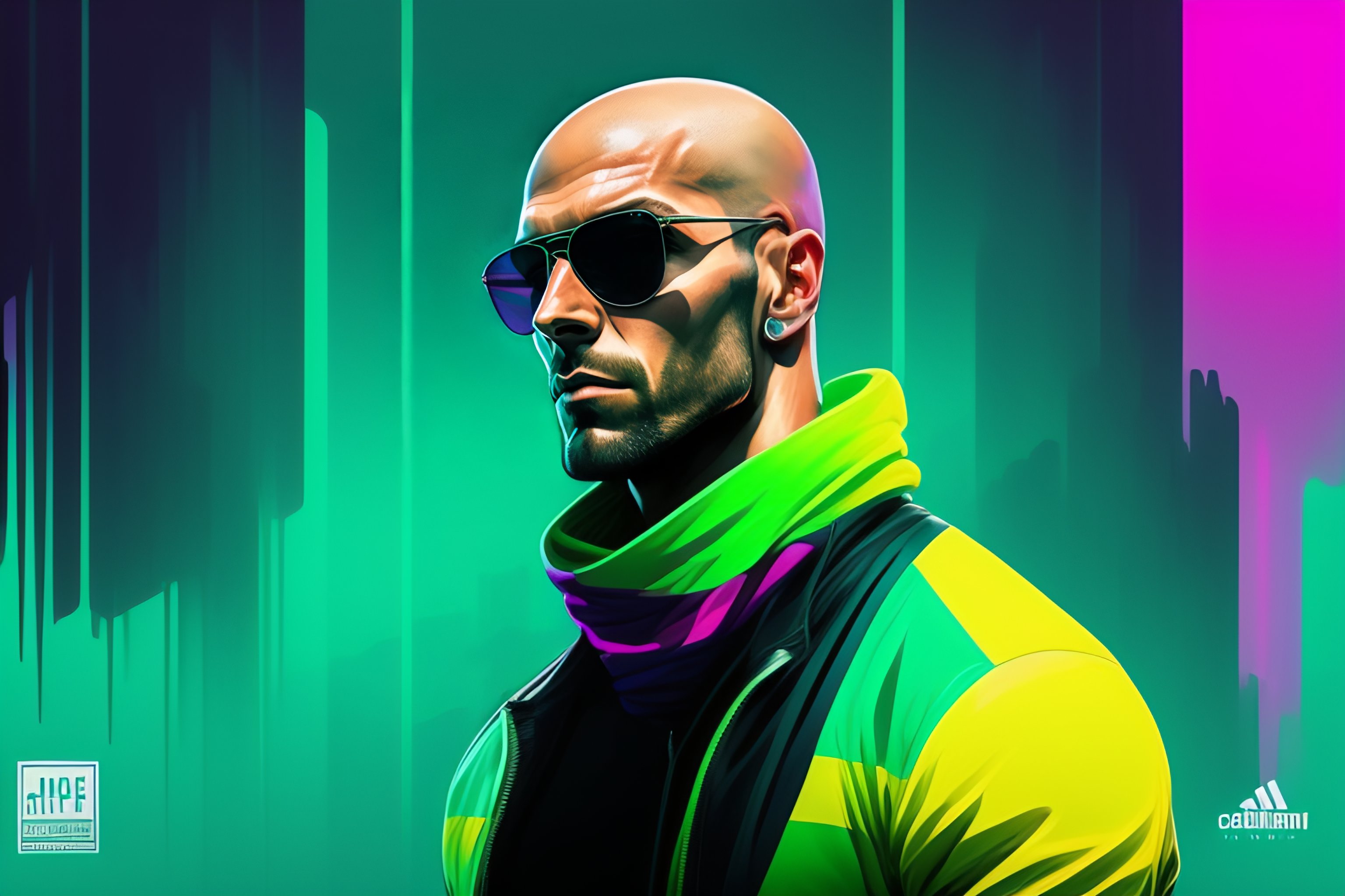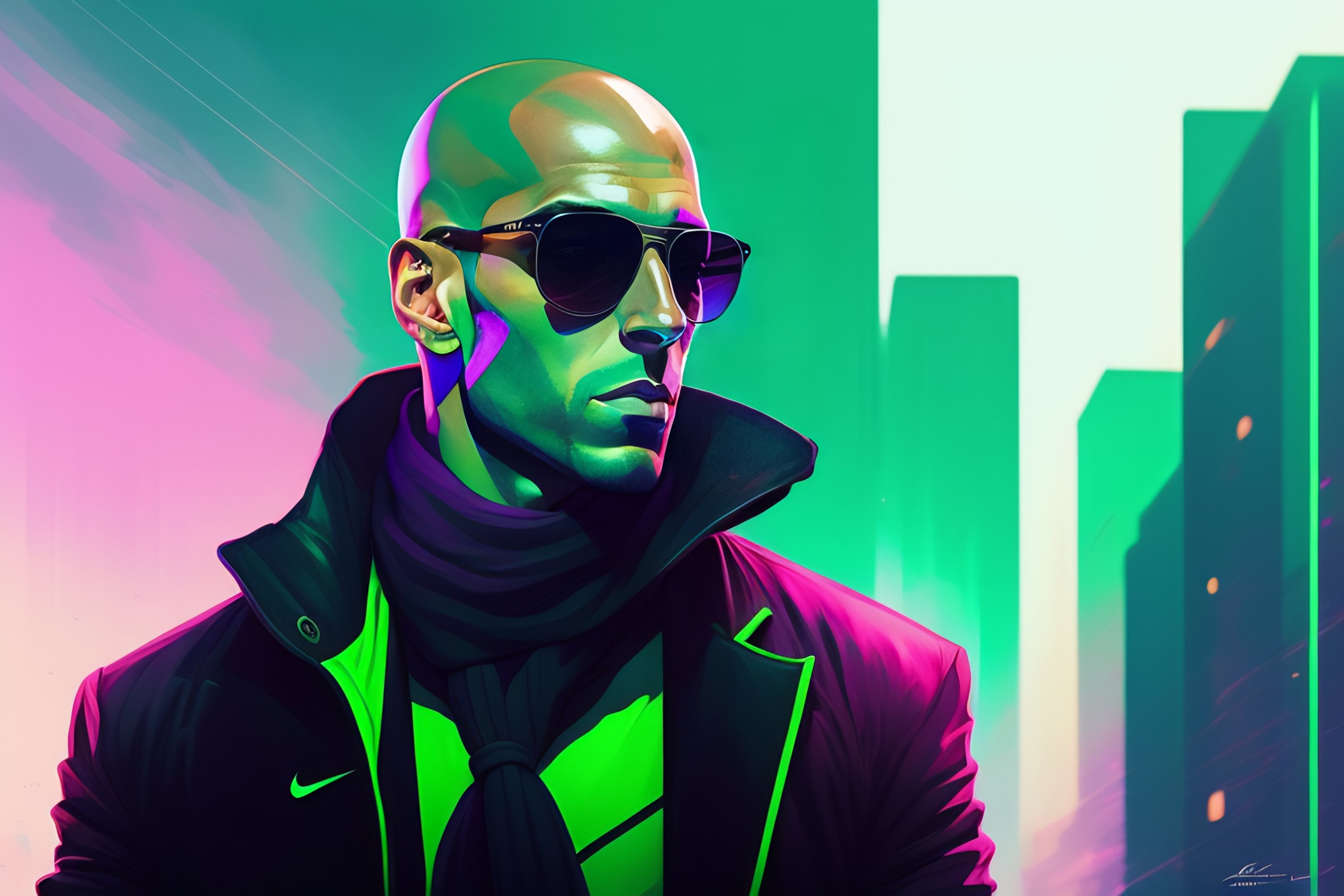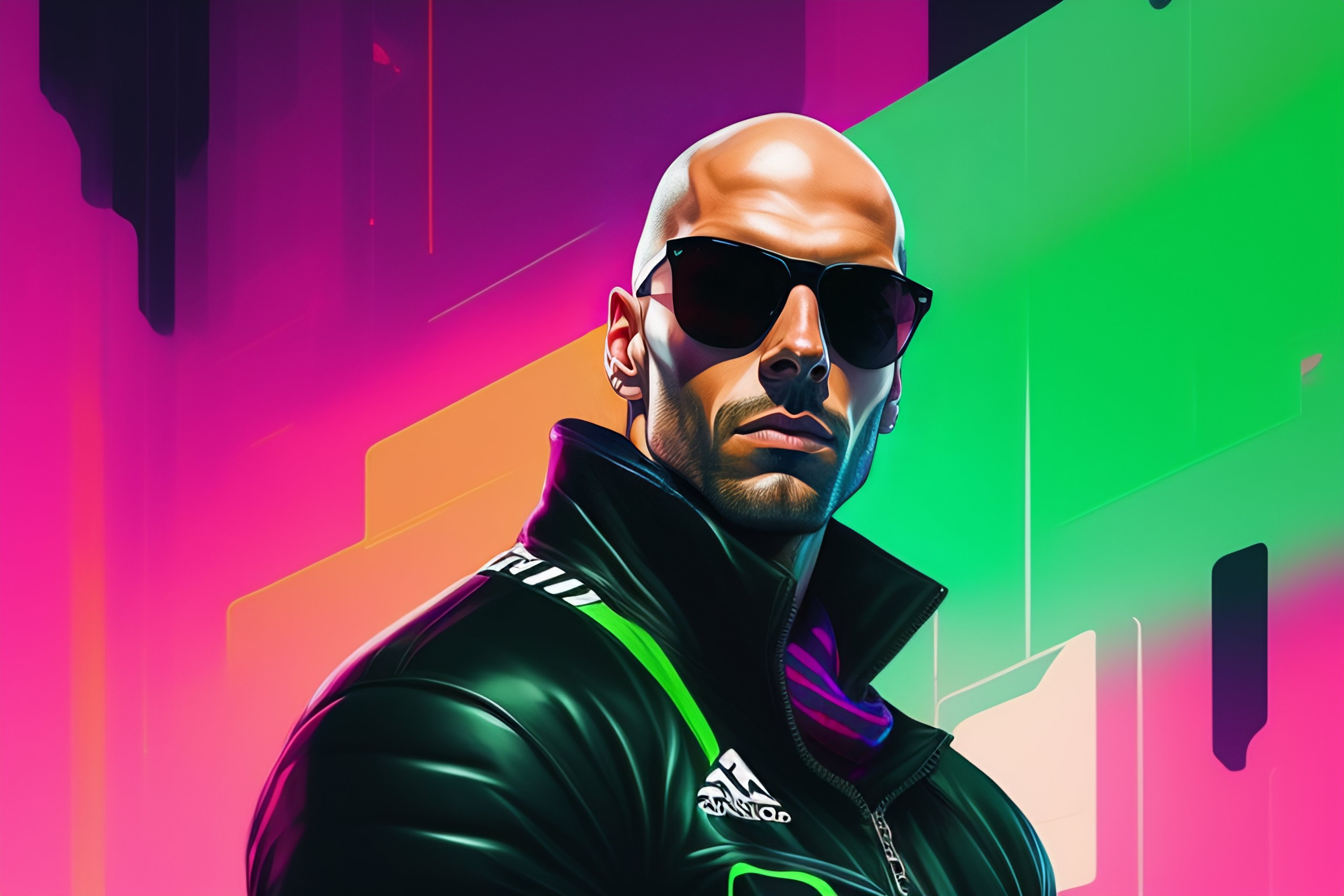 Full body highly detailed portrait zinedine zidane, coach, sunglasses, blue eyes, tartan scarf, bald by atey ghailan, by greg rutkowski, by greg tocchini, by james gilleard, by joe fenton, by kaethe butcher, gradient light green, black, neon and magenta color scheme, grunge aesthetic!!! soccer graffiti tag wall background