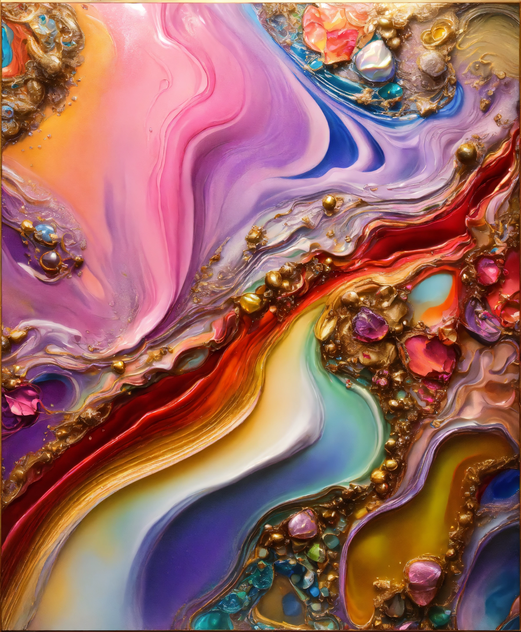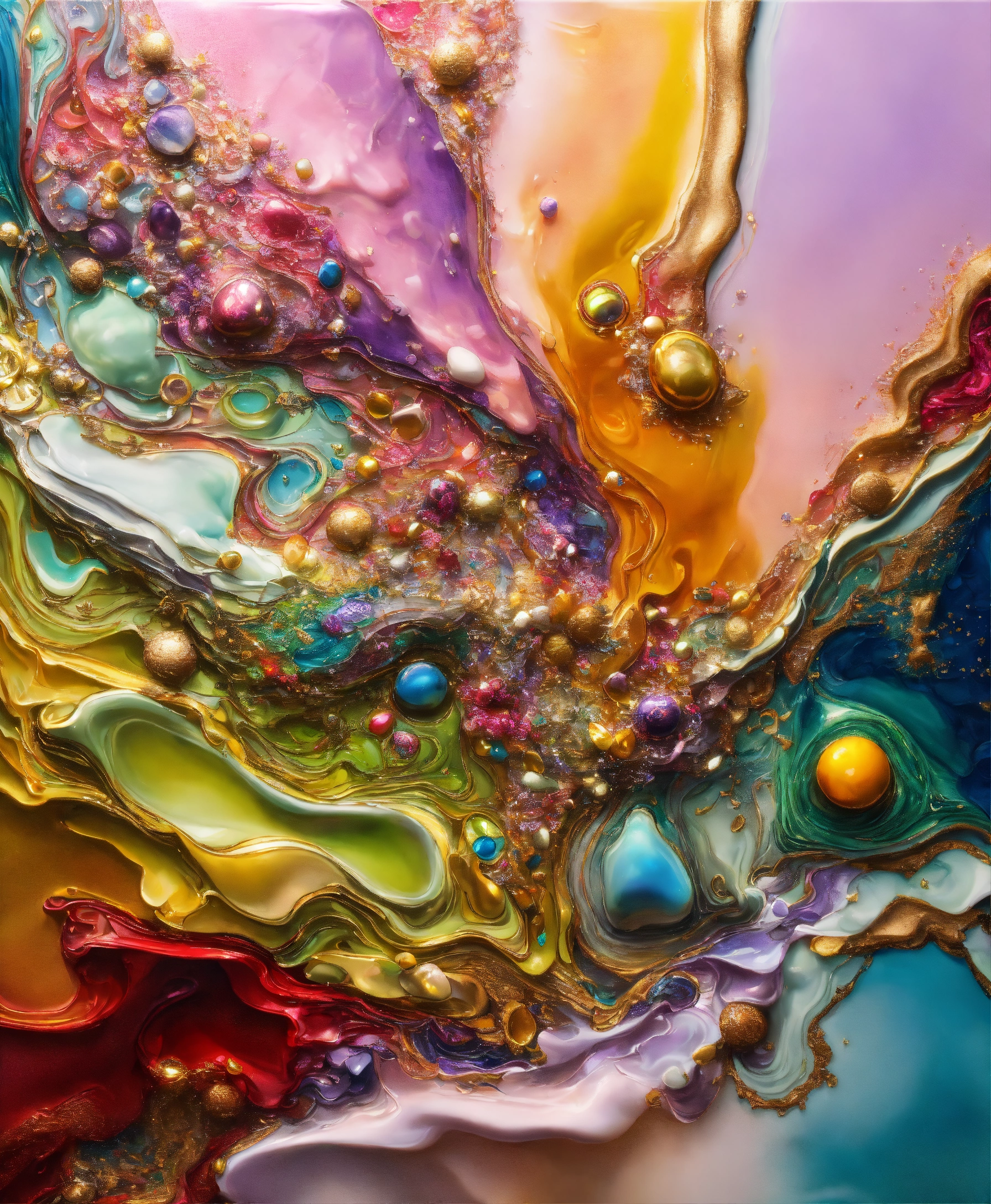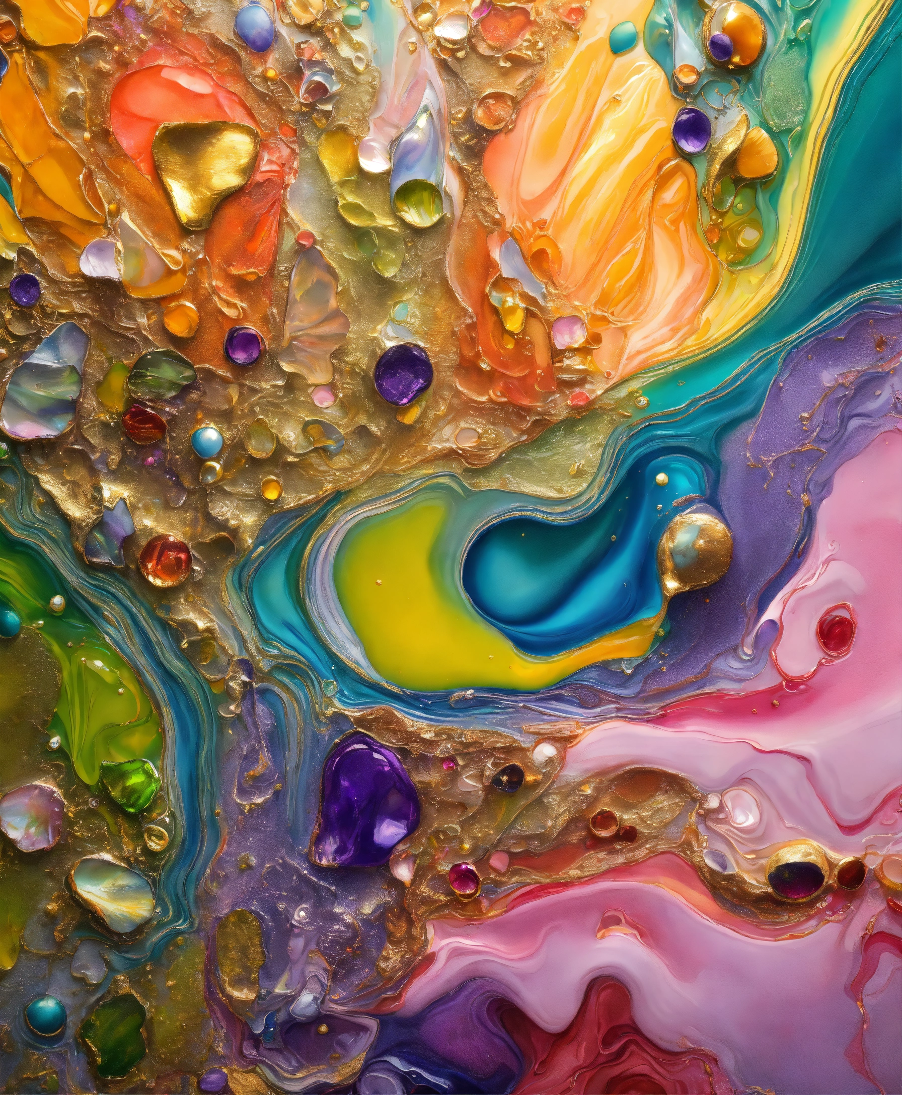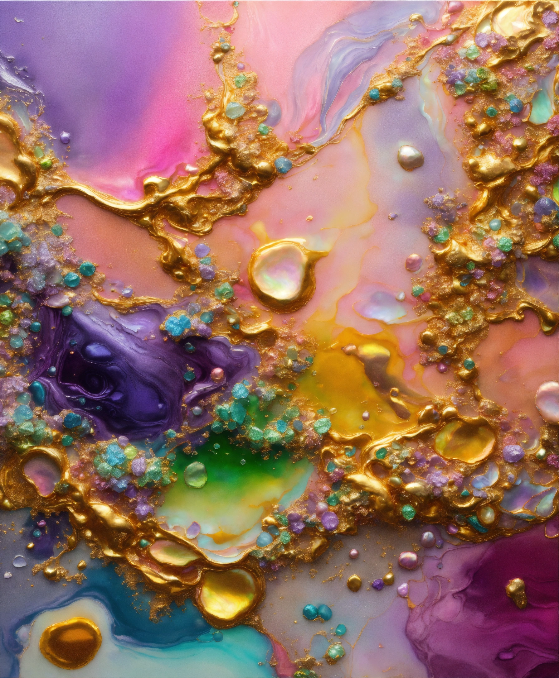 Colorful abstract painting oil and water complex complicated bright vivid colors beautiful opulent wealthy intricate pink peridot lilac yellow violet green red blue sublime delicate hyperdetailed masterpiece metallic sheen mother of pearl elaborate inspiring awesome 24k bright gold and silver trims throughout oil and water 8k extremely sharp image throughout 3d