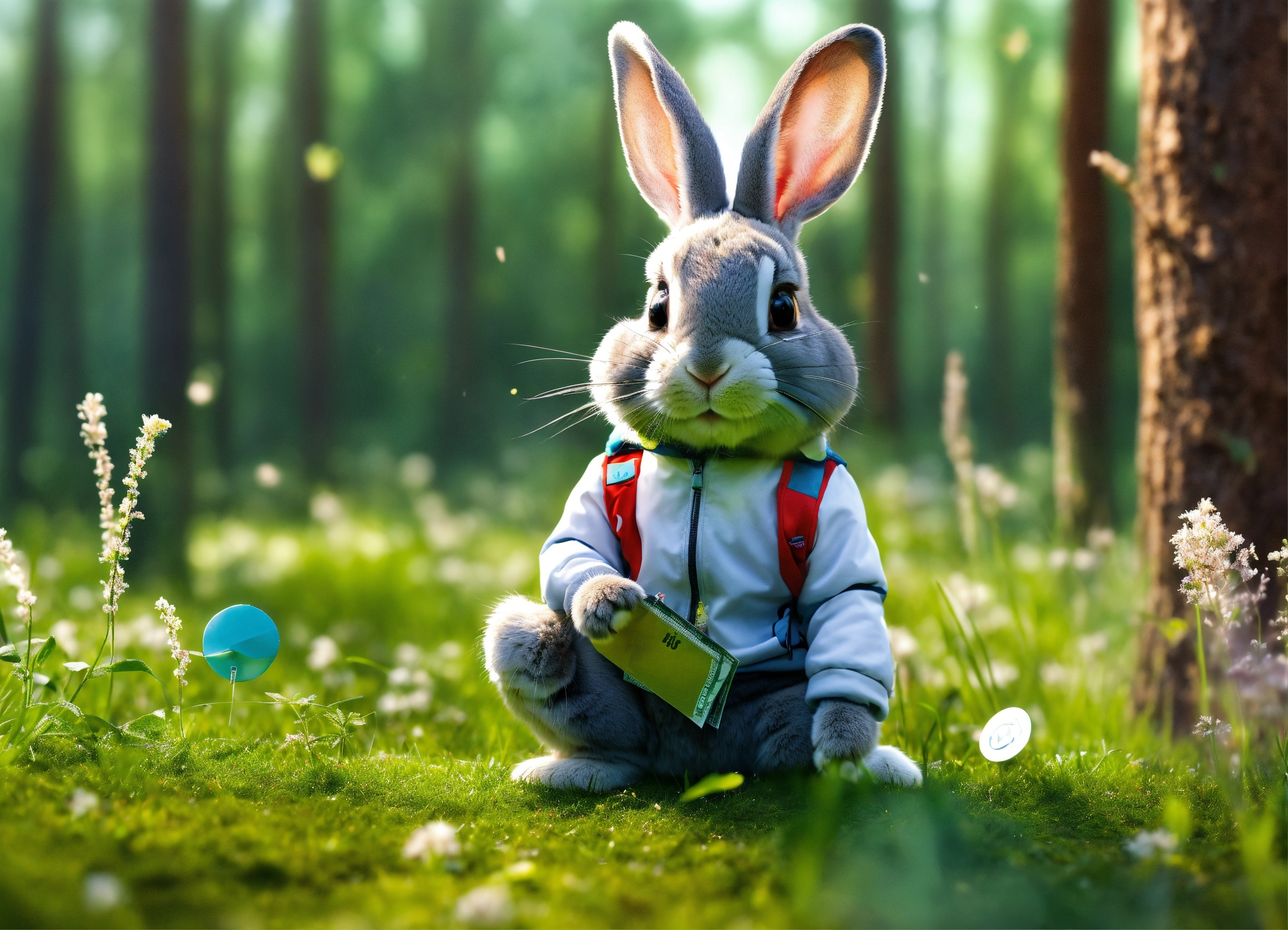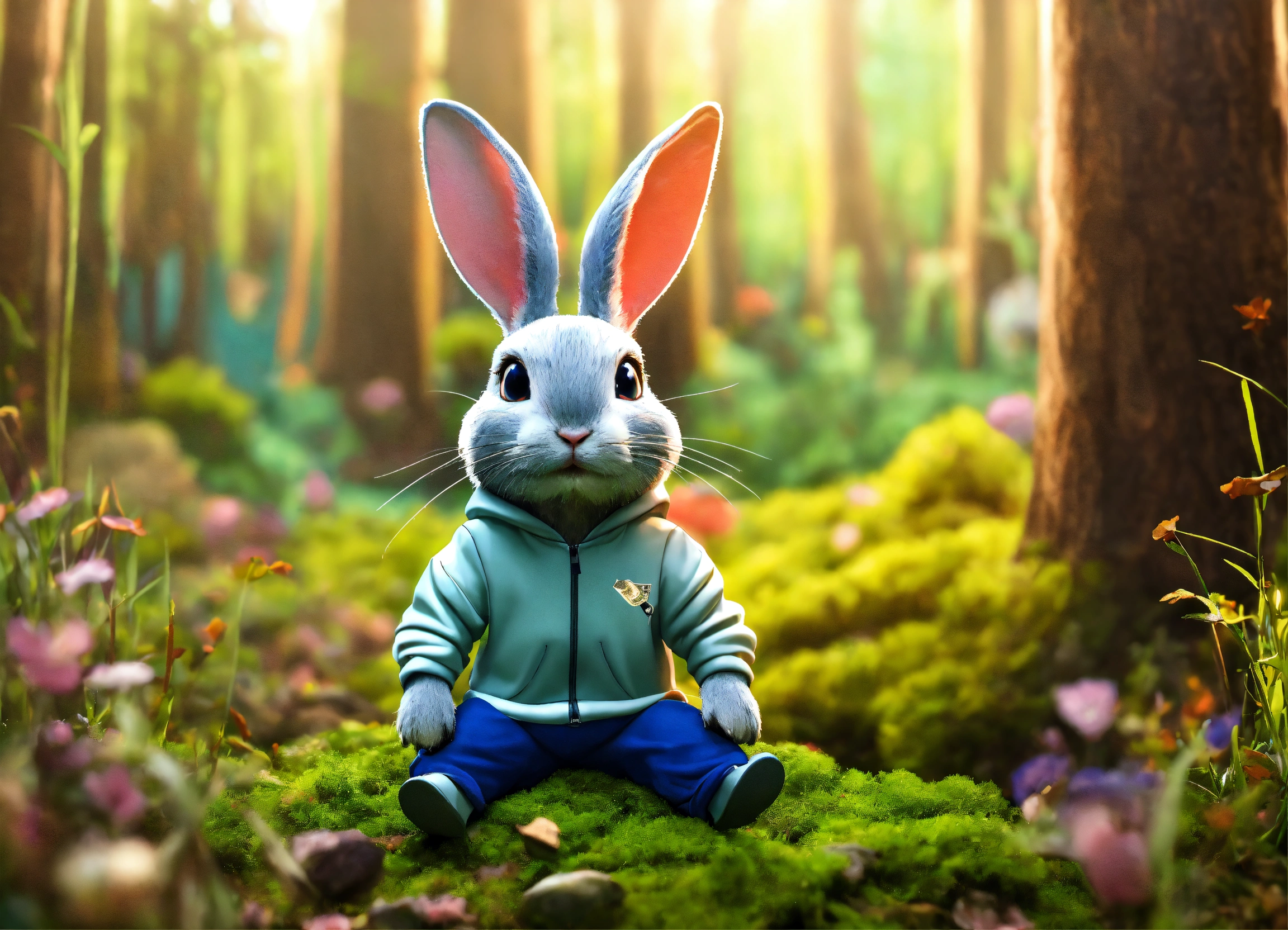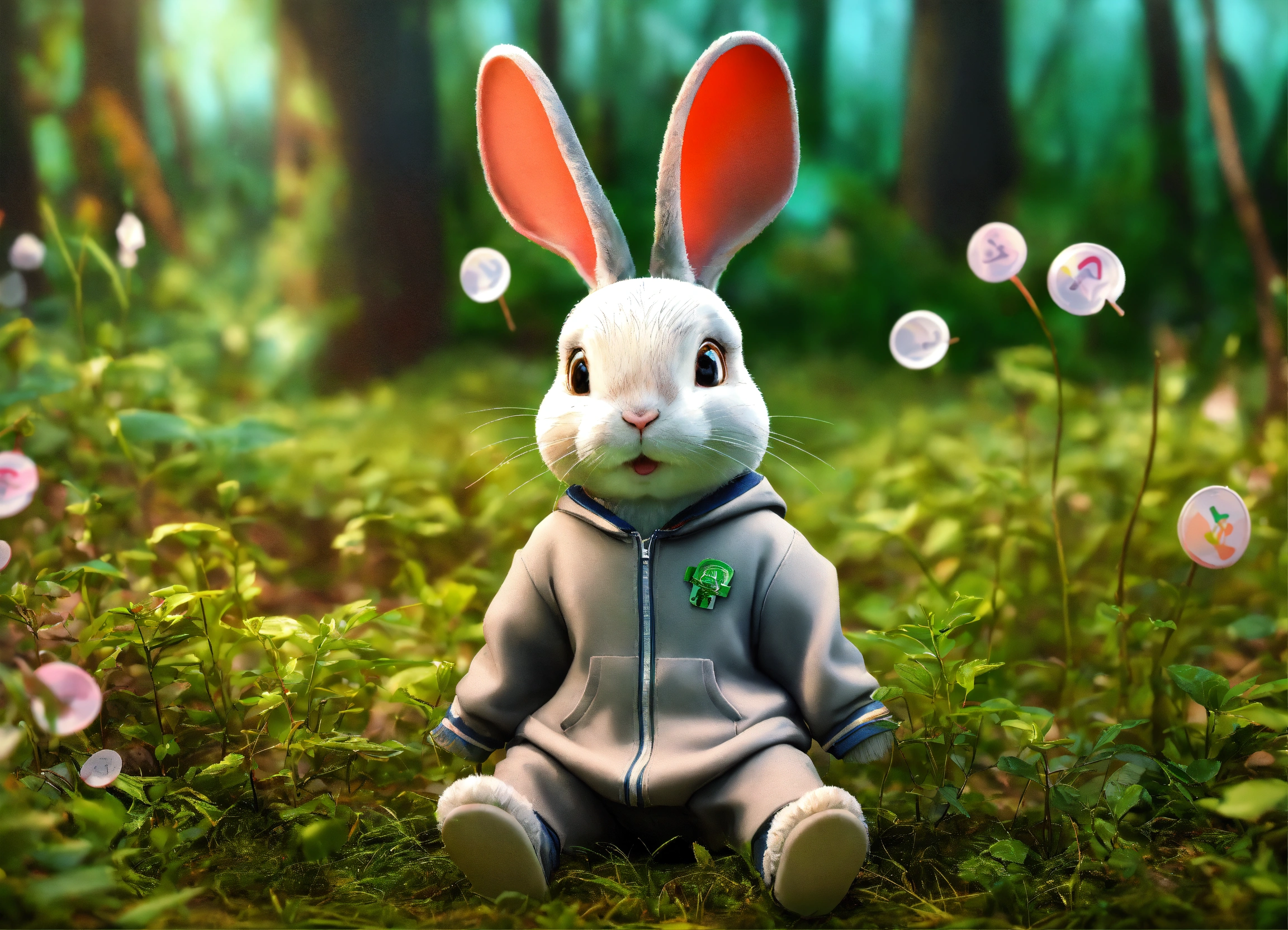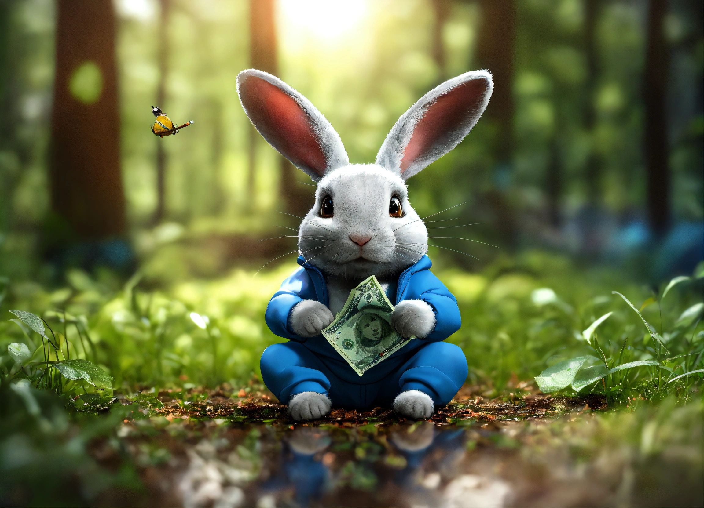 In the picture, you can see a rabbit in a frontal view, ´. he sitting in the grass in a forest. the rabbit is wearing a tracksuit and appears to be somewhat sickly. in front of it, is a small mirror with white powder and a rolled-up dollar bill on top. the style of the image is three-dimensional (3d), ultra-high qualit, cartoon, animie.