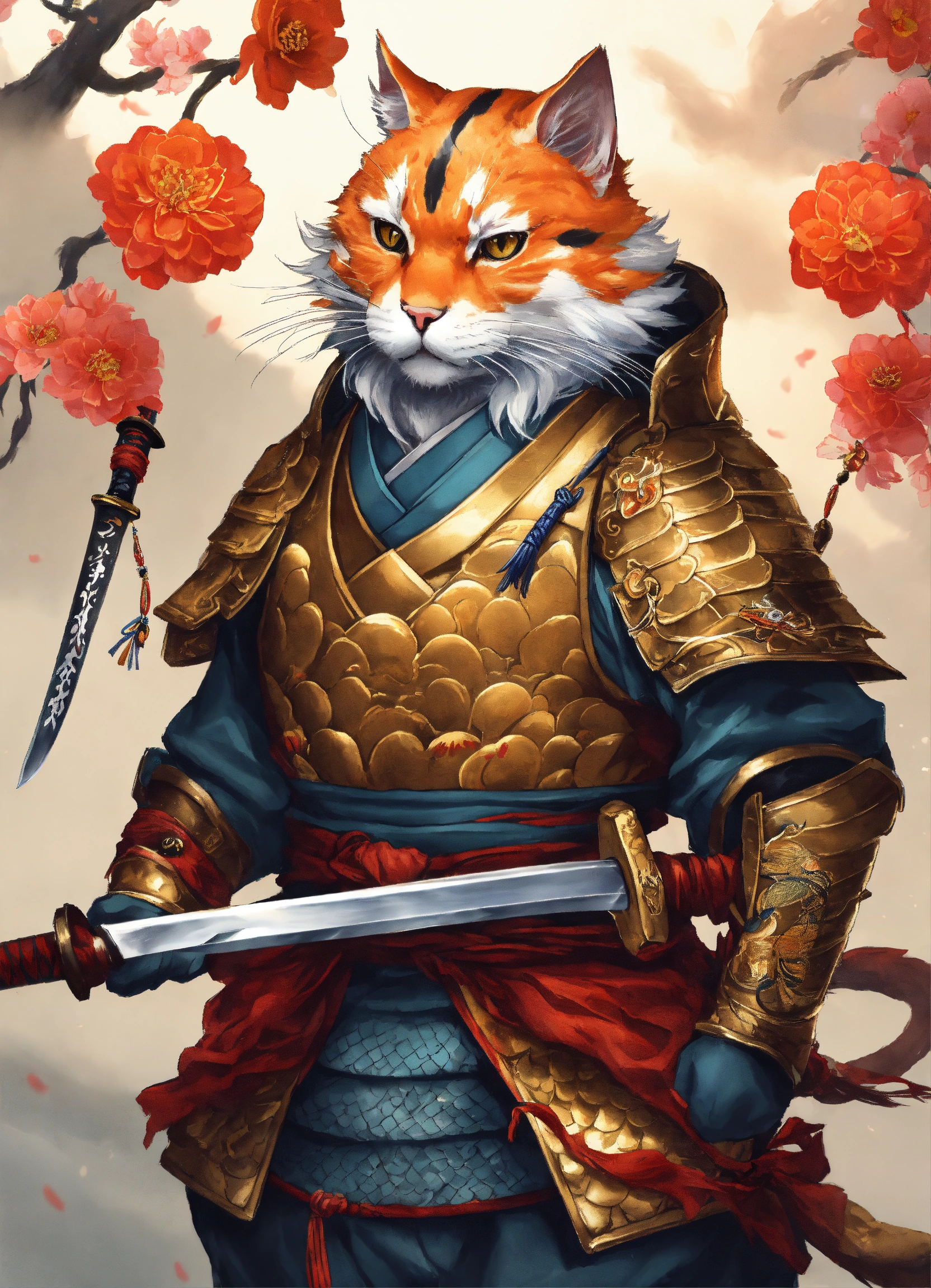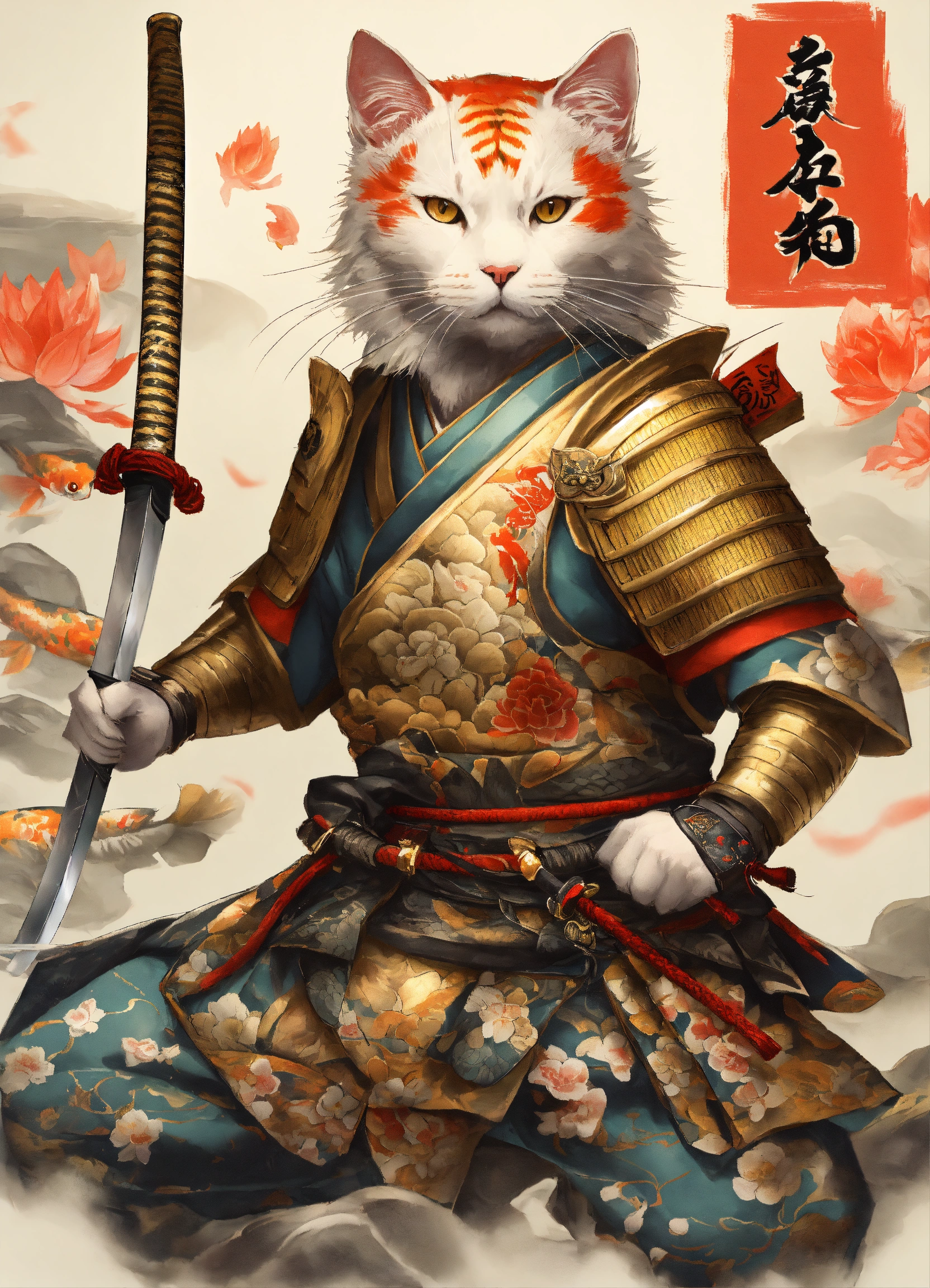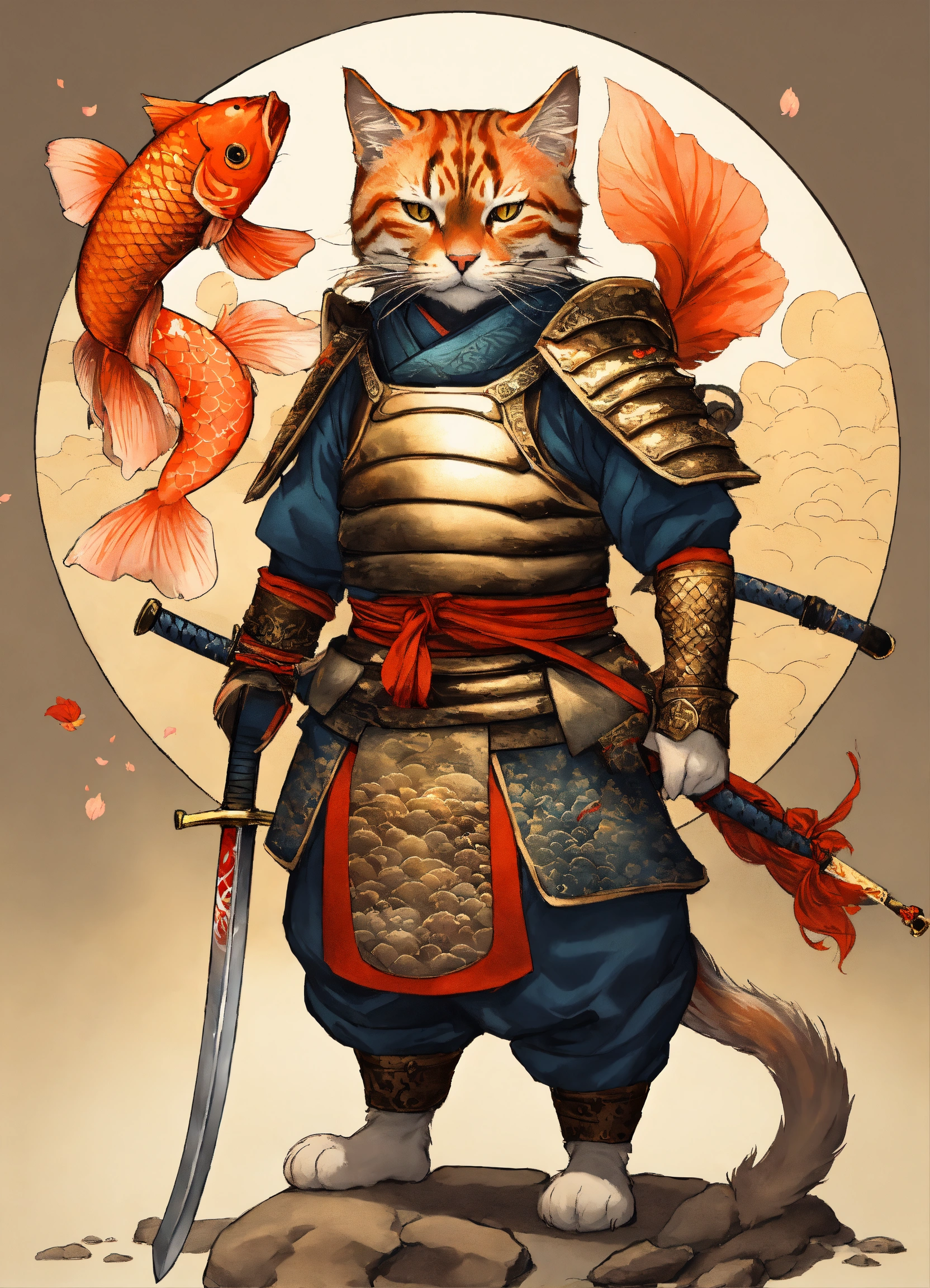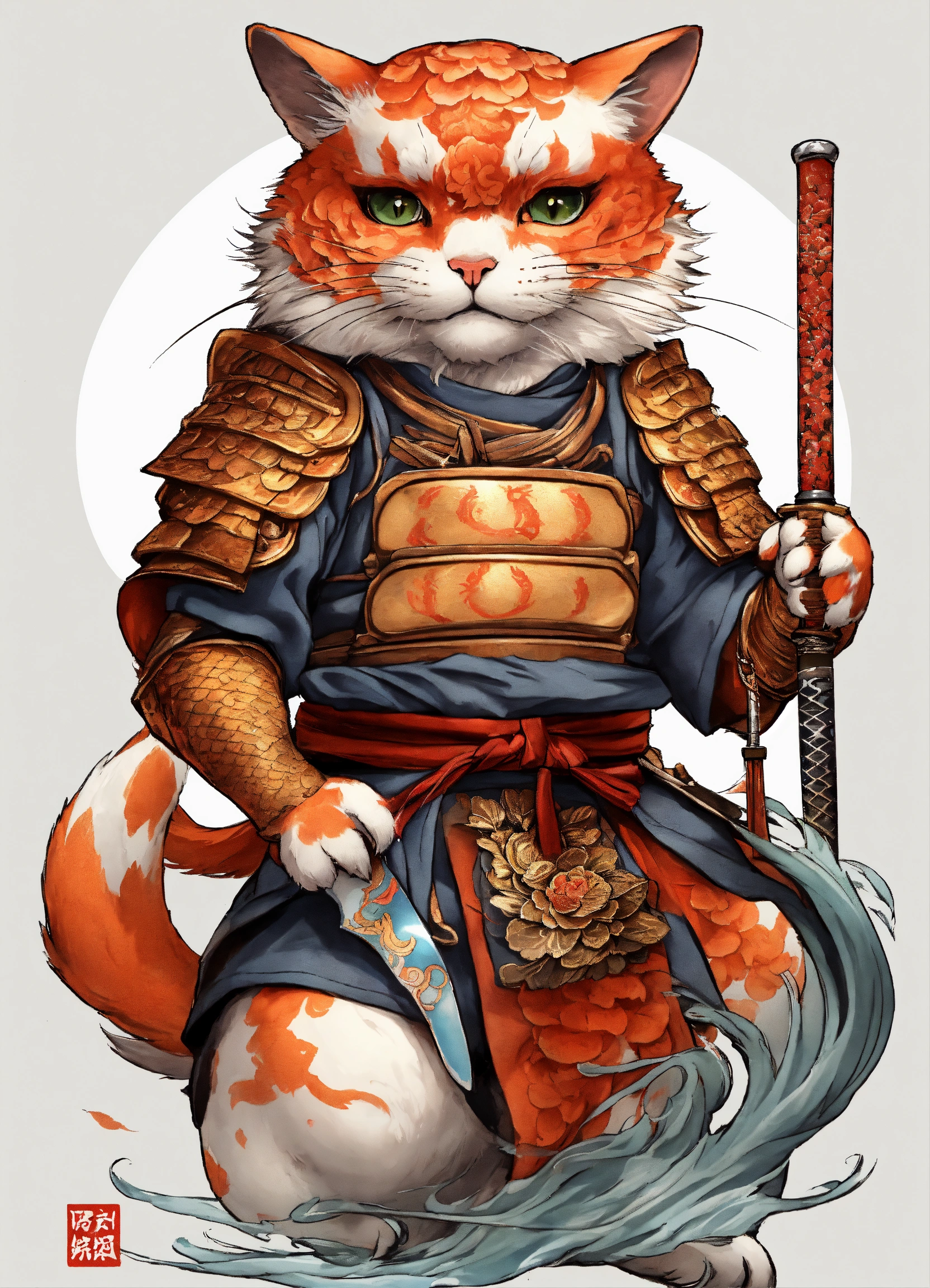 There is a cat with a big carp koi and a sword on a white background, samurai cat, cat warrior, armored cat, anthropomorphic cat ninja, samurai deity with koi armor, by kanō tan'yū, highly details tattoo