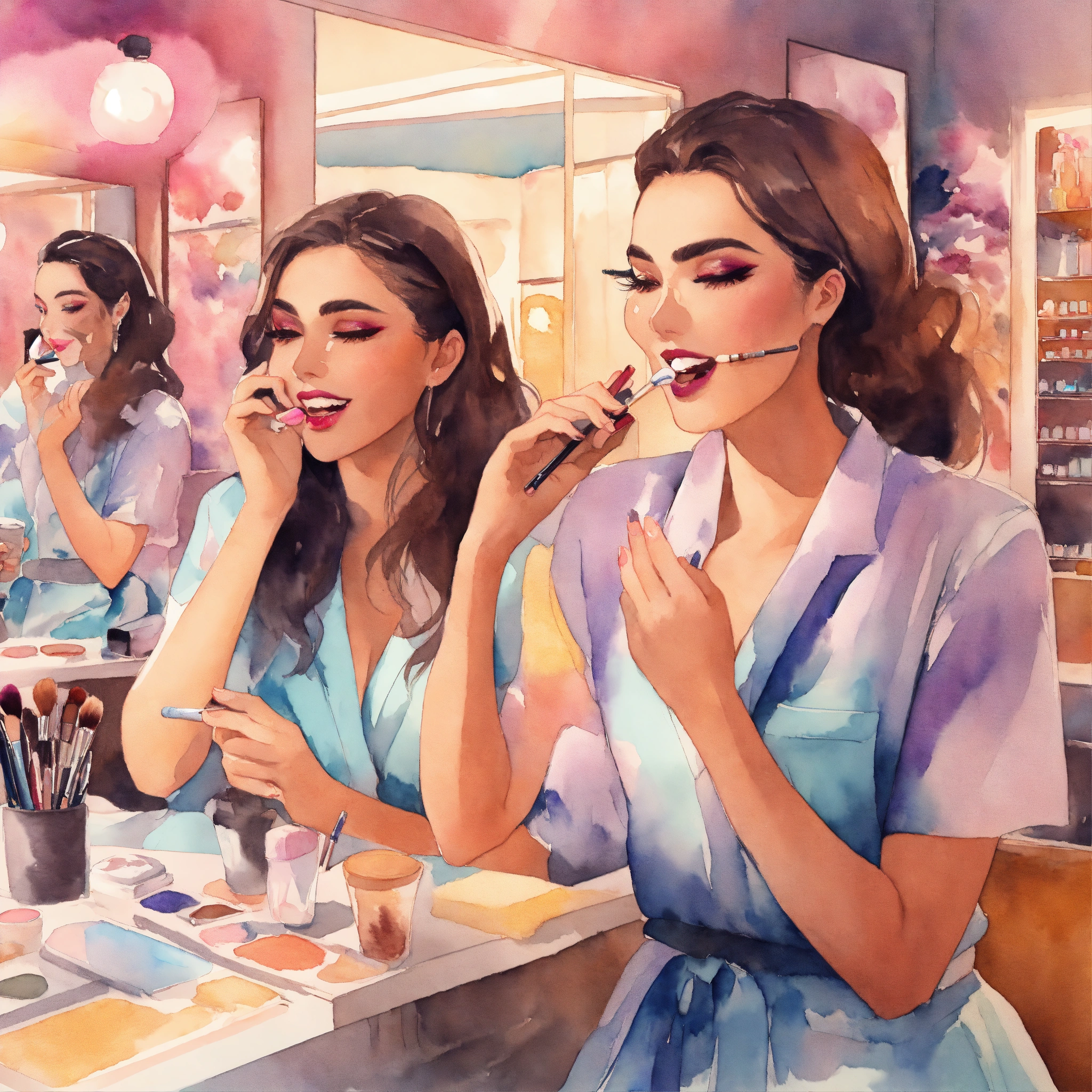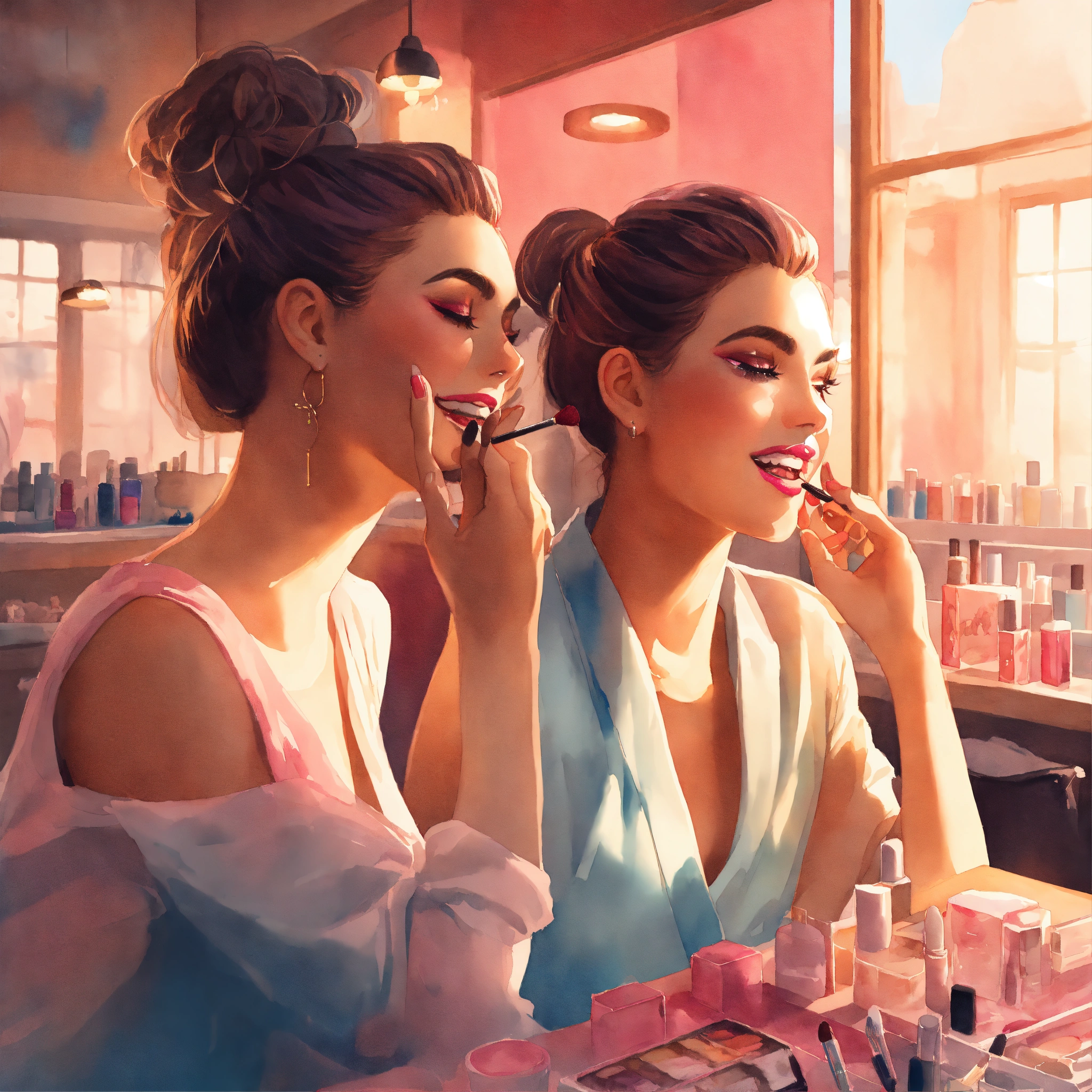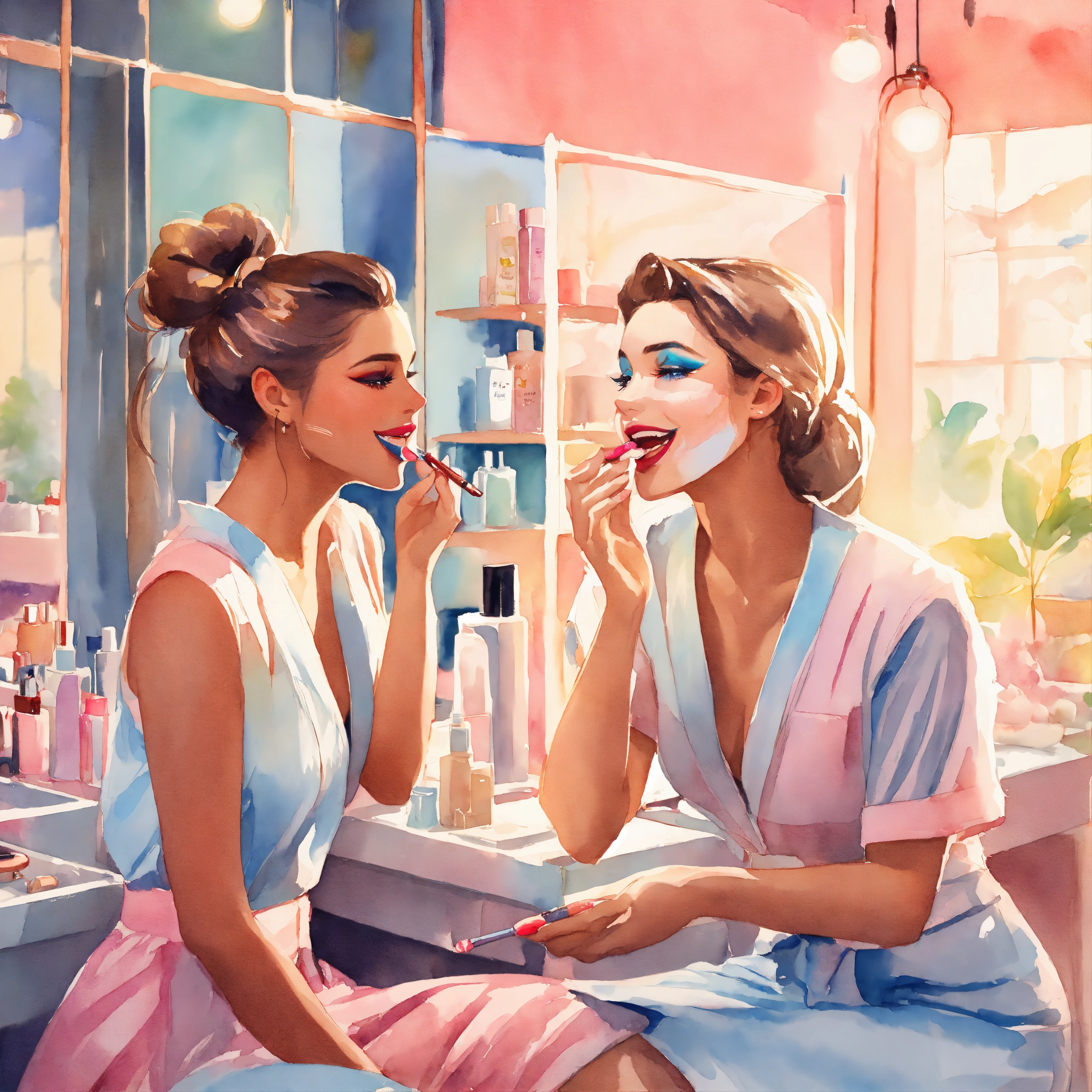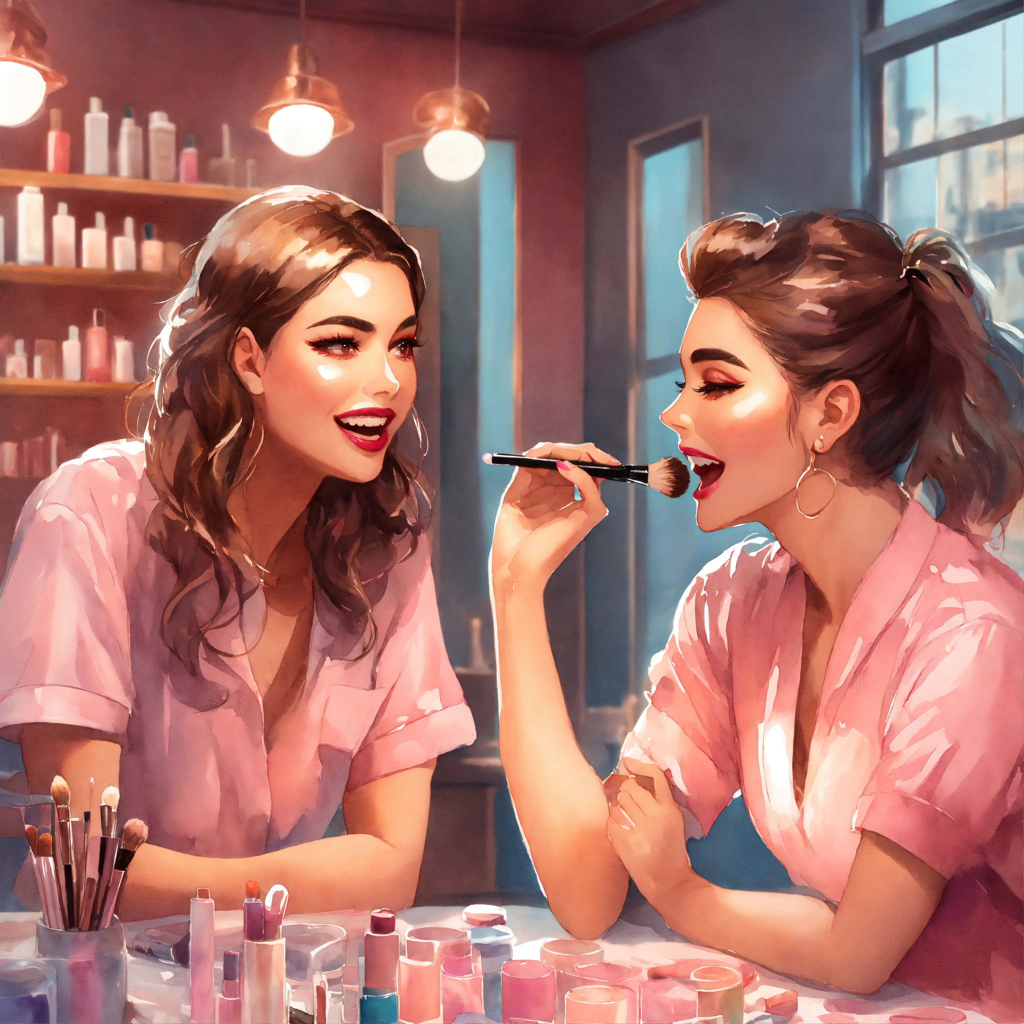 A makeup artist and a beautiful girl gossip, laugh, cover their mouth with their hand, in a beauty salon, laugh, cover their mouth with their hand, in a beauty salon, morning lighting, pastel light shades, 8k rendering, award-winning art, watercolour style, comics