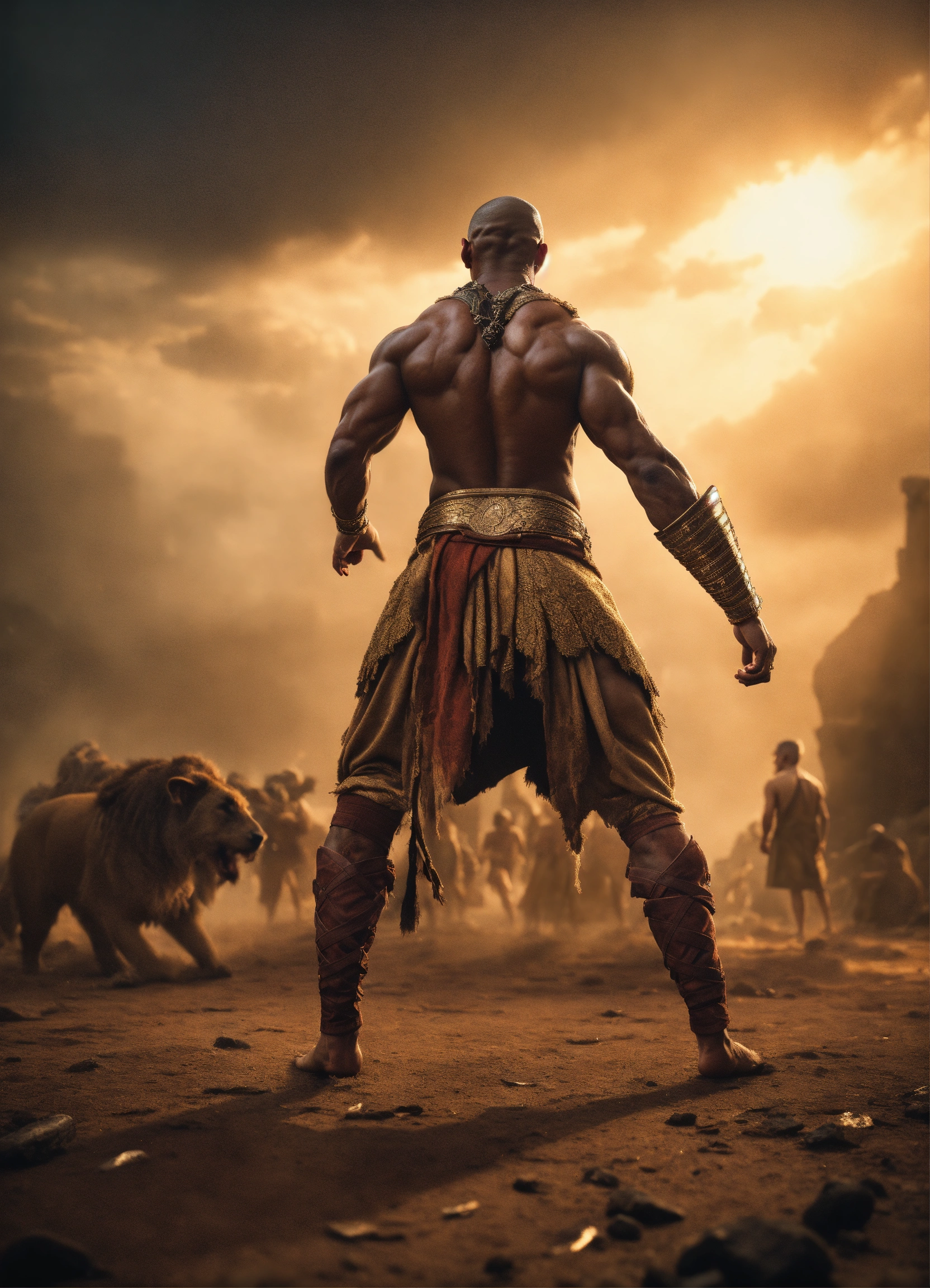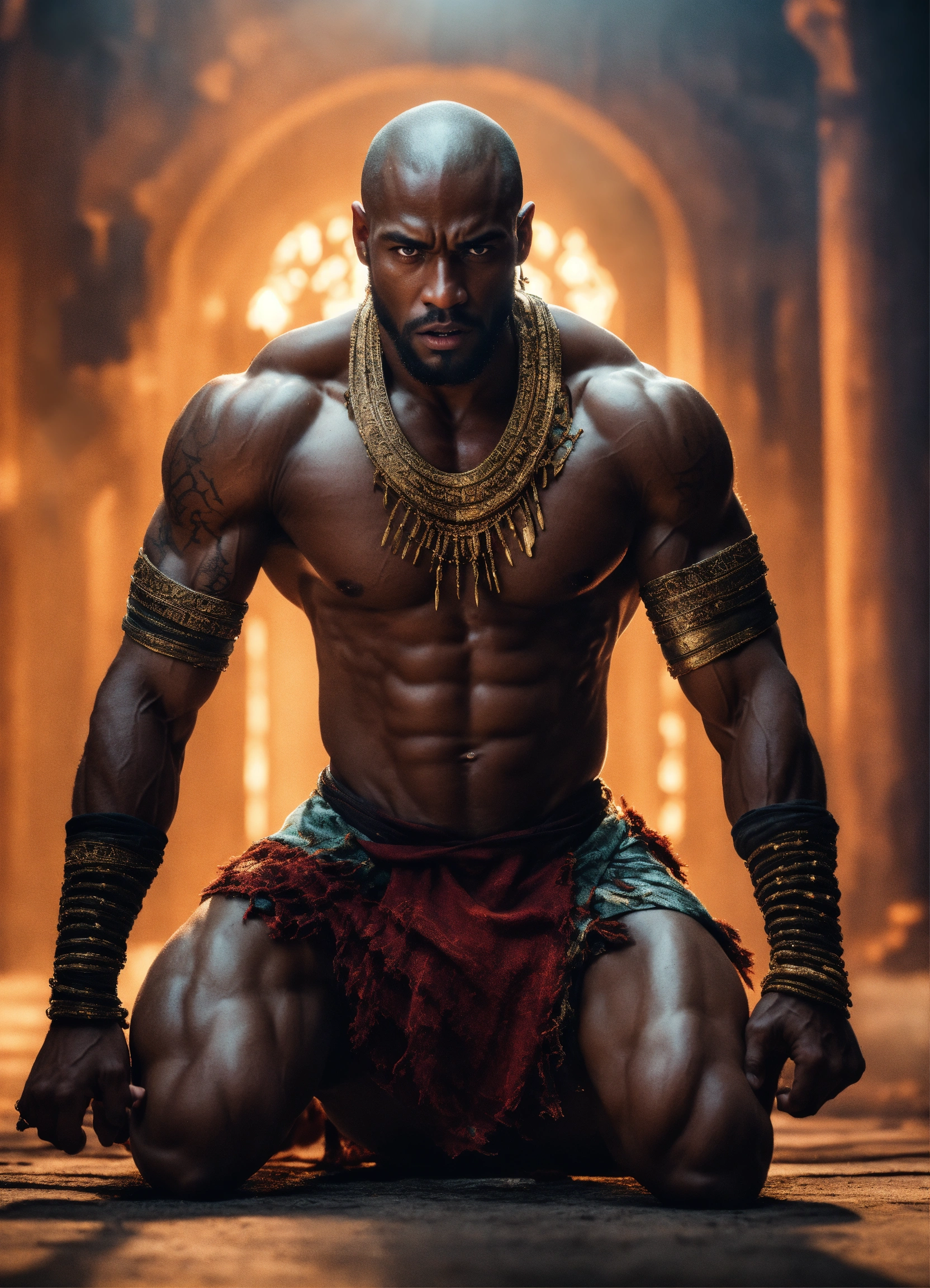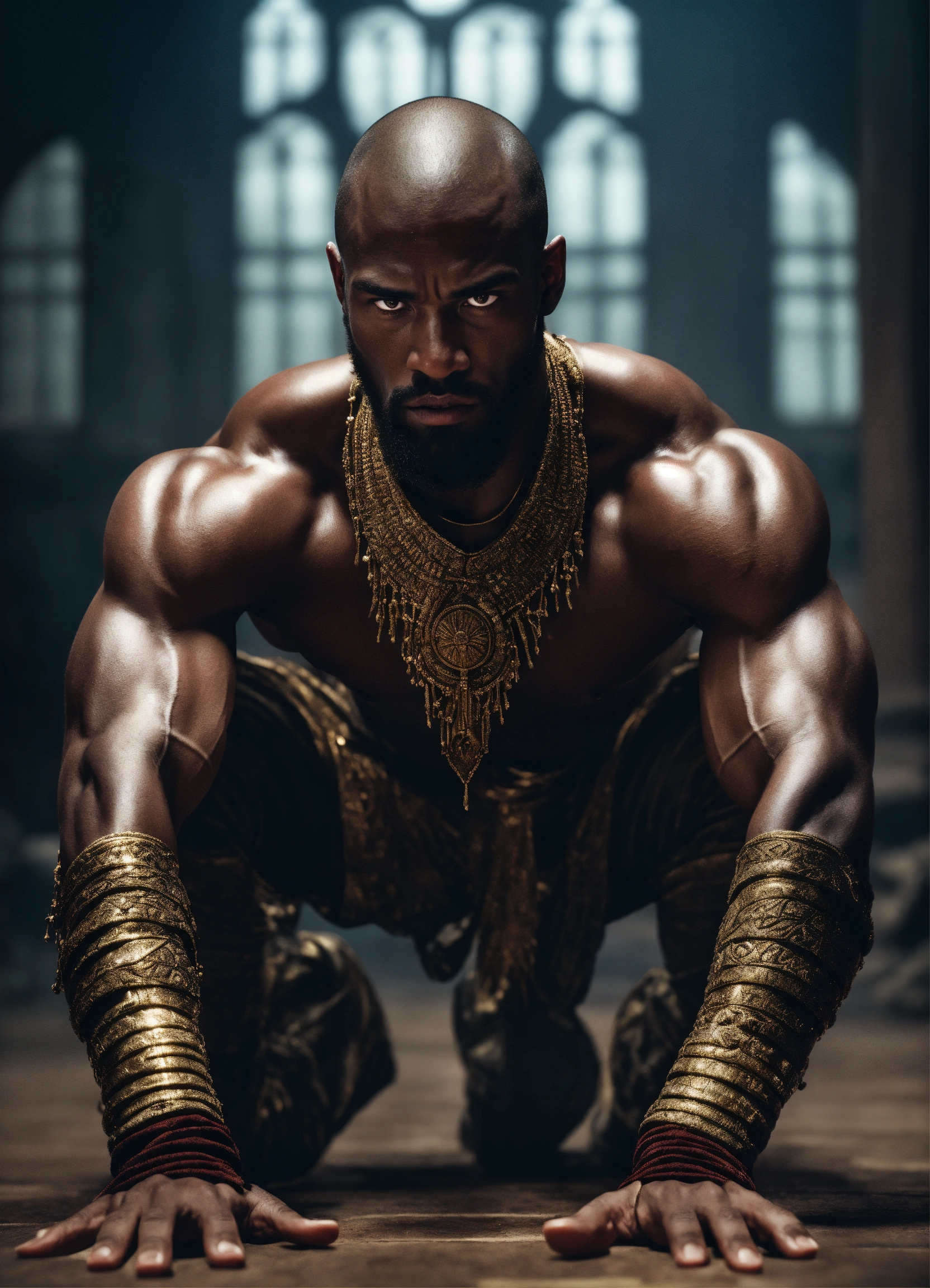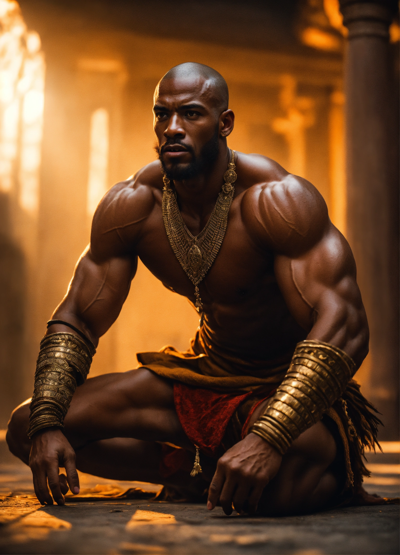 An epic fantasy scene featuring a muscular ancient nubian male with frighten look, fell on his knees on the floor, arms outstretched in fear, highly-detailed, full motion, high expression, shaved head, photo realistic, beautiful, moody lighting, best quality, realistic, close view from behind, intricate details, depth of field, raw photo, 8k uhd, film grain