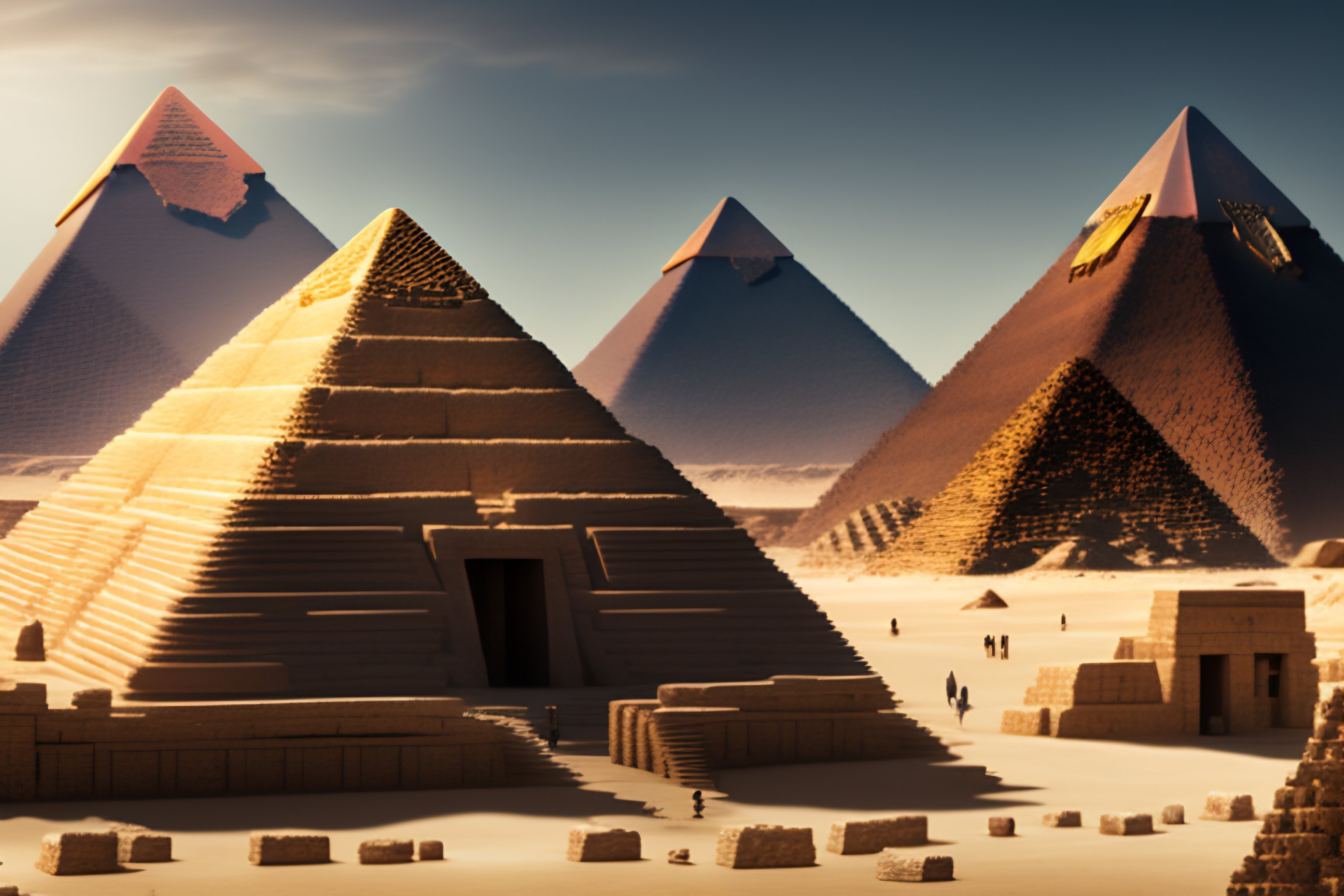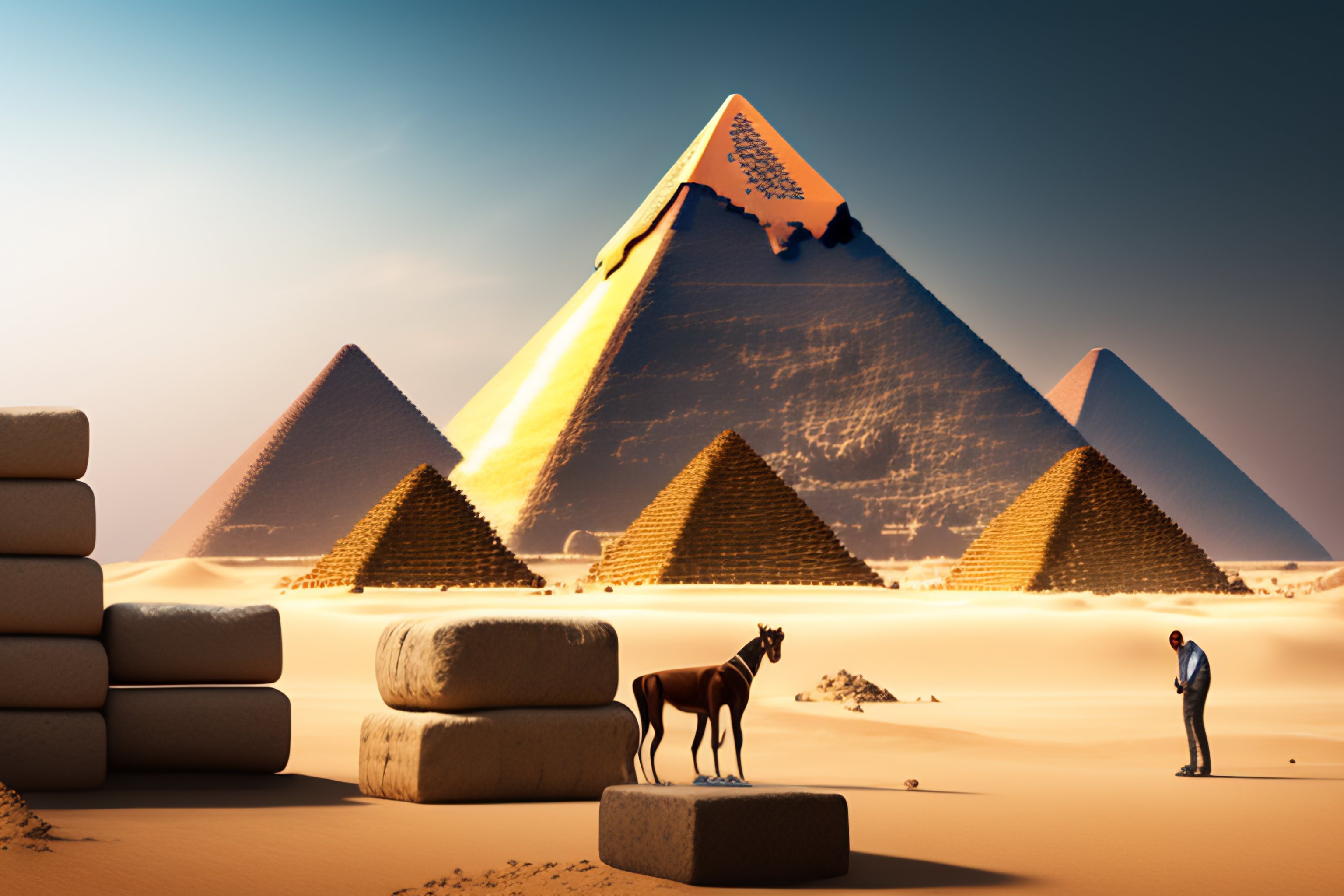 A realistic image of an egyptian pyramide with several workers stacking huge stone blocks