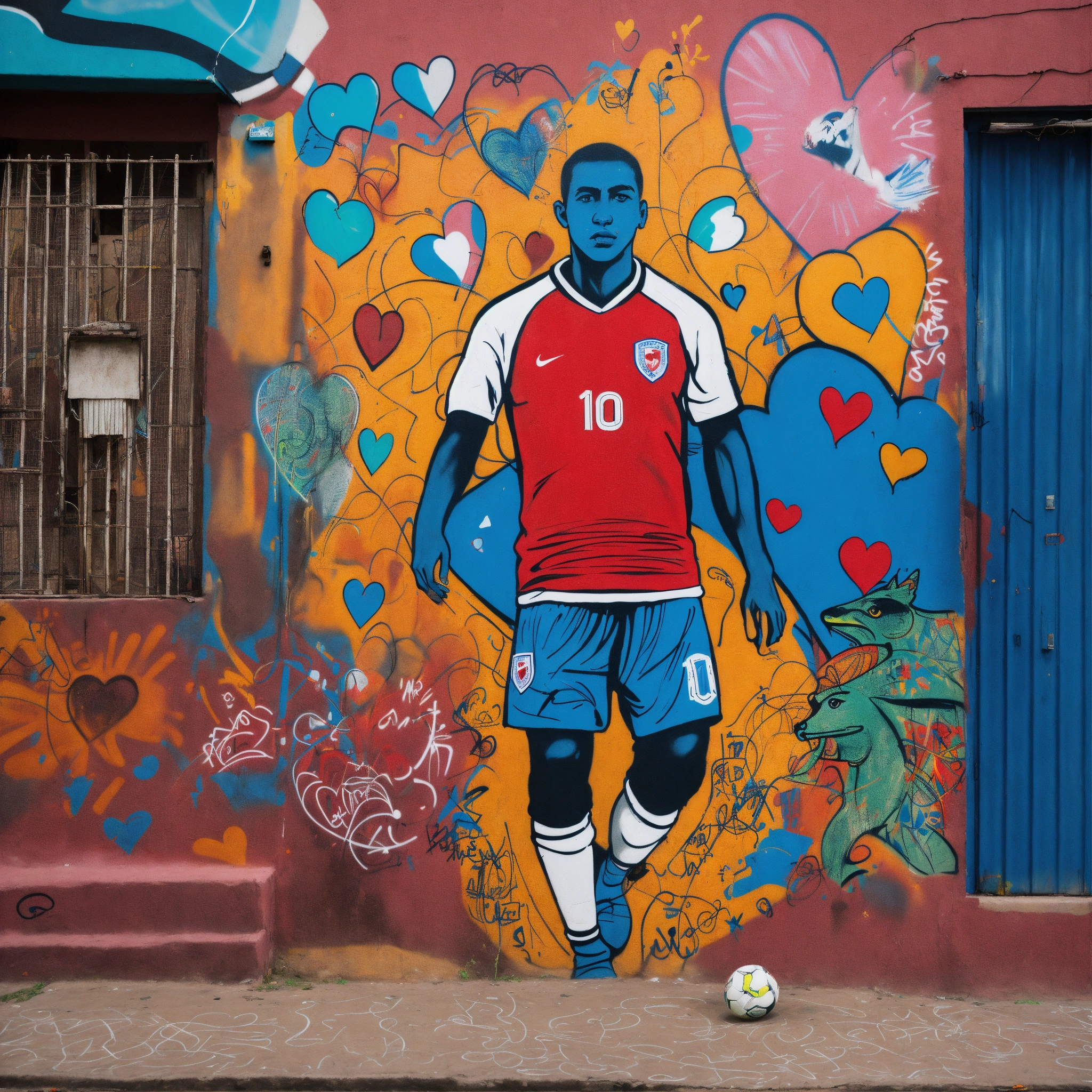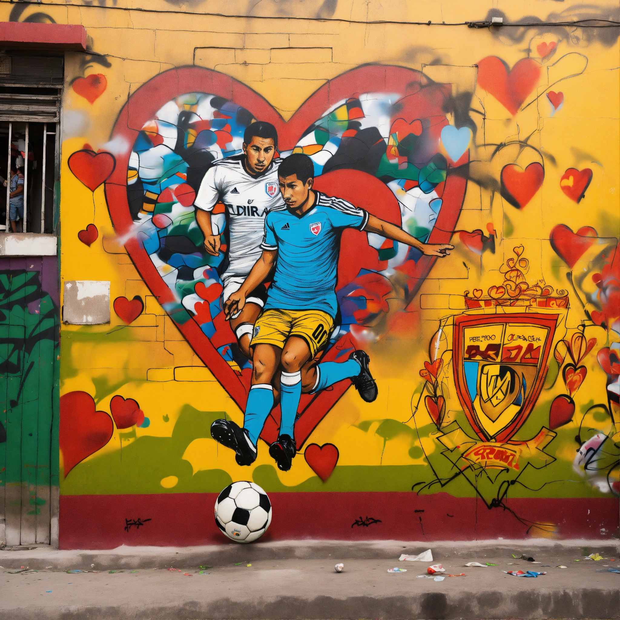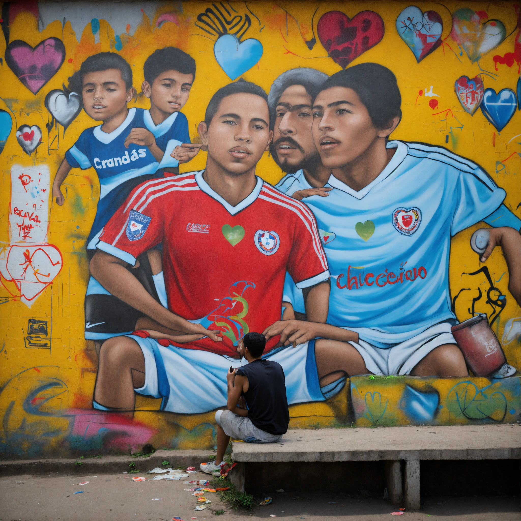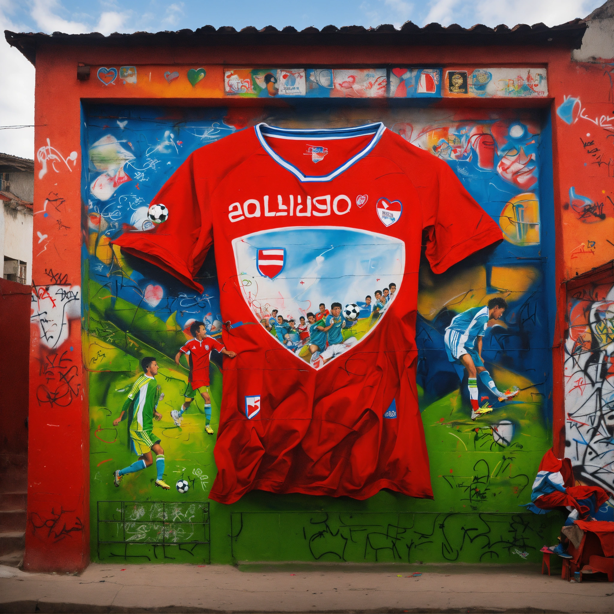 Drawing (not real life) of a chilean shirt in a soccer favela with designs of soccer players and hearts in graffiti on a mural