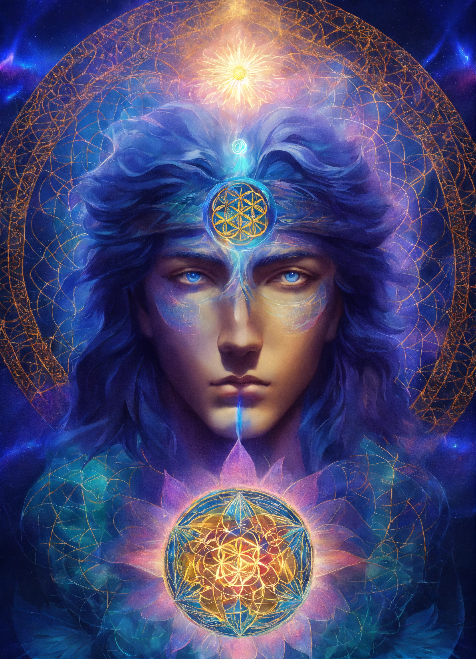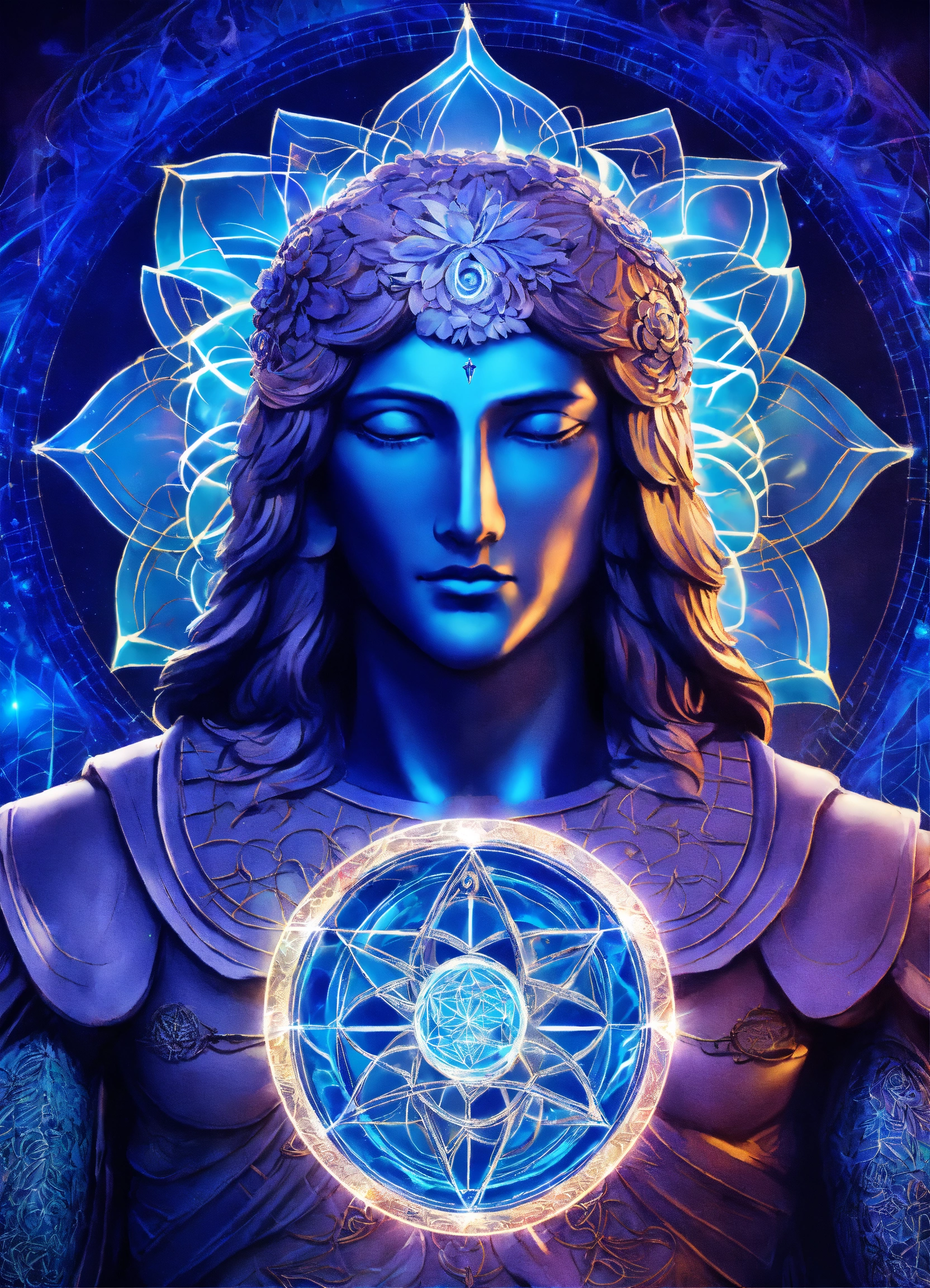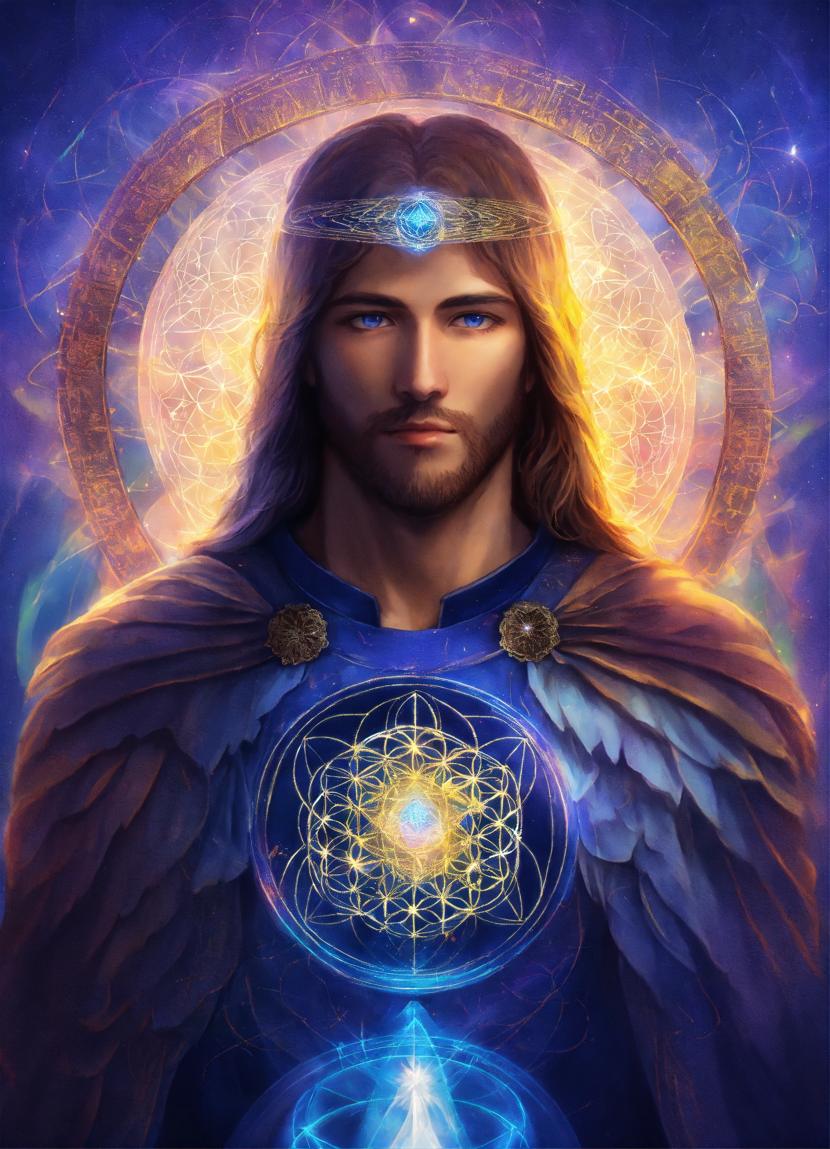Archangel michael with a middle-aged male face, flower of life in the backround, indigo and sapphire blue light lines, infinity symbol, prismatic aurora lights, ancient temple, blue swirl of light