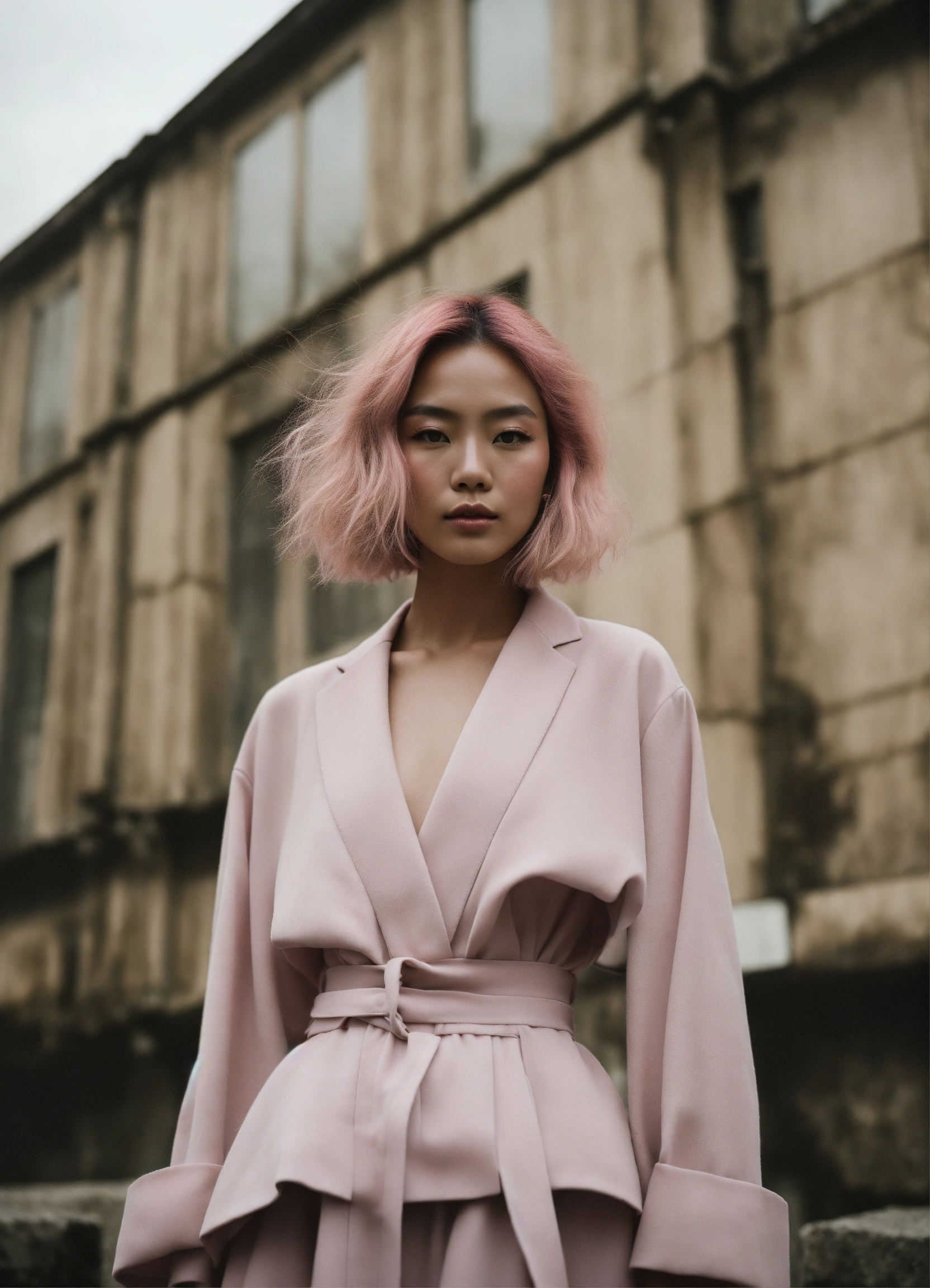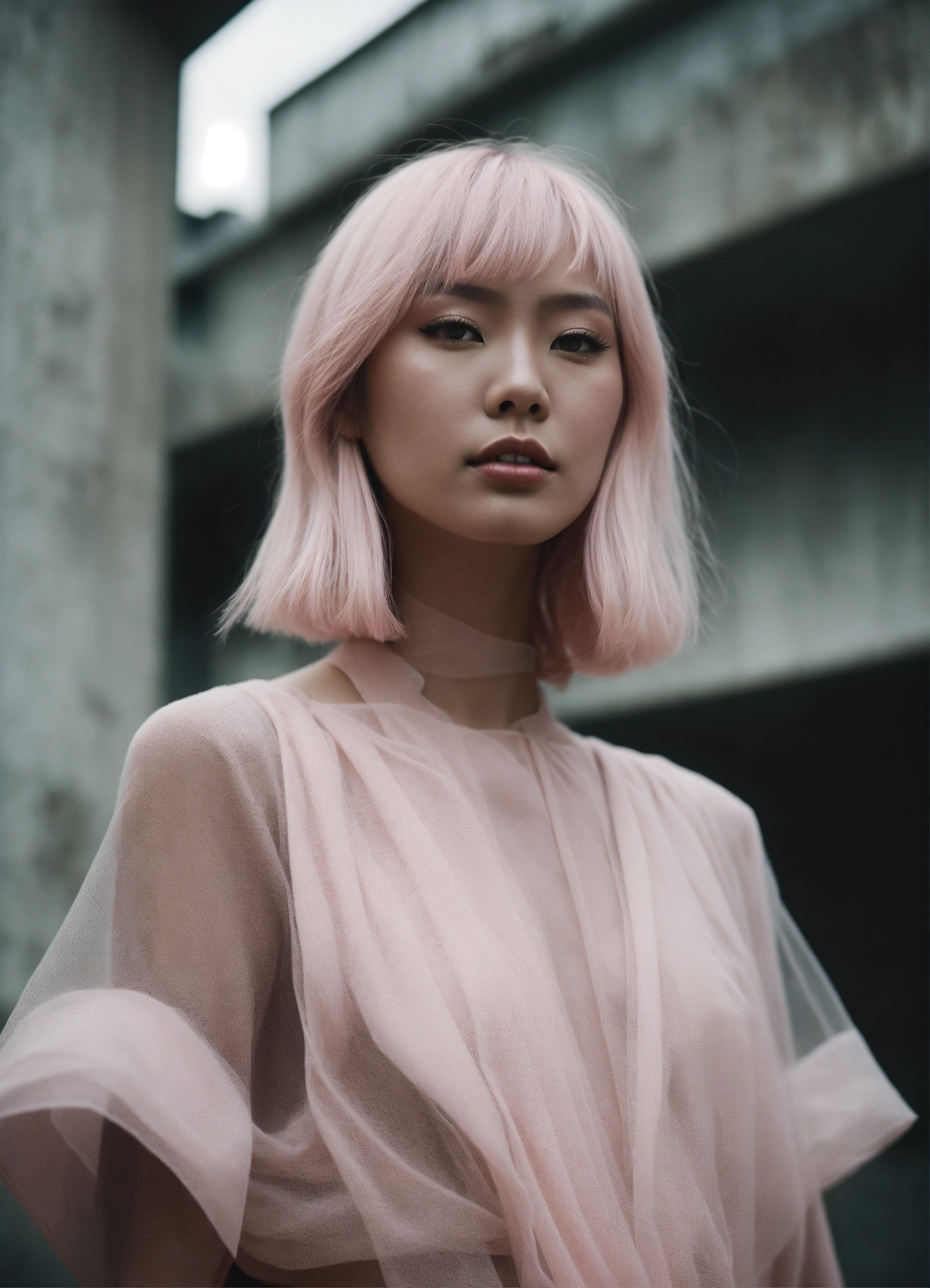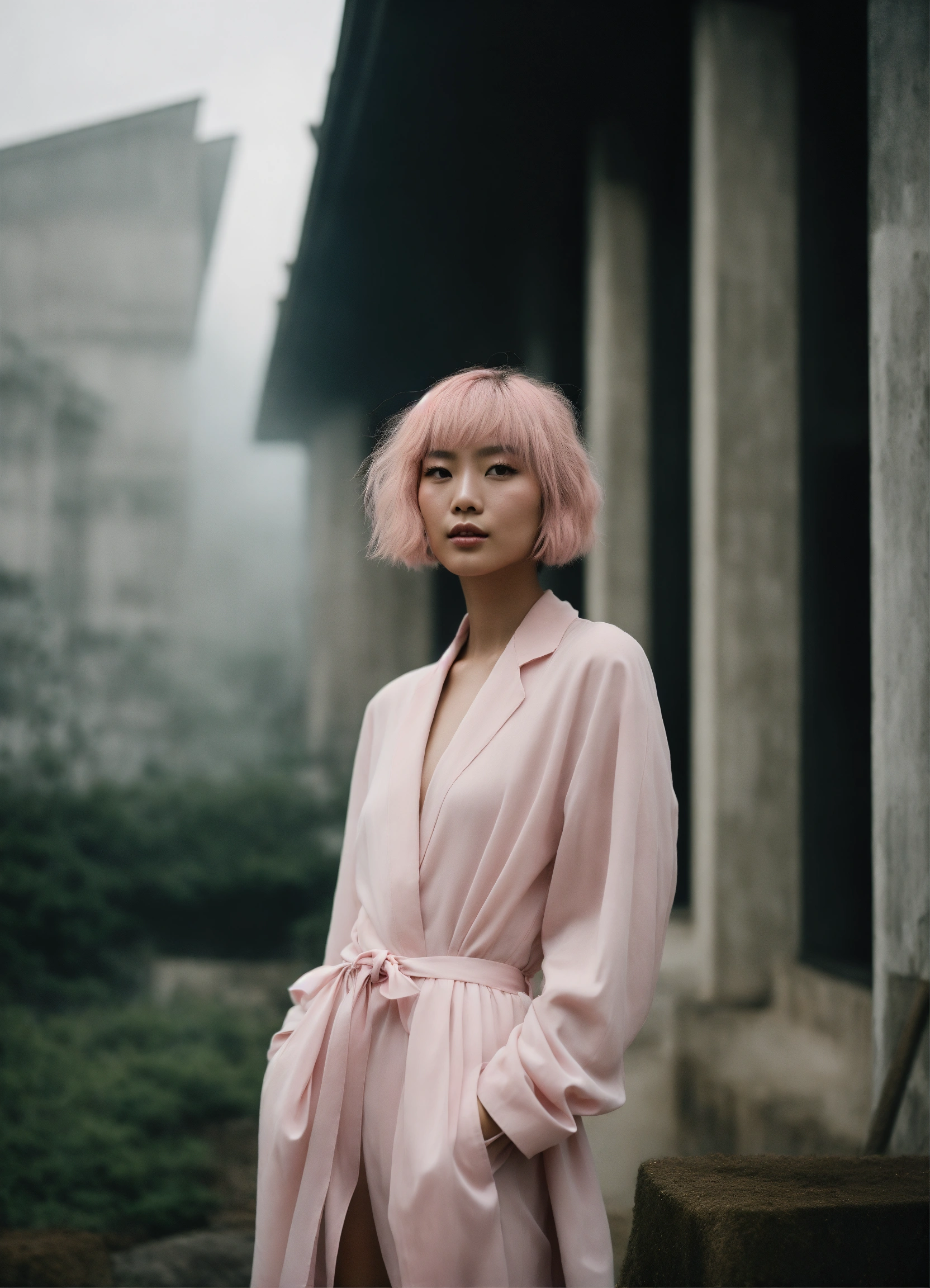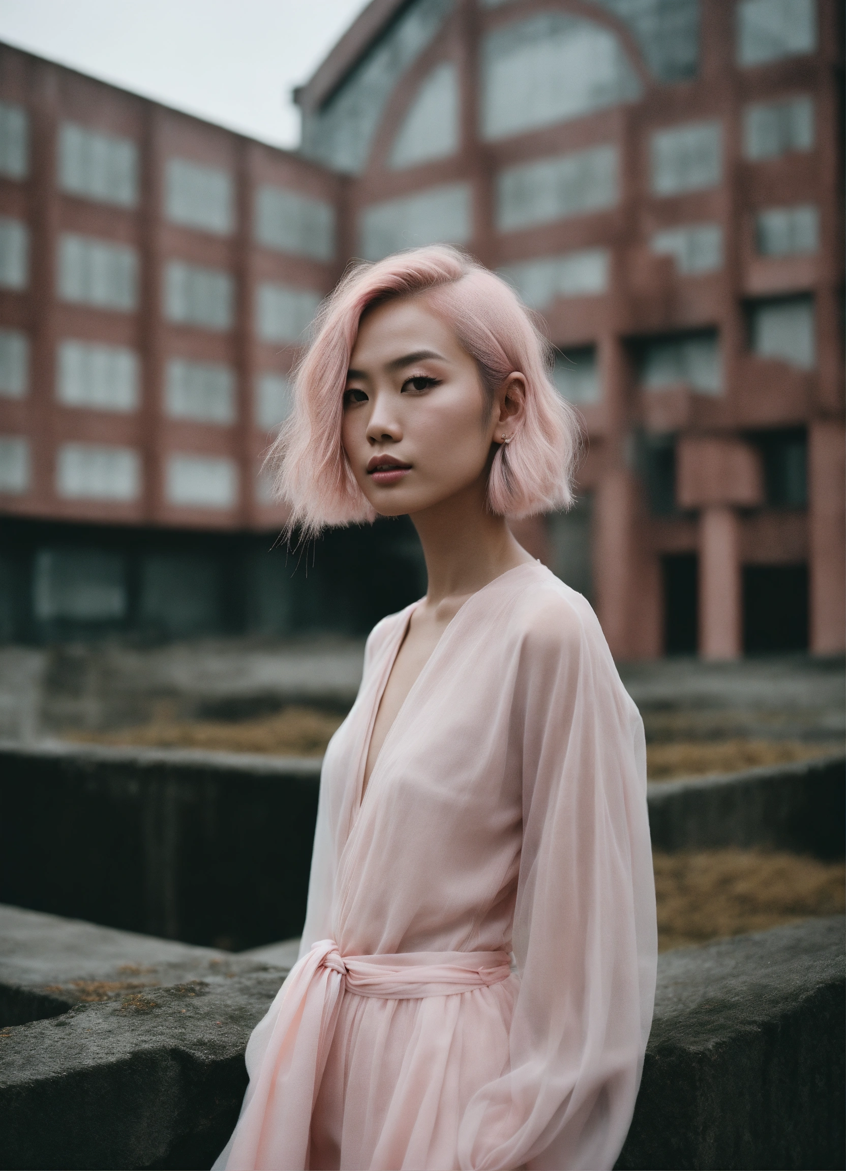 Portrait of haute couture beautiful asian fashion model with pale pink hair, ethereal dreamy foggy, photoshoot by alessio albi, editorial fashion magazine photoshoot, fashion poses, in front of brutalist building architecture. kinfolk magazine. film grain. a soft smile