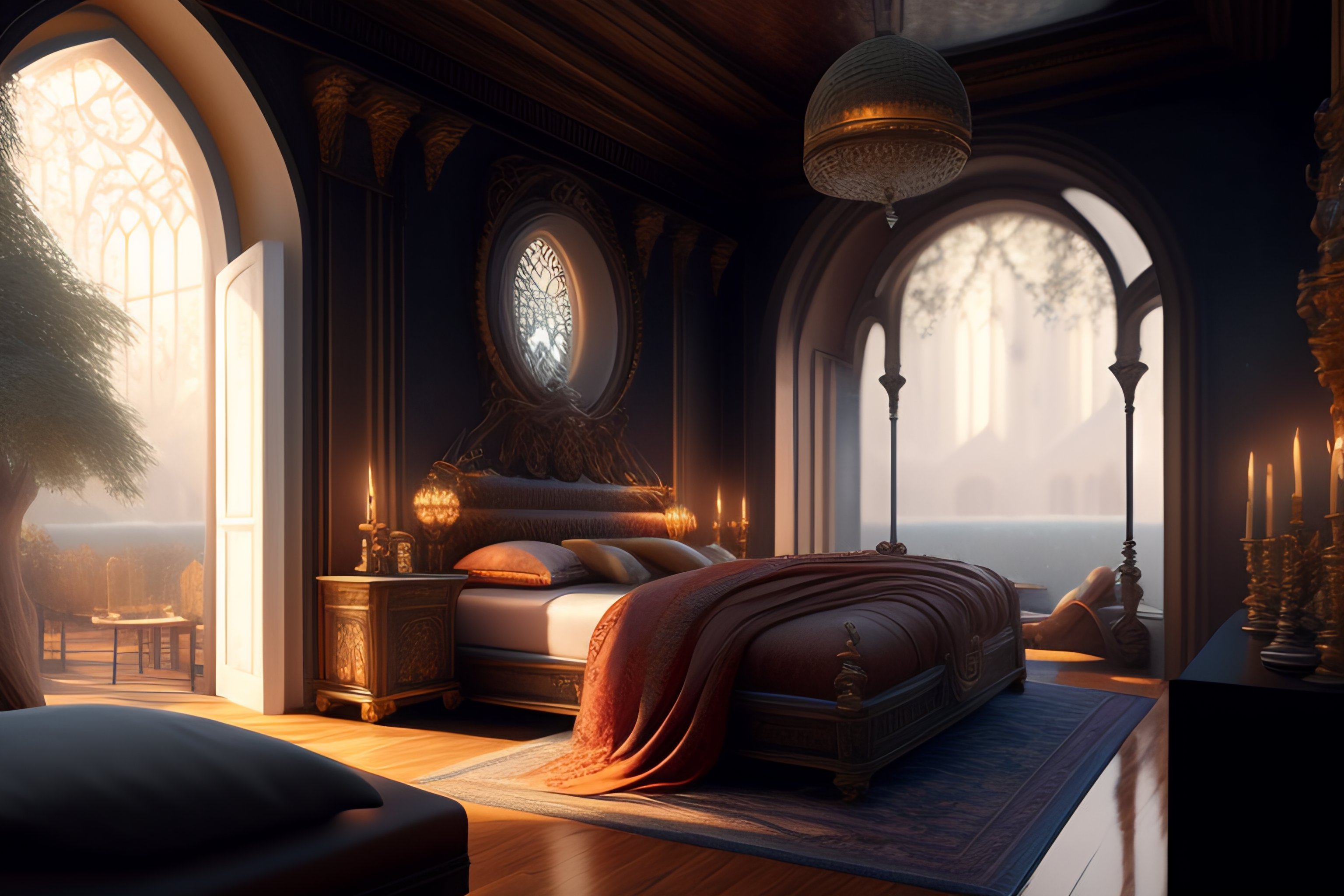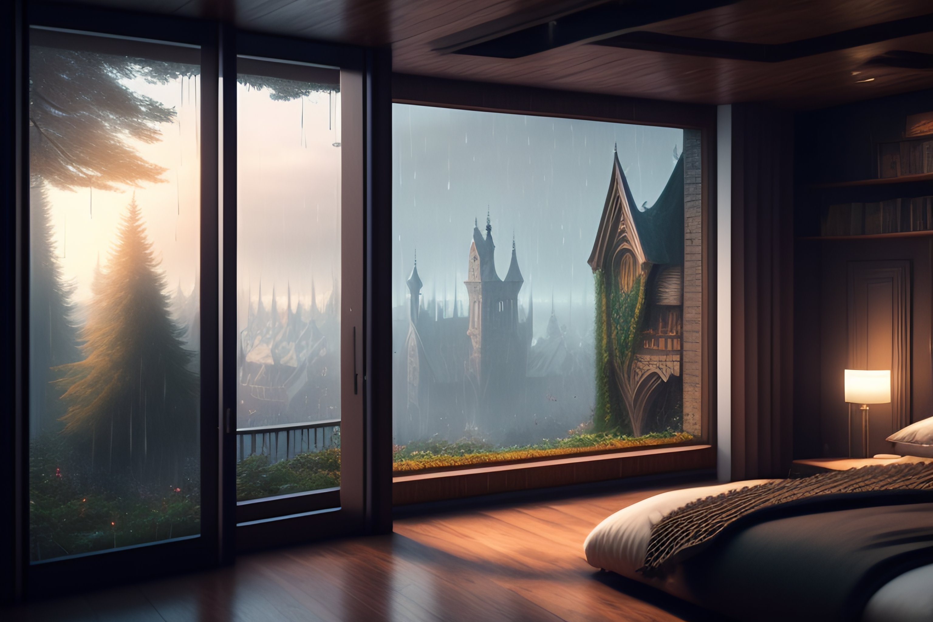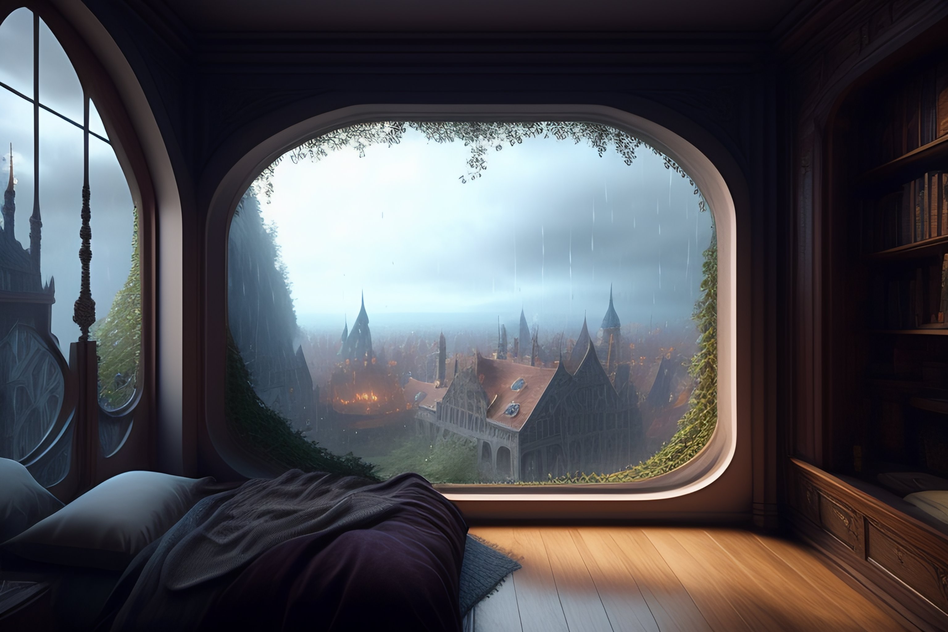 Interior medieval, fantasy elven bedroom looking out window, hyper detailed, capital city, buildings, rain, matte painting by marc simonetti, jonathan solter, greg rutkowski, masterpiece, cinematic, hyperdetailed, photorealistic, hyperrealism, architecture, aerial view