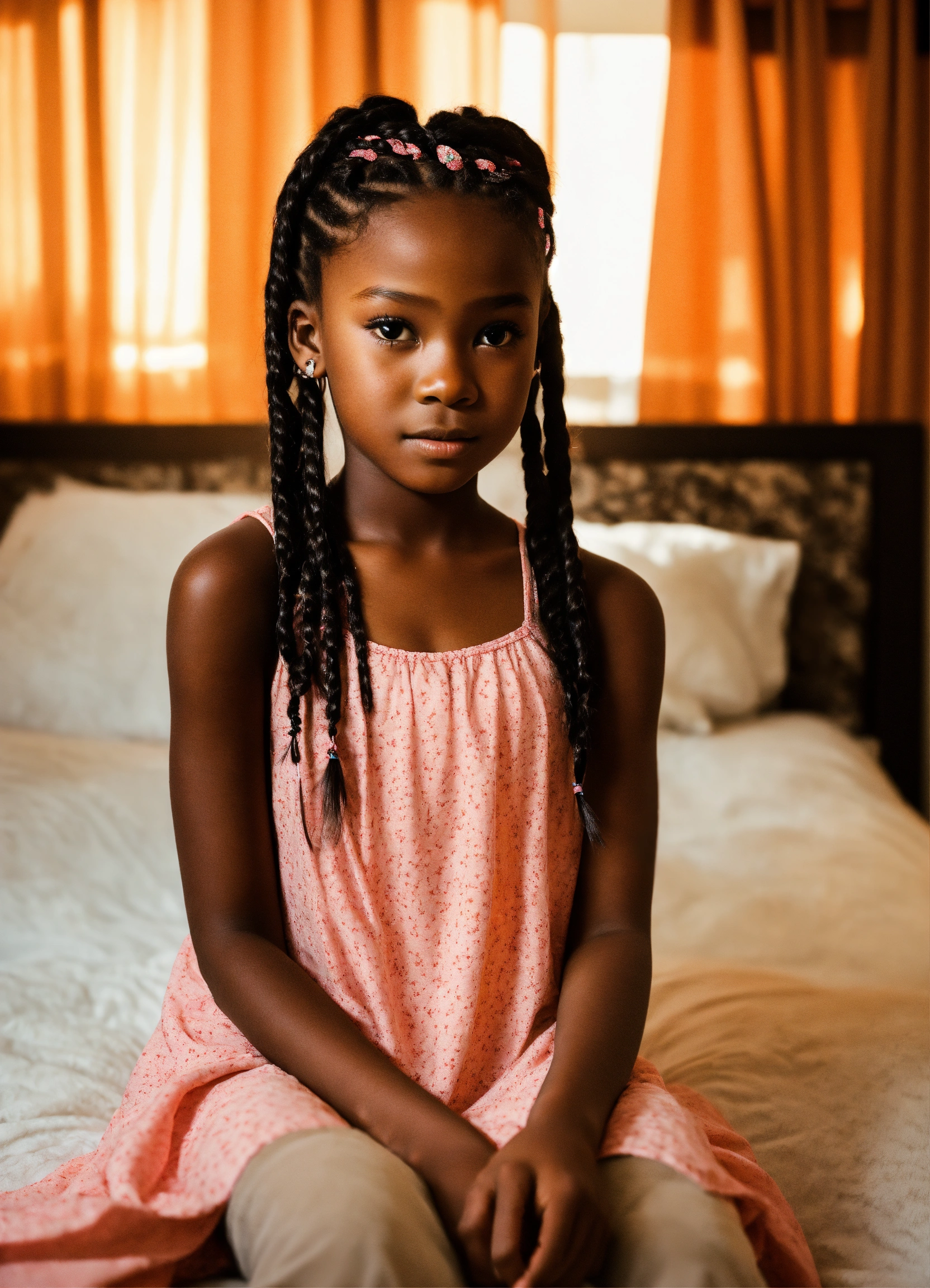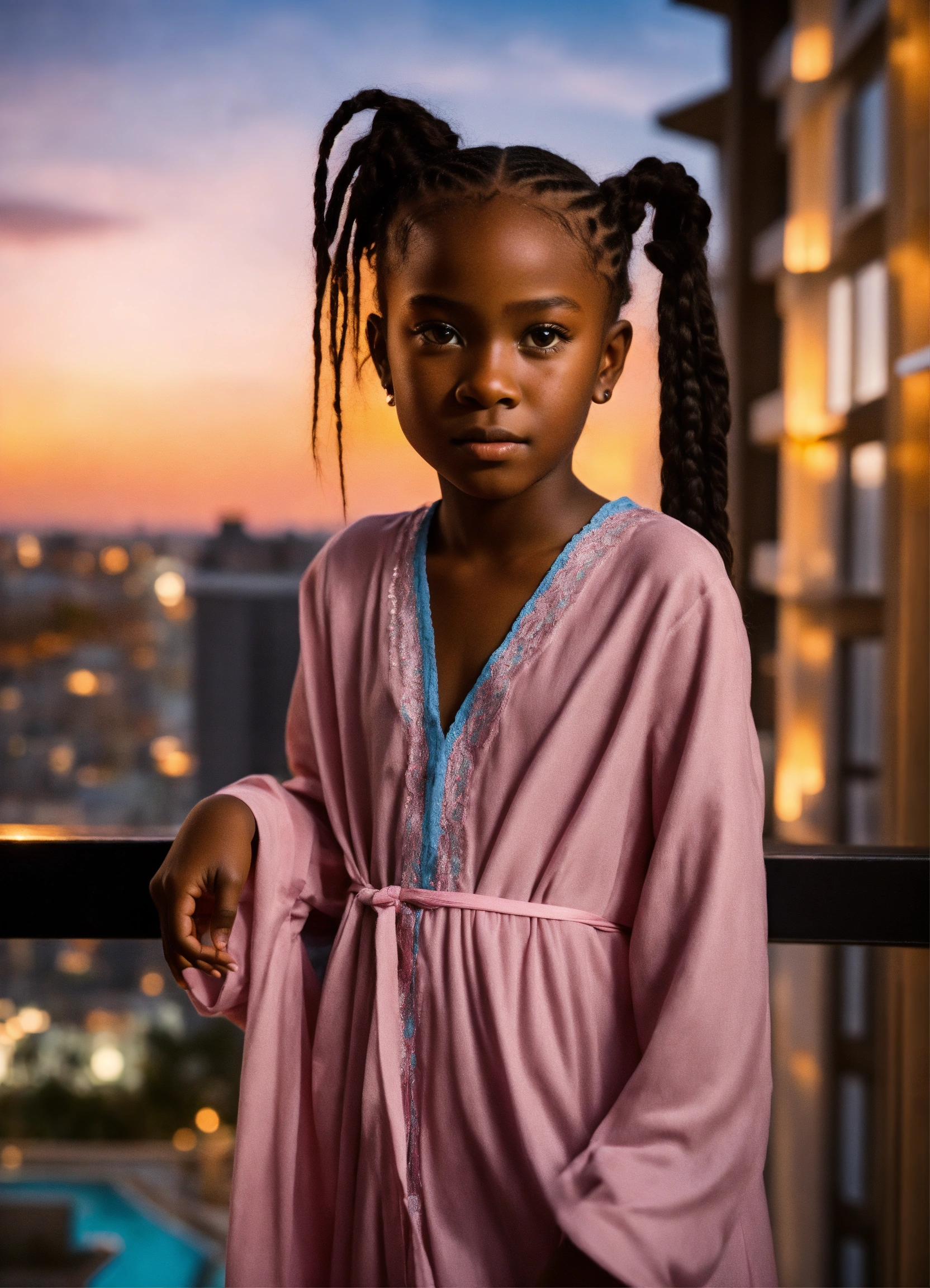 Gorgeous ebony 10 year old girl, cat-like eyes, hair in braids, dressed in nightgown, confident demeanor, at a high-end modern condo