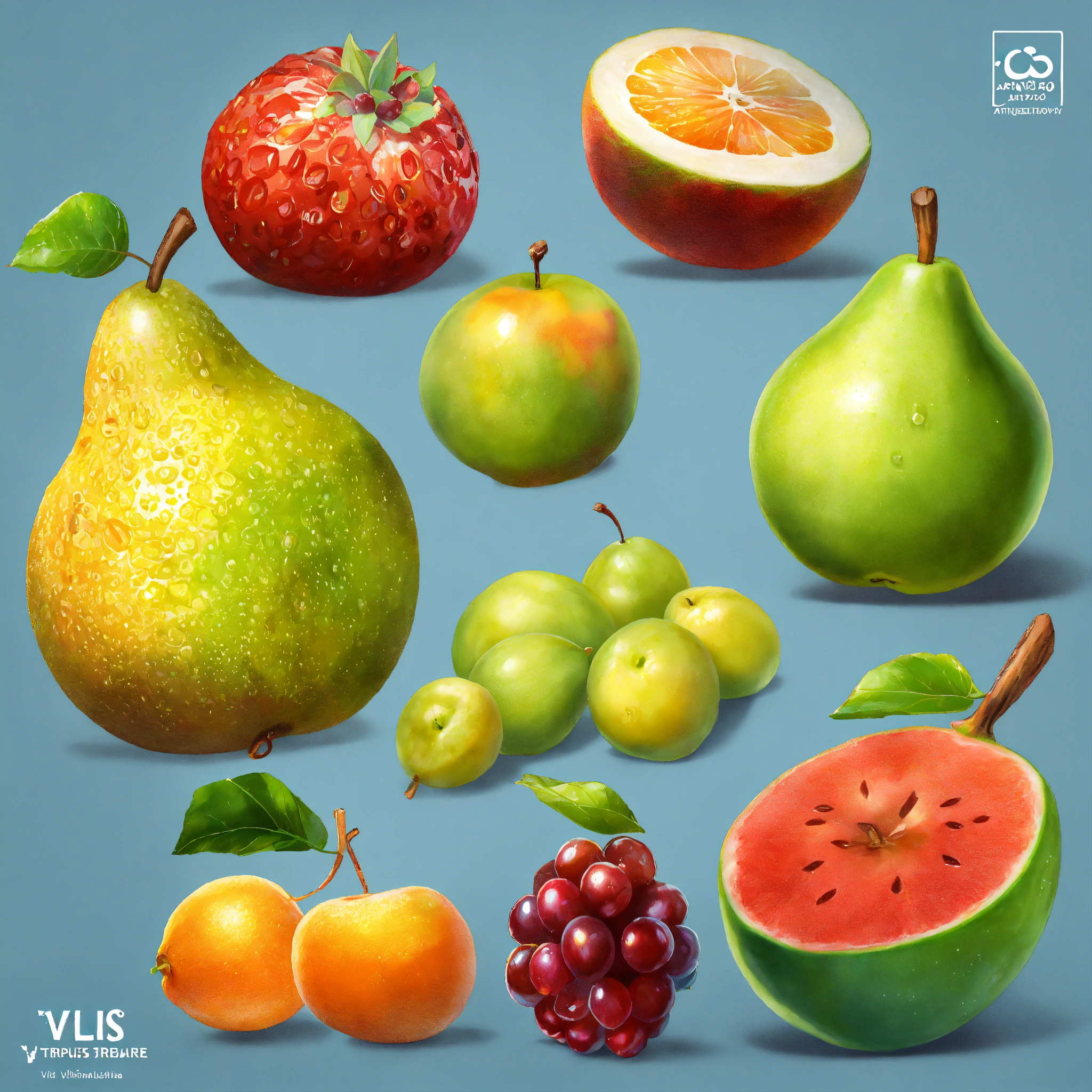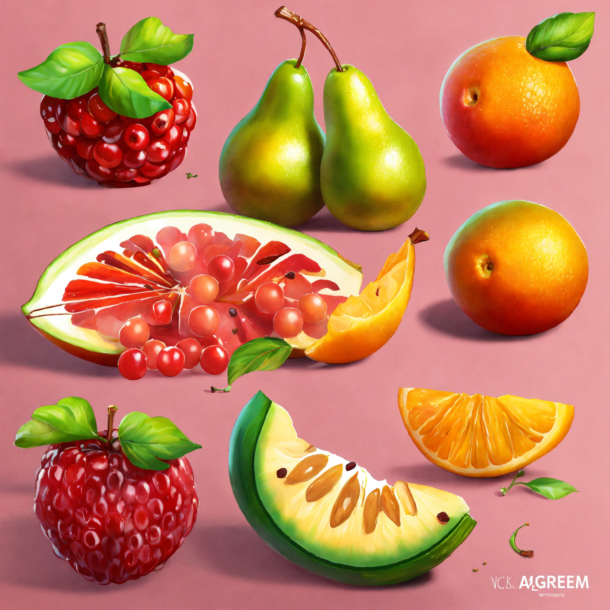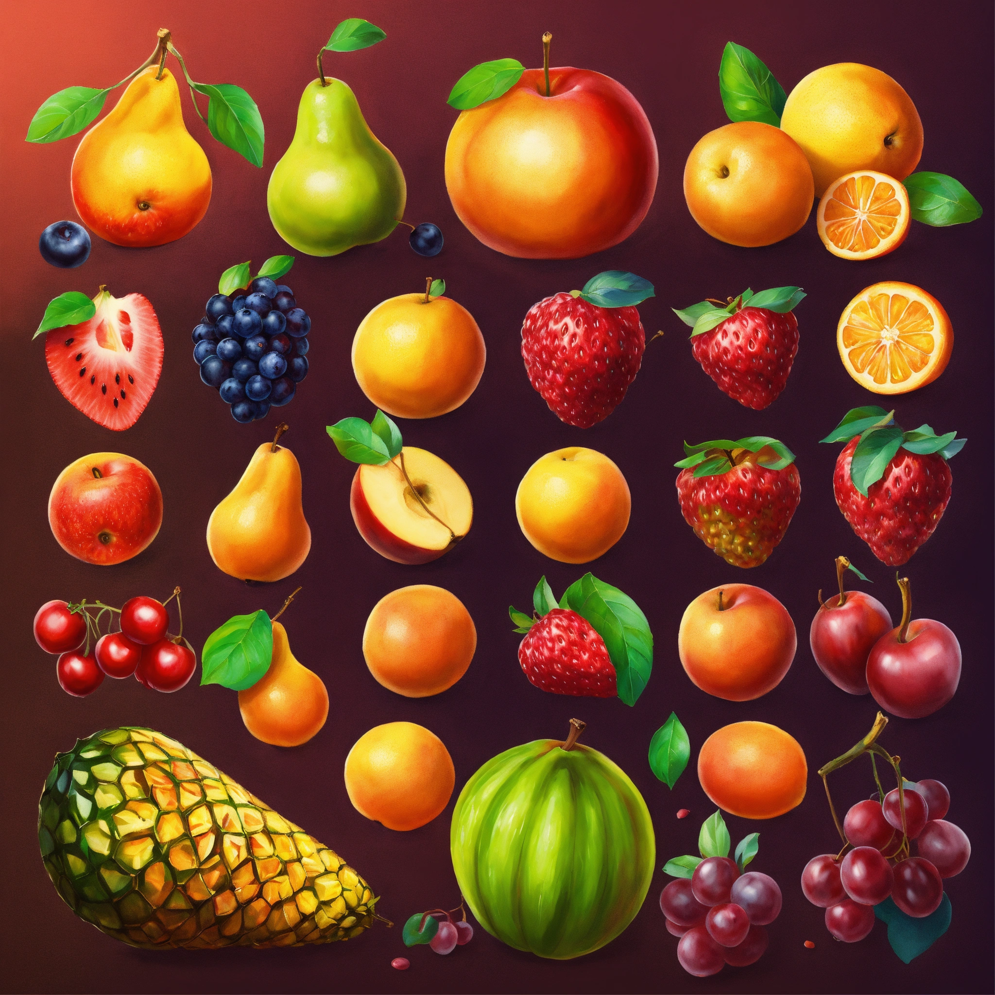 Various fruits props, separate isolate objects sheet, realistic cartoon oil paint, 2d illustration style, sharp focus, bright color, digital paint game design, trending on artstation, high details, simple lines, outpaiting, art by viktoria gavrilenko, josé luis ágreda, greg rutkowsk, magali villeneuve, camilla d'errico and artgem