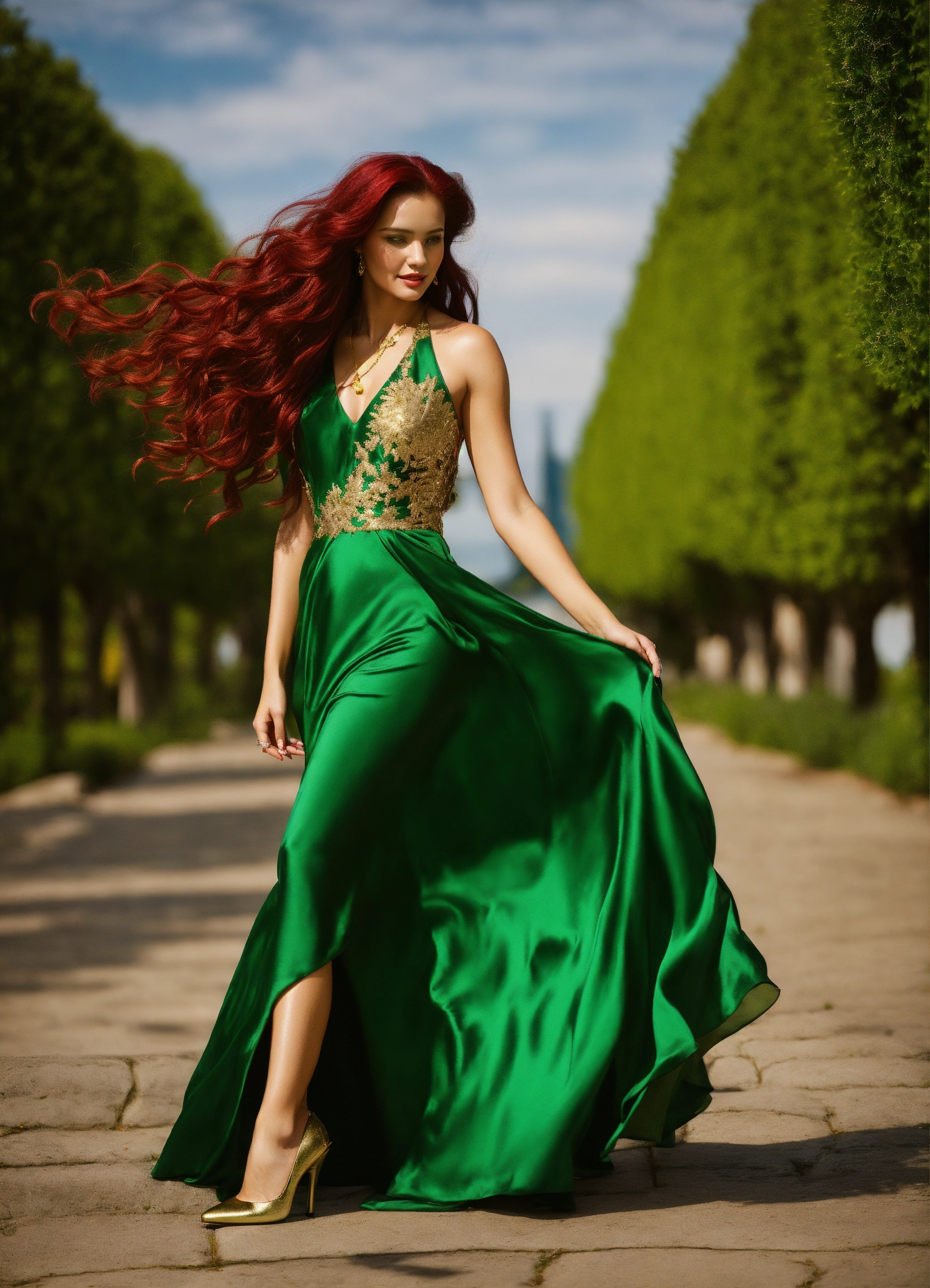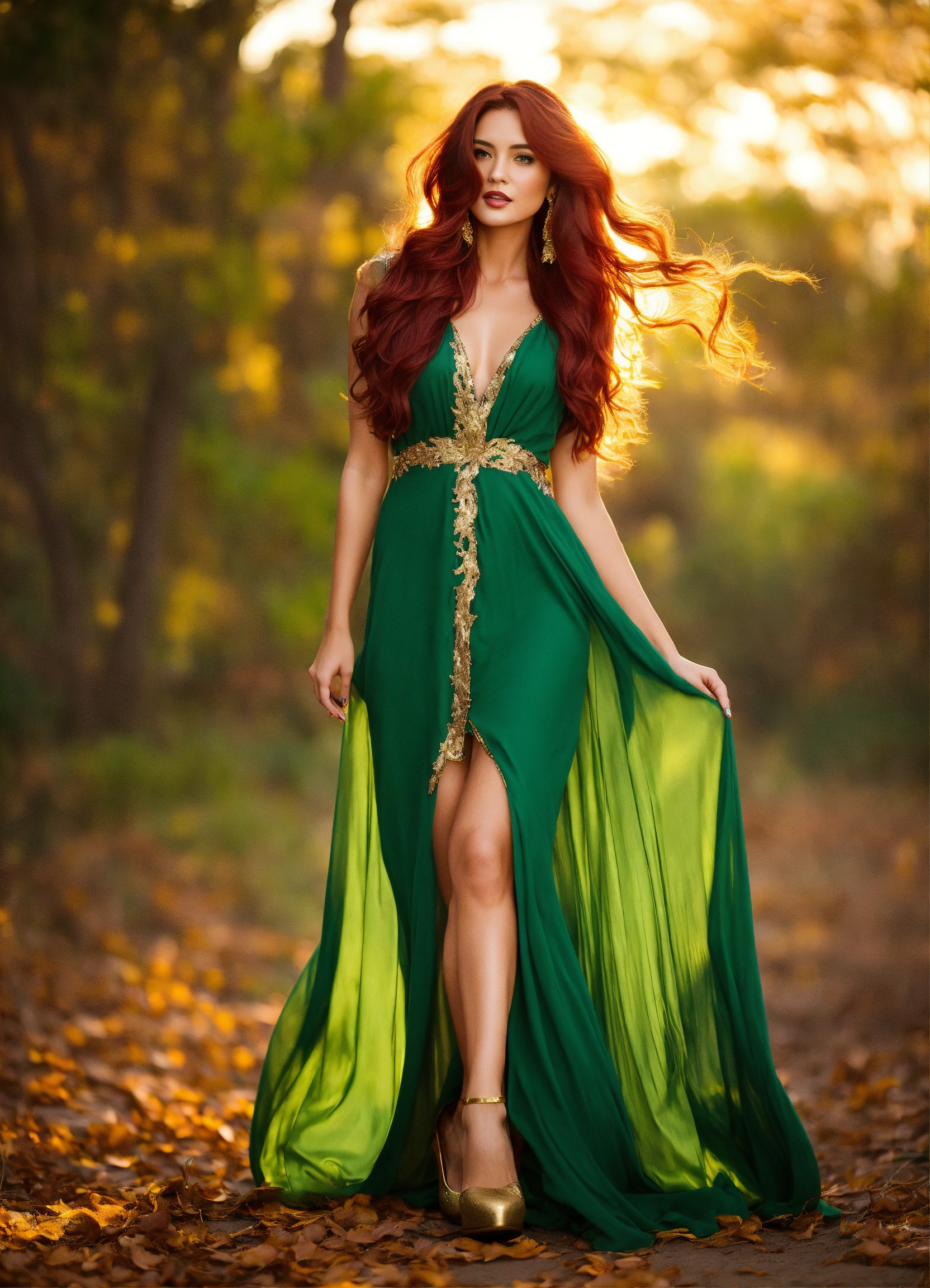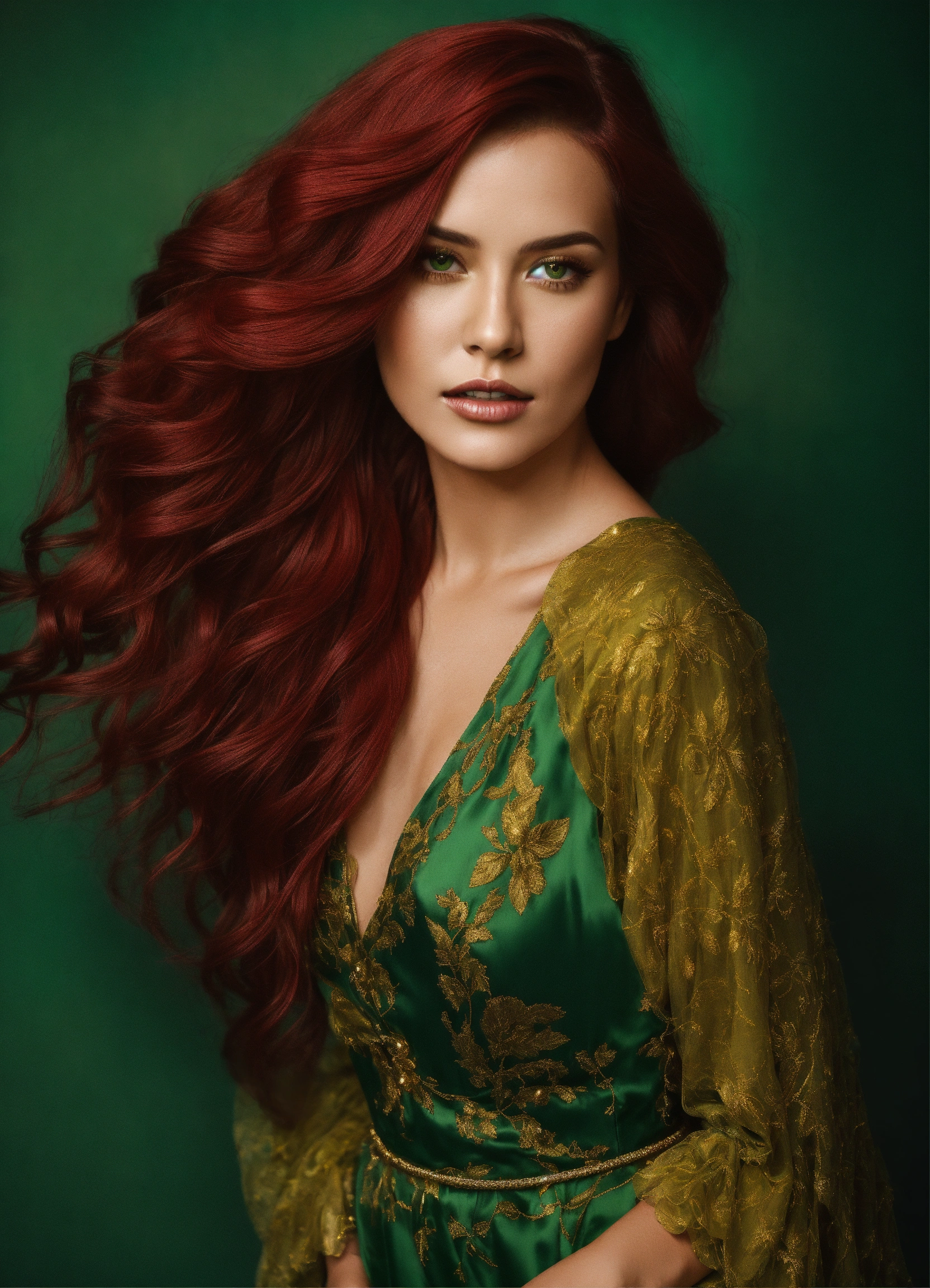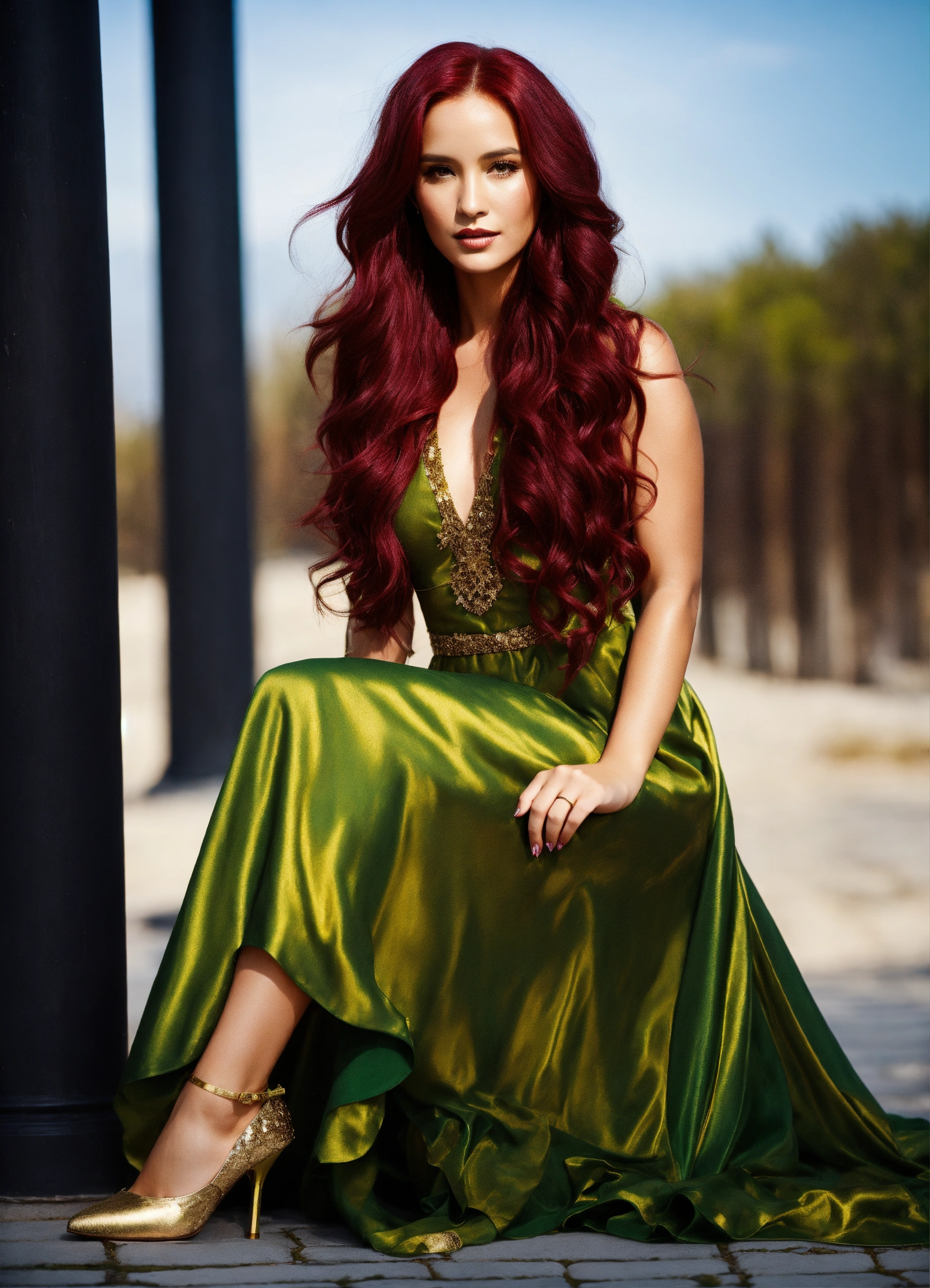Feminine red skinned 30 year old woman with very long wavy burgundy hair, dressed in green and gold dress and gold heels, loving allure