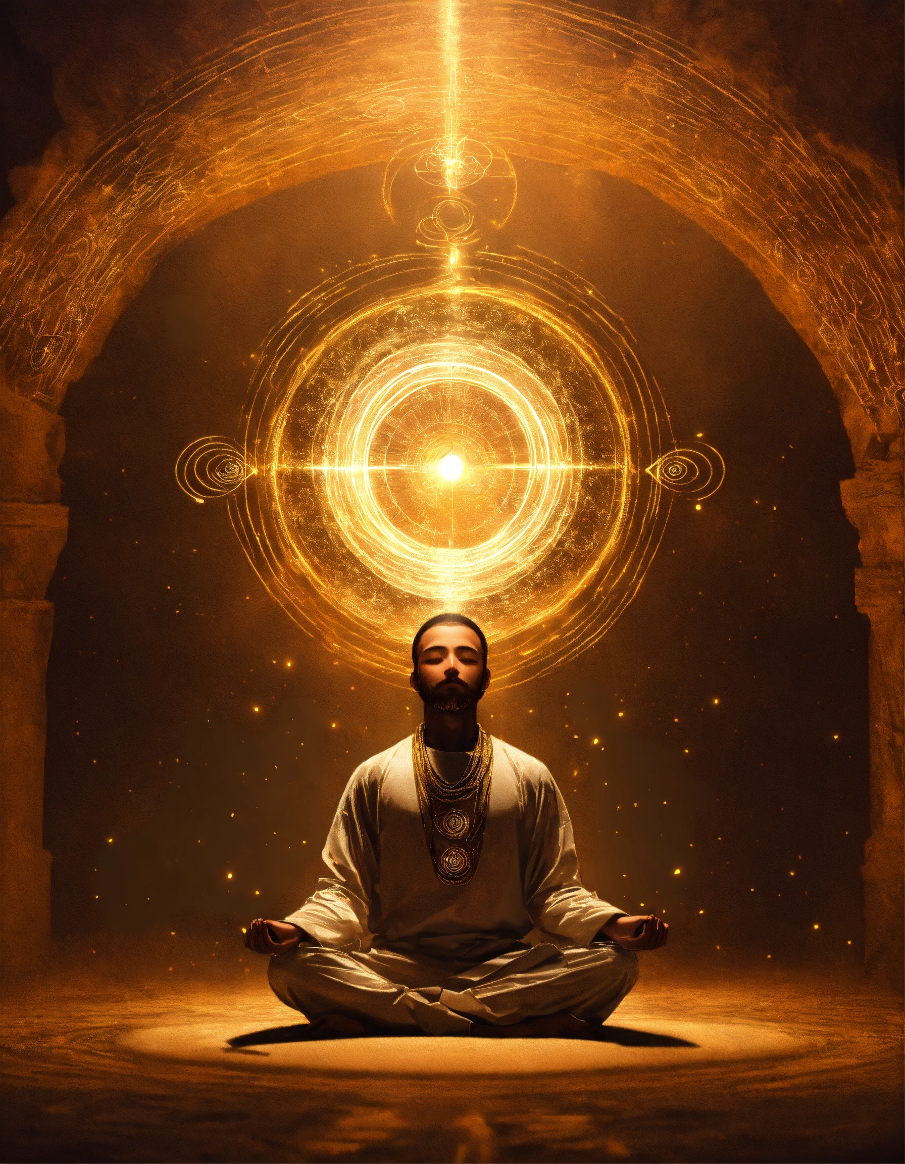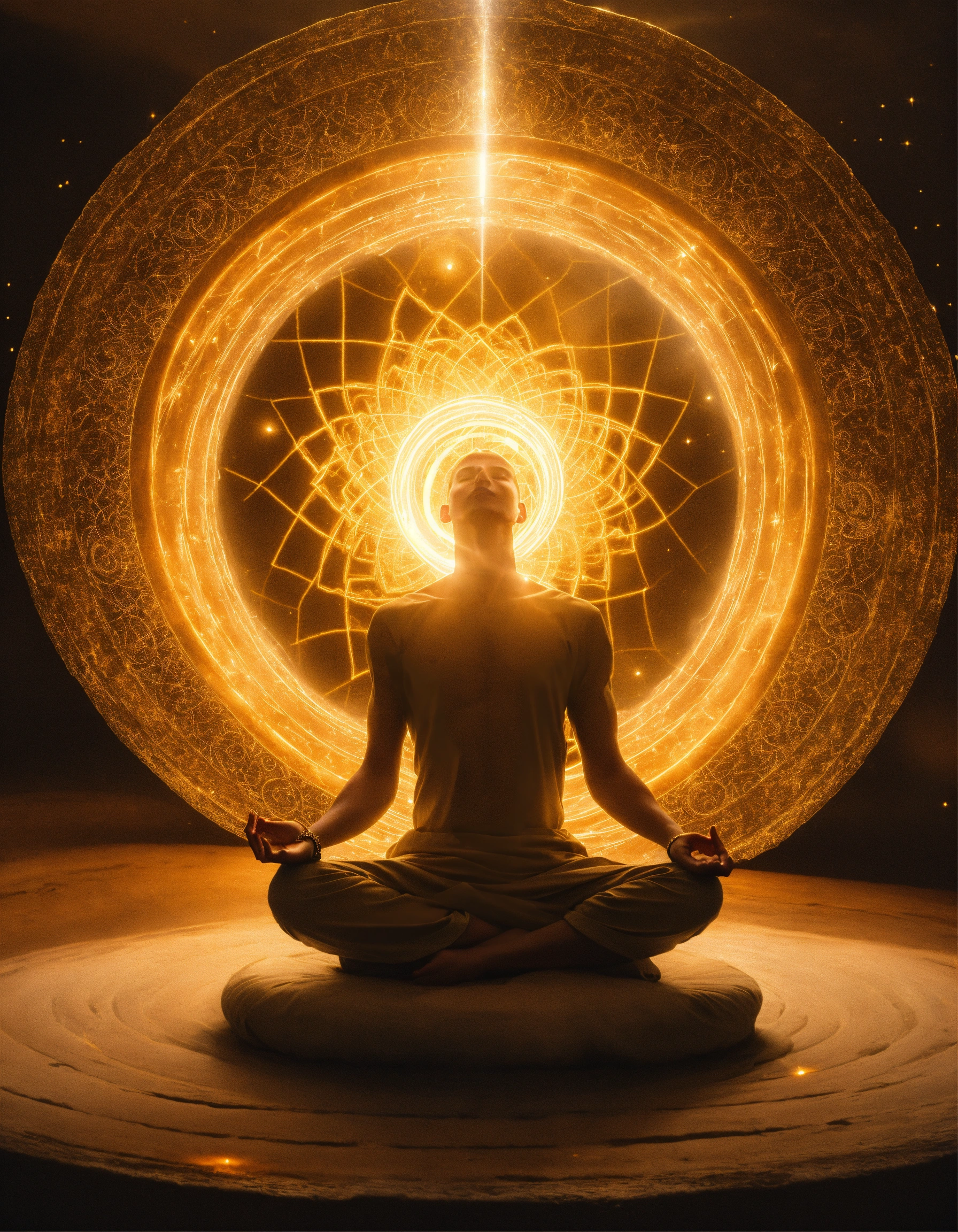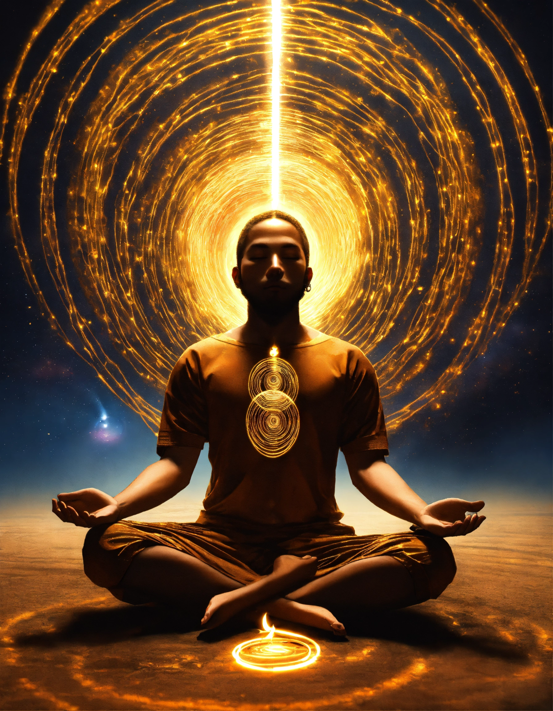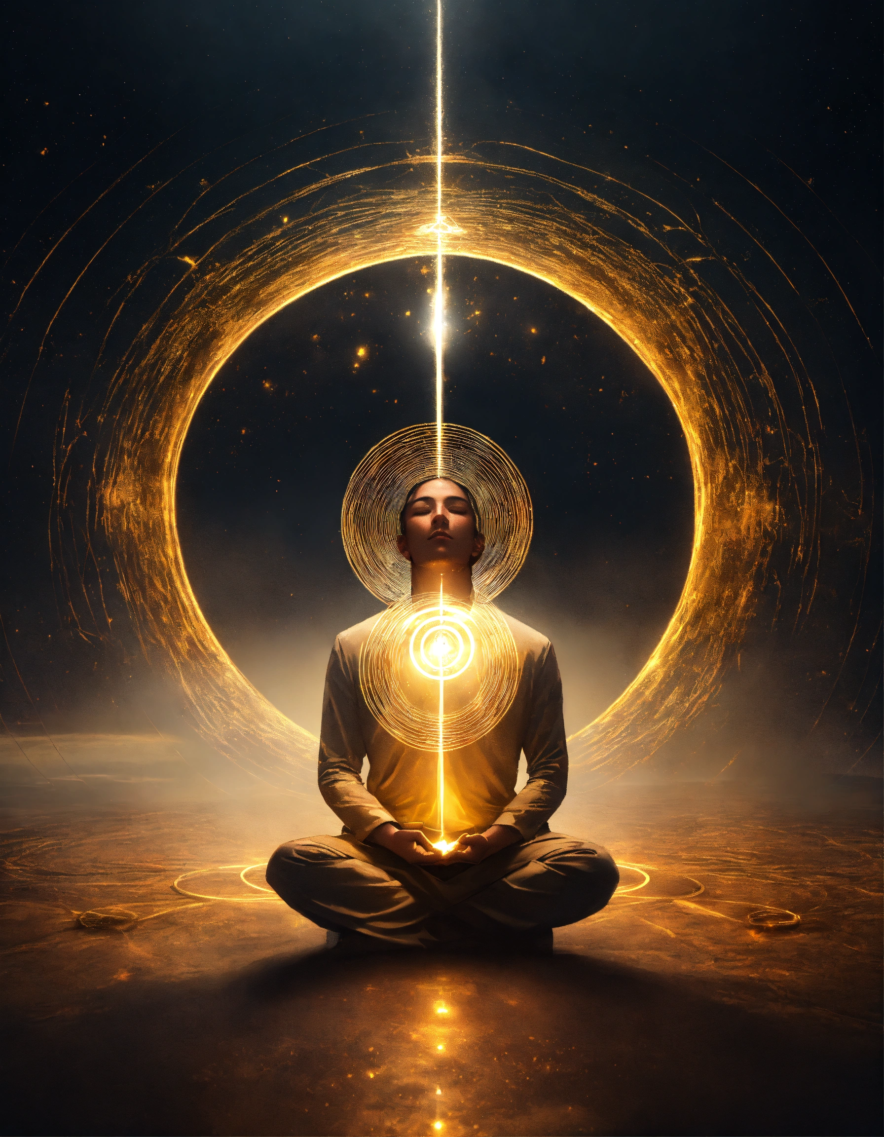 A being of light in a meditation position, above his head there is a vortex surrounded by 4 golden rings, a thread of light comes out of this vortex and enters through the top of the head