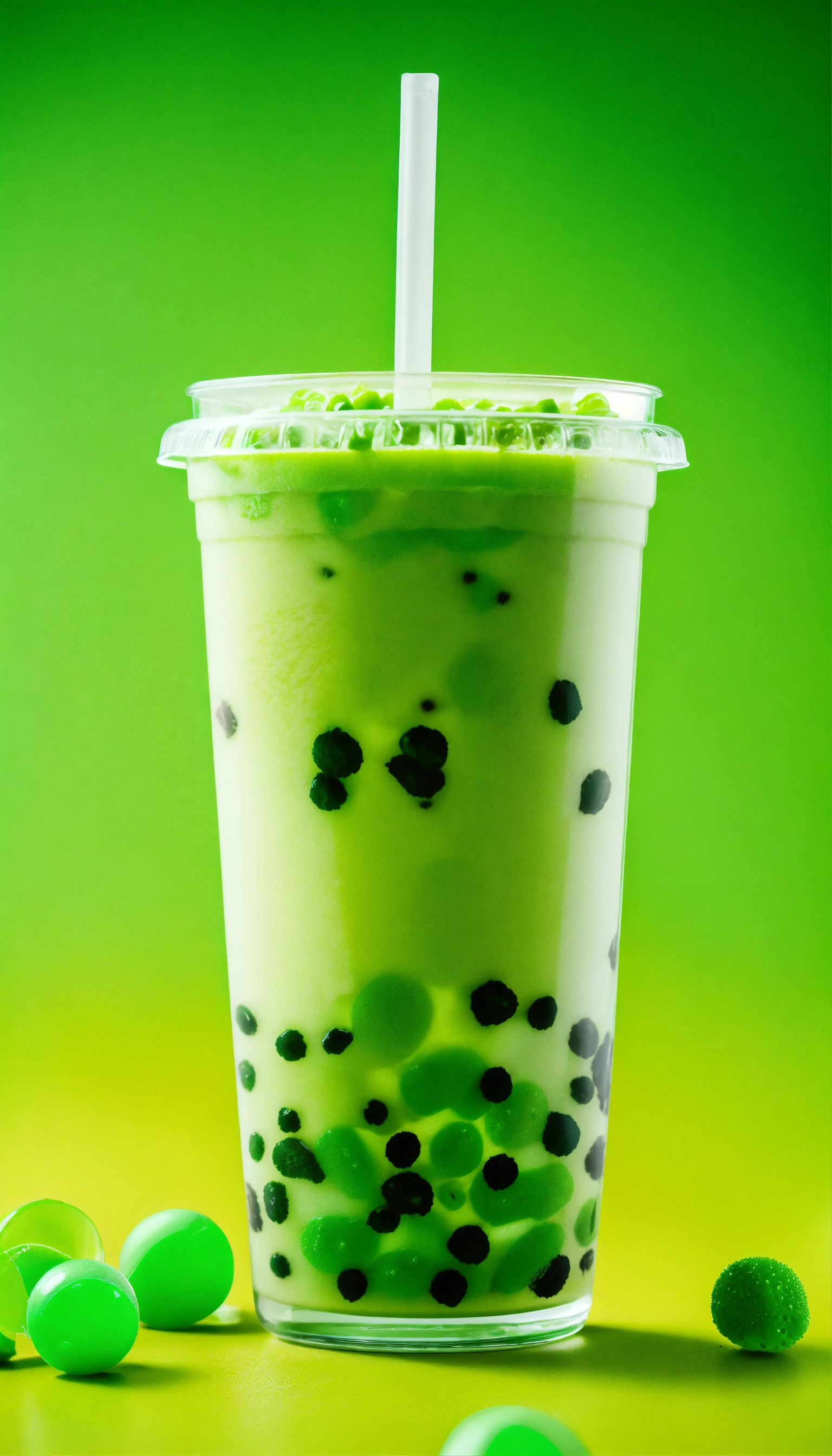 Floating green boba tea, a lot of bobas, stickers on cup, clear cup, studio photography, neutral tone background, pops of neon green