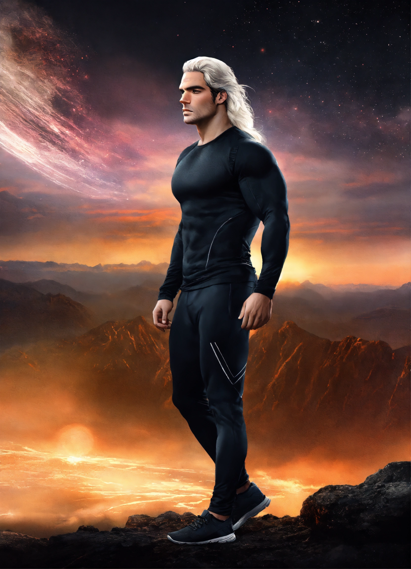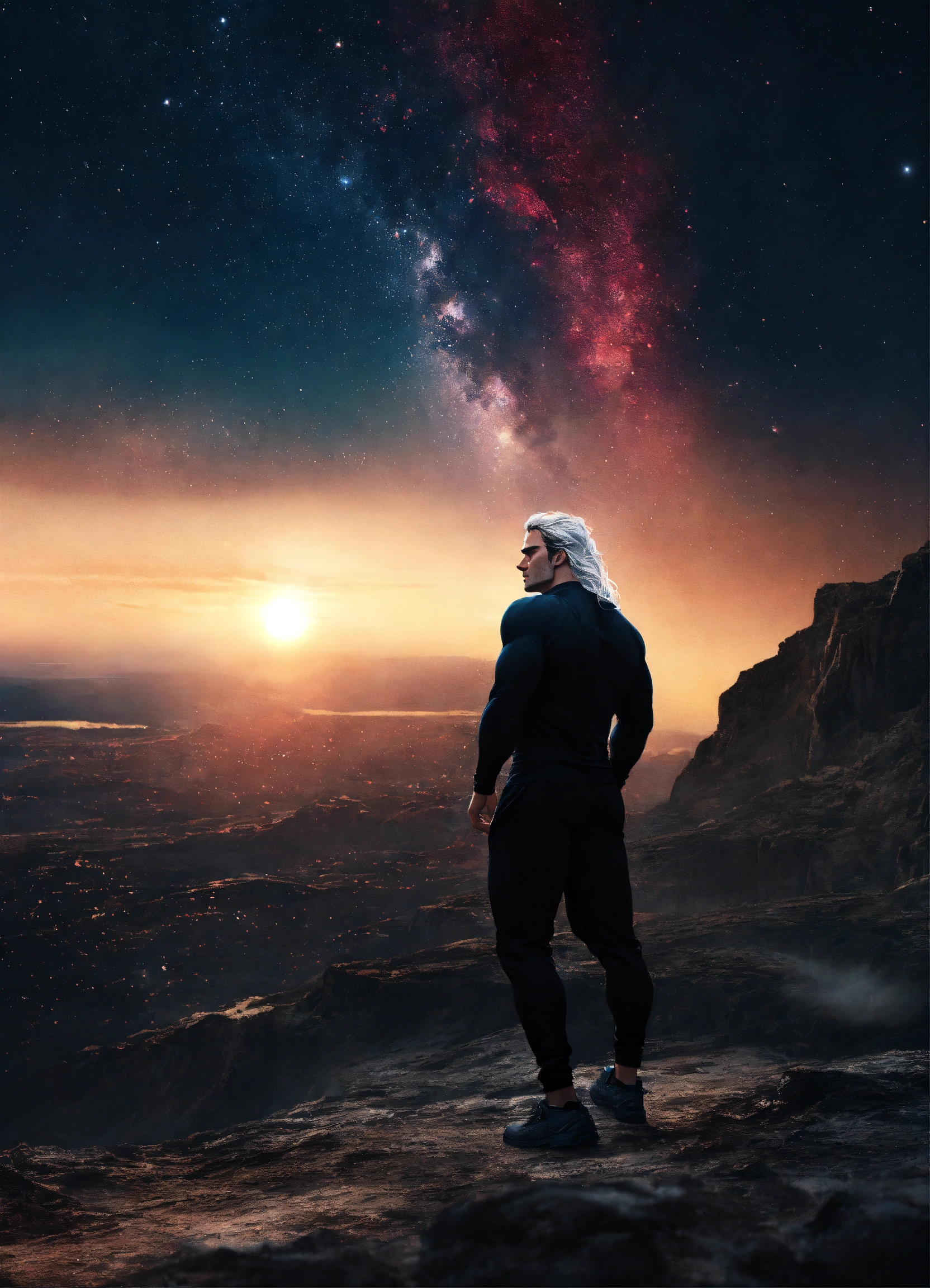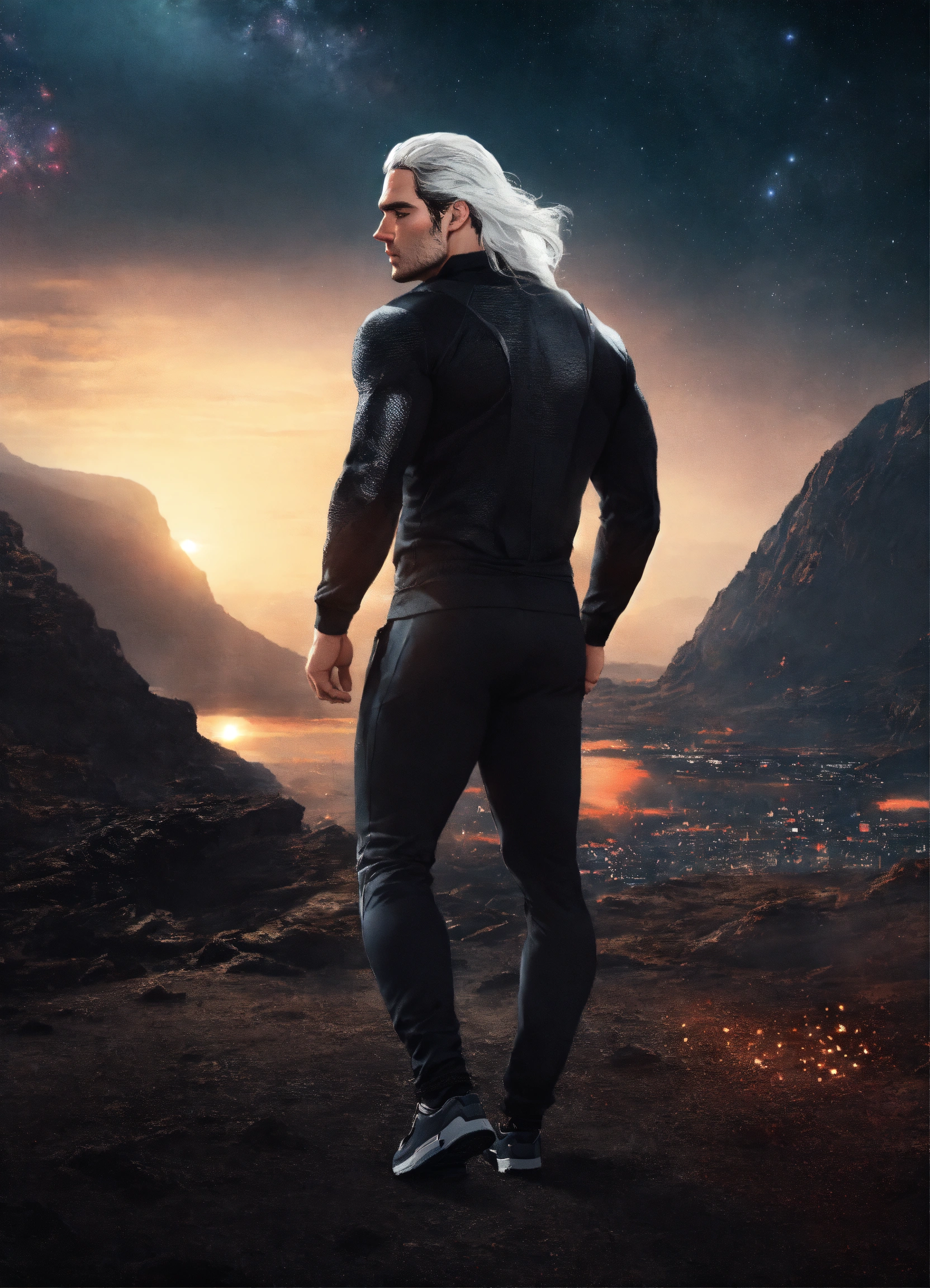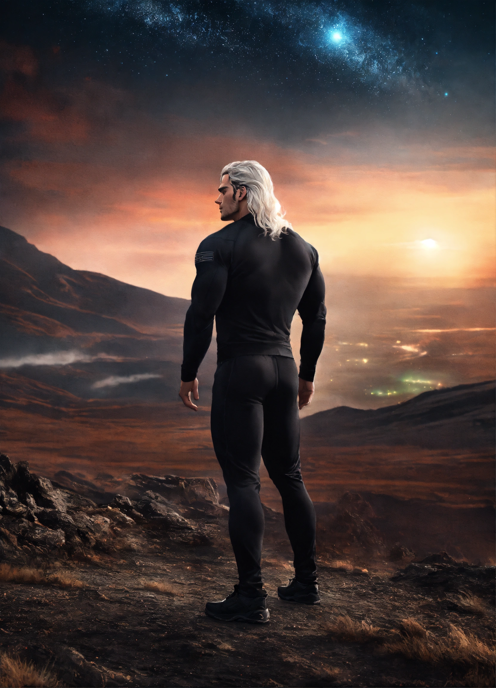 Henry cavill with long white hair, in black jogging pants, black shirt, dark hues, back half turned, in a futuristic landscape, full body, stars falling, sunrise, realistic, photoshoot