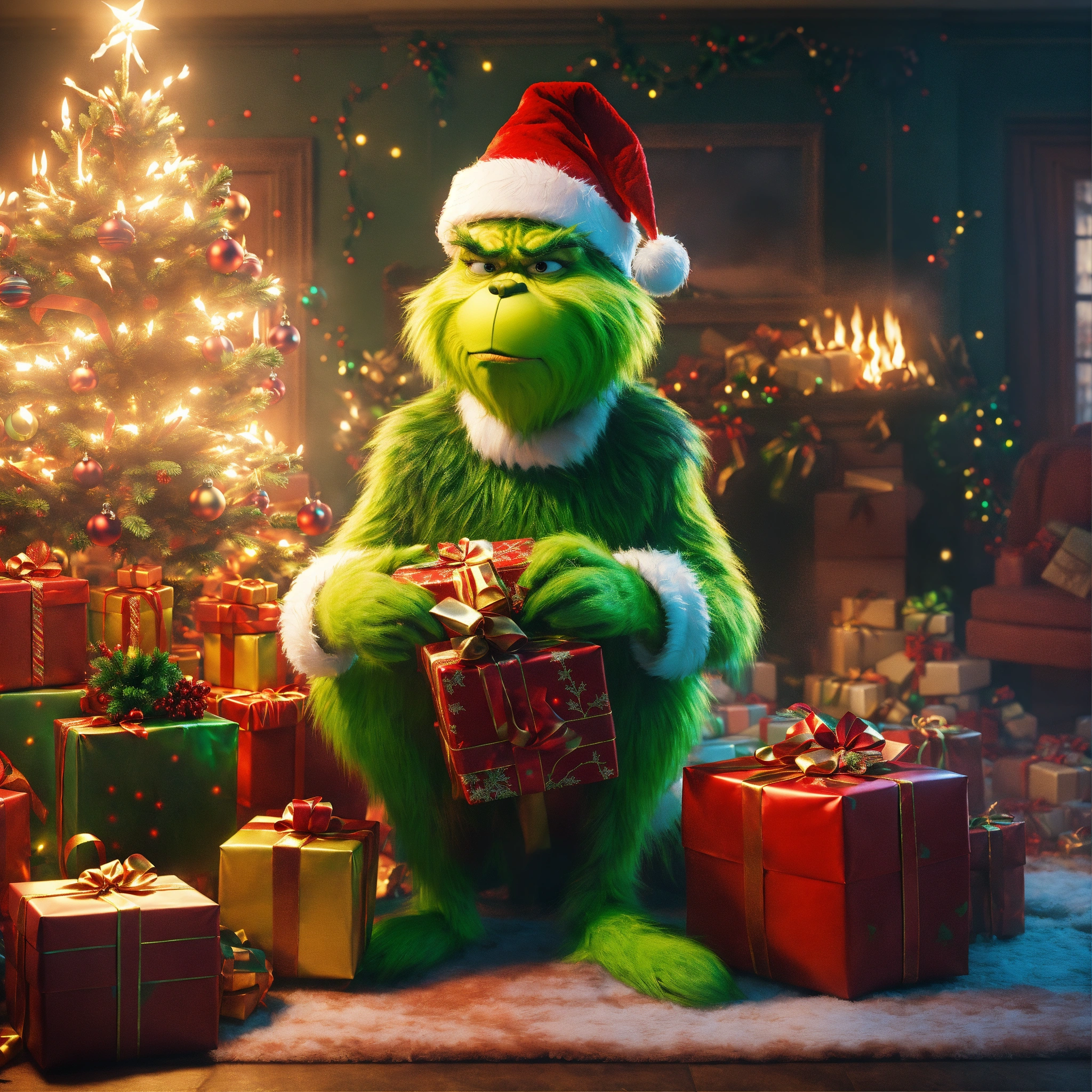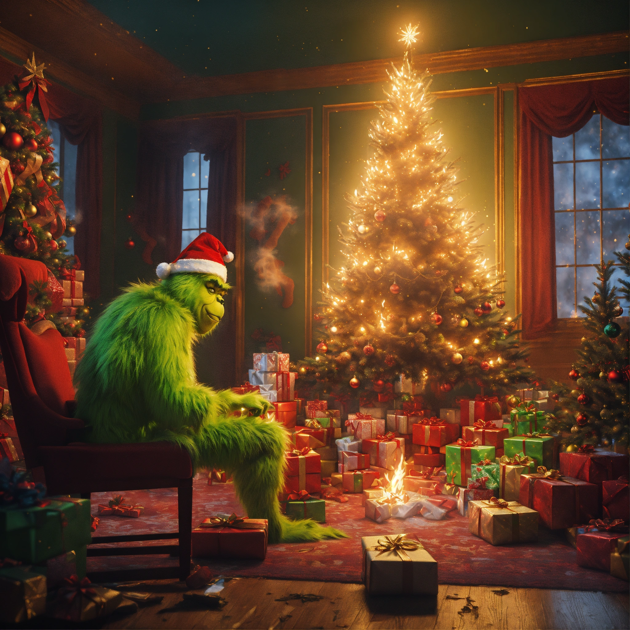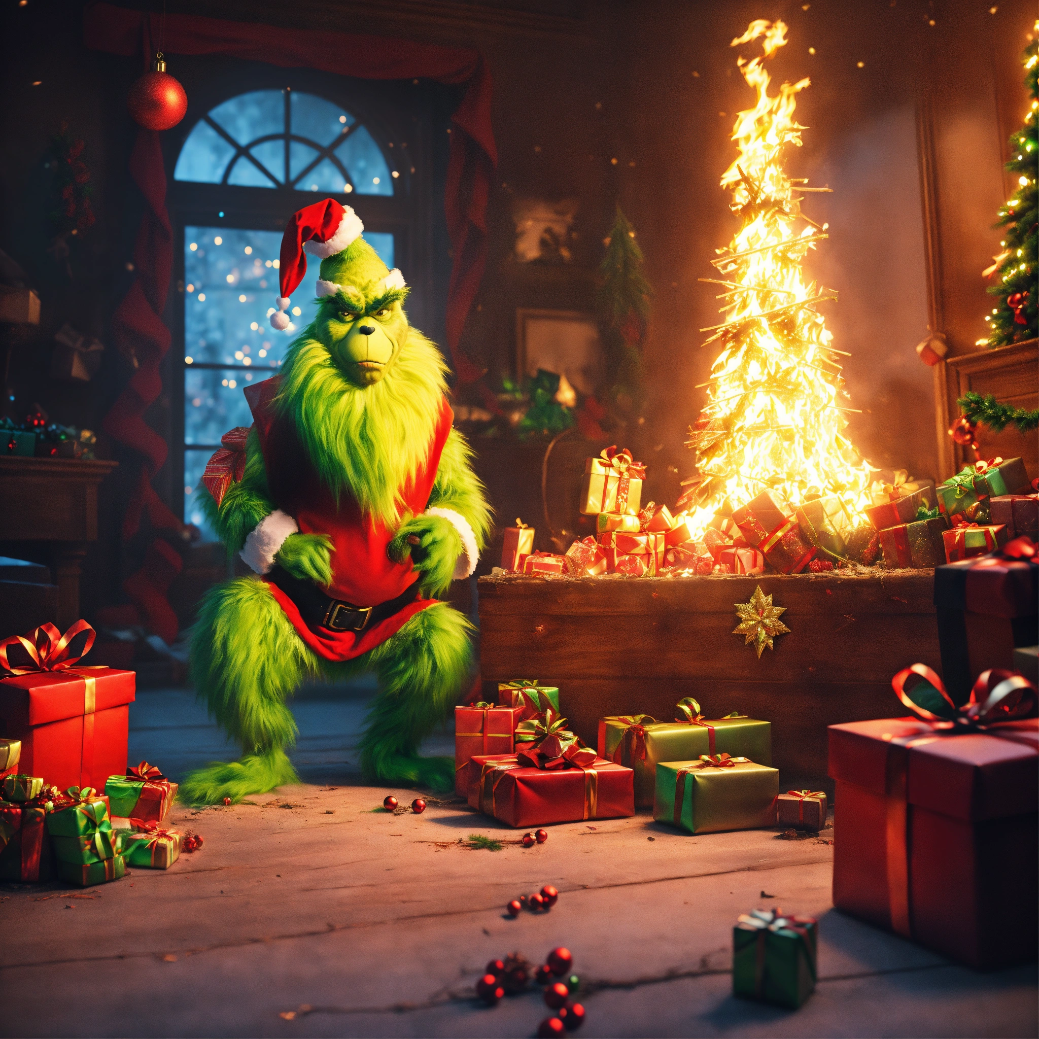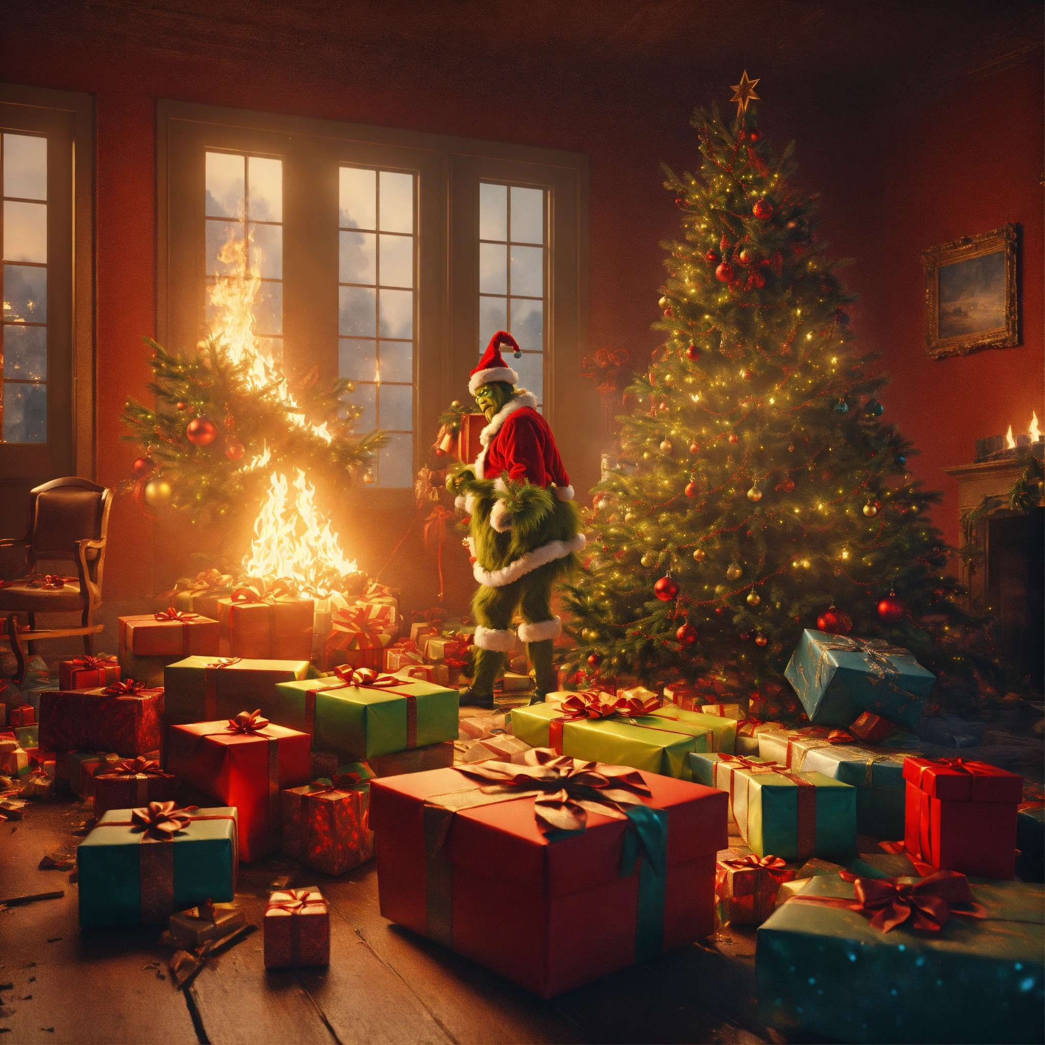 A classical painting of grinch menacingly standing around gifts on fire, a wrecked smoking christmas tree and a broken sleigh, chaotic cinematic shot, classical painting style, christmas color scheme aesthetic, 8k cinematic, unreal engine render, ultra realistic, cinematic noise