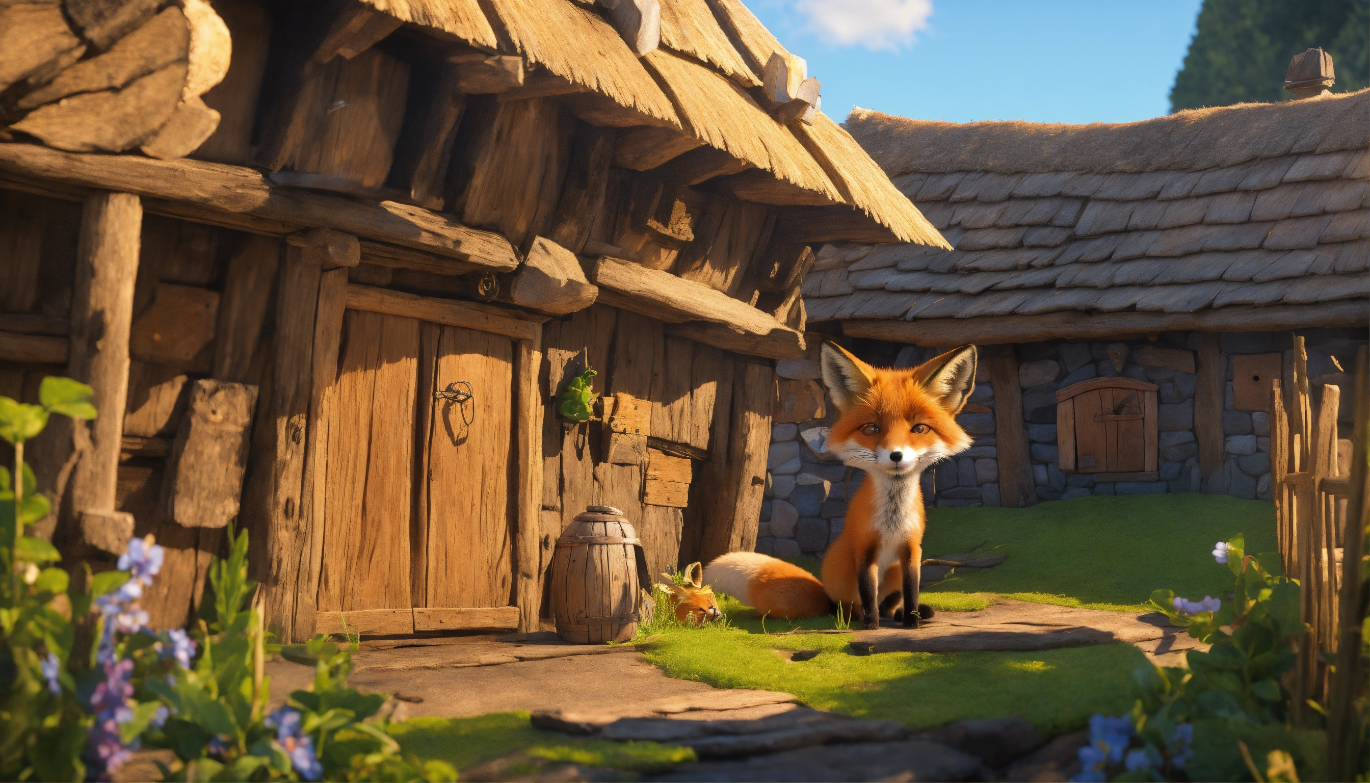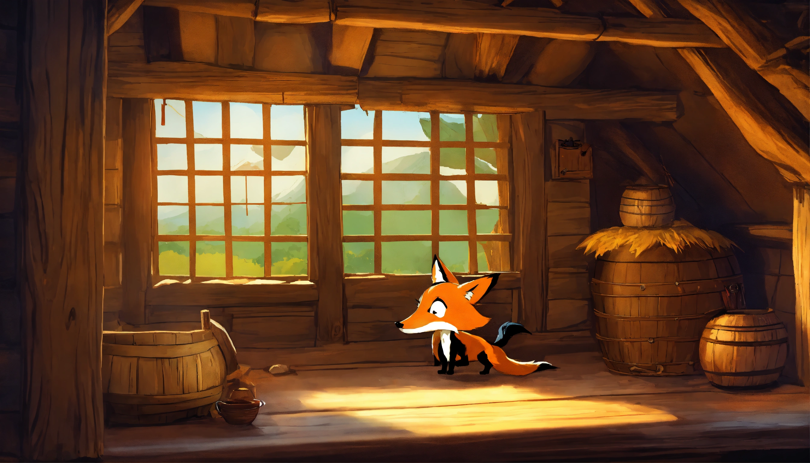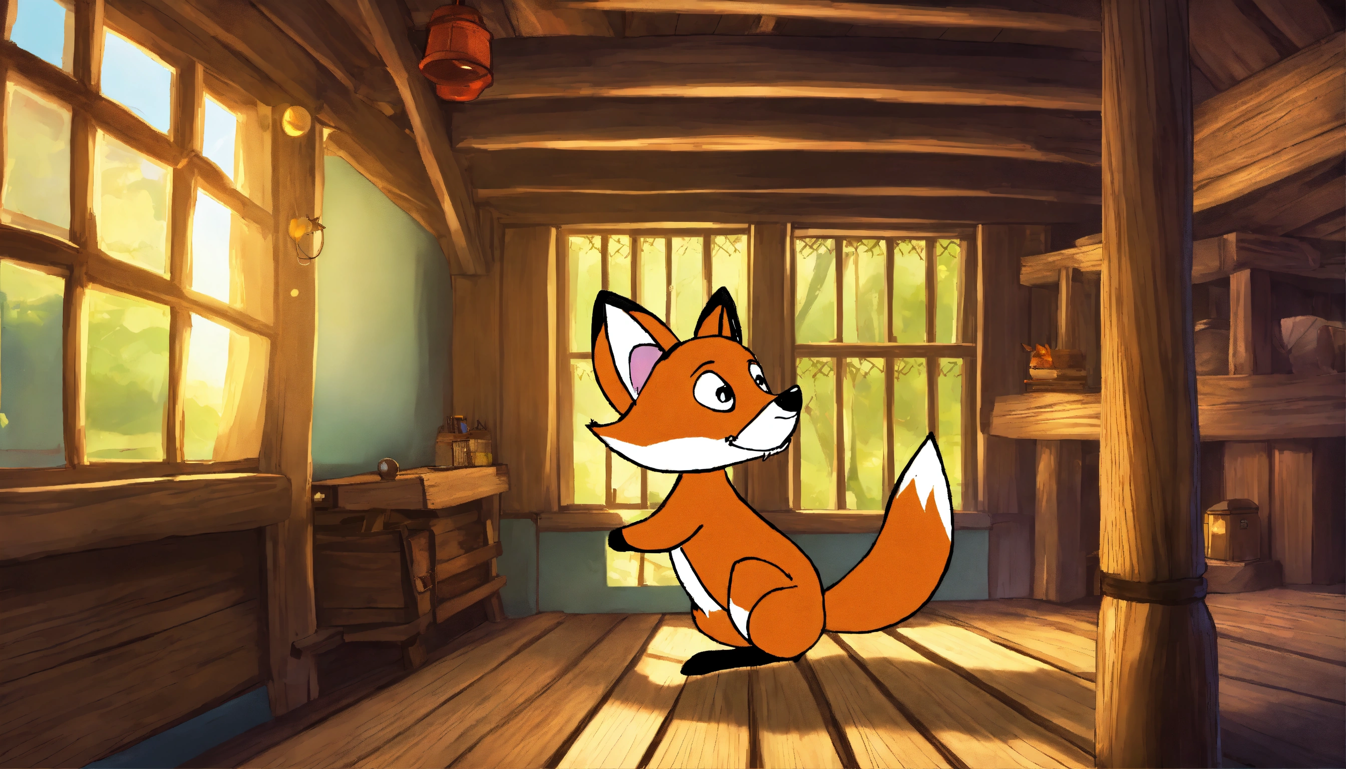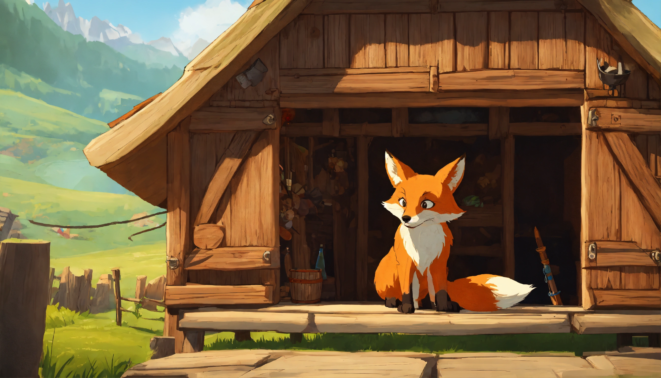 A cartoon-style fox climbs into a wooden medieval hut through the window