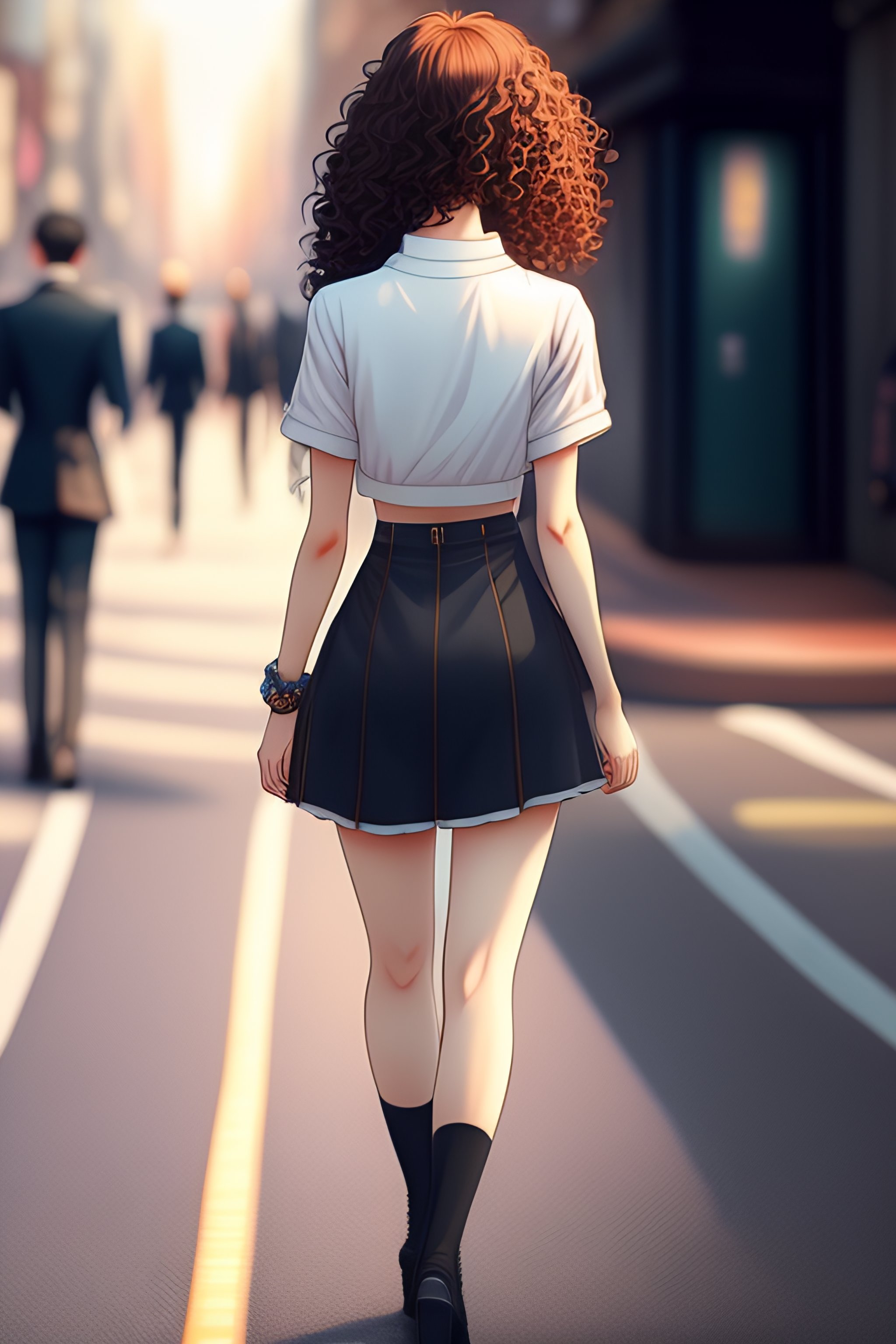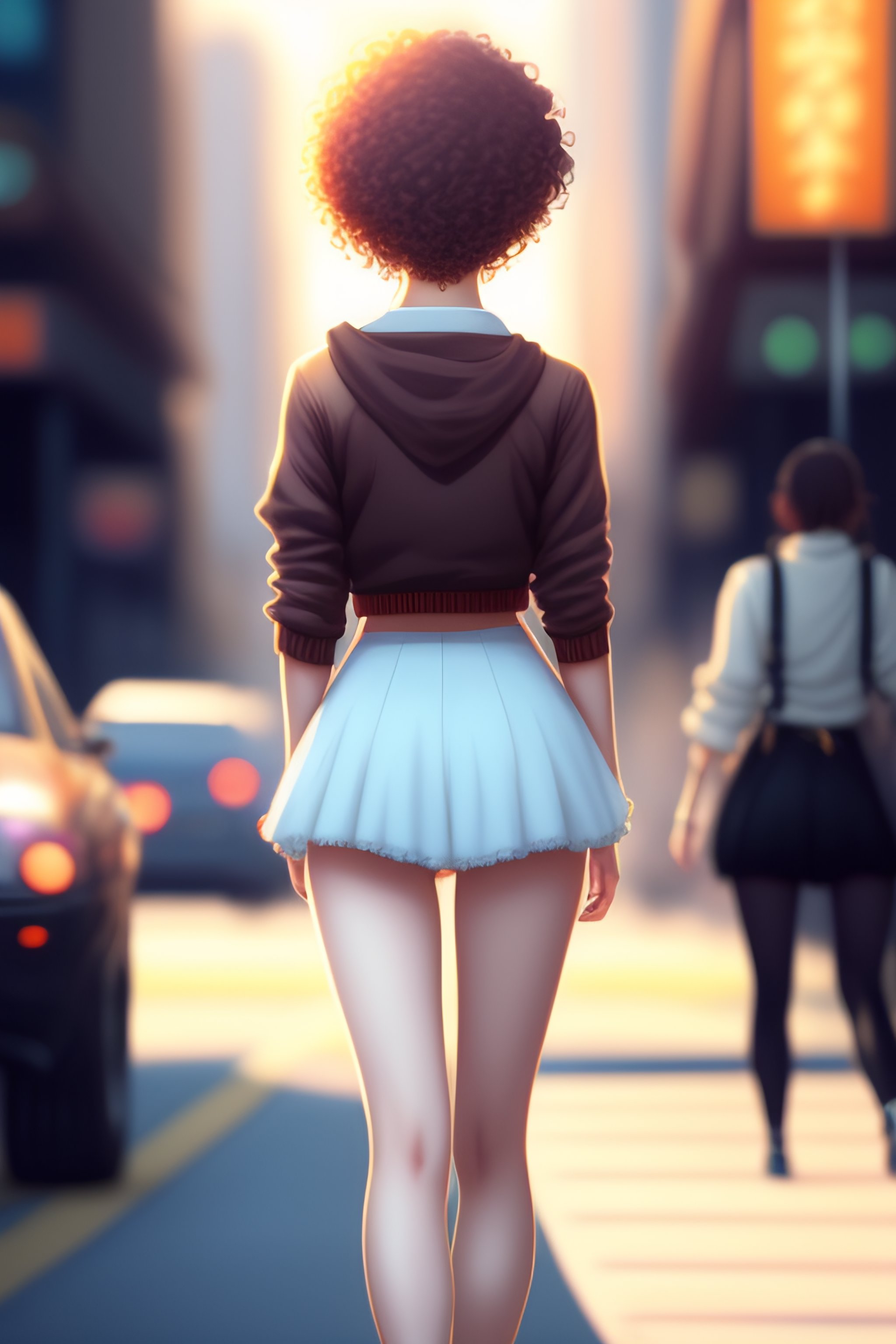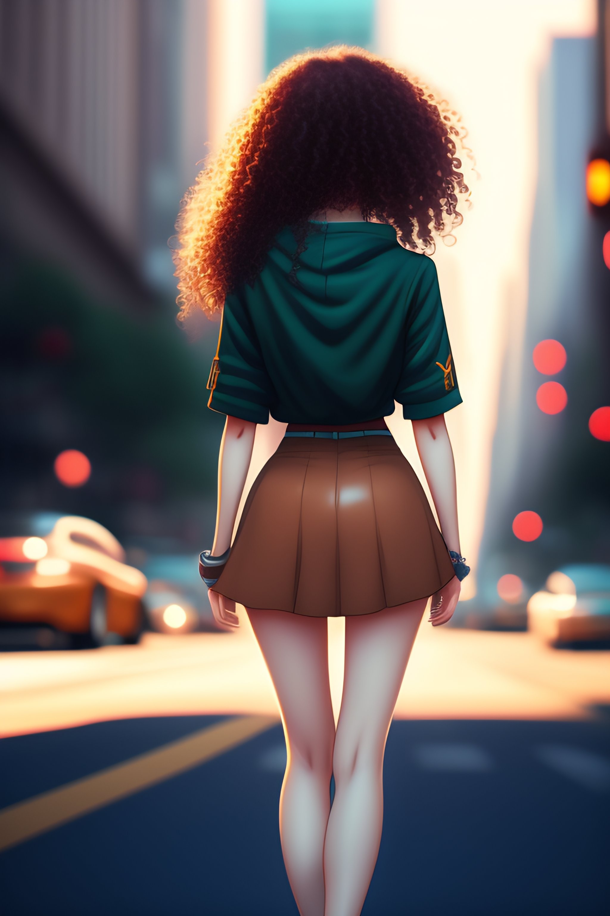Anime style, cute anime girl, 19 years old, back view, far from camera, medium curly brown hair, skinny, plain back visible, slim waist, thick, hands on hips, really short skirt, buttocks slightly visible, on side walk in big city