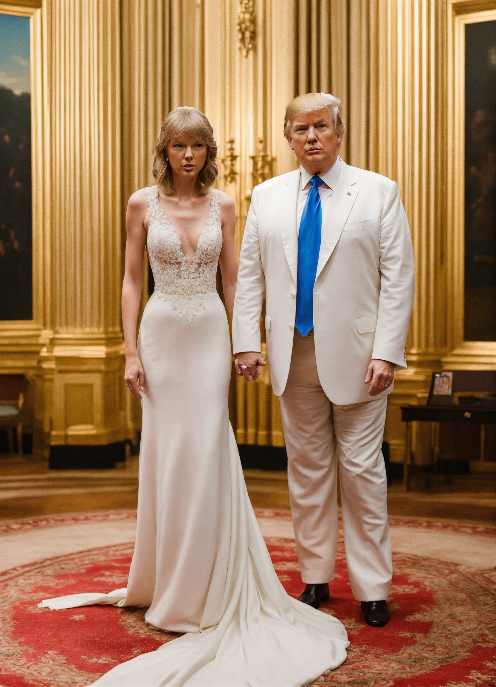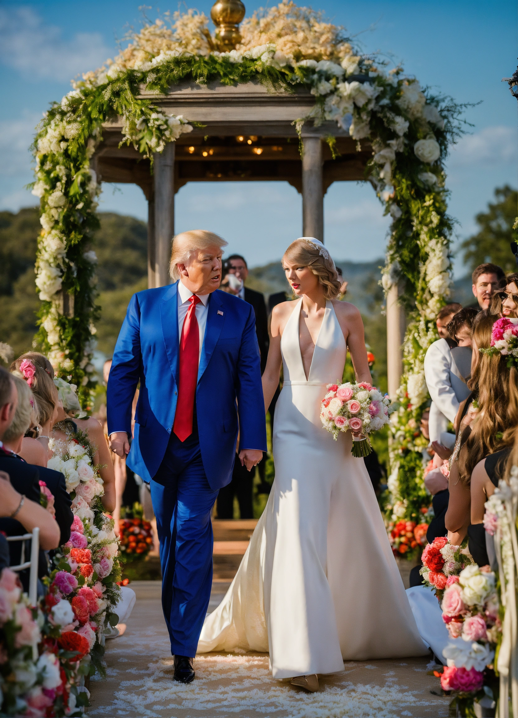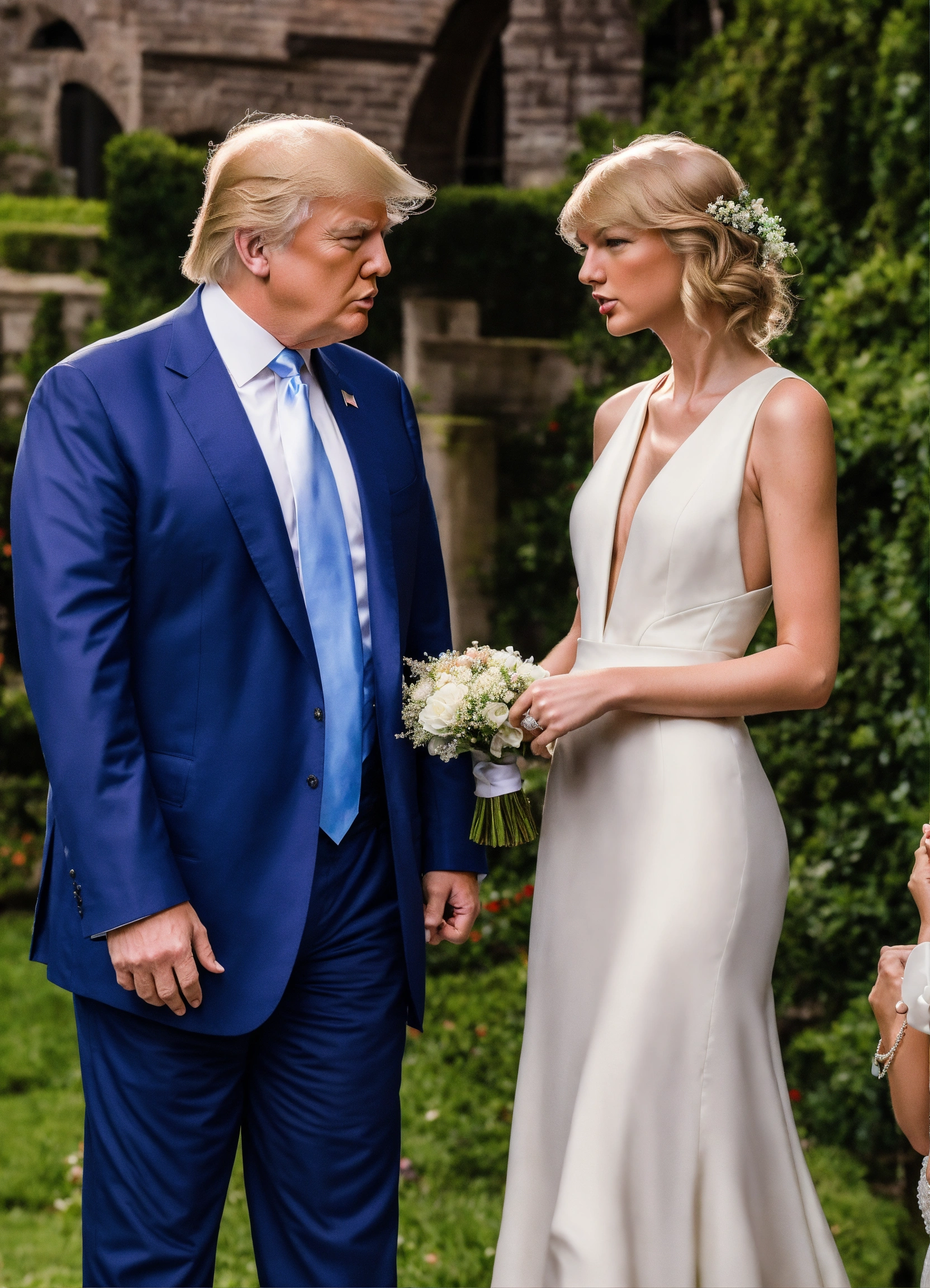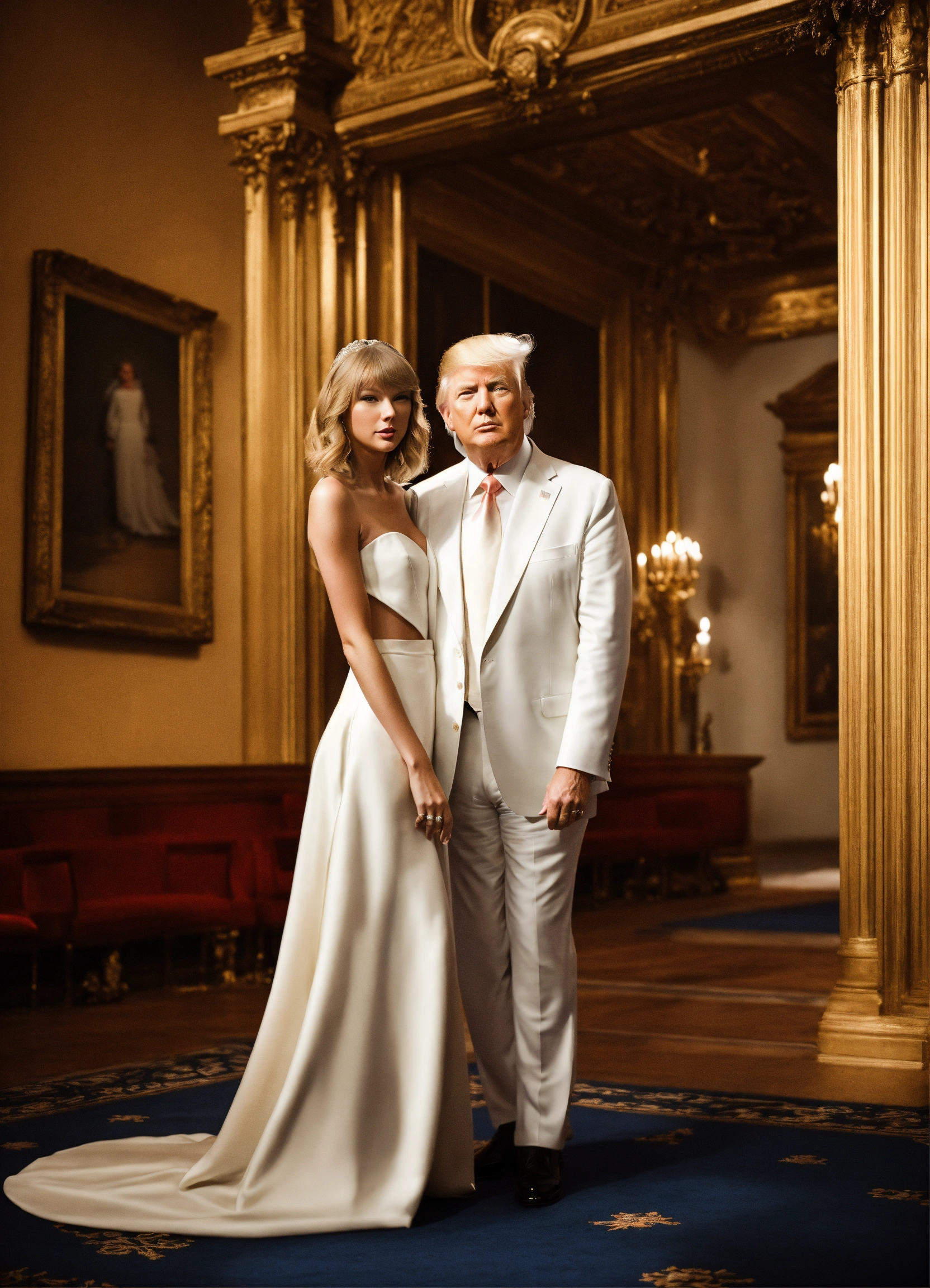 Photo realistic shot of donald trump in a white suit getting married to taylor swift
