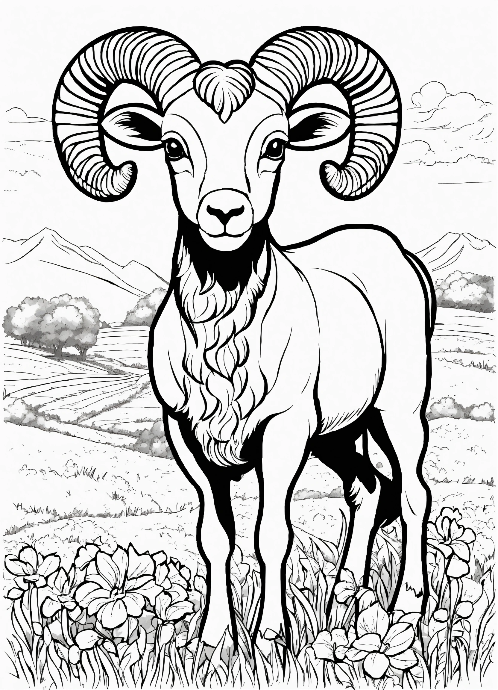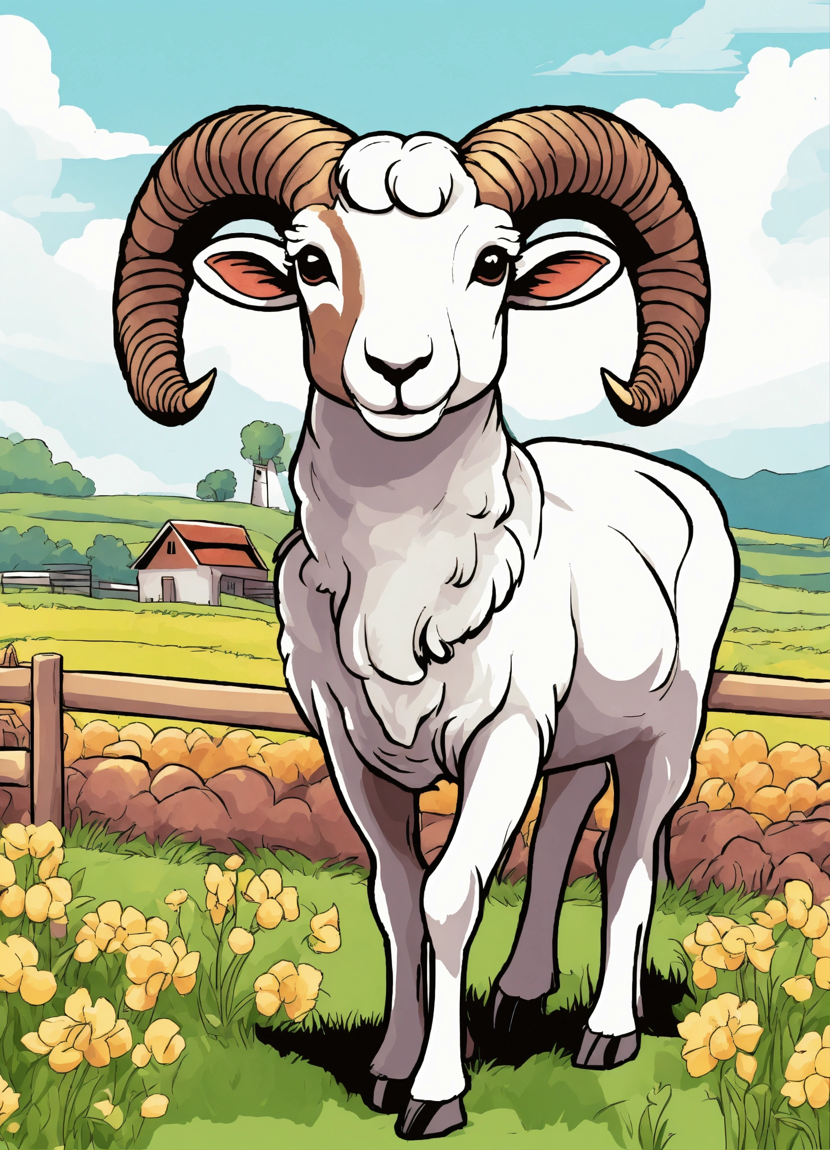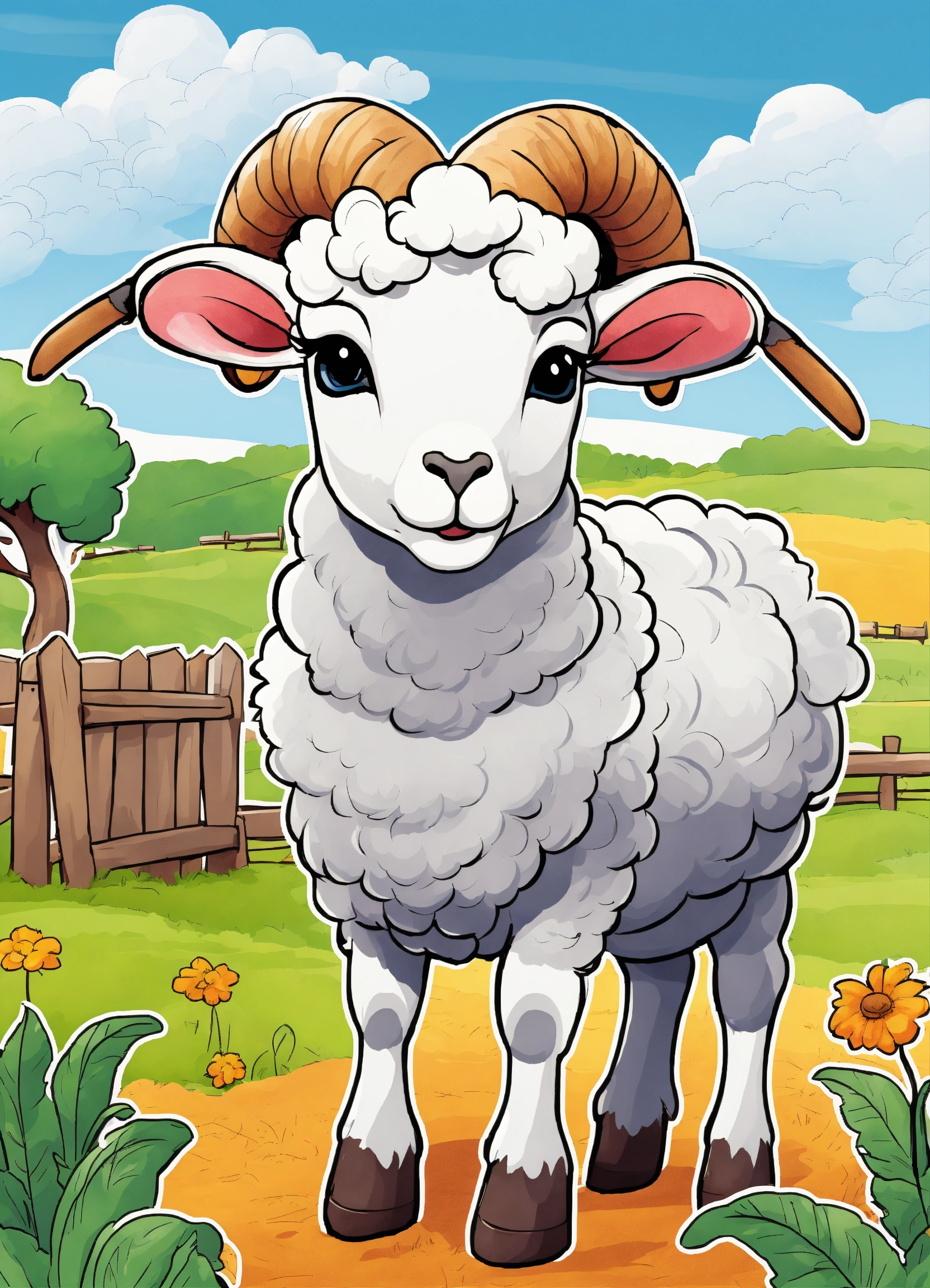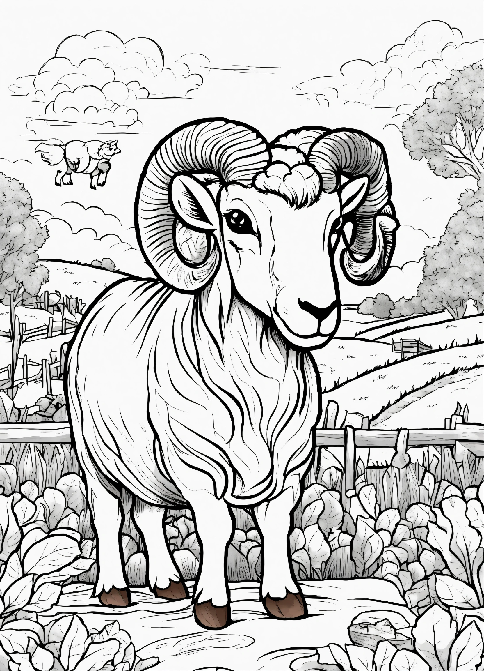 Generate a cute ram of the farm illustration, resolution, cartoon-sticker style with clear lines on a pure white background suitable for a children's coloring book.