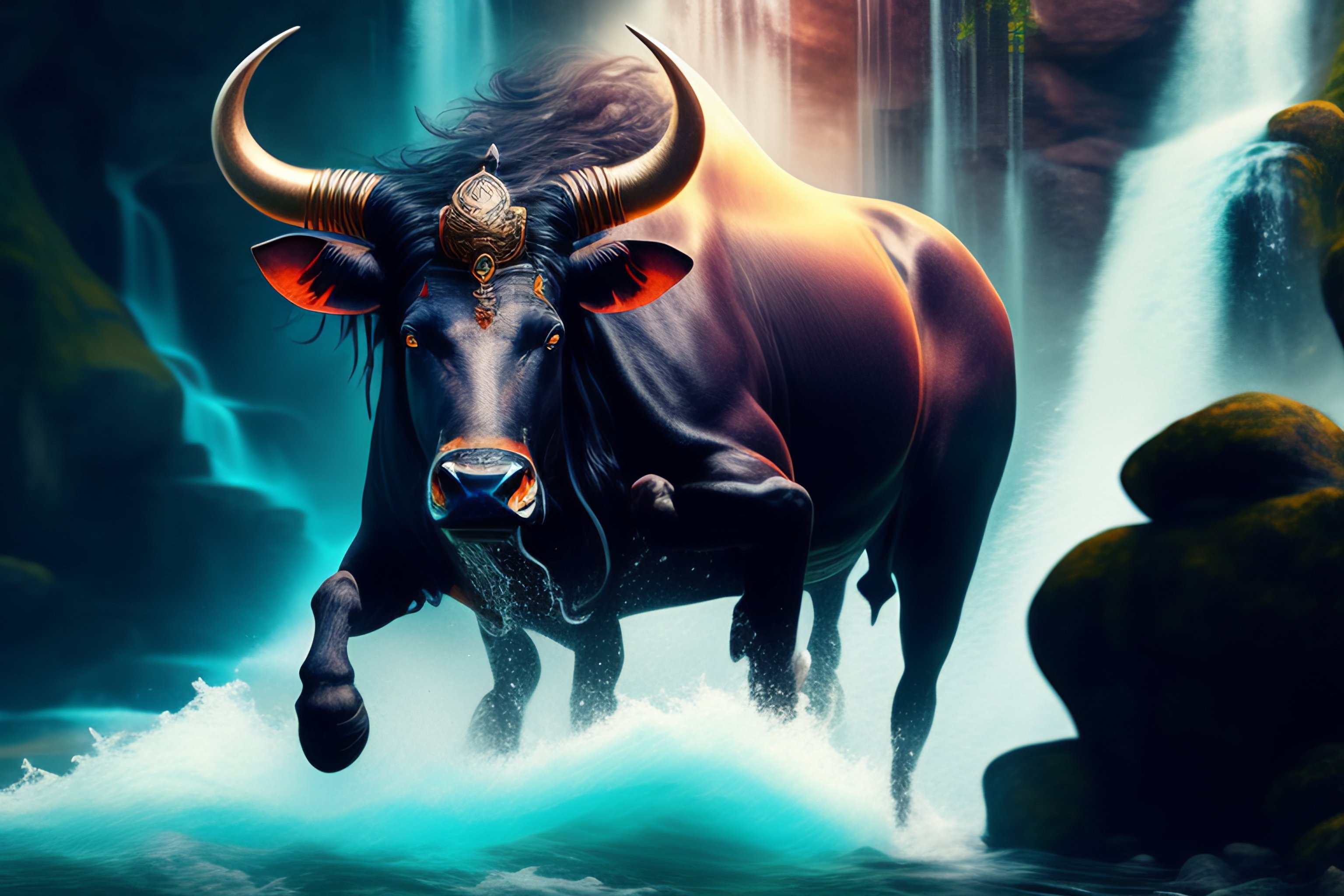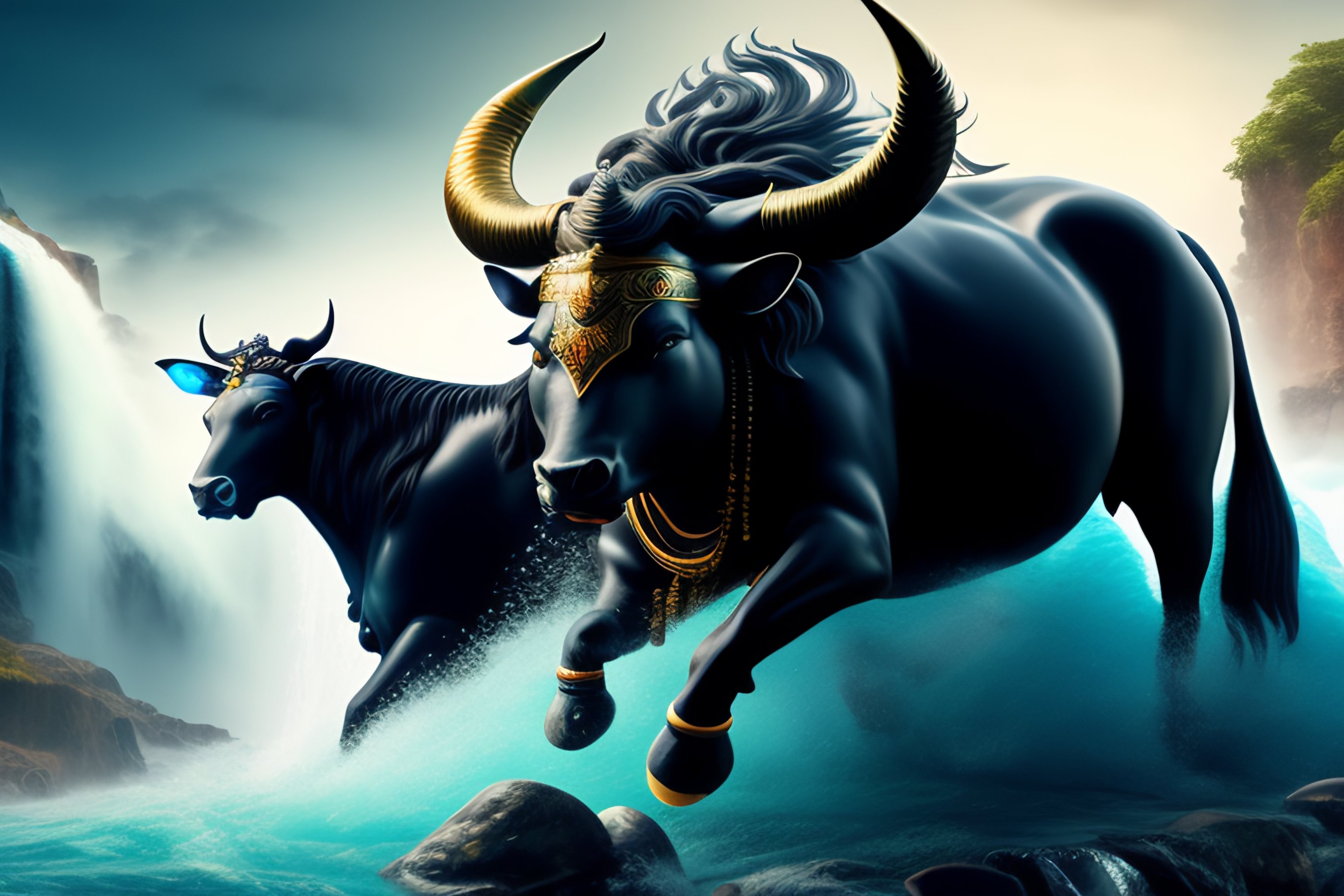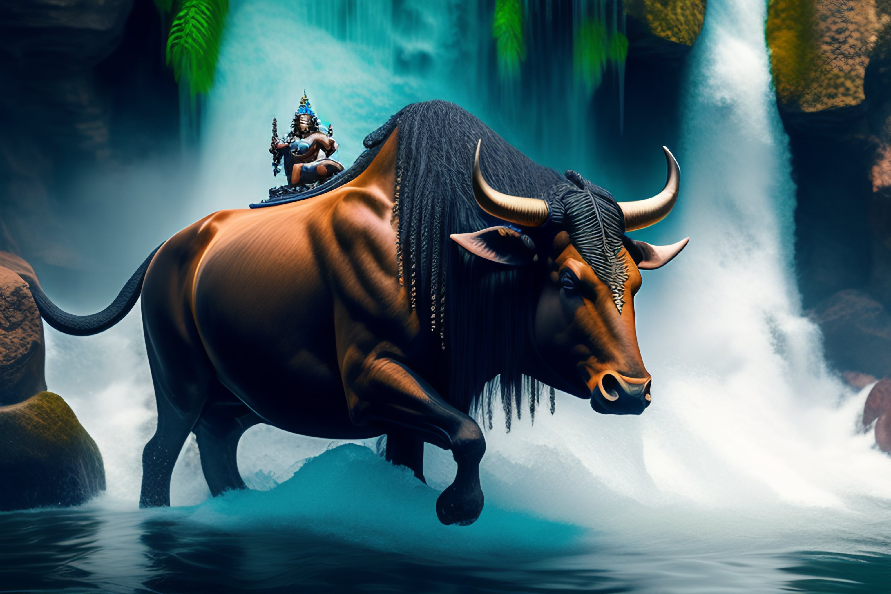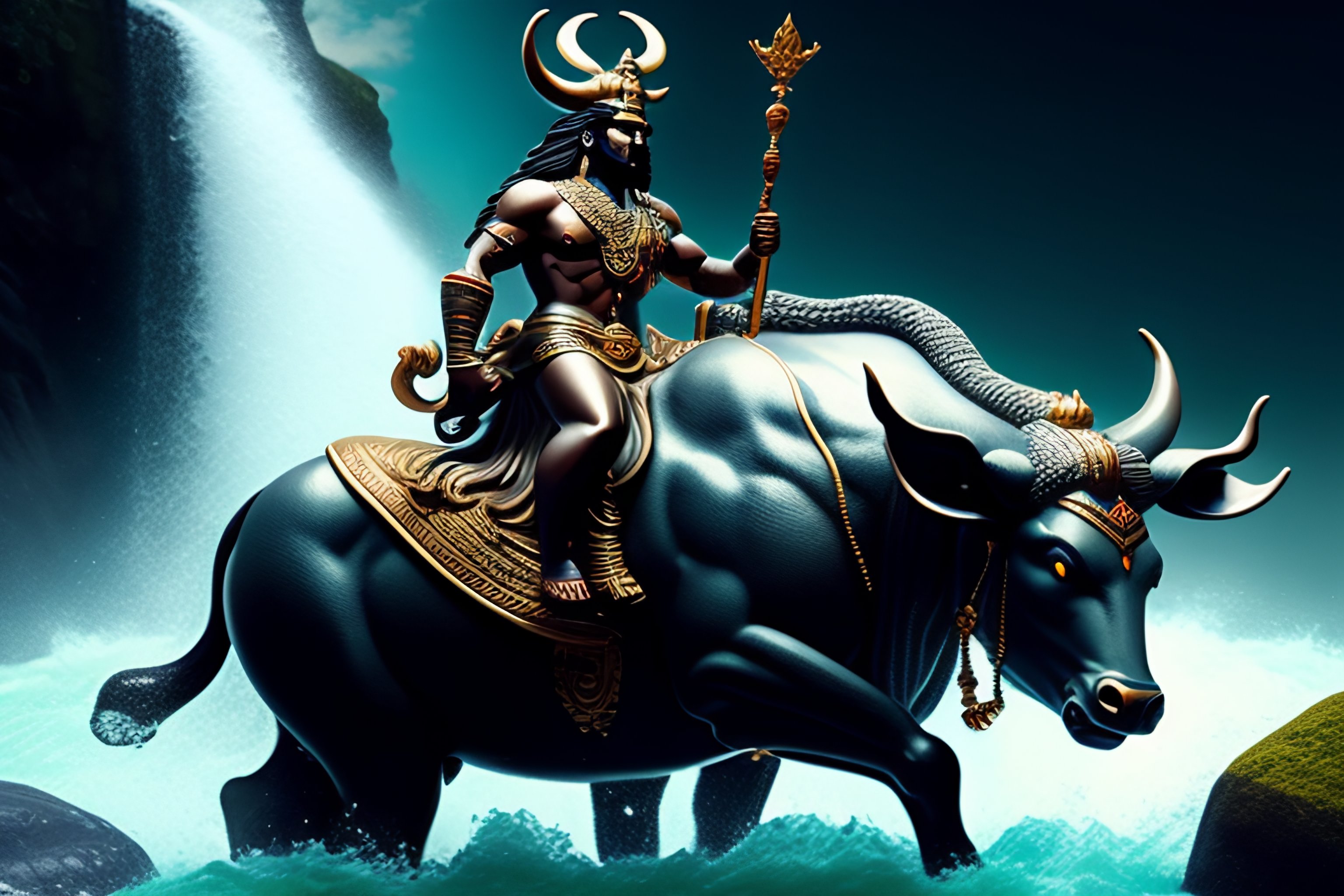 Lord shiva riding his bull under a waterfall