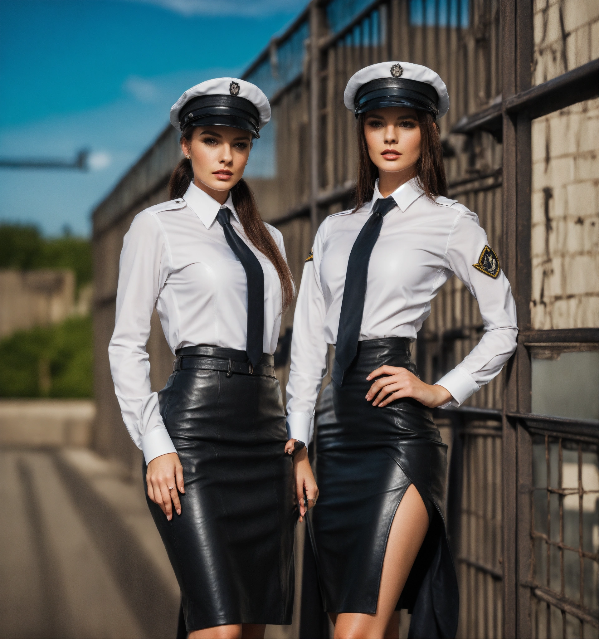 Two stunning european mistress women fashion models looking nice, prison warden, brunette straight high ponytail, strict business leather skirt, white shirt and wide leather necktie, leather black military cap, prison office, shirt and tie