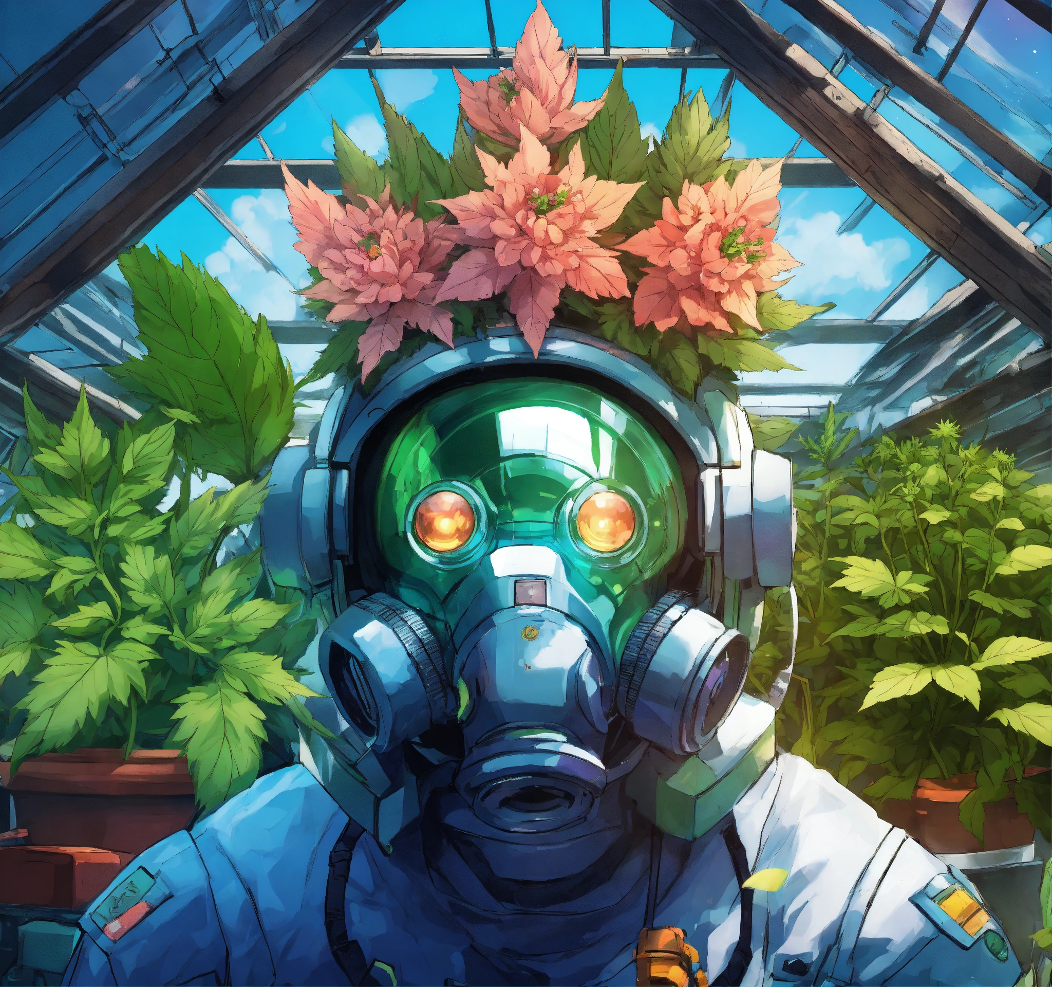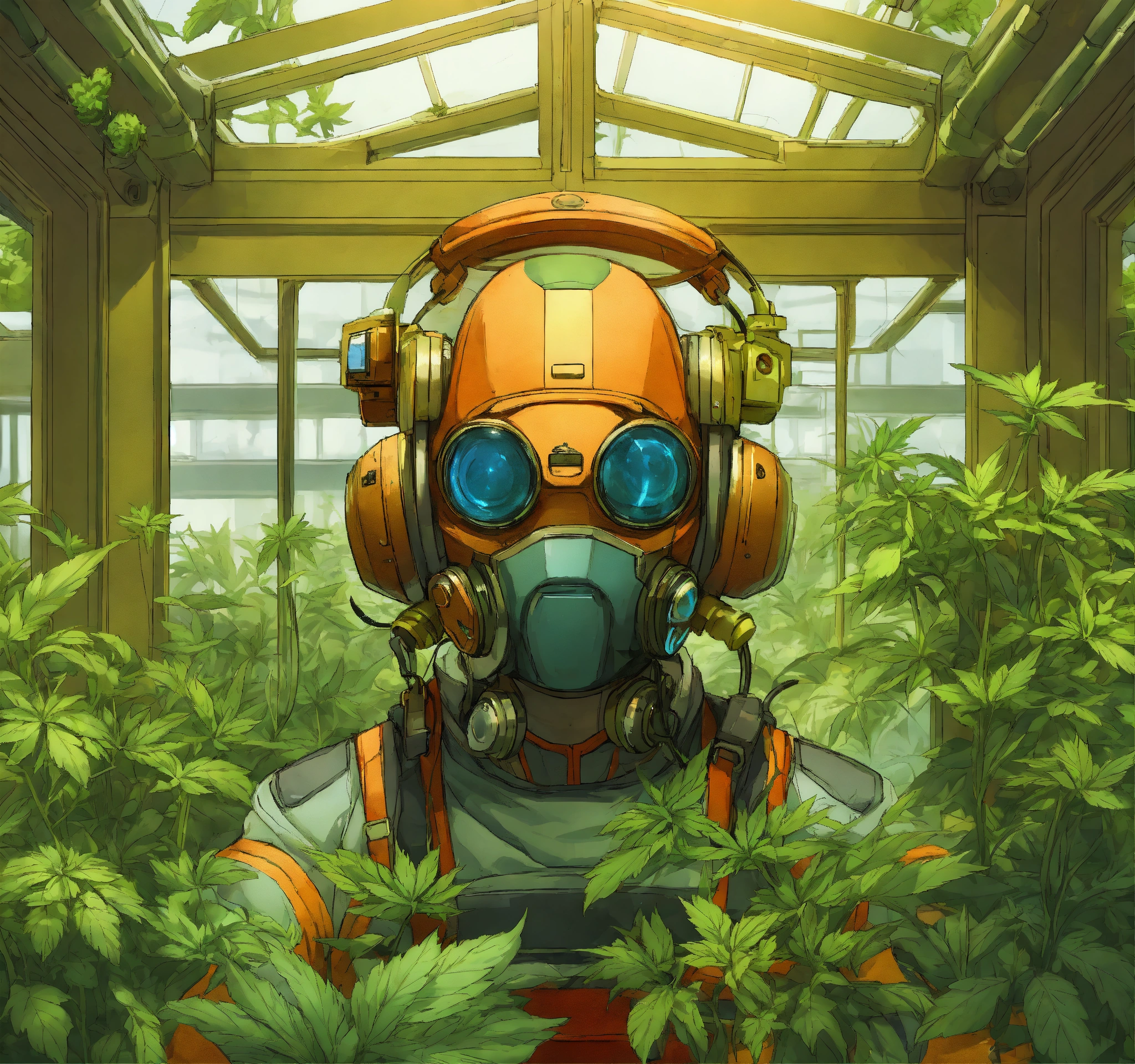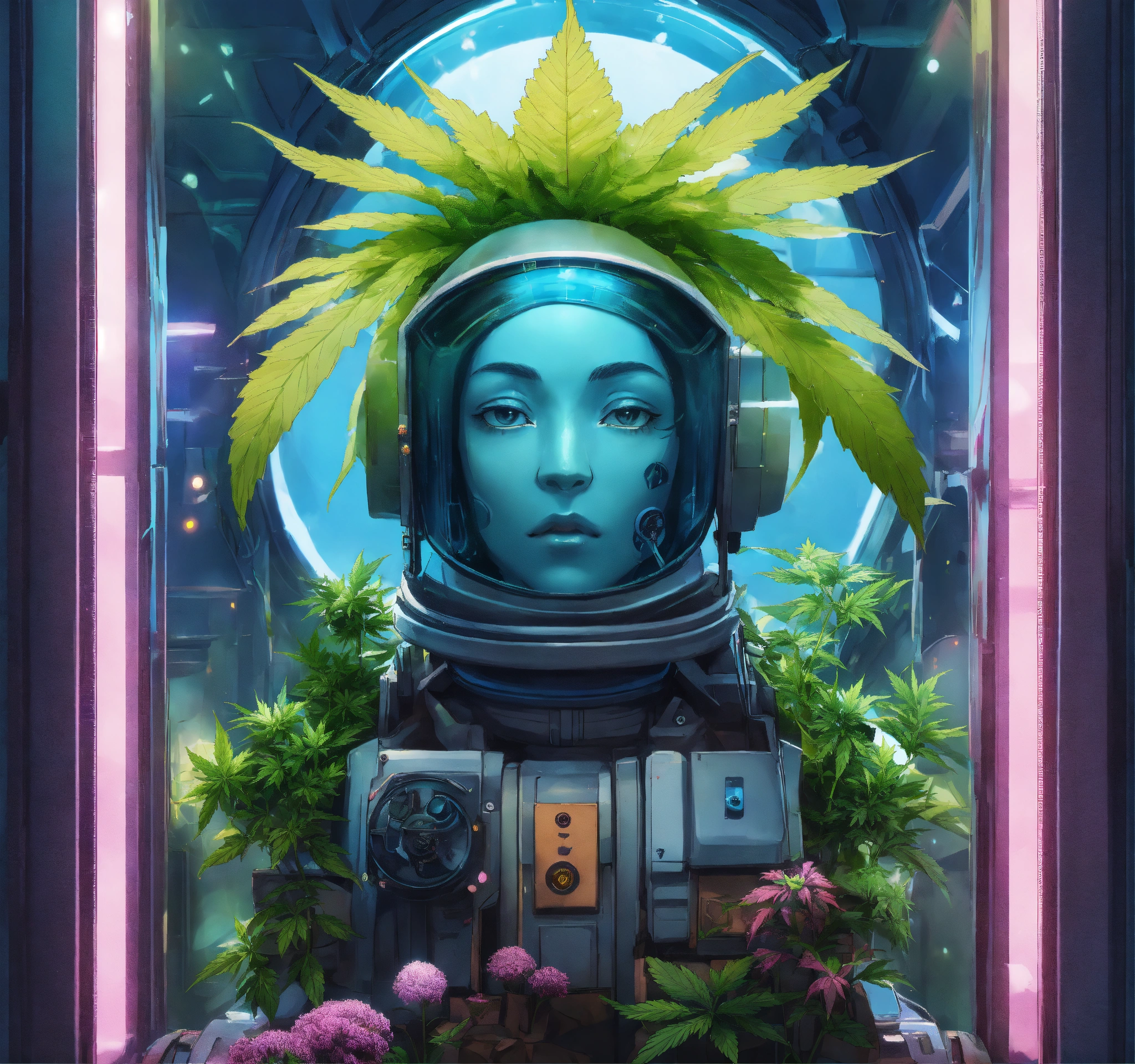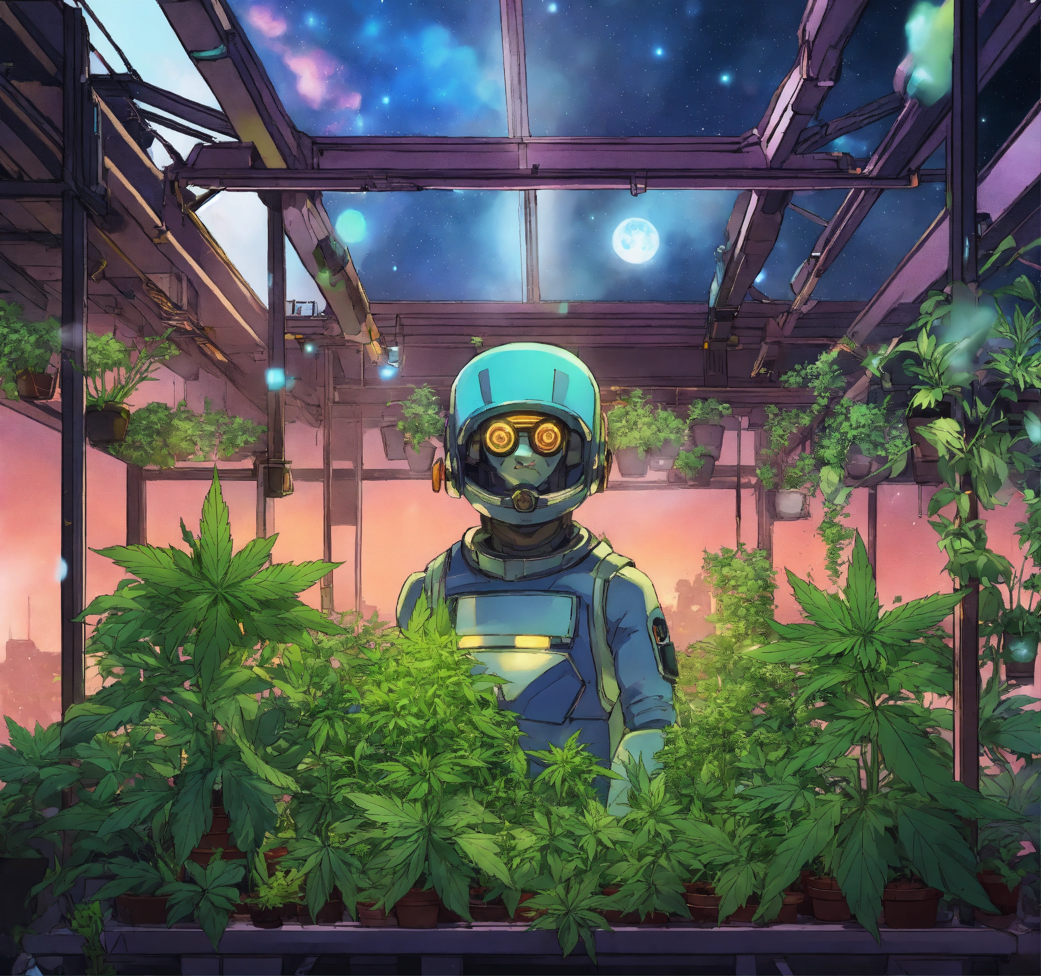 Avatar picture in frame for galaxy ape cosmic roboturban gardener in a rooftop greenhouse. anime, seed, plant, cannabis leaf, steam, buds flowers., futuristic