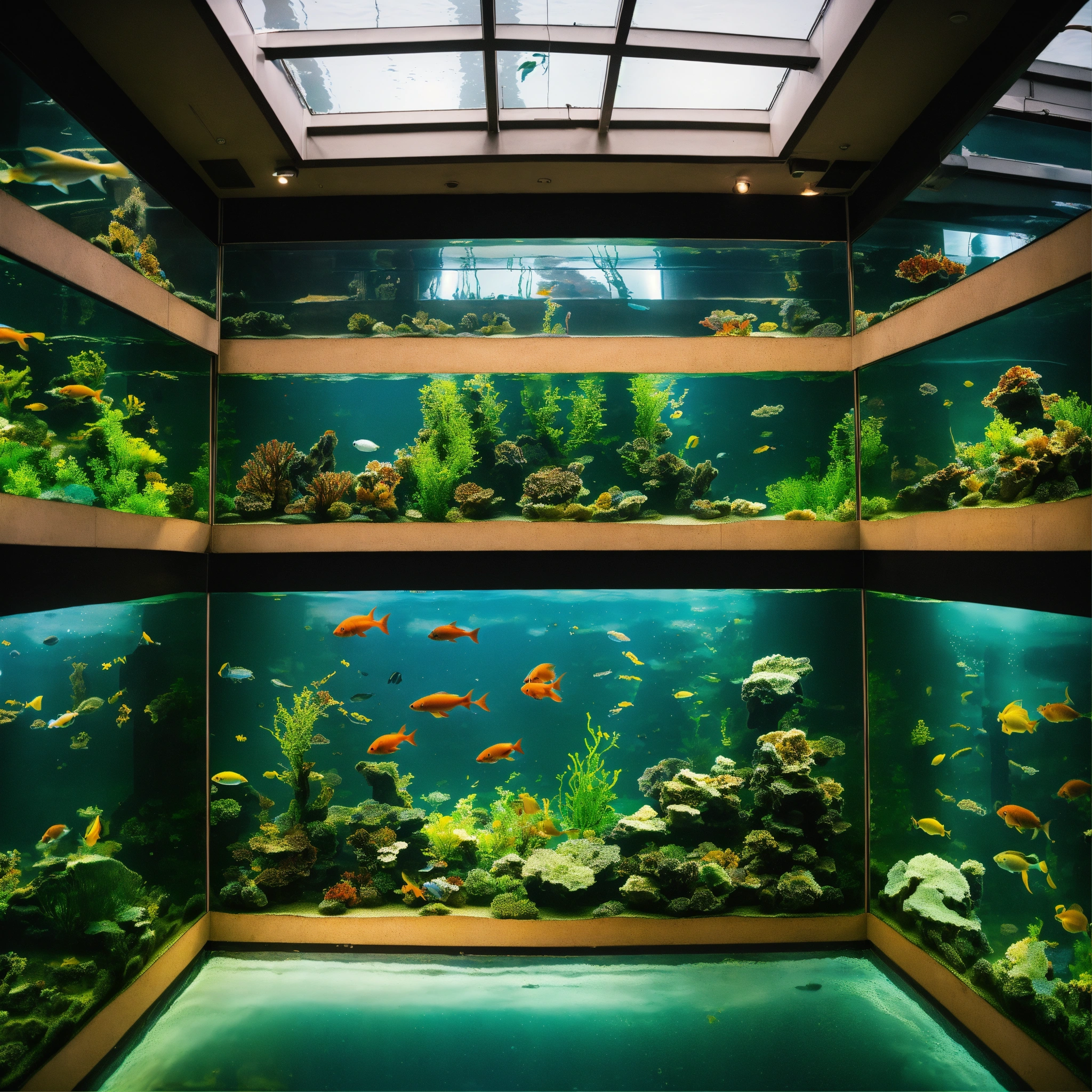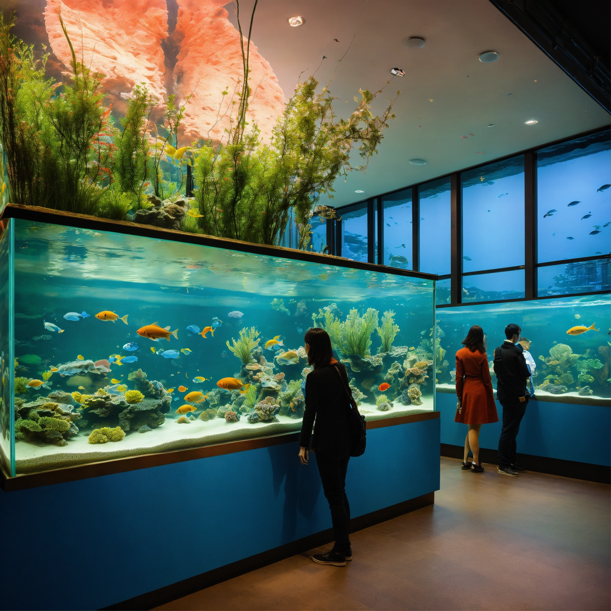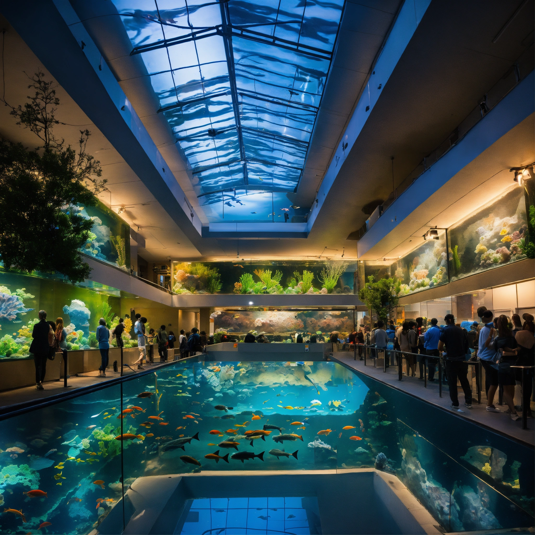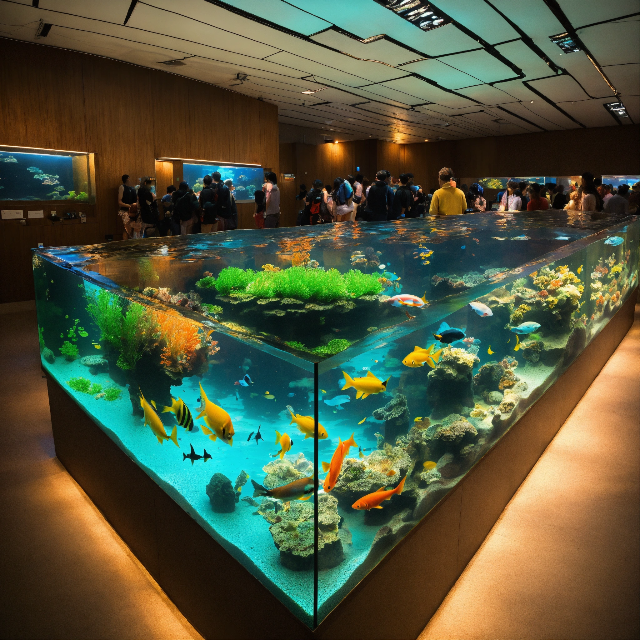 A photo of a large aquarium with a variety of fish, the aquarium is located in a public space and is surrounded by people