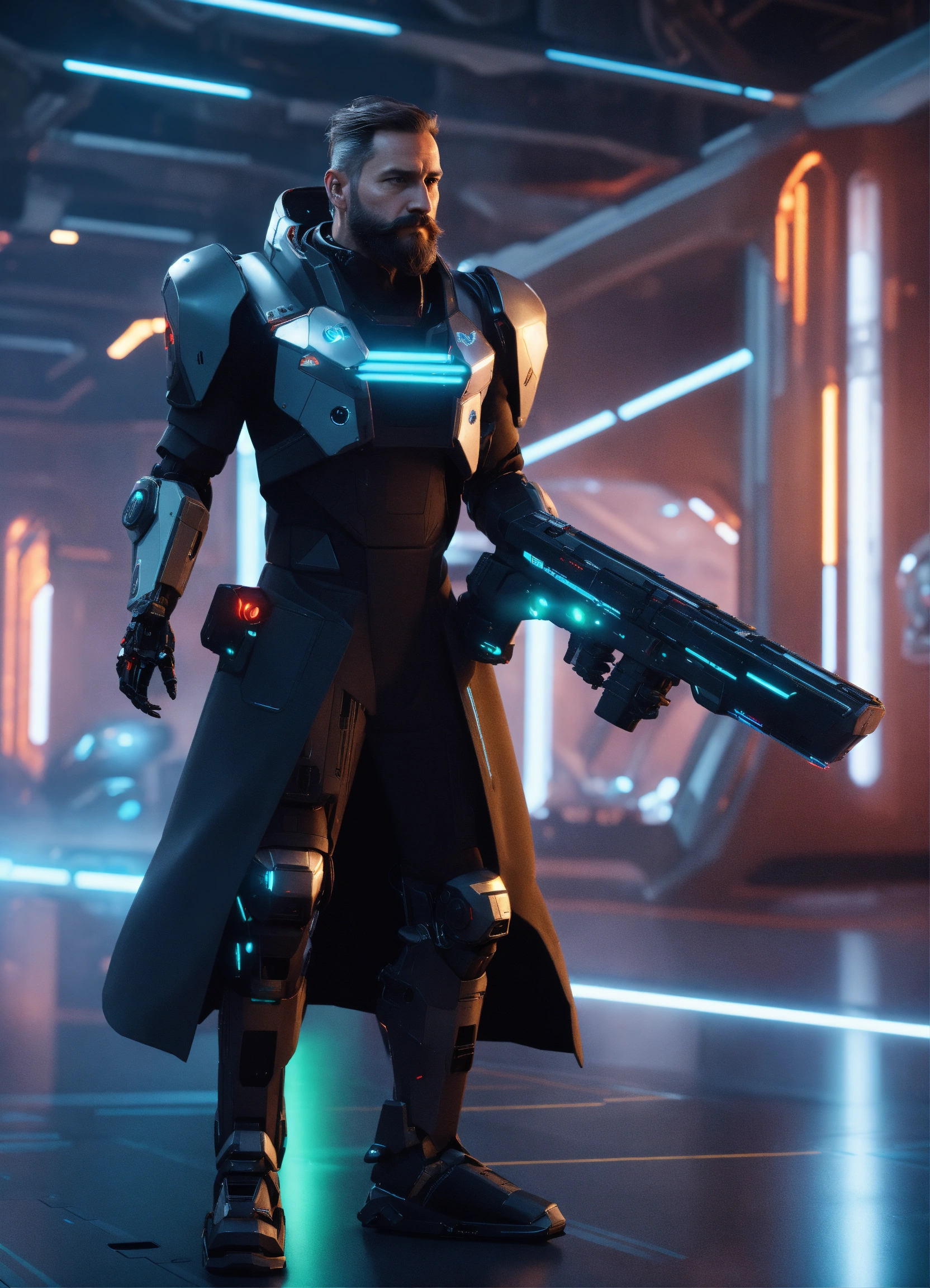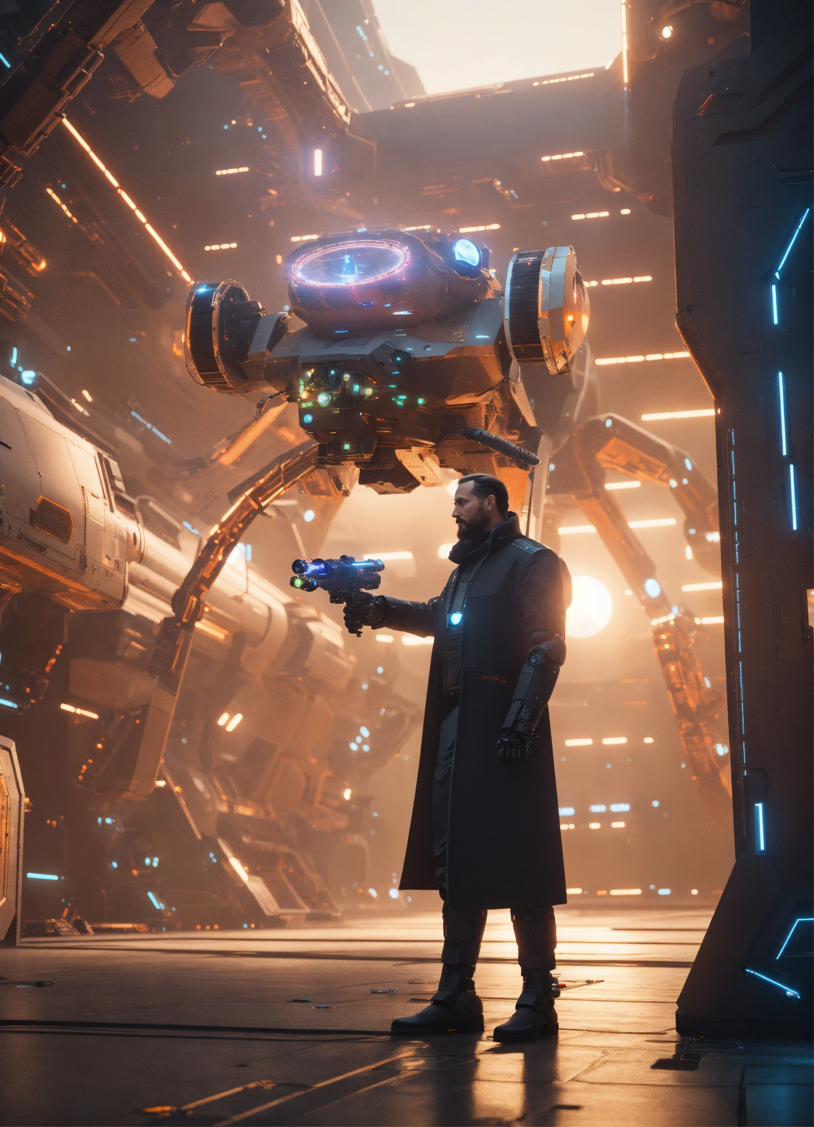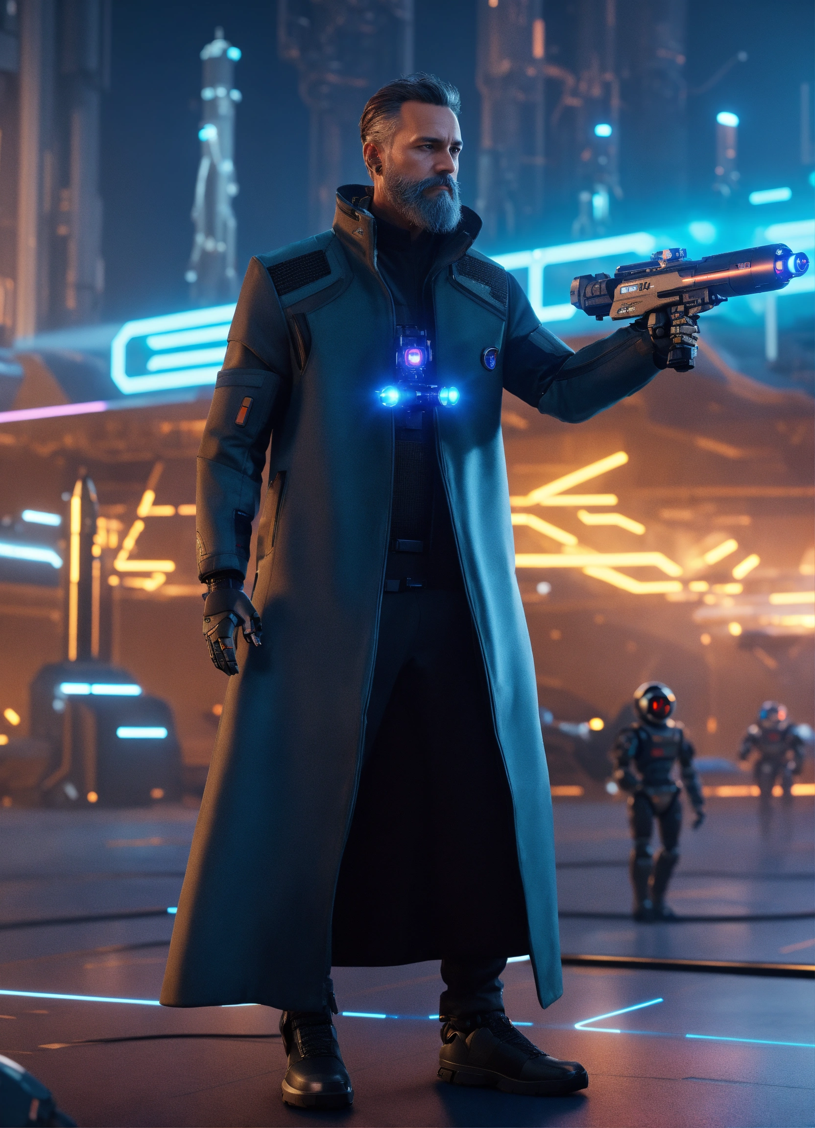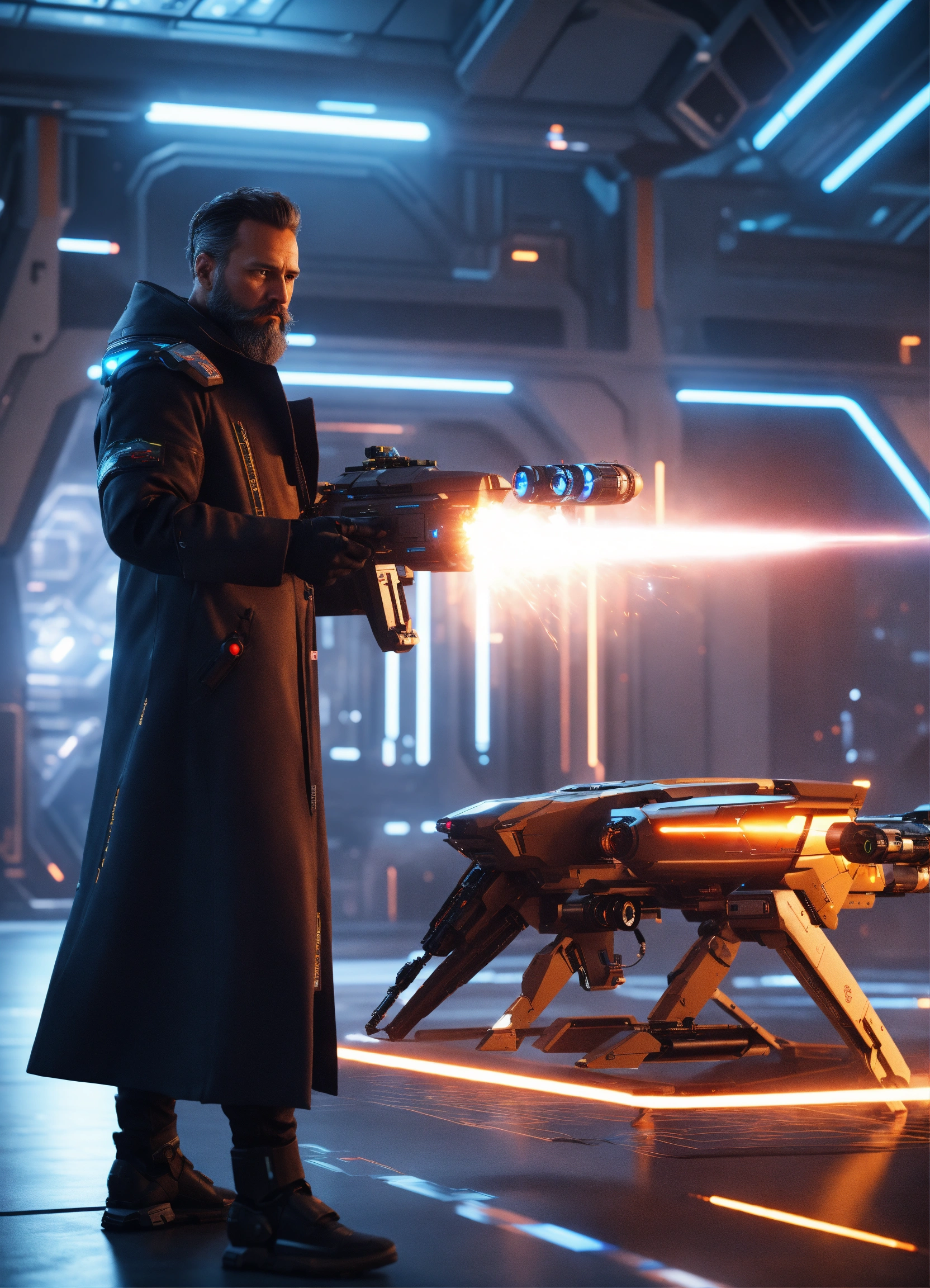 A 45 year old masculine man with trim beard in futuristic long coat shoots a sleek pulse frequency energy gun at a small flying black robotic patrol bot with claws at a space port, realistic, futuristic, sci-fi, 8k, unreal engine, pixar