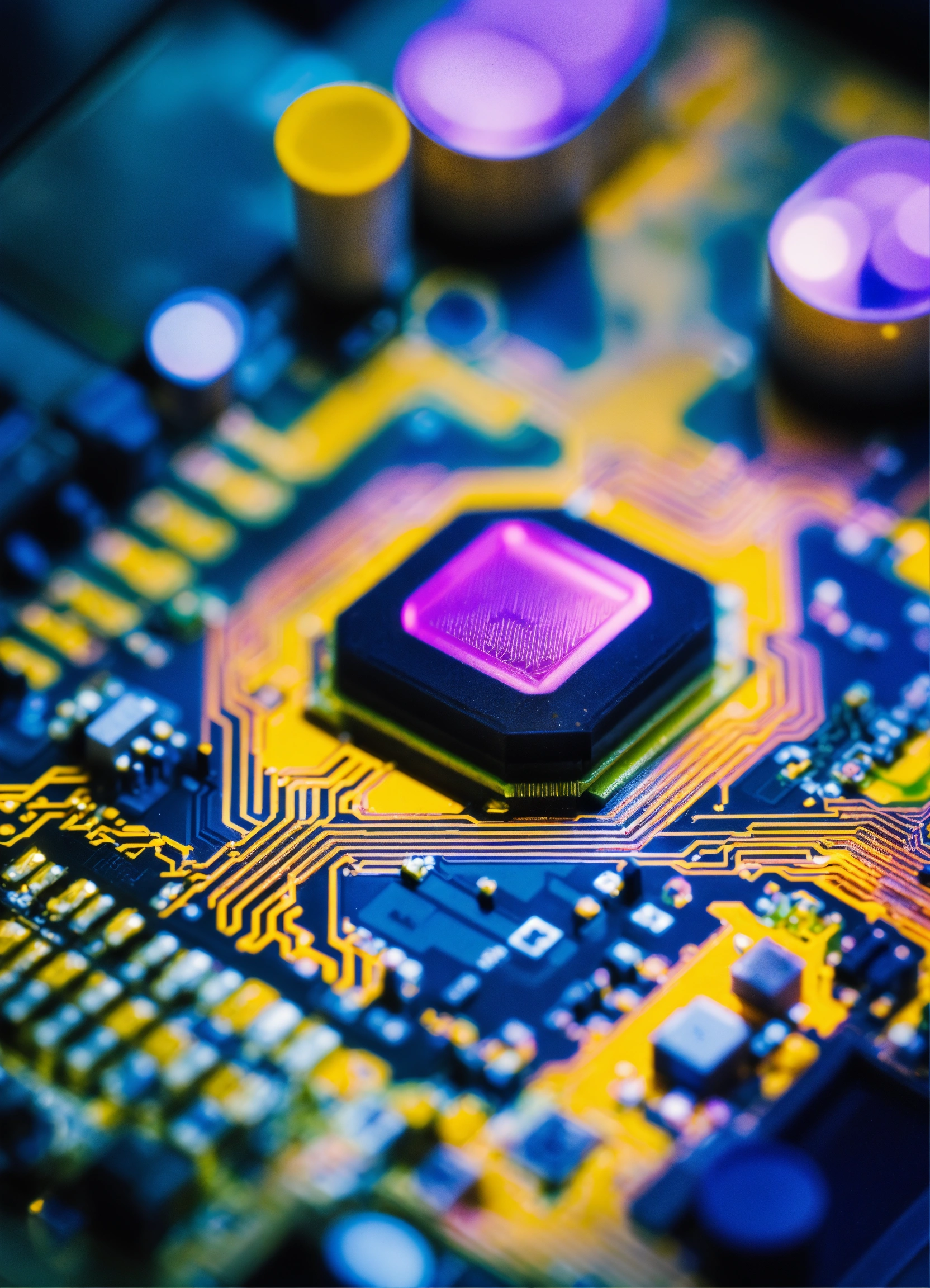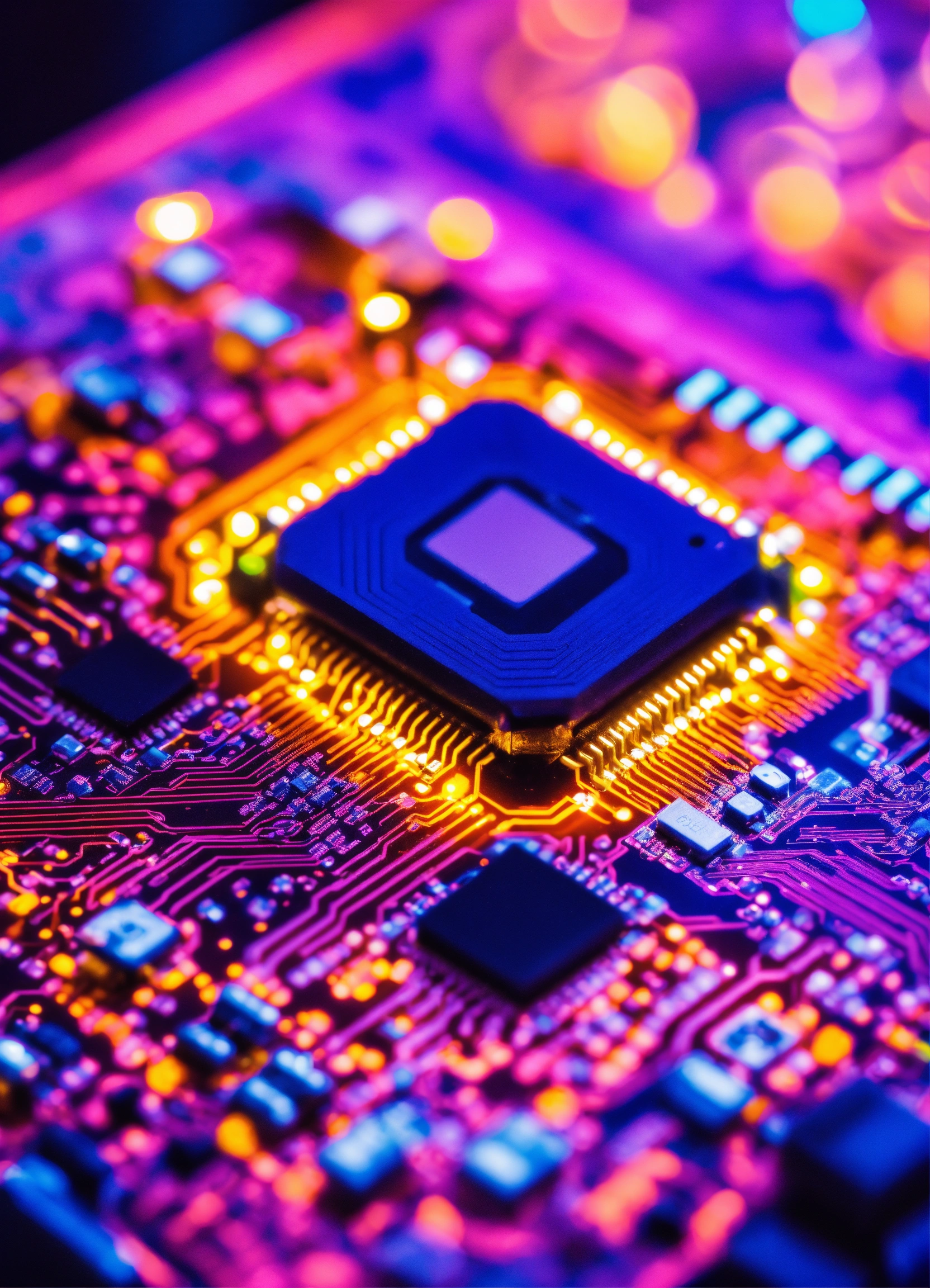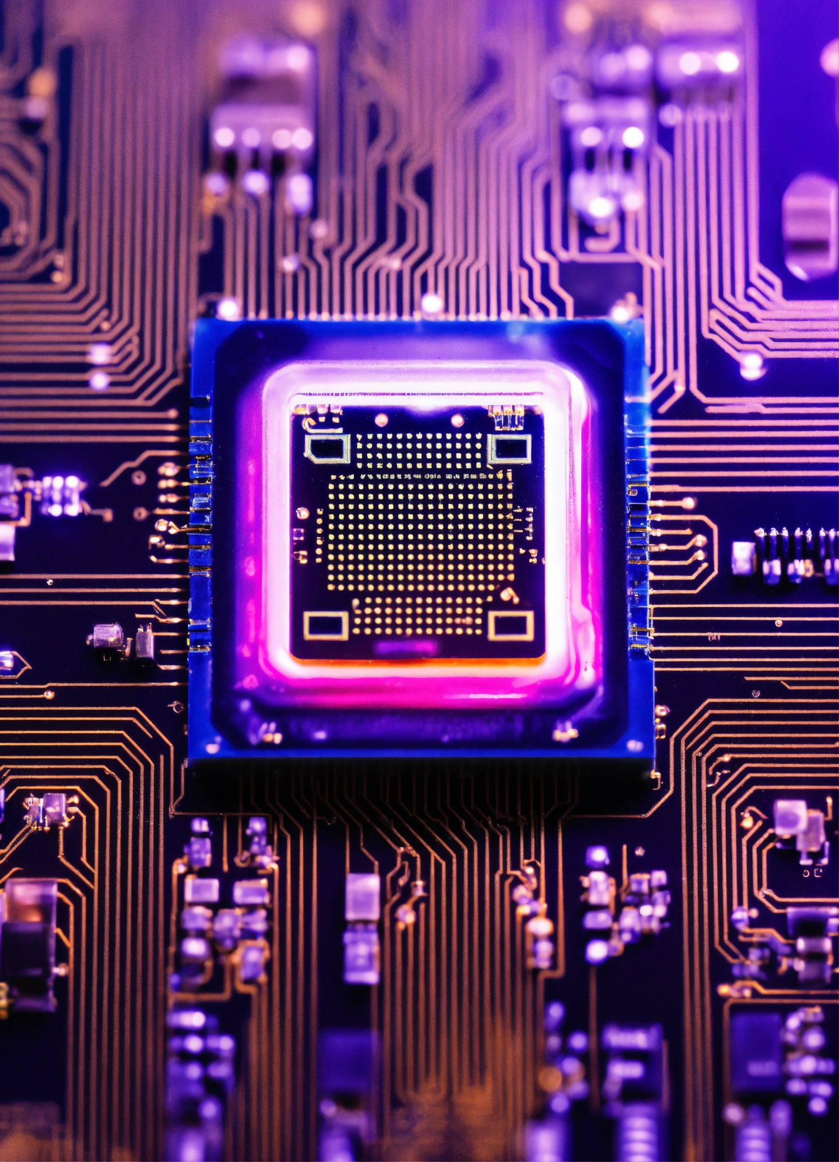 Close-up on a microchip in the center of an electrical printed circuit board, with blue and violet luminous fluxes