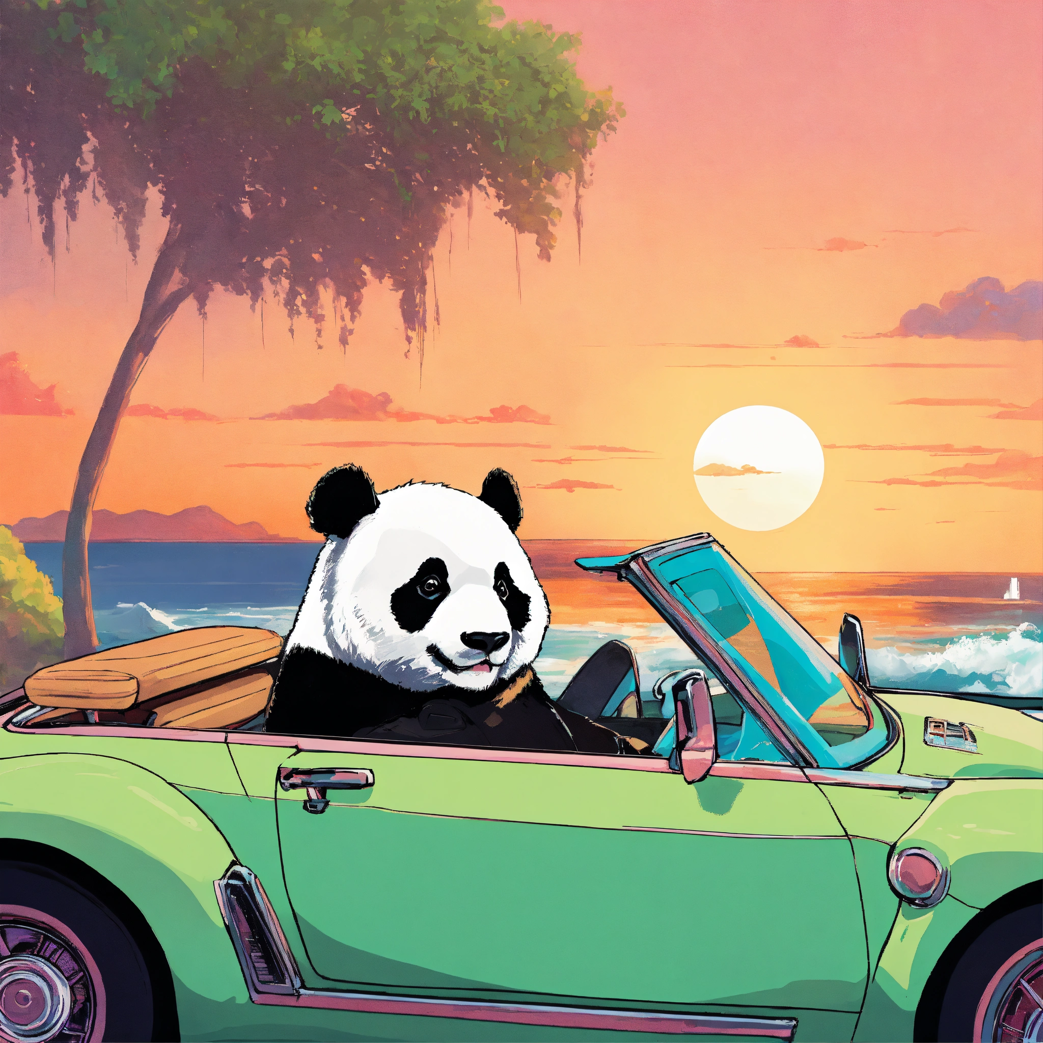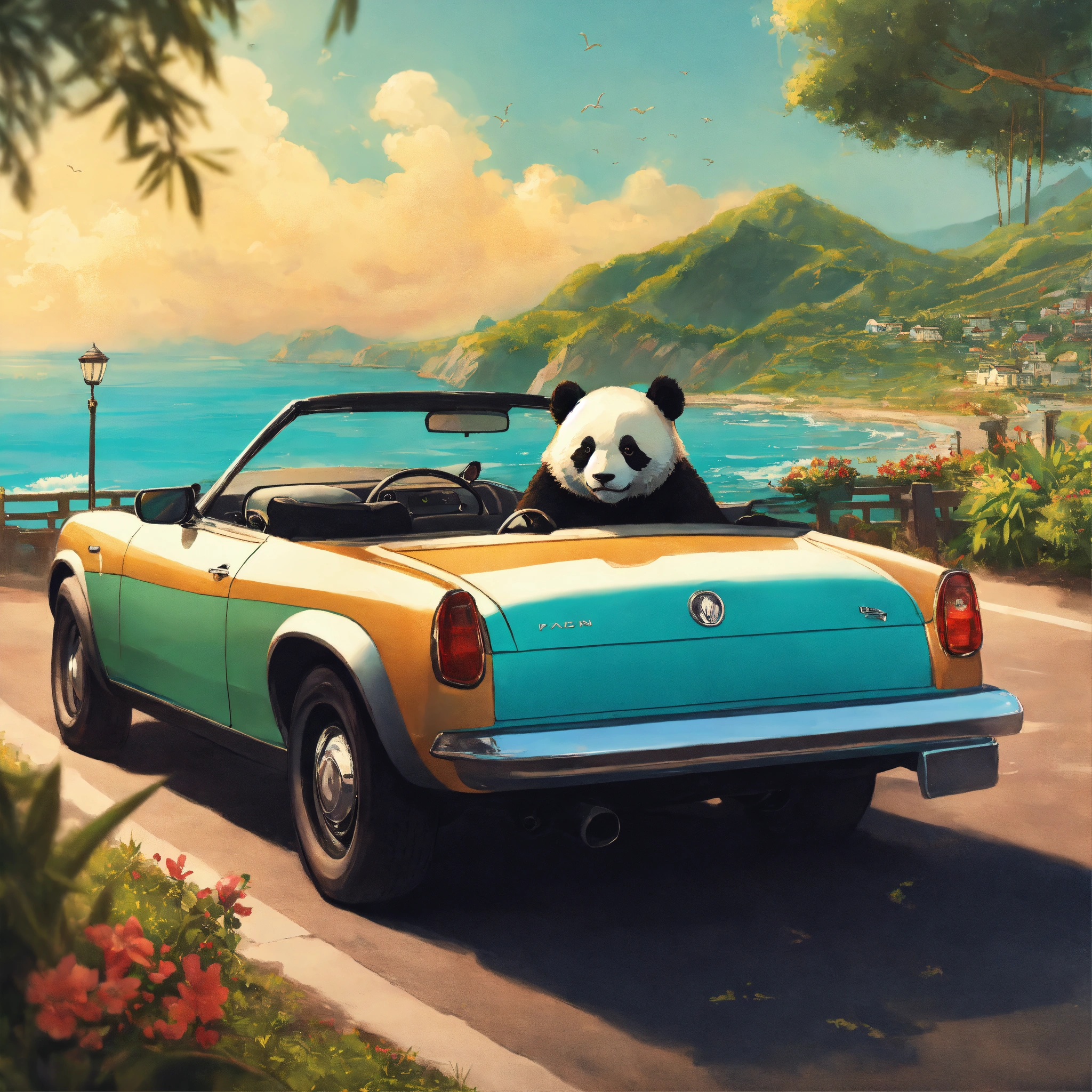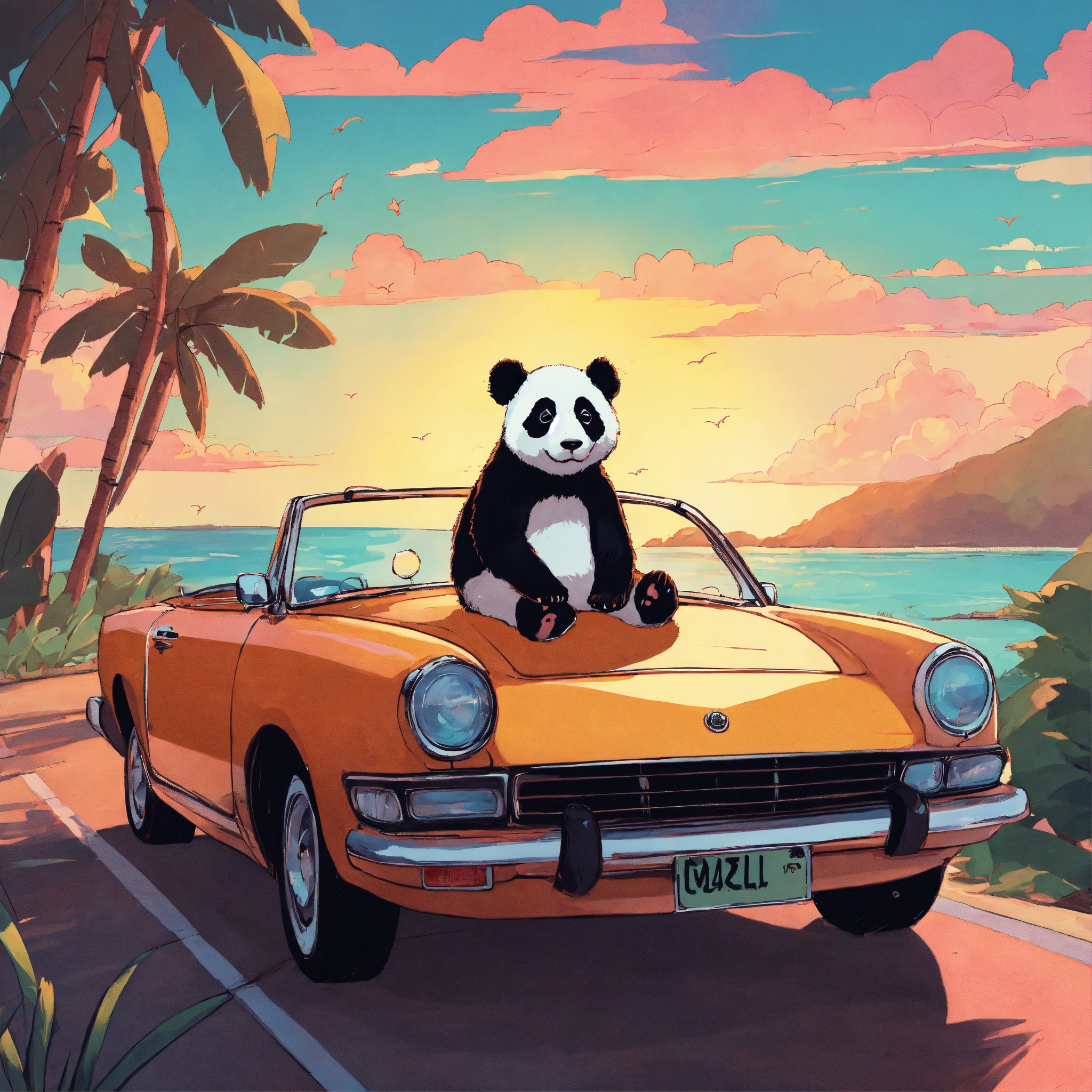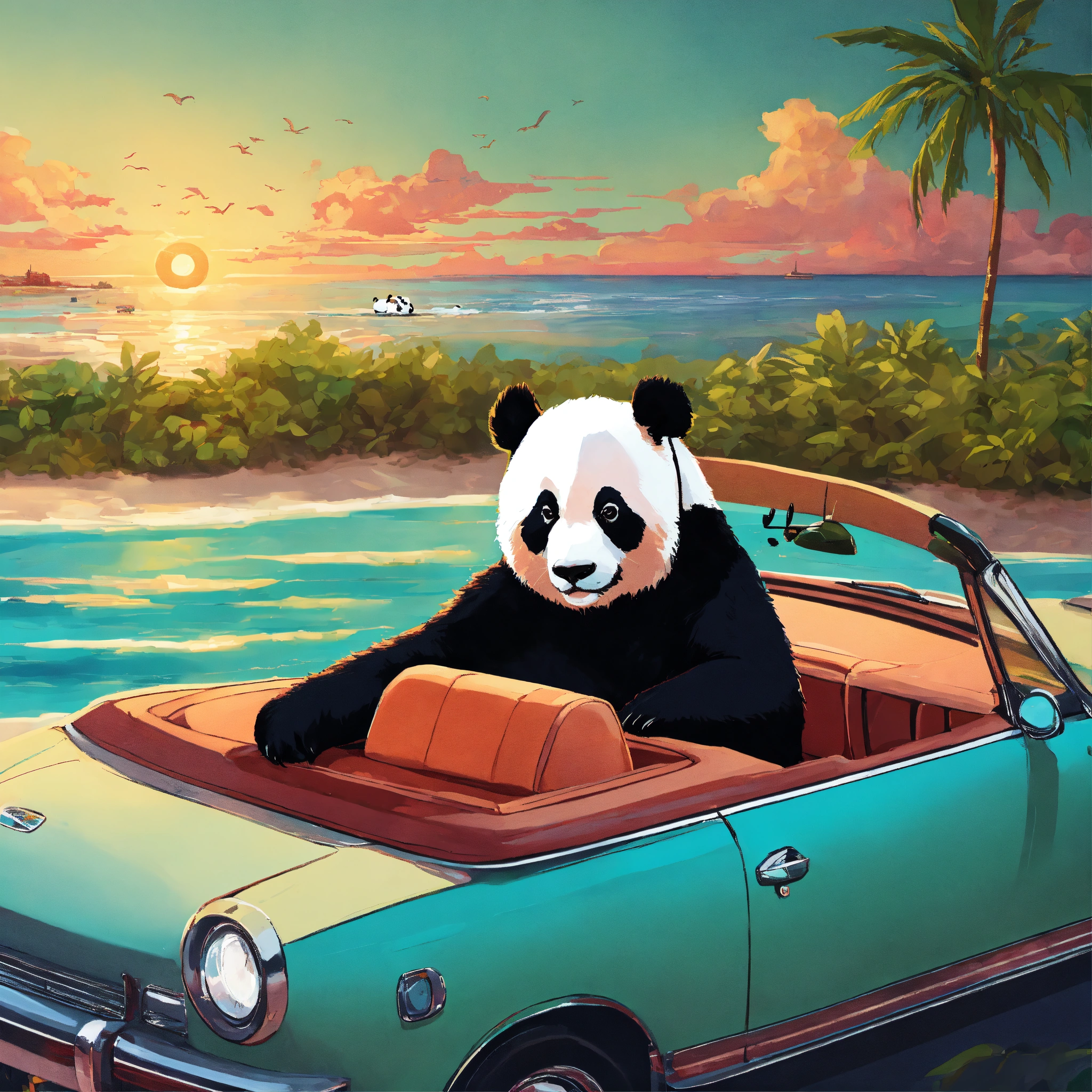 An album cover, that has a panda, and this one that is relaxing in a convertible cruising along the coast. this one would be in love and listening to music.